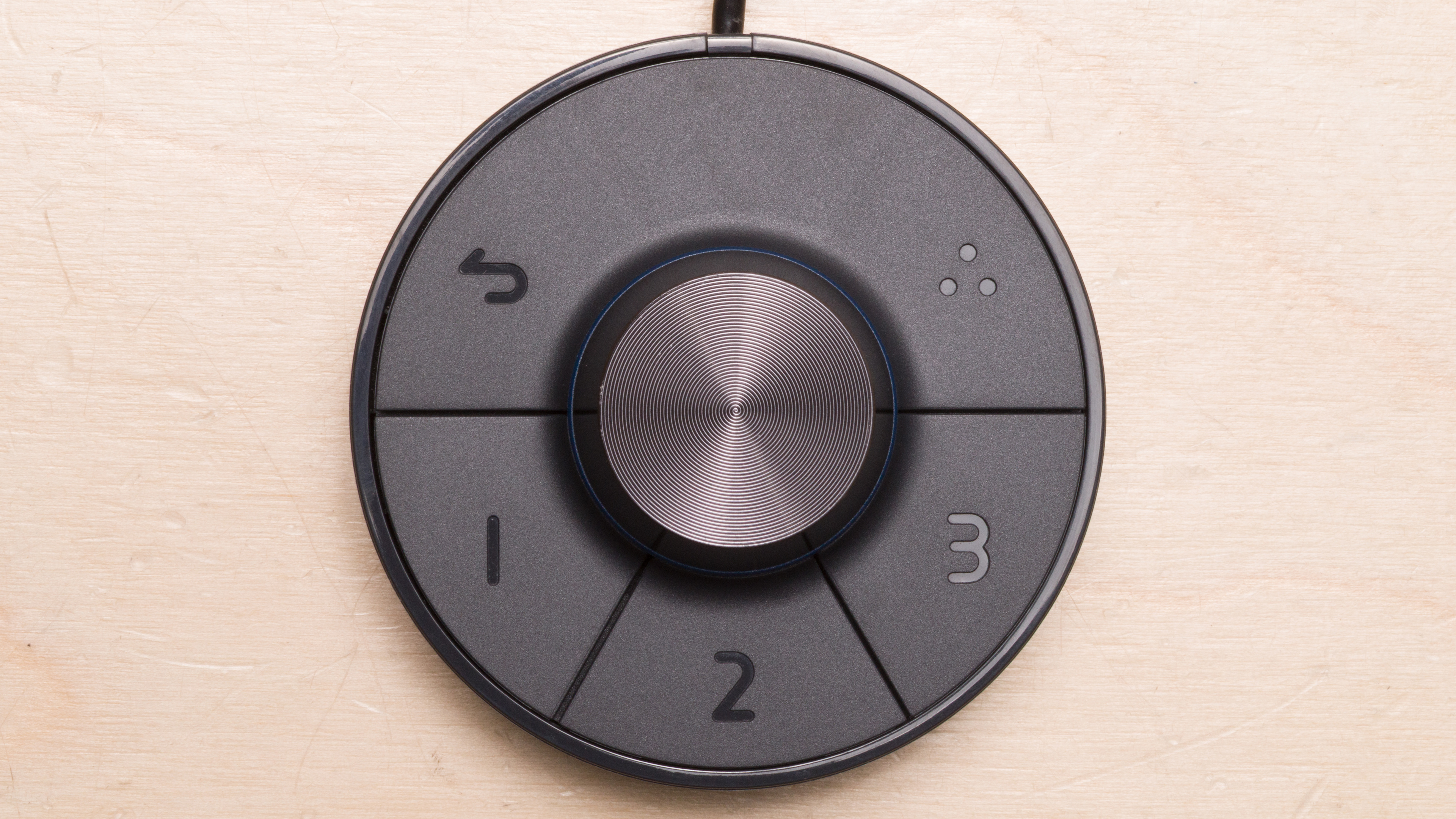 This monitor also has the external Hotkey Puck G2. You can use the dial to adjust brightness, contrast, volume, and you can assign shortcuts to the three function keys.