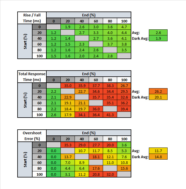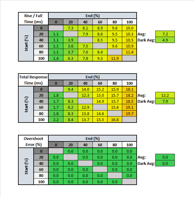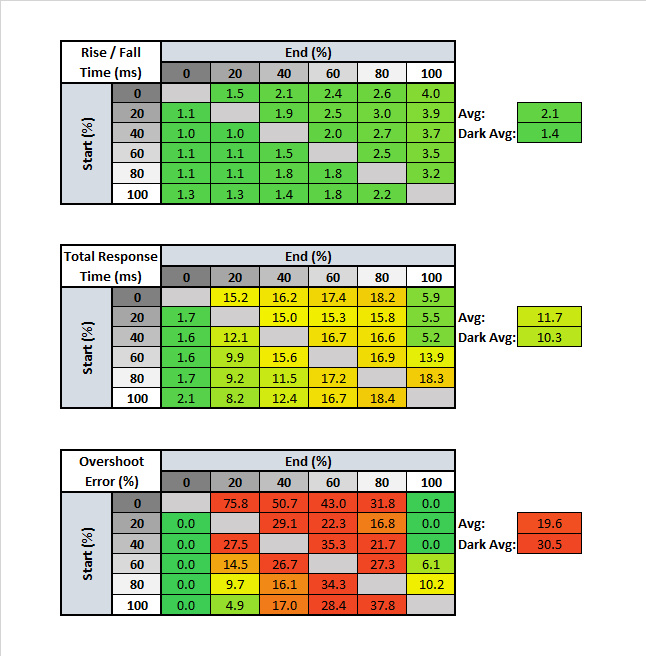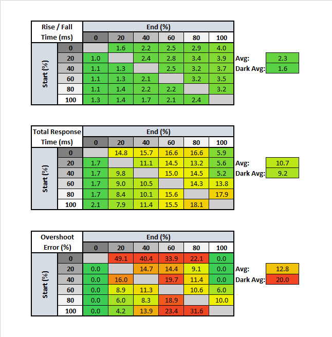 | Overdrive Setting | Response Time Chart | Response Time Tables | Motion Blur Photo |