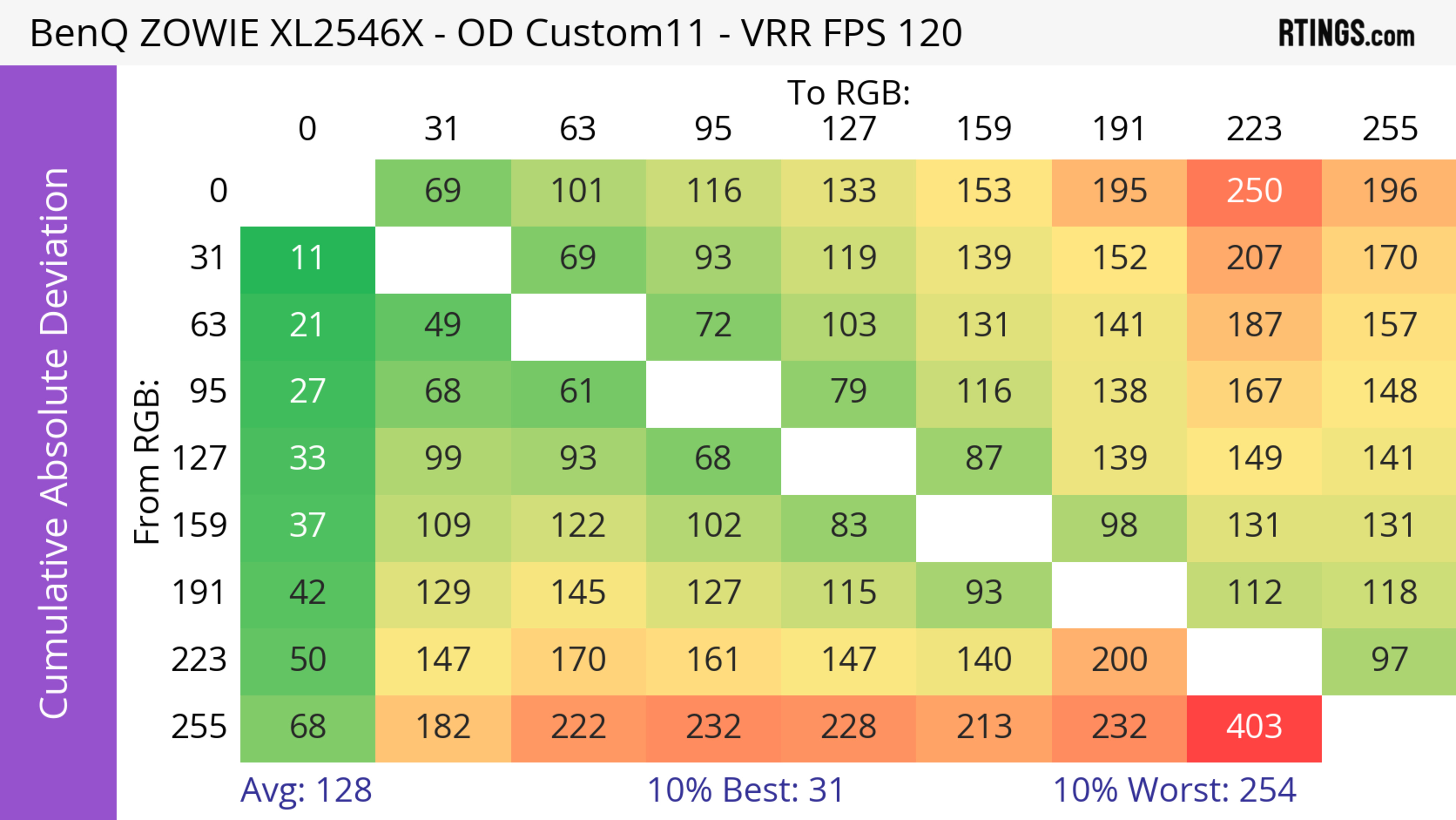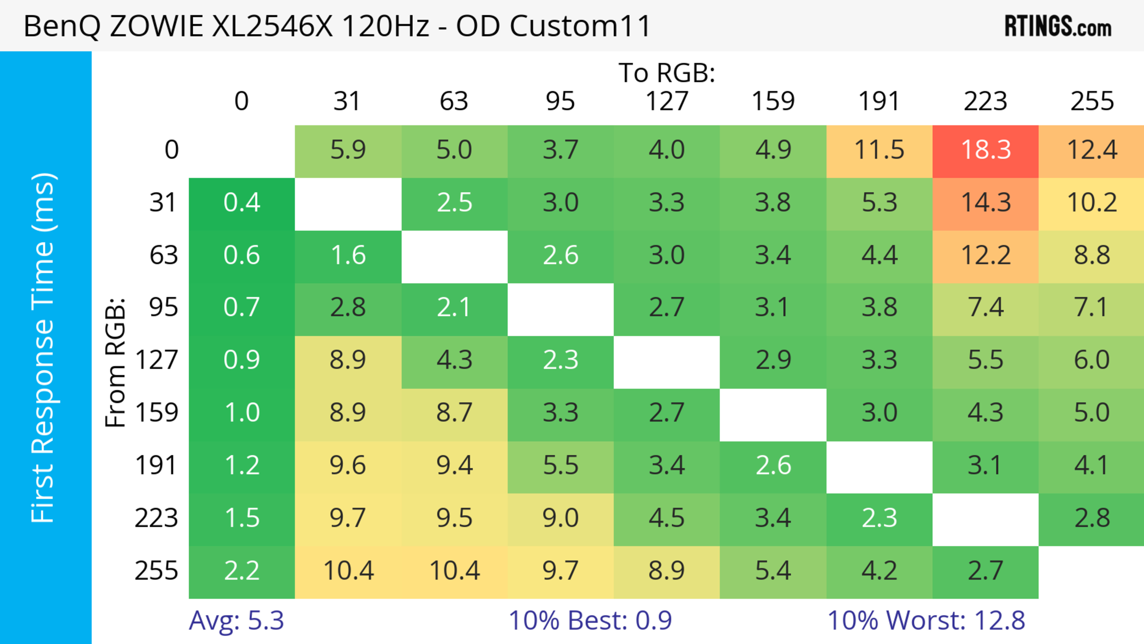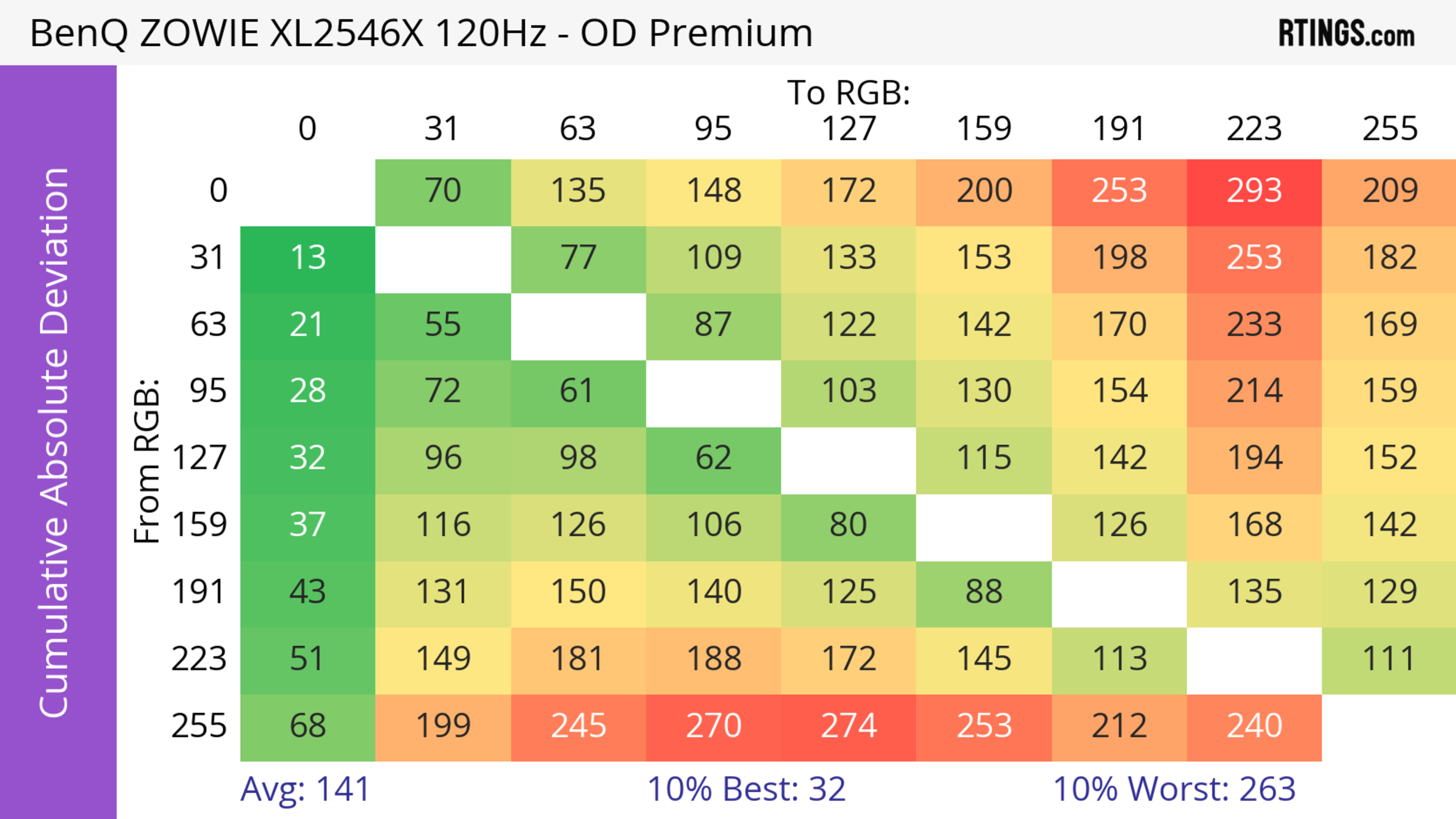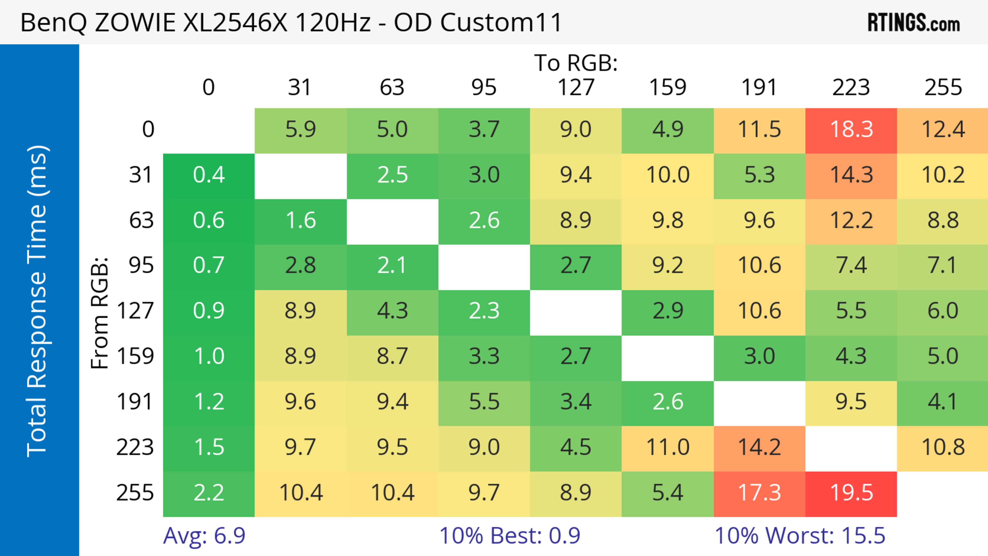 The CAD at 120Hz is great, and fast-moving objects look quite crisp. The 'Custom 11' overdrive setting has the best CAD if you set your monitor's refresh rate to 120Hz, with the fastest total response time and almost no overshoot.