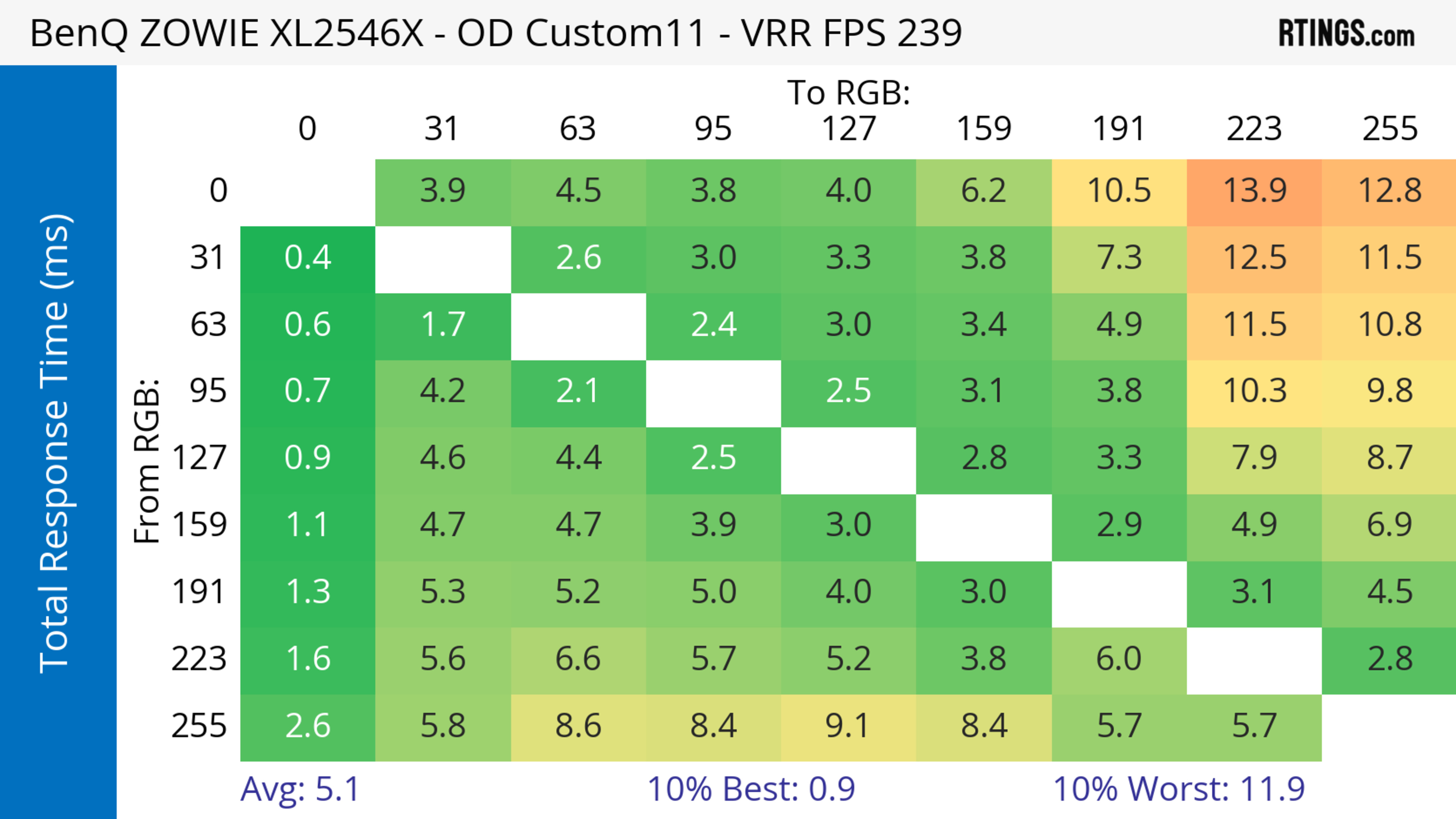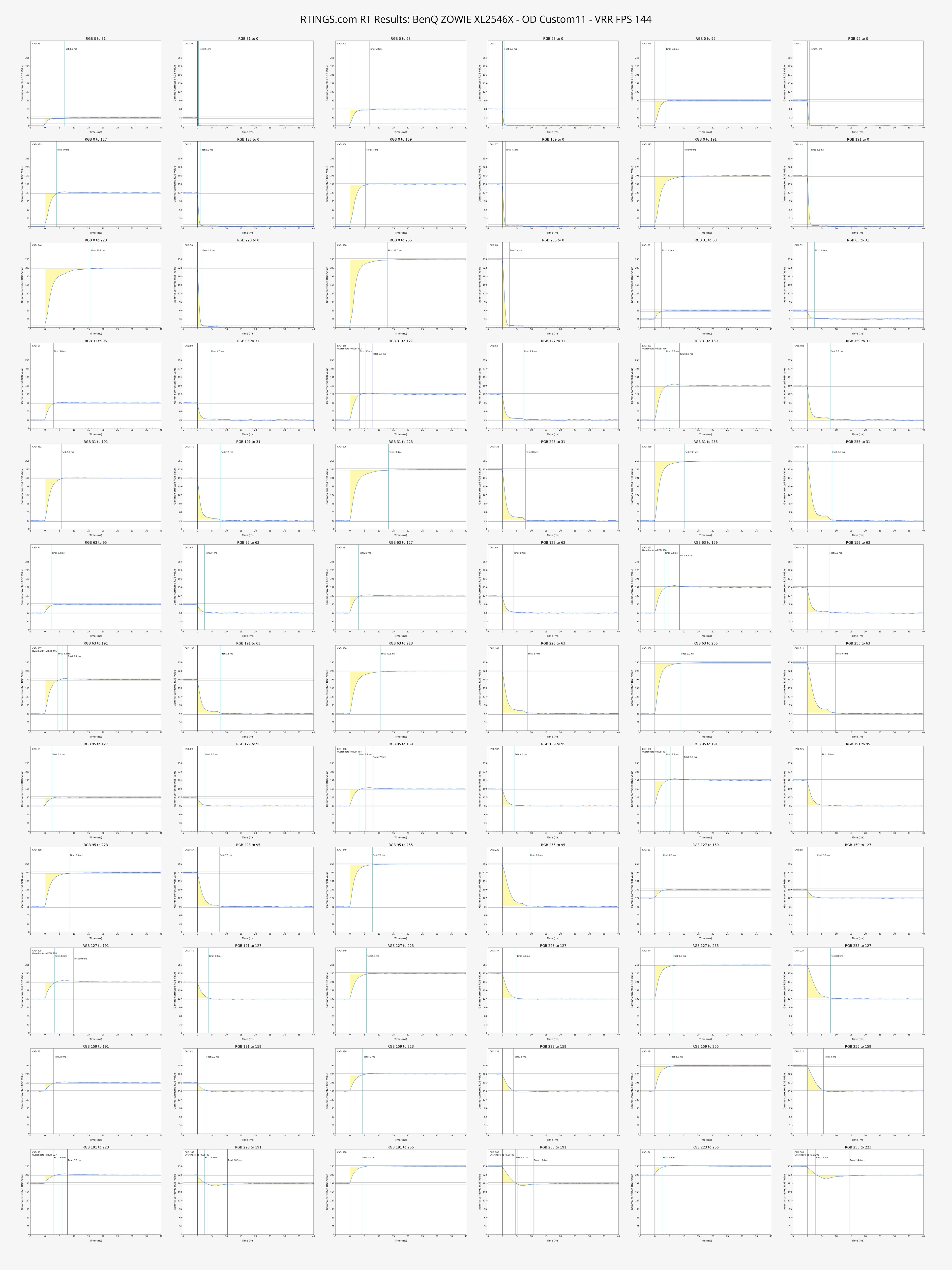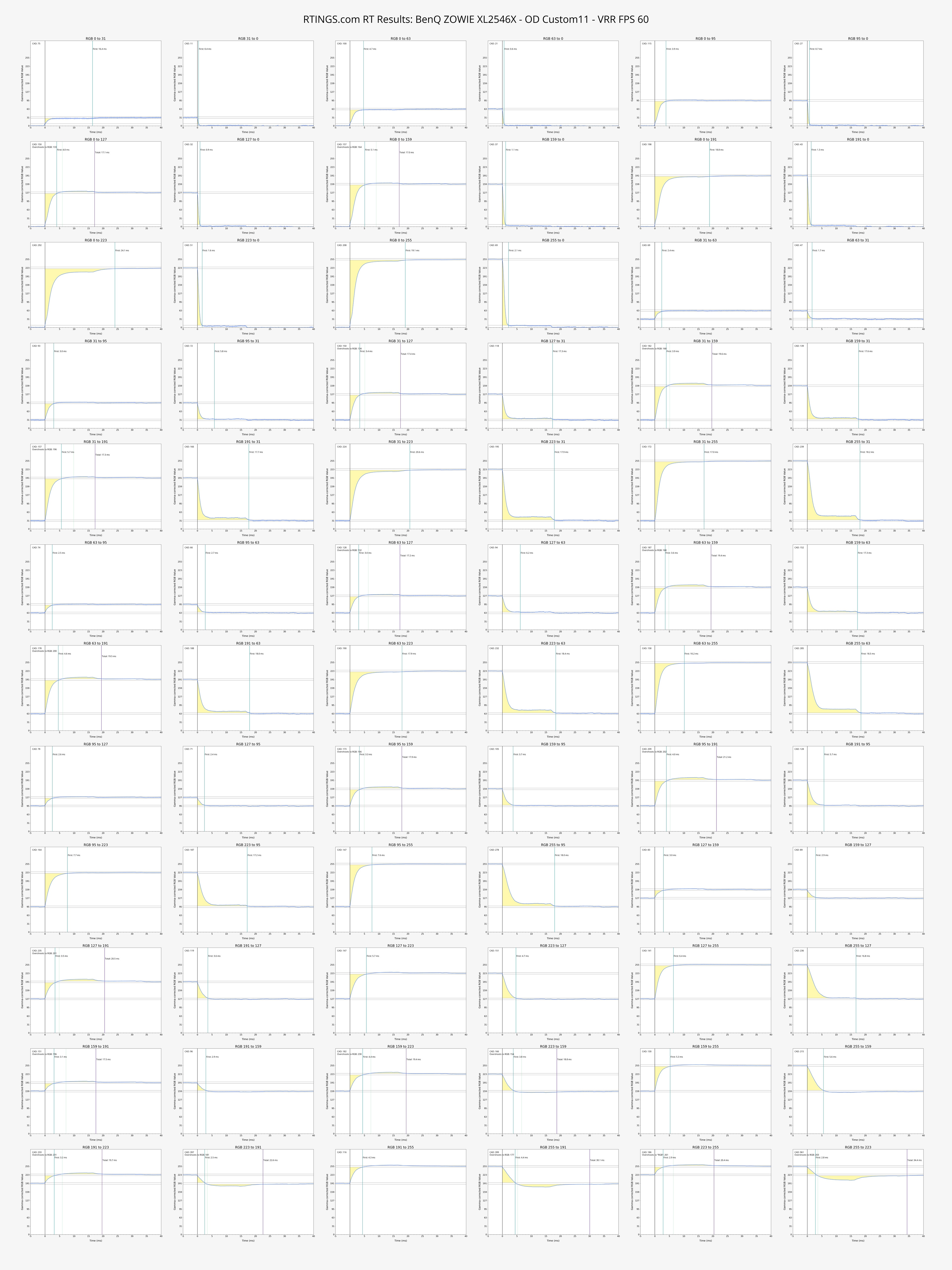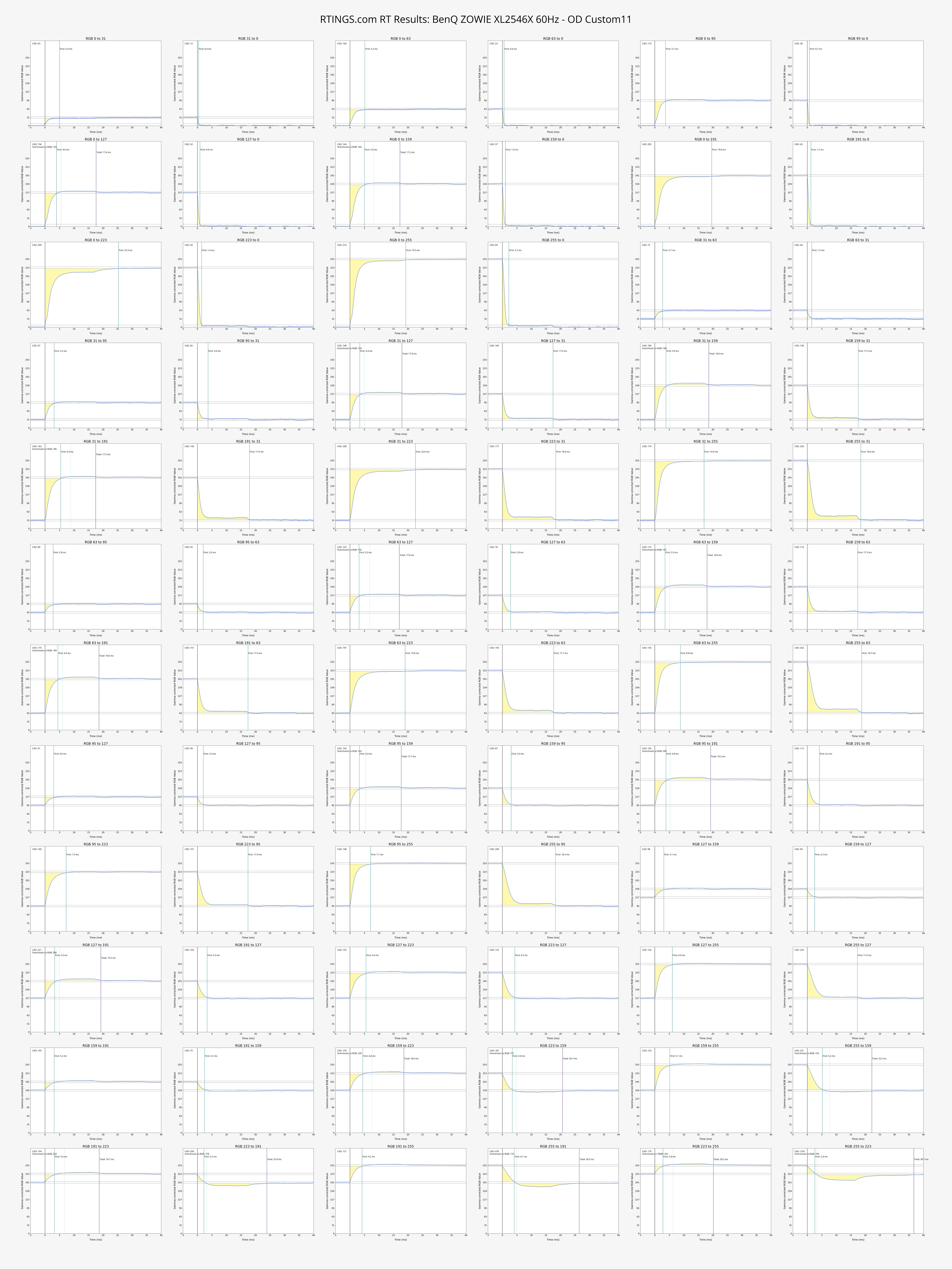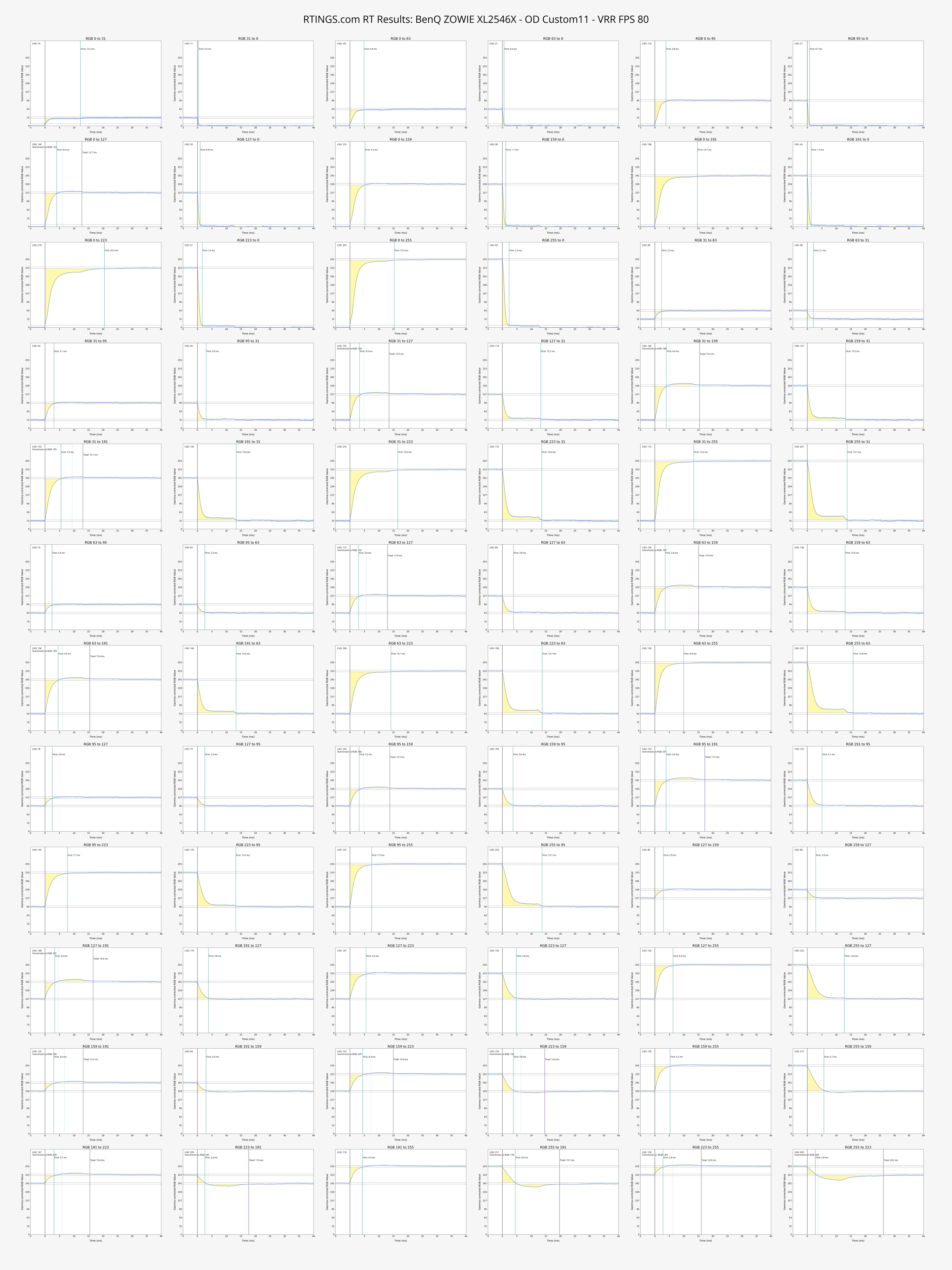 The refresh rate compliance is excellent. The 'Custom 11' and 'High' overdrive settings perform similarly. However, the response time isn't fast enough to take full advantage of the monitor's high refresh rate. That said, it's much better at lower refresh rates.