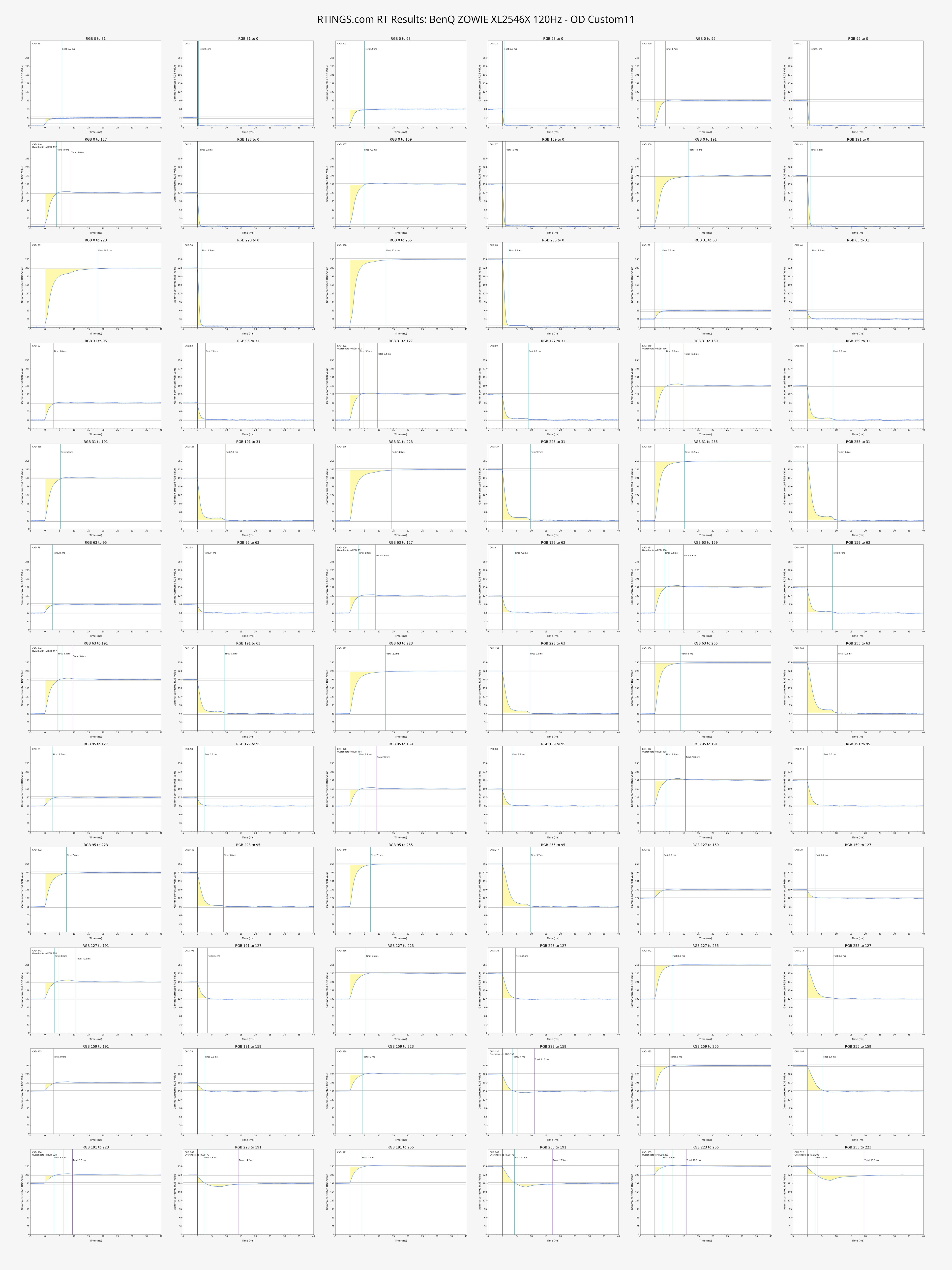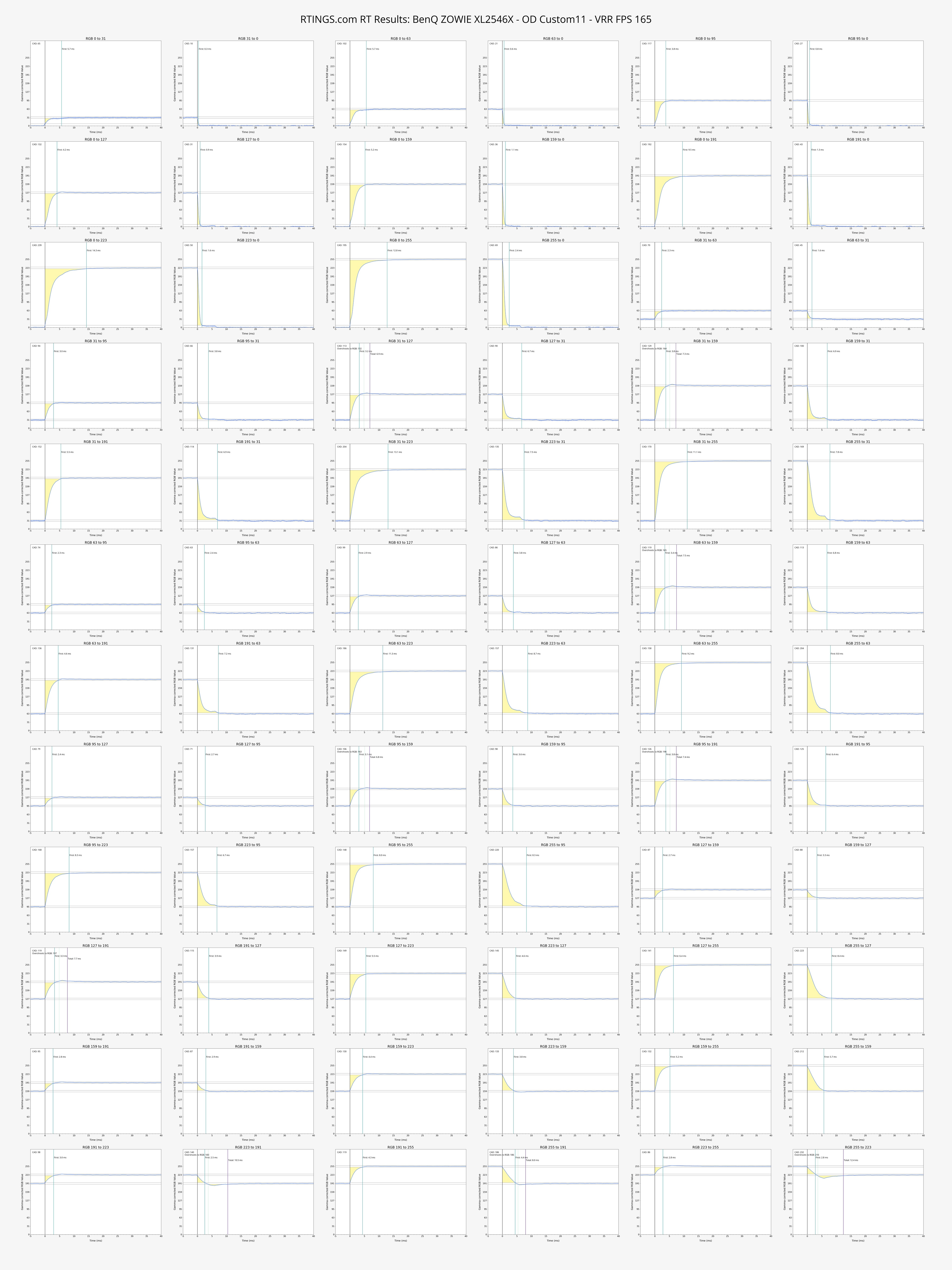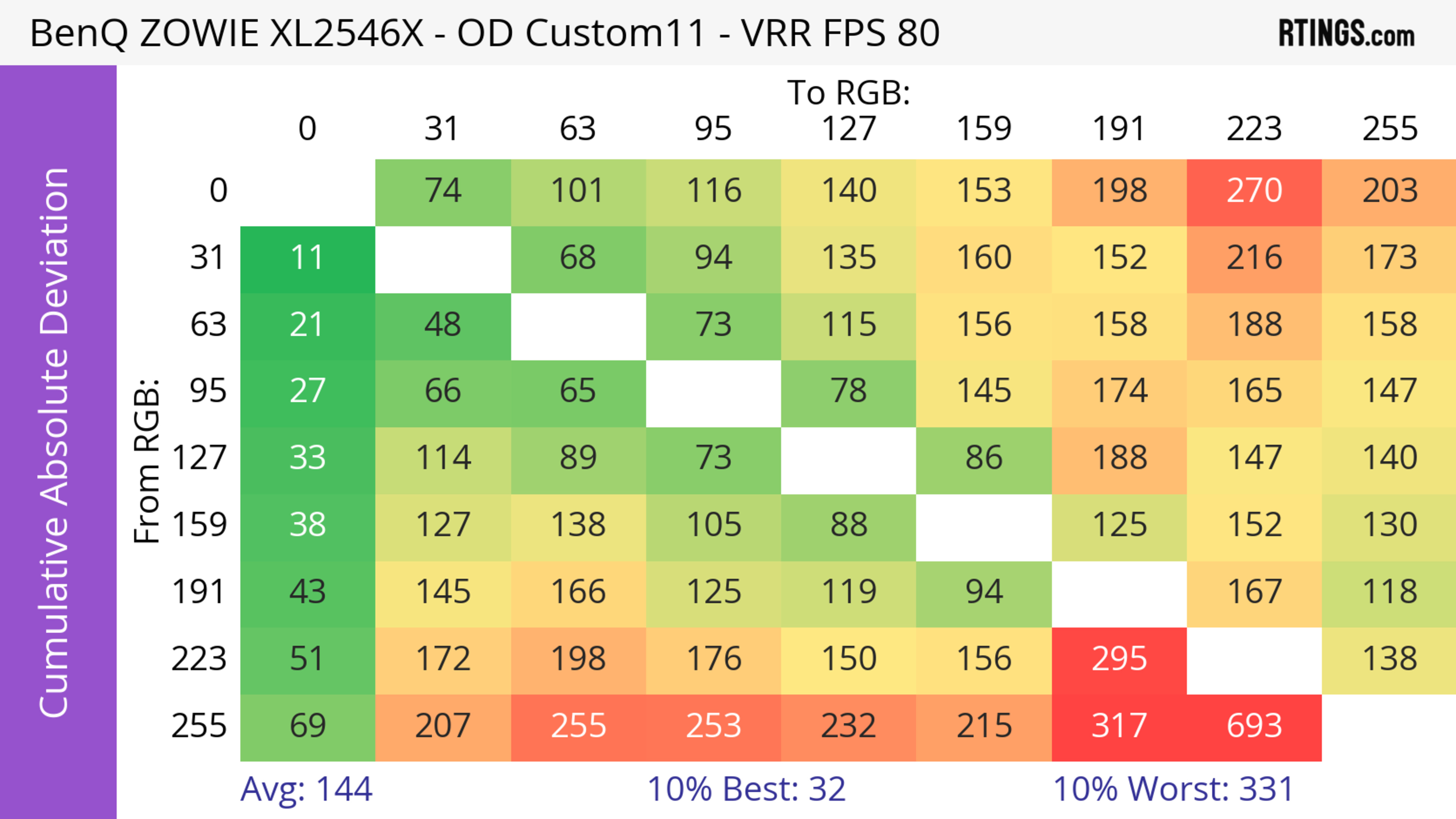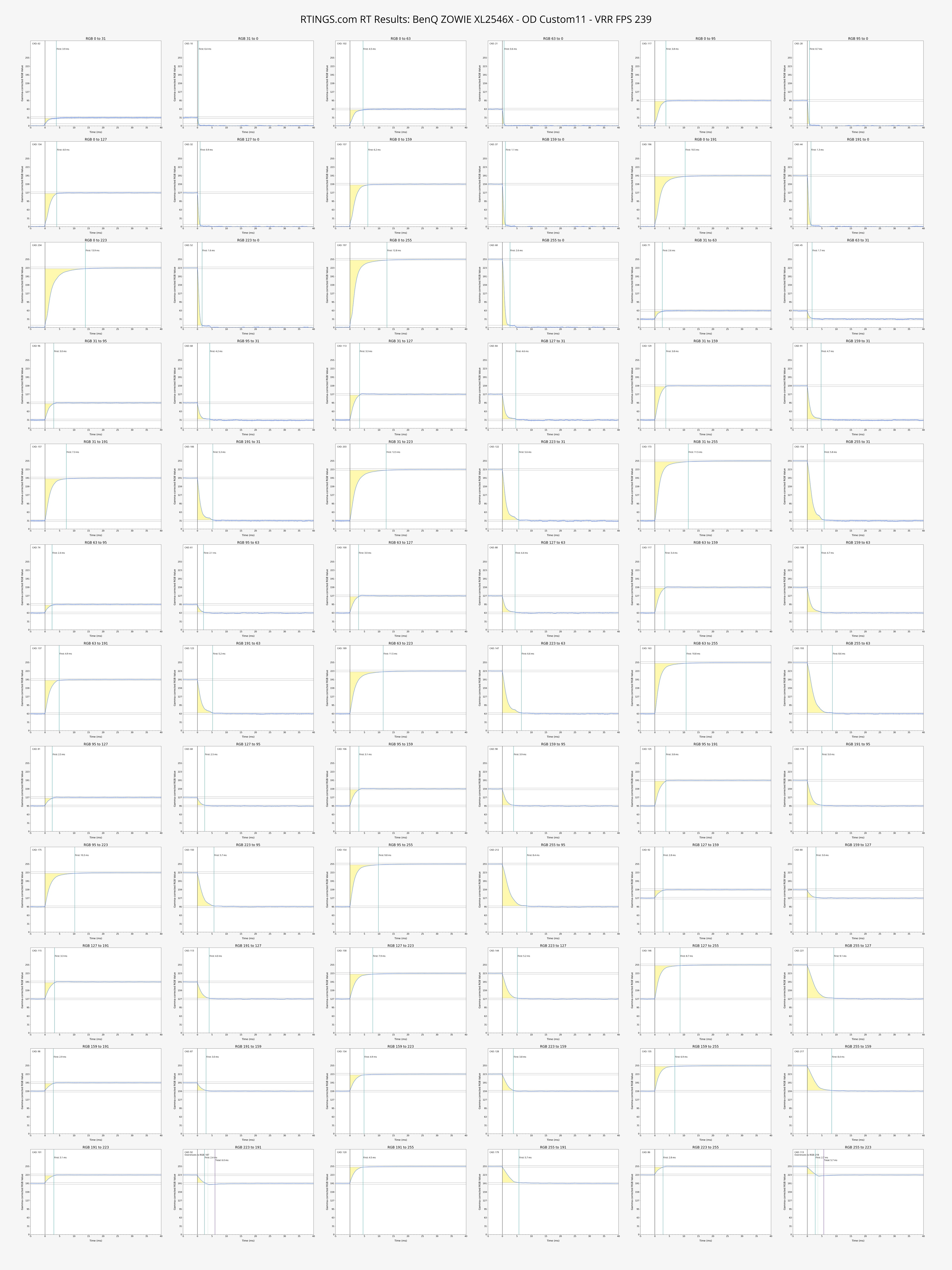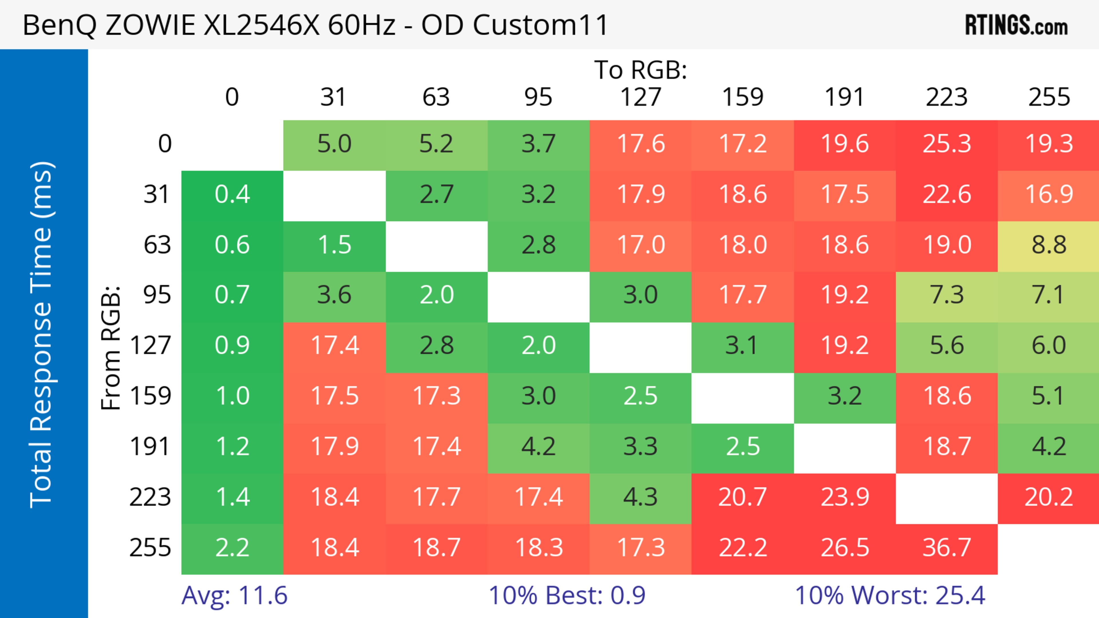 The refresh rate compliance is excellent. The 'Custom 11' and 'High' overdrive settings perform similarly. However, the response time isn't fast enough to take full advantage of the monitor's high refresh rate. That said, it's much better at lower refresh rates.
