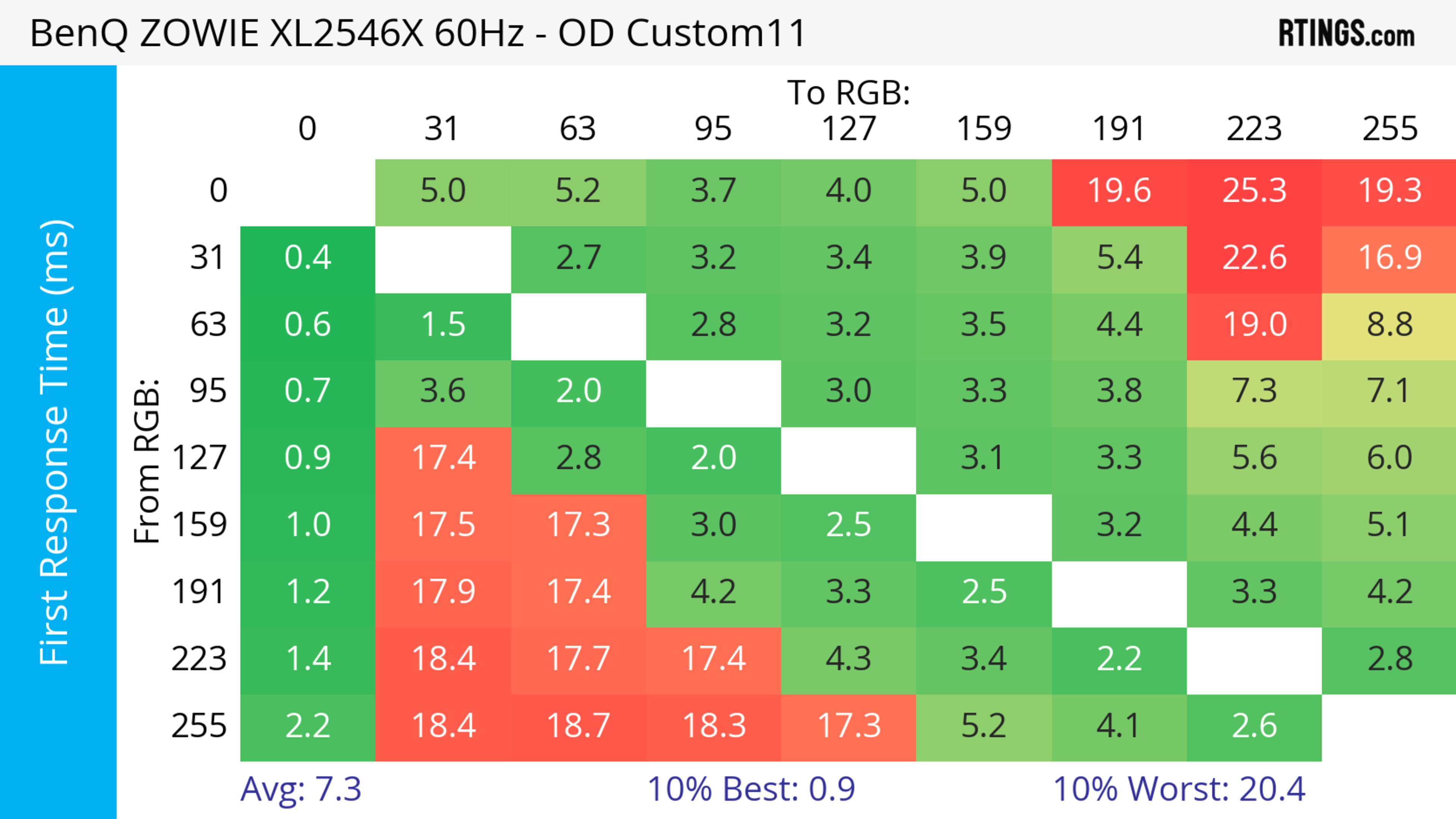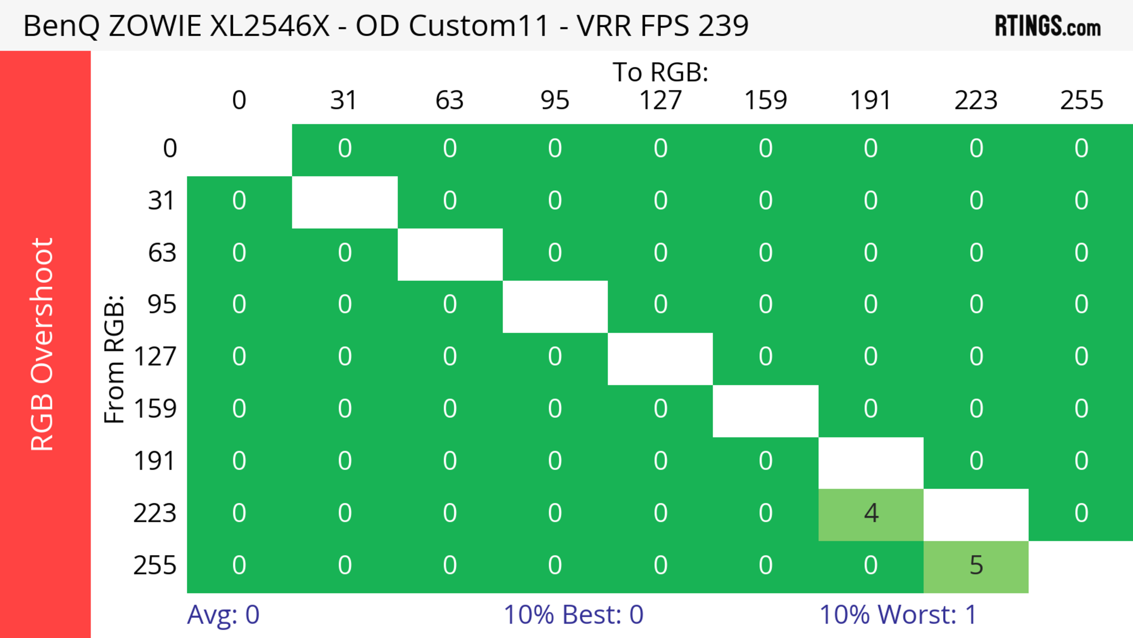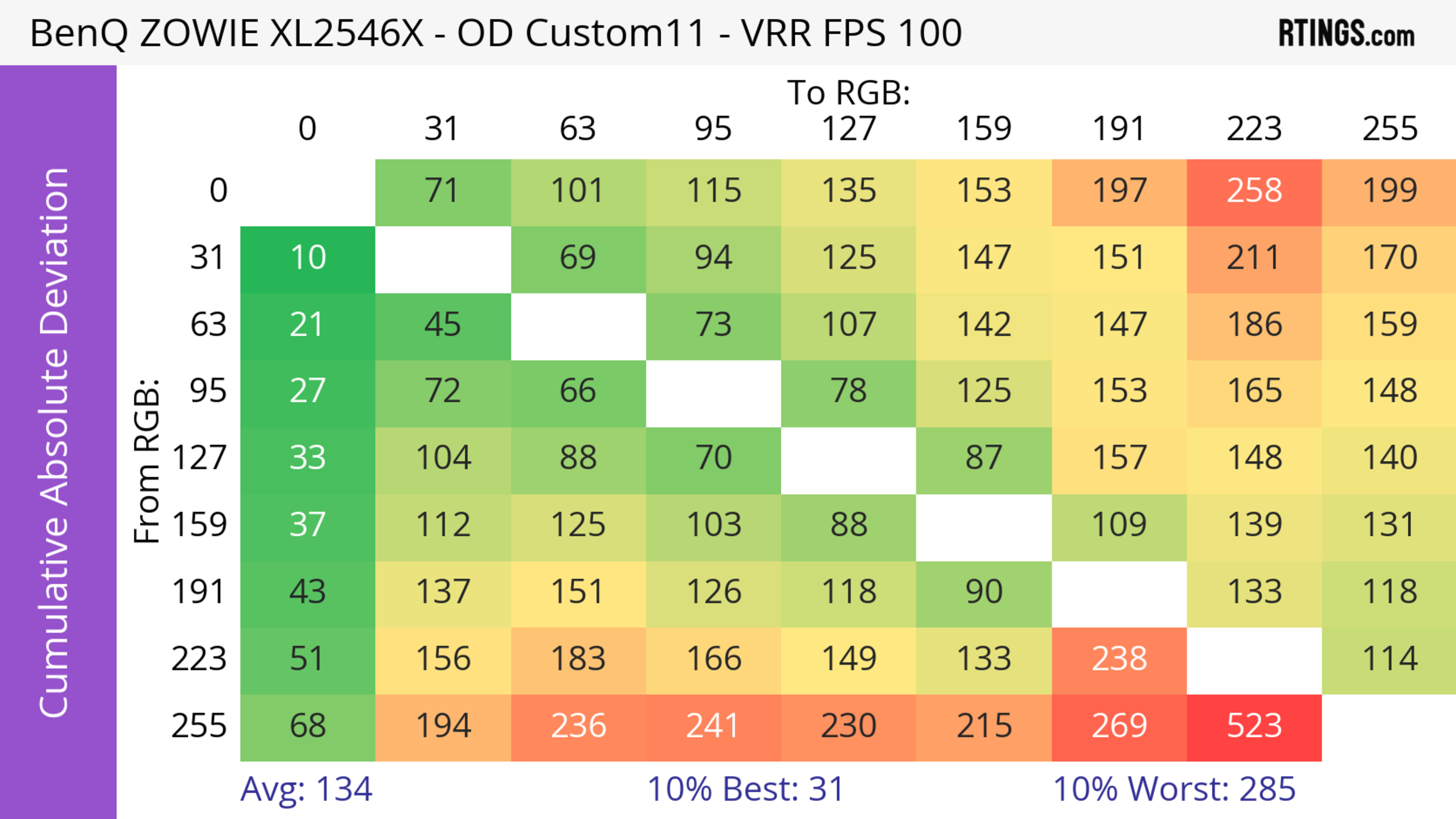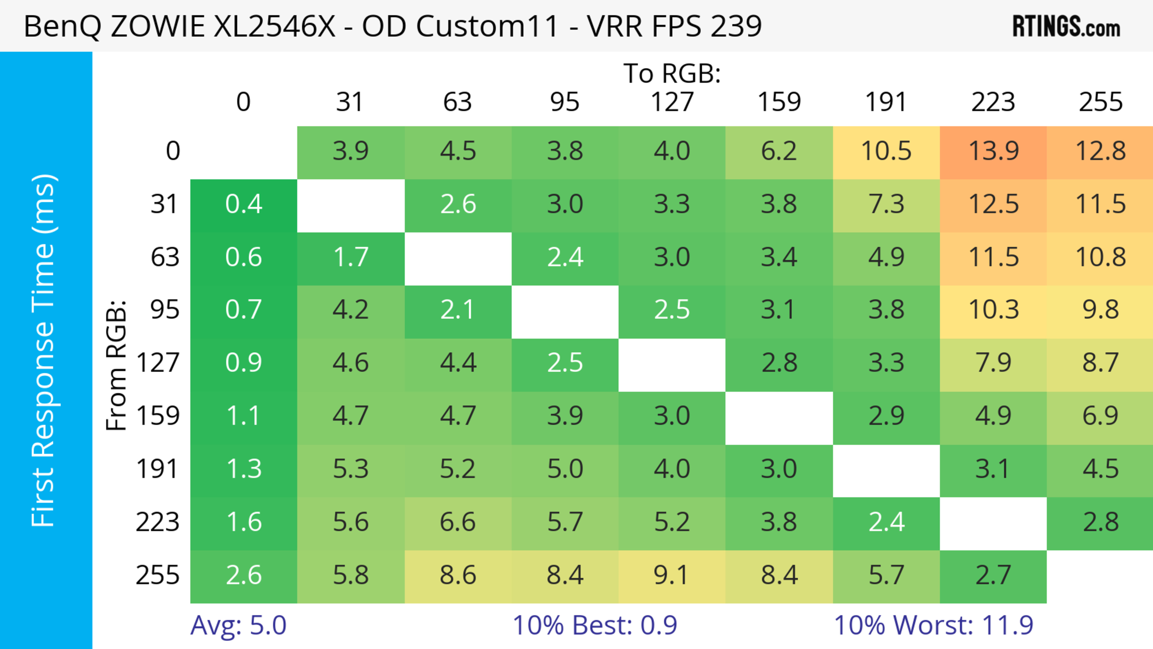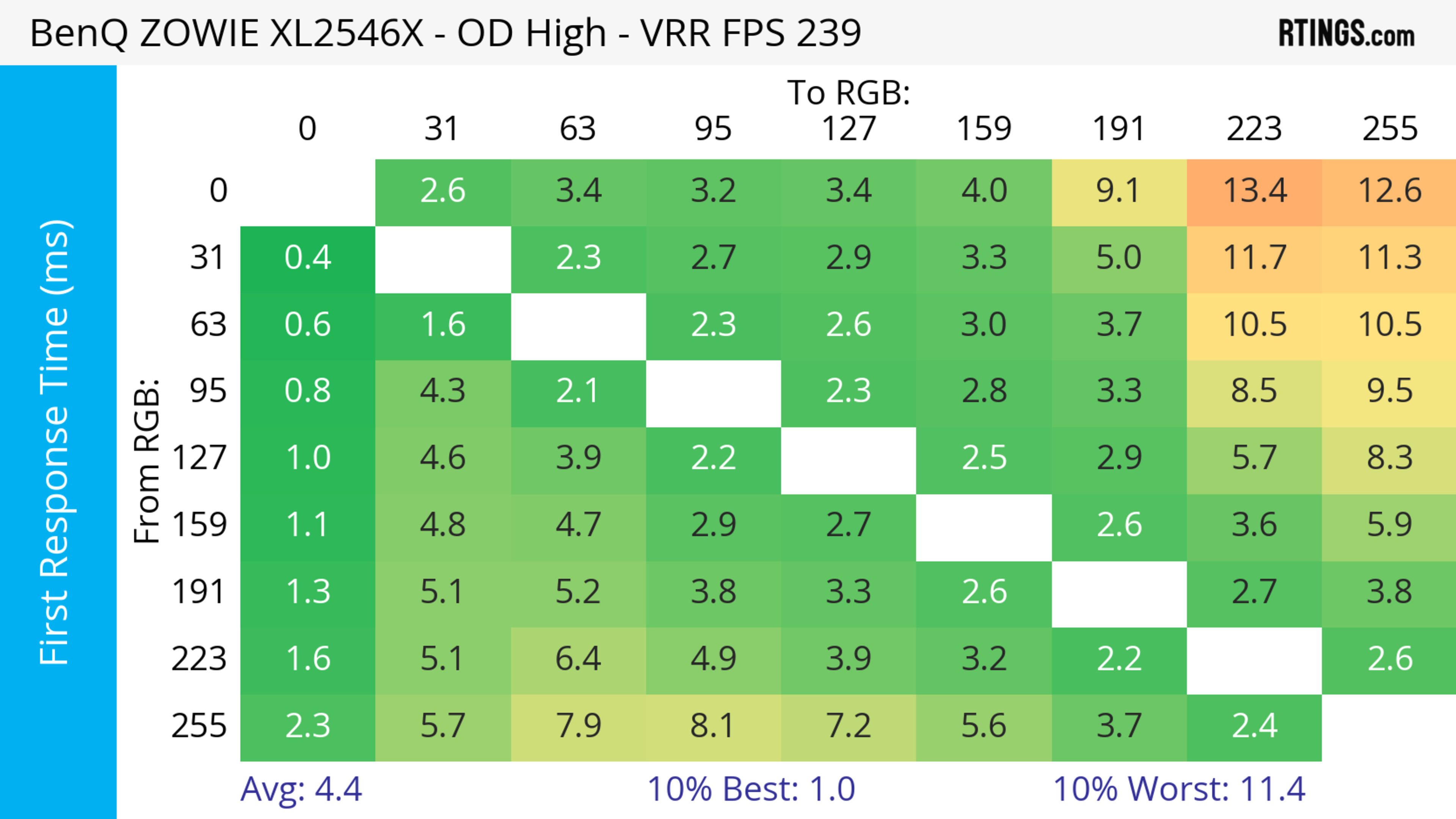 The refresh rate compliance is excellent. The 'Custom 11' and 'High' overdrive settings perform similarly. However, the response time isn't fast enough to take full advantage of the monitor's high refresh rate. That said, it's much better at lower refresh rates.