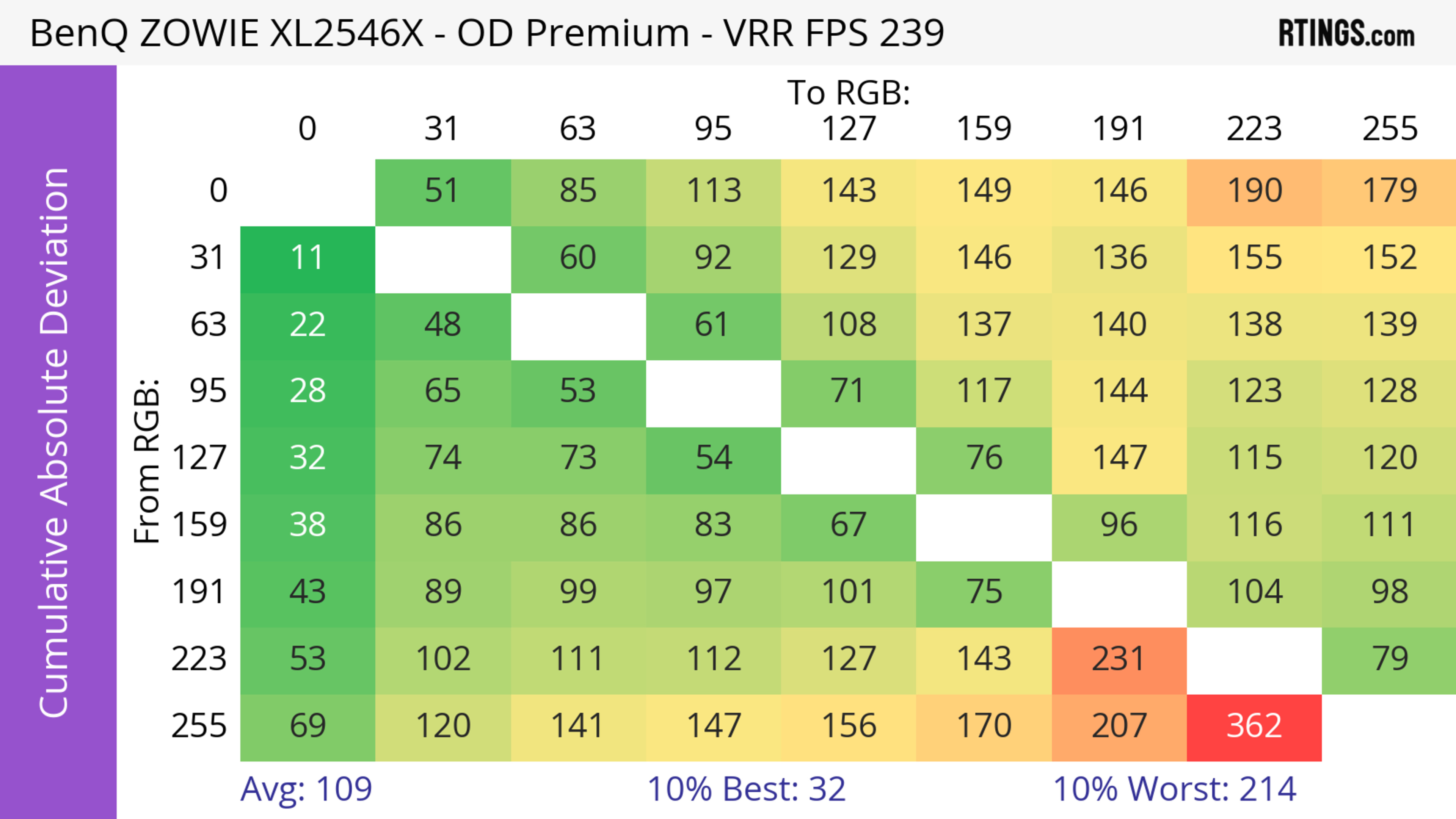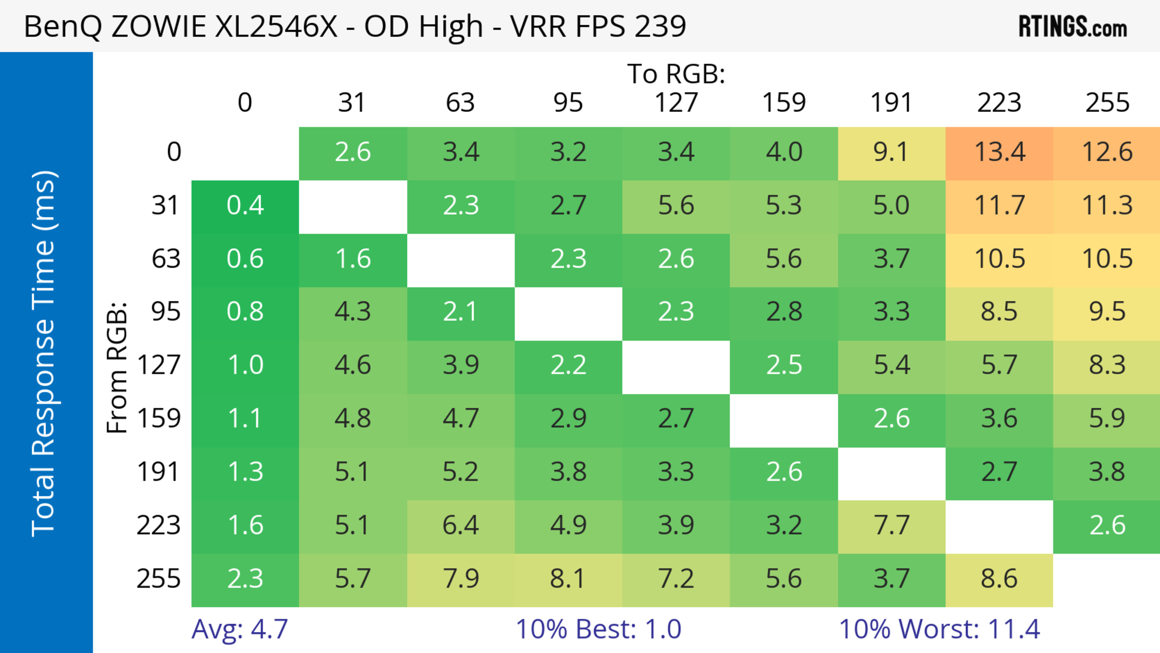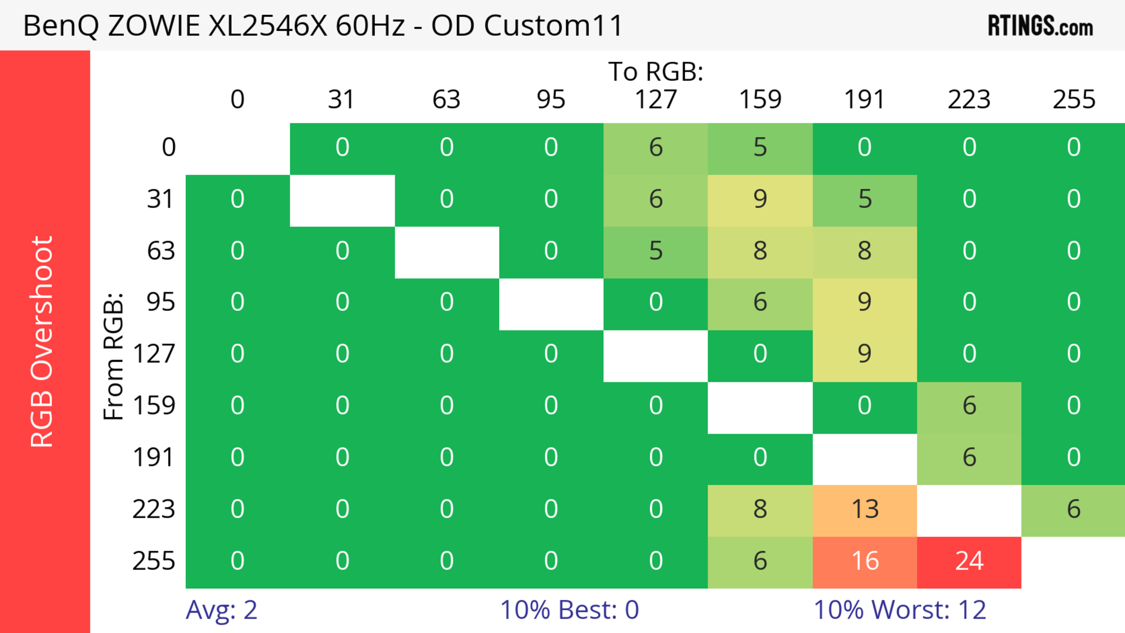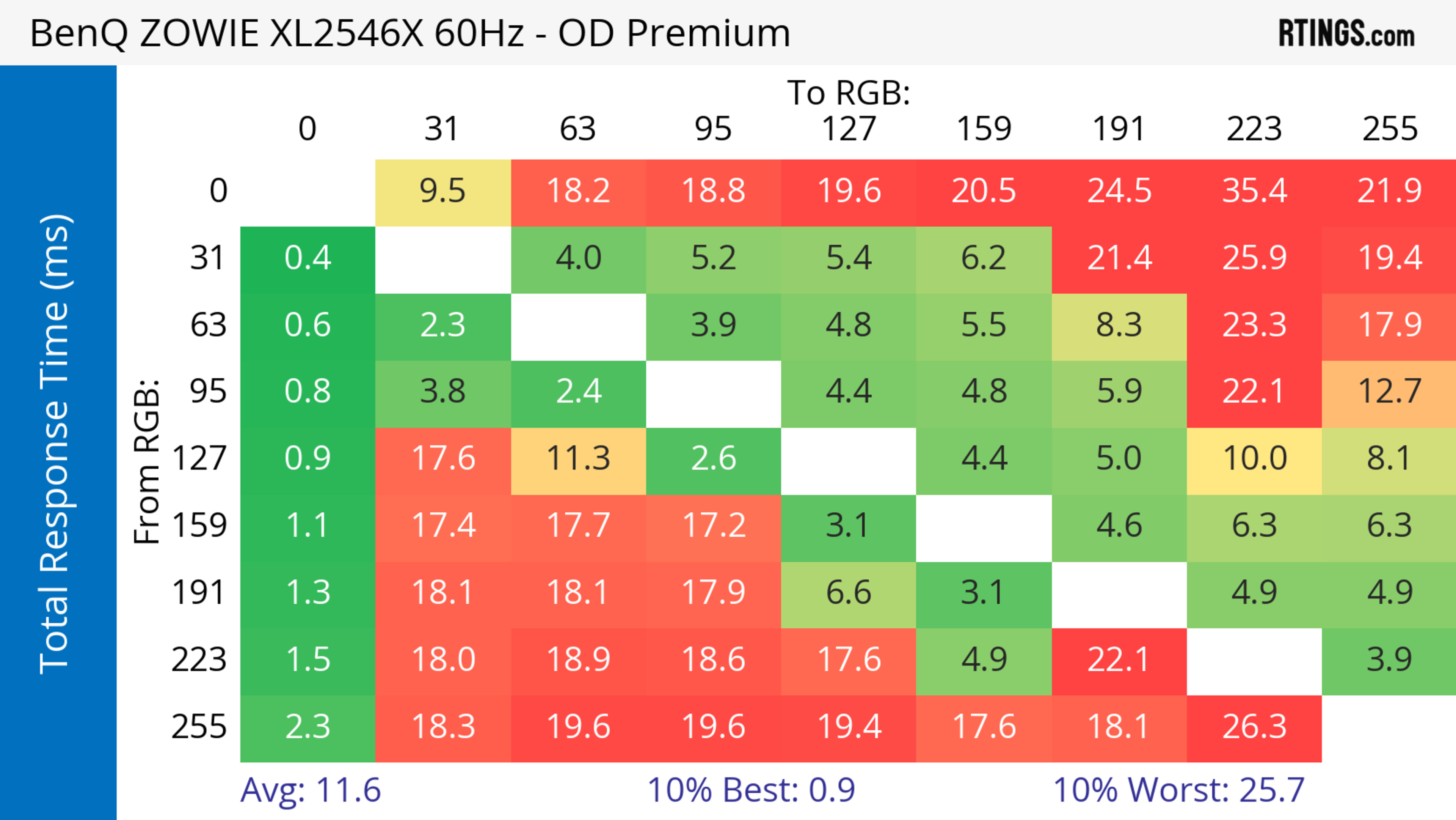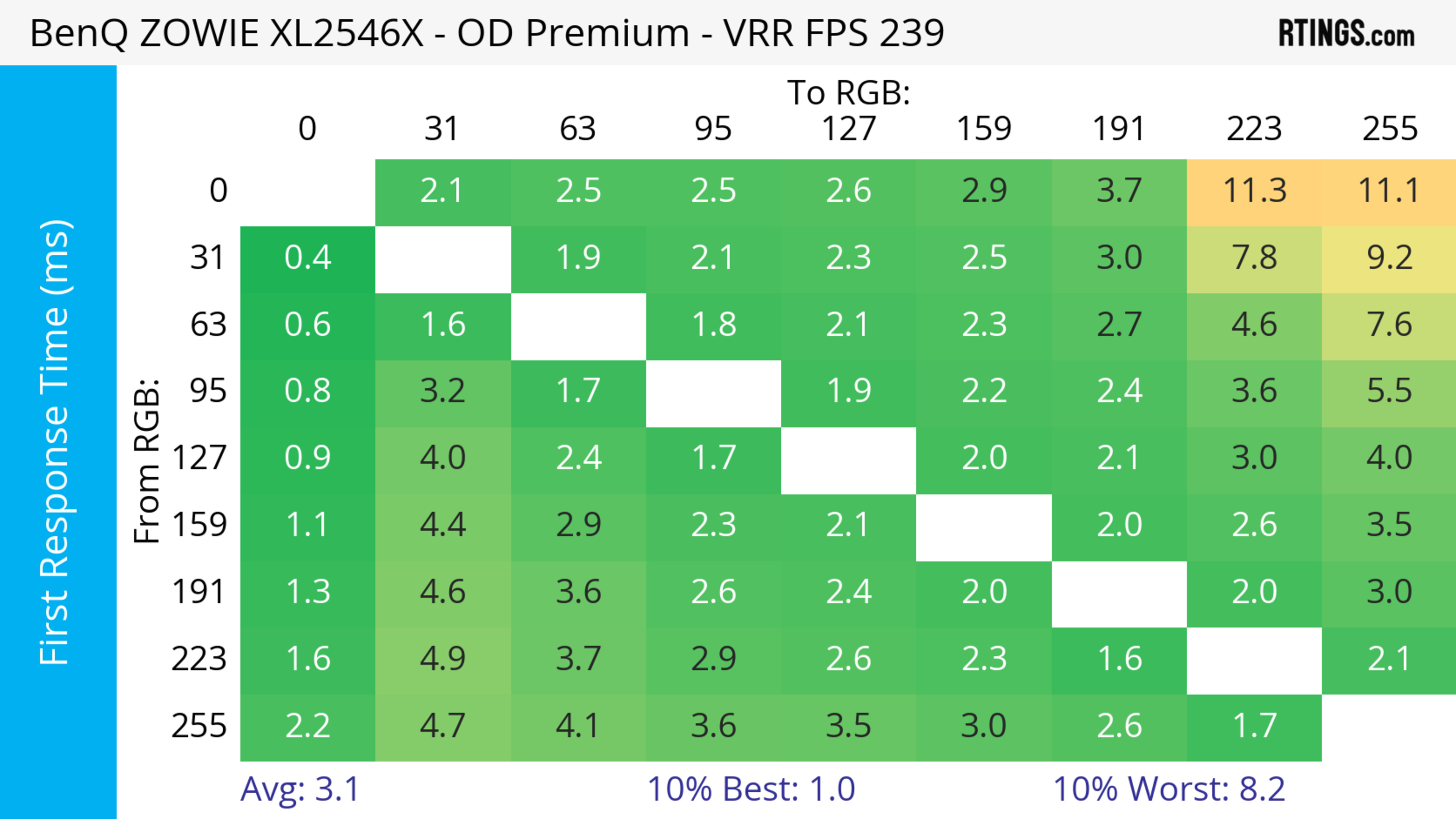 The refresh rate compliance is excellent. The 'Custom 11' and 'High' overdrive settings perform similarly. However, the response time isn't fast enough to take full advantage of the monitor's high refresh rate. That said, it's much better at lower refresh rates.