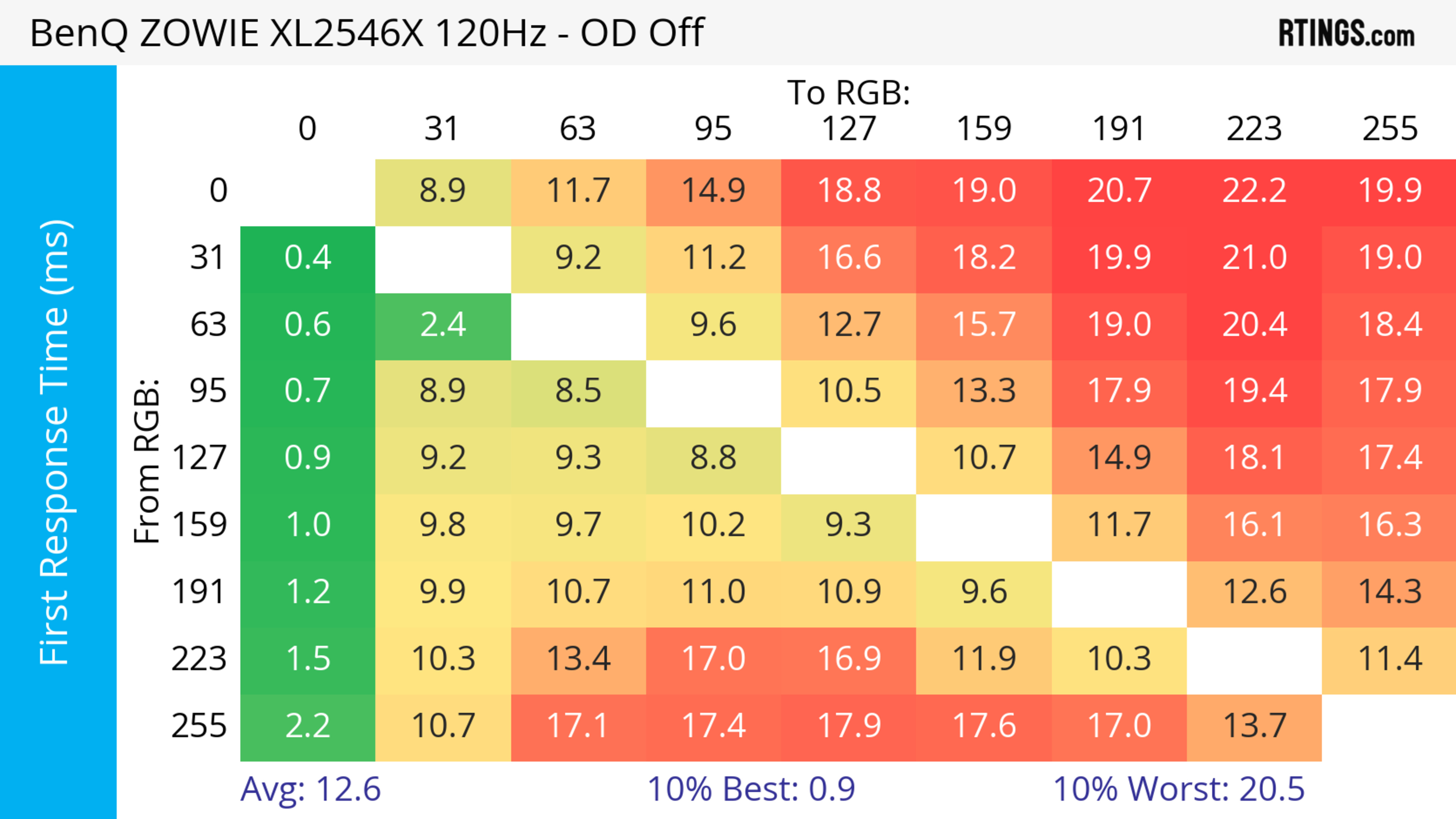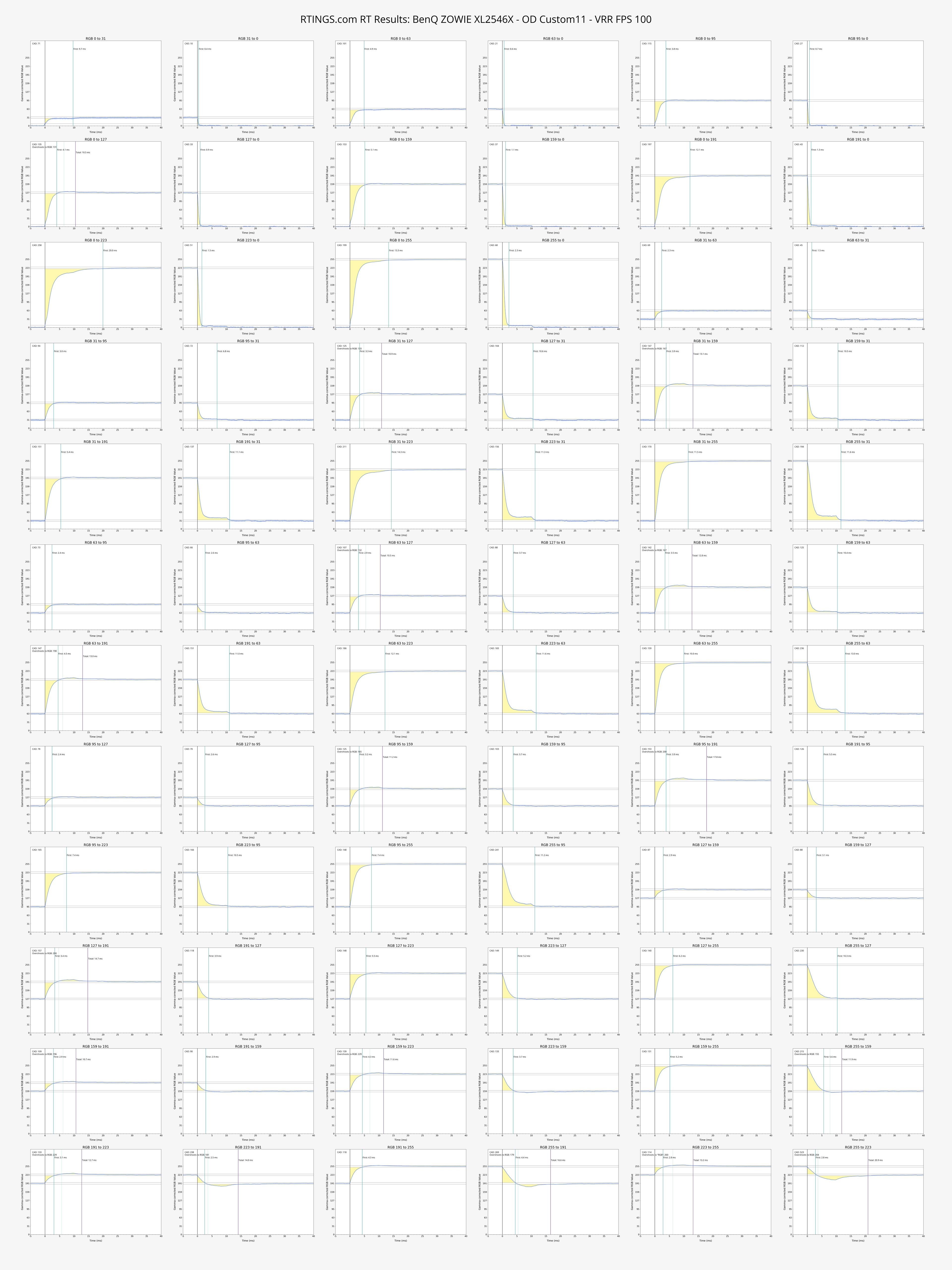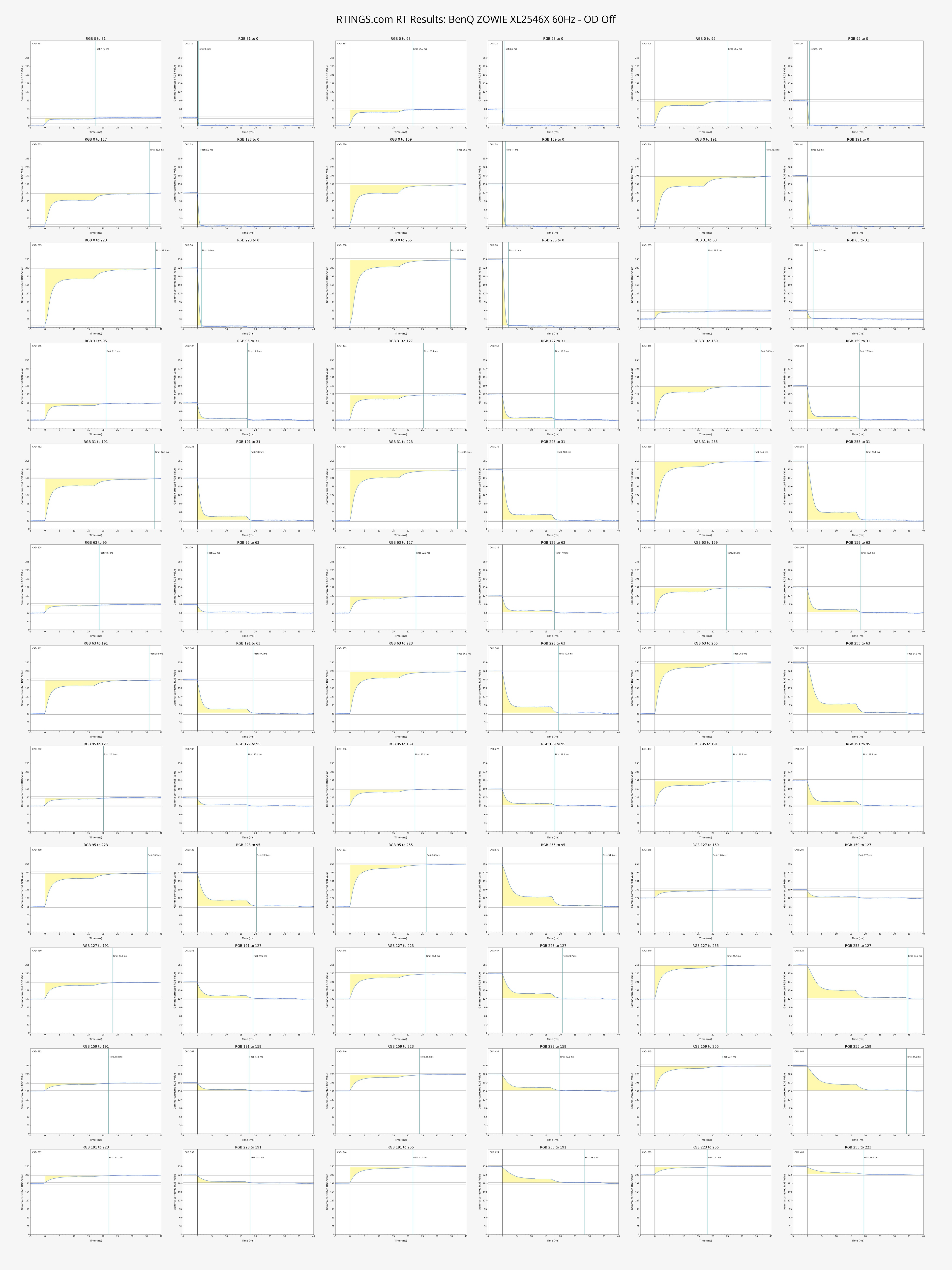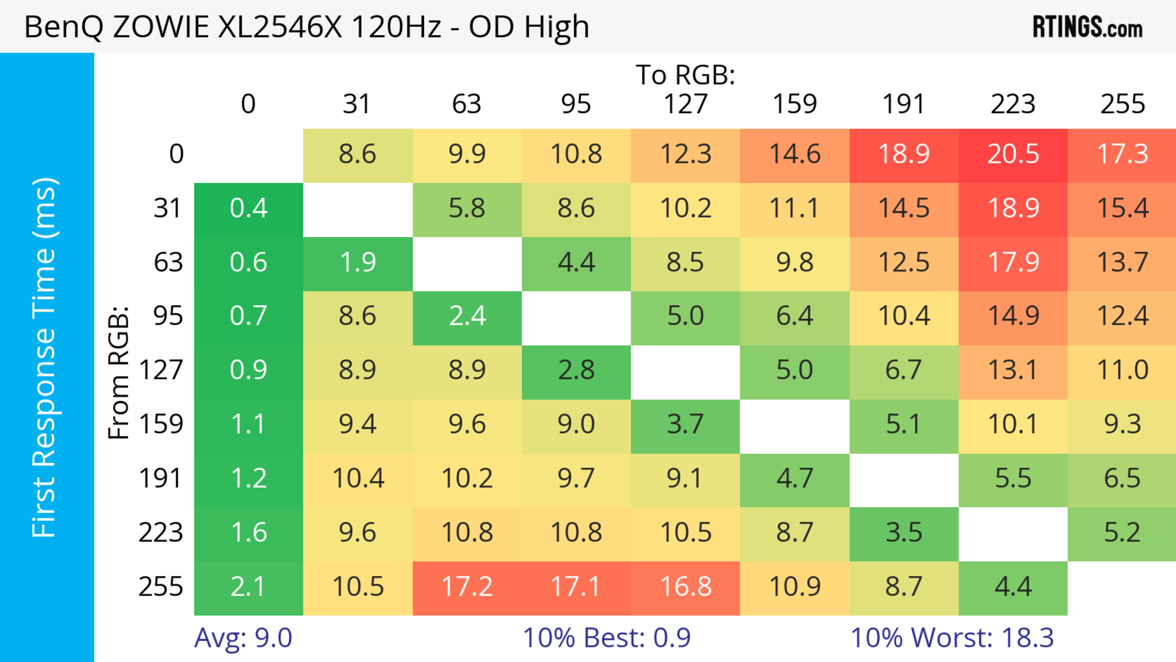 The BenQ ZOWIE XL2546X has an impressive response time. It maintains a fast response time across its VRR range, leading to sharp motion. It also has excellent refresh rate compliance, meaning its response time is fast enough to take full advantage of 120 fps and 60 fps sources.