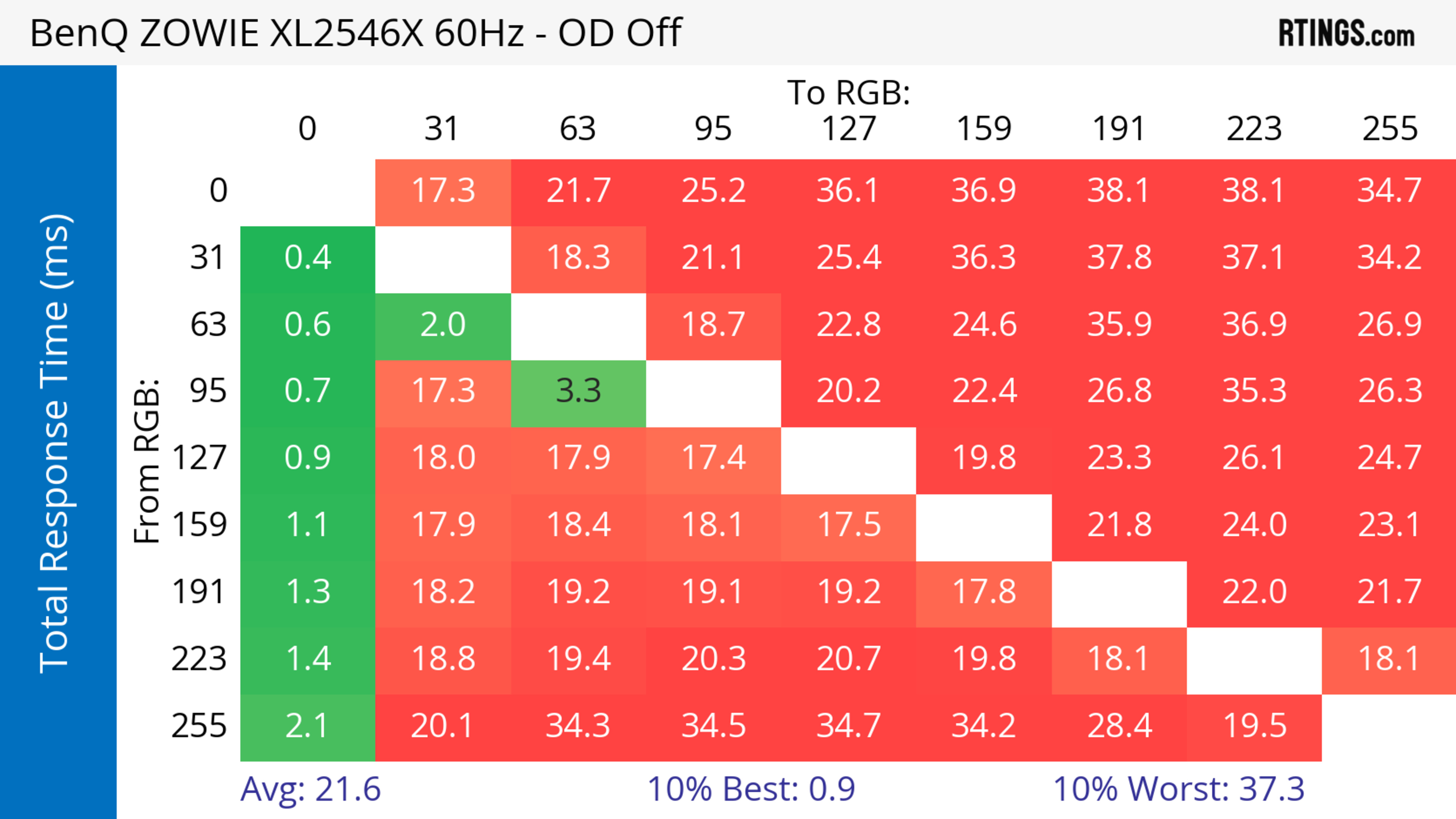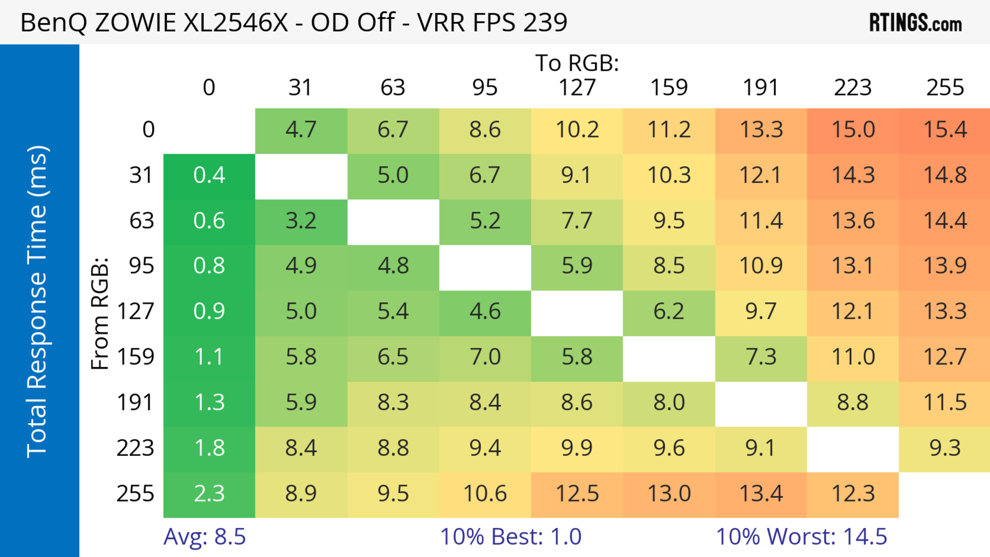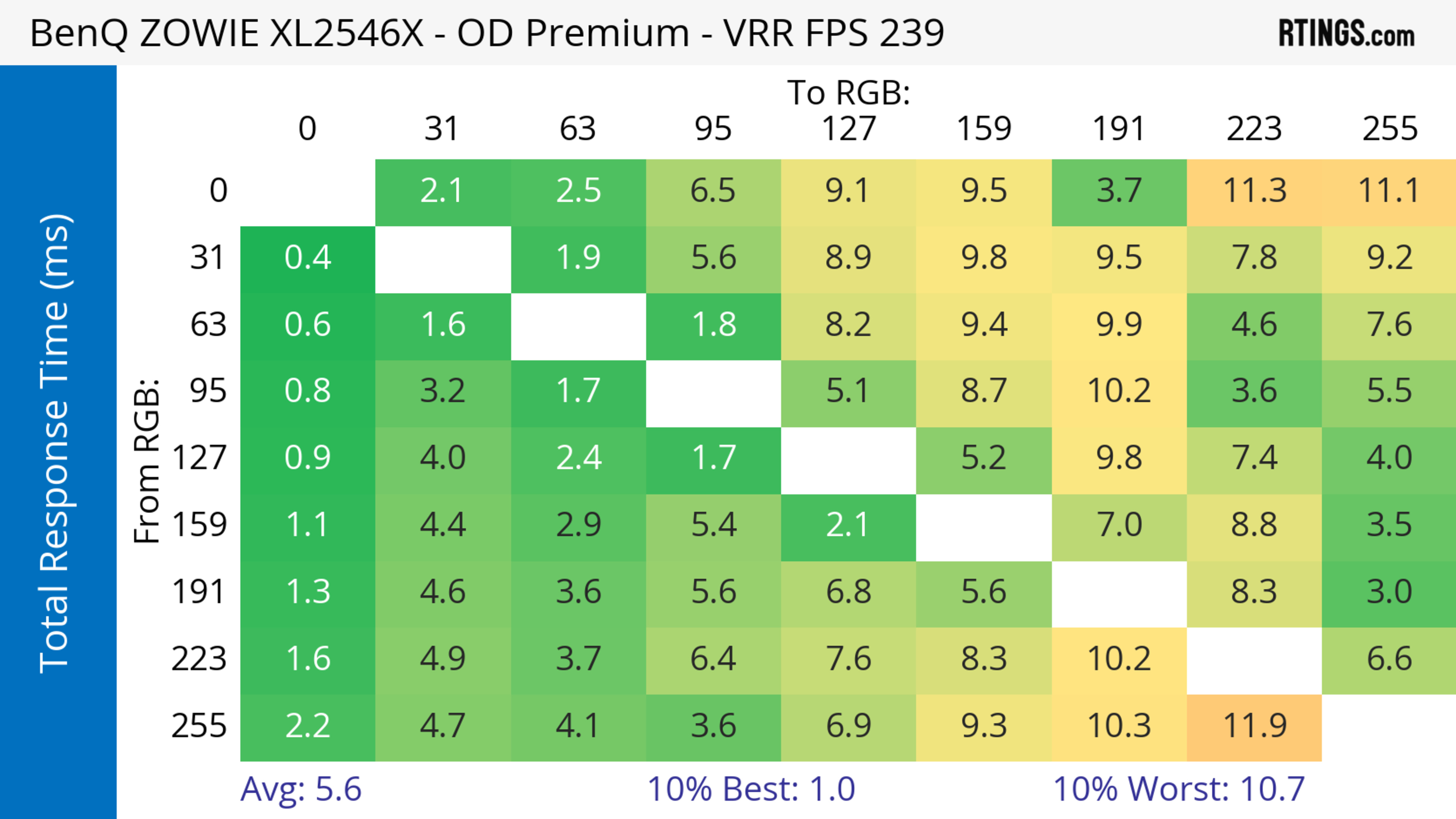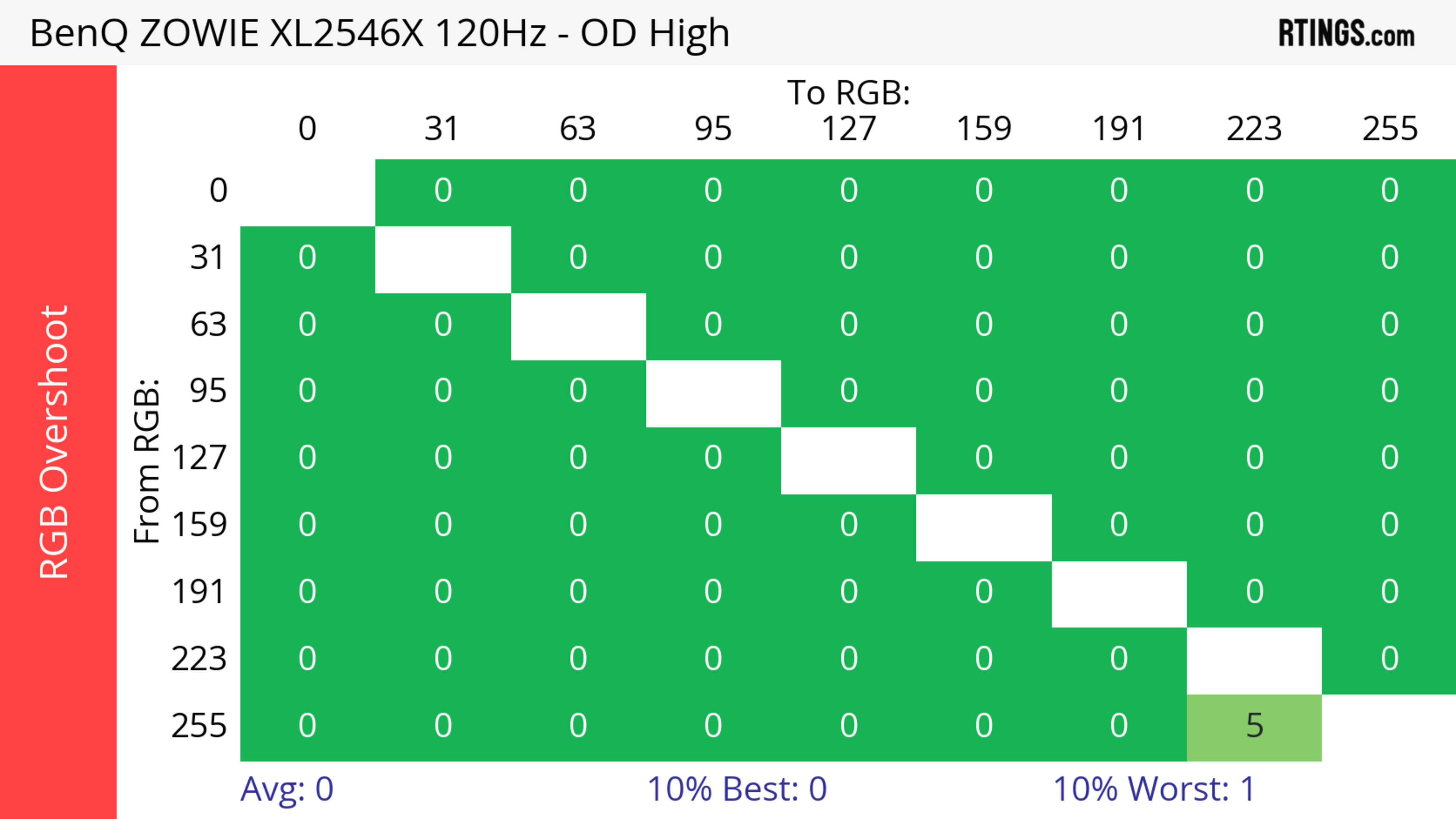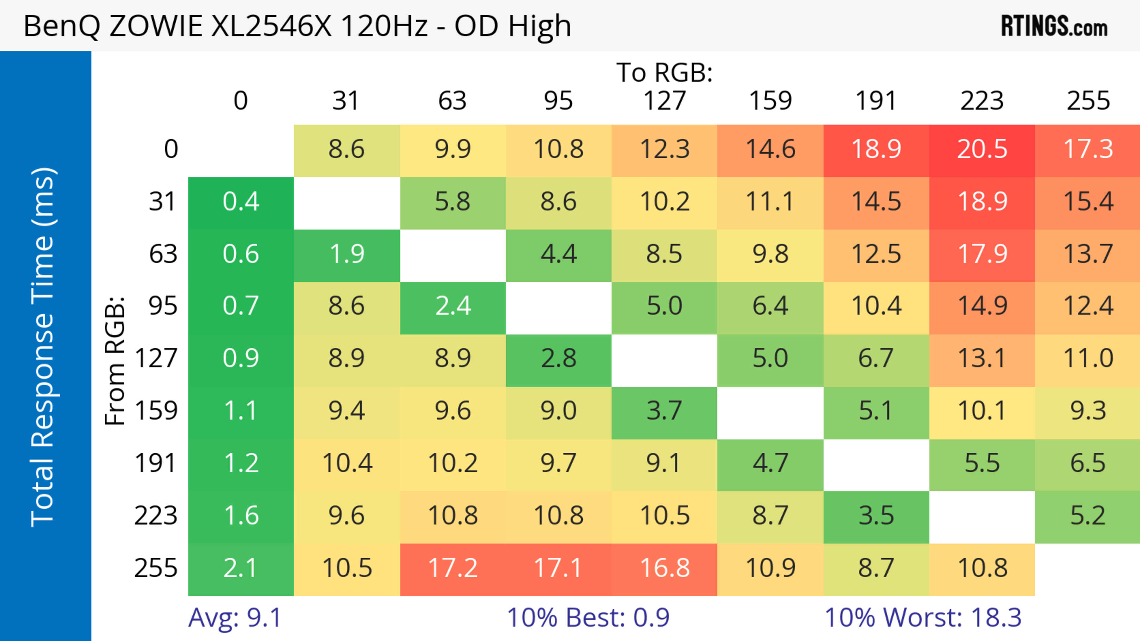 The BenQ ZOWIE XL2546X has an impressive response time. It maintains a fast response time across its VRR range, leading to sharp motion. It also has excellent refresh rate compliance, meaning its response time is fast enough to take full advantage of 120 fps and 60 fps sources.