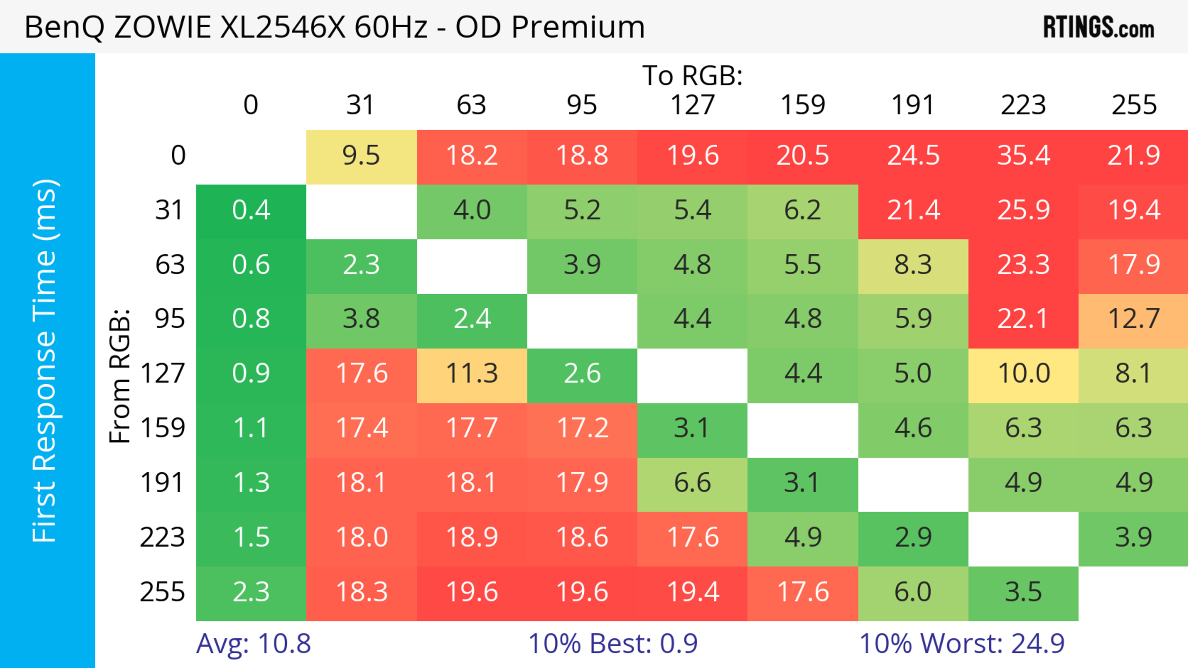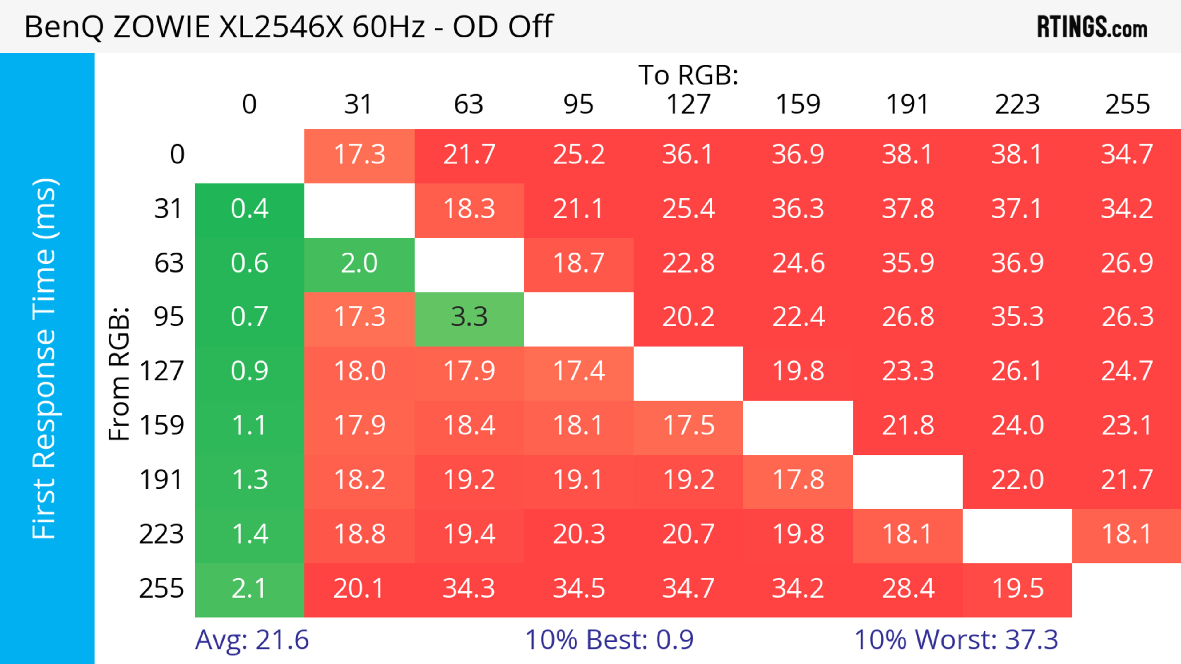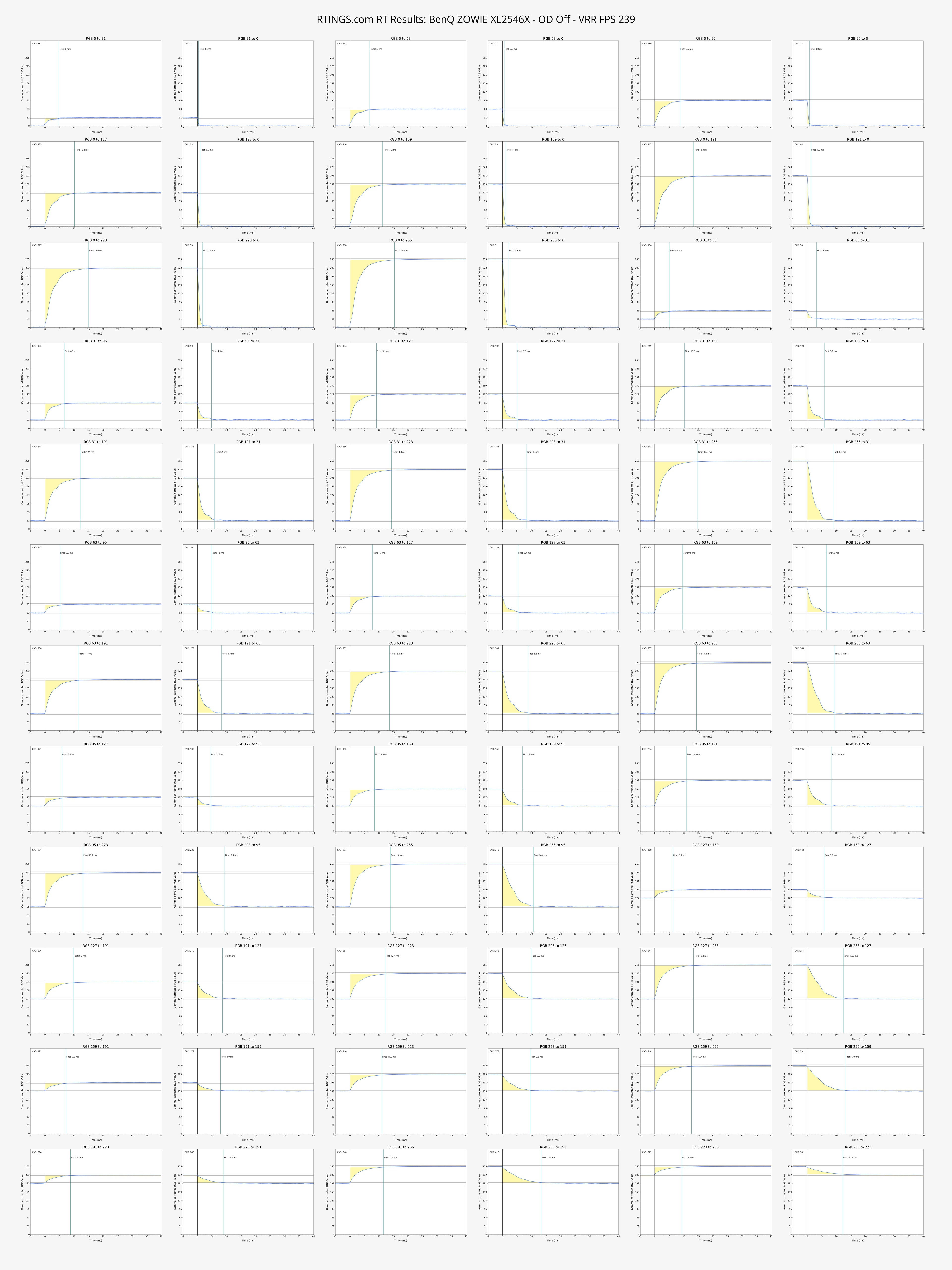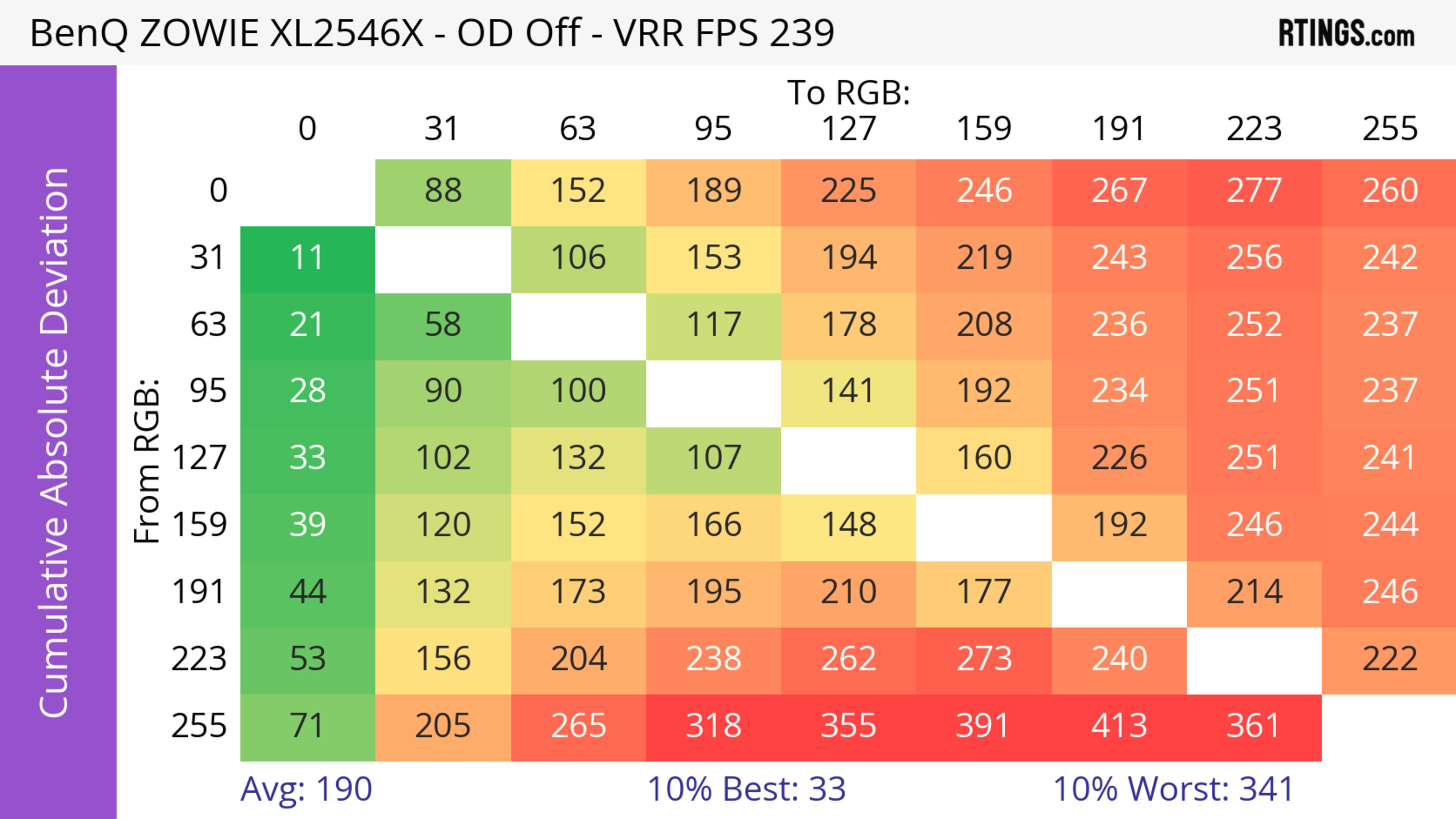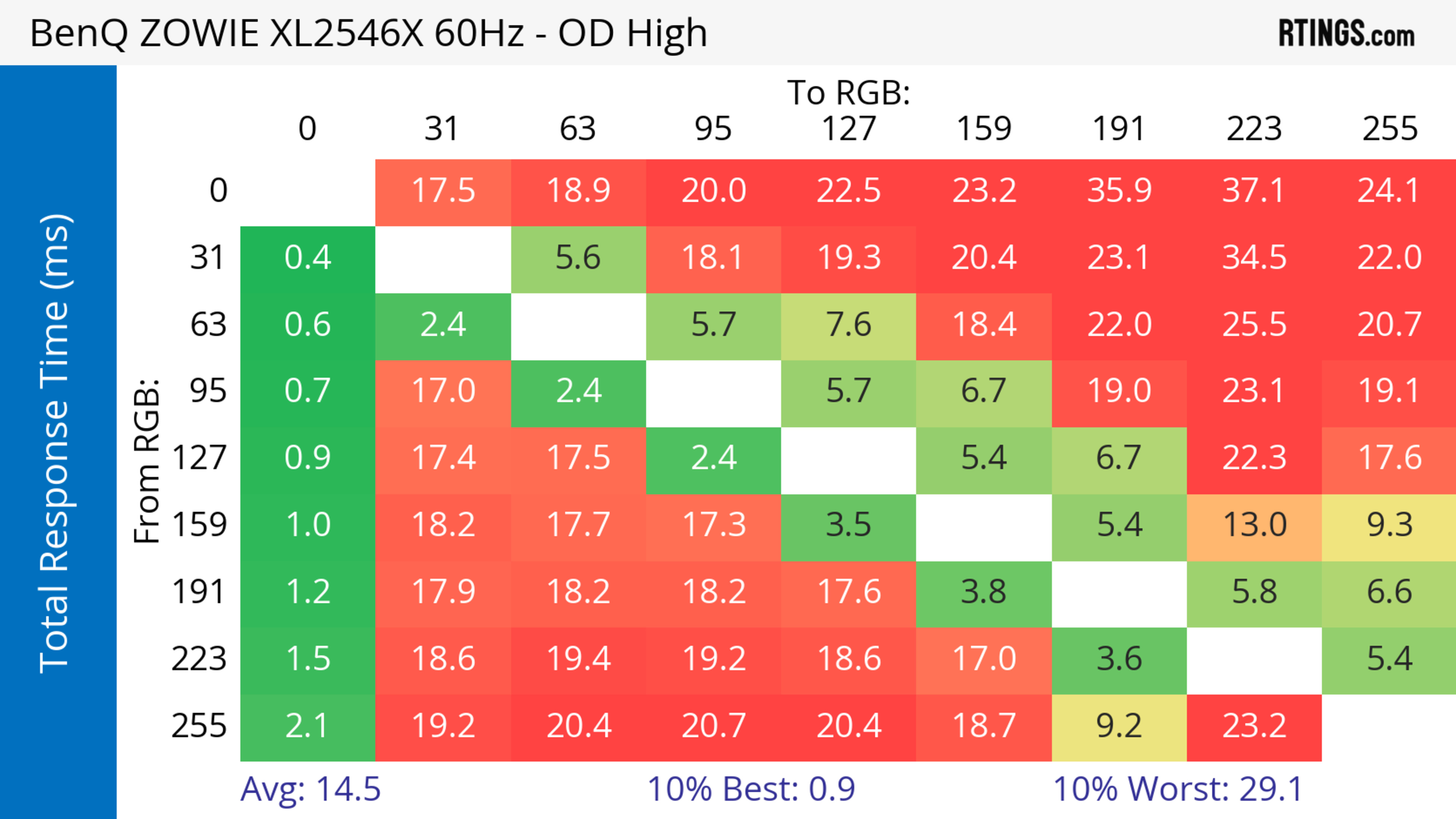 The BenQ ZOWIE XL2546X has an impressive response time. It maintains a fast response time across its VRR range, leading to sharp motion. It also has excellent refresh rate compliance, meaning its response time is fast enough to take full advantage of 120 fps and 60 fps sources.