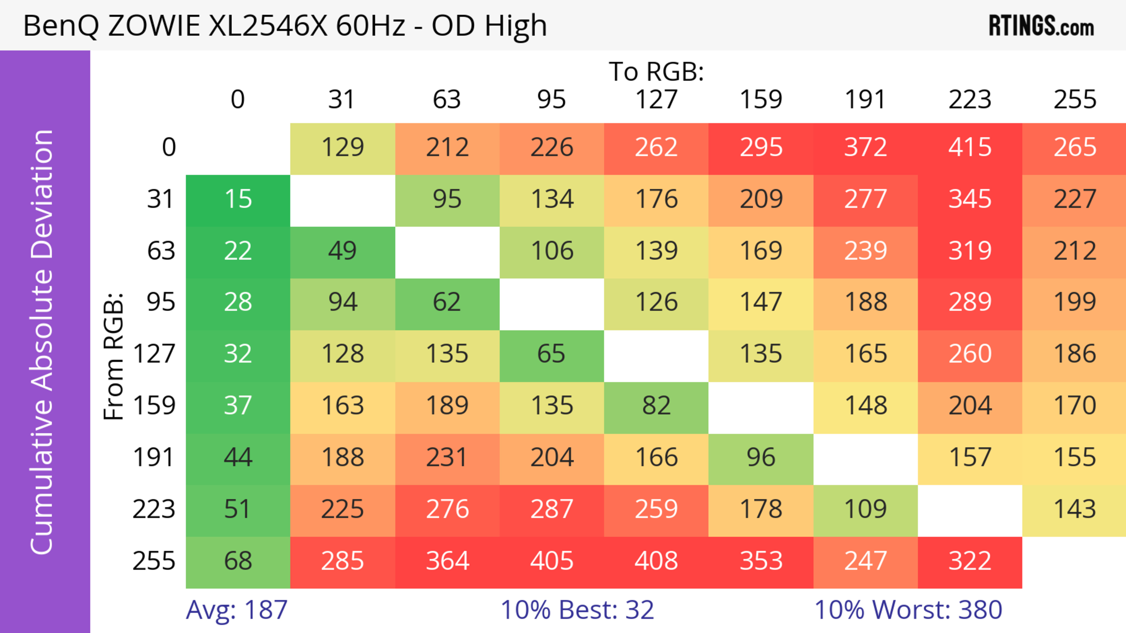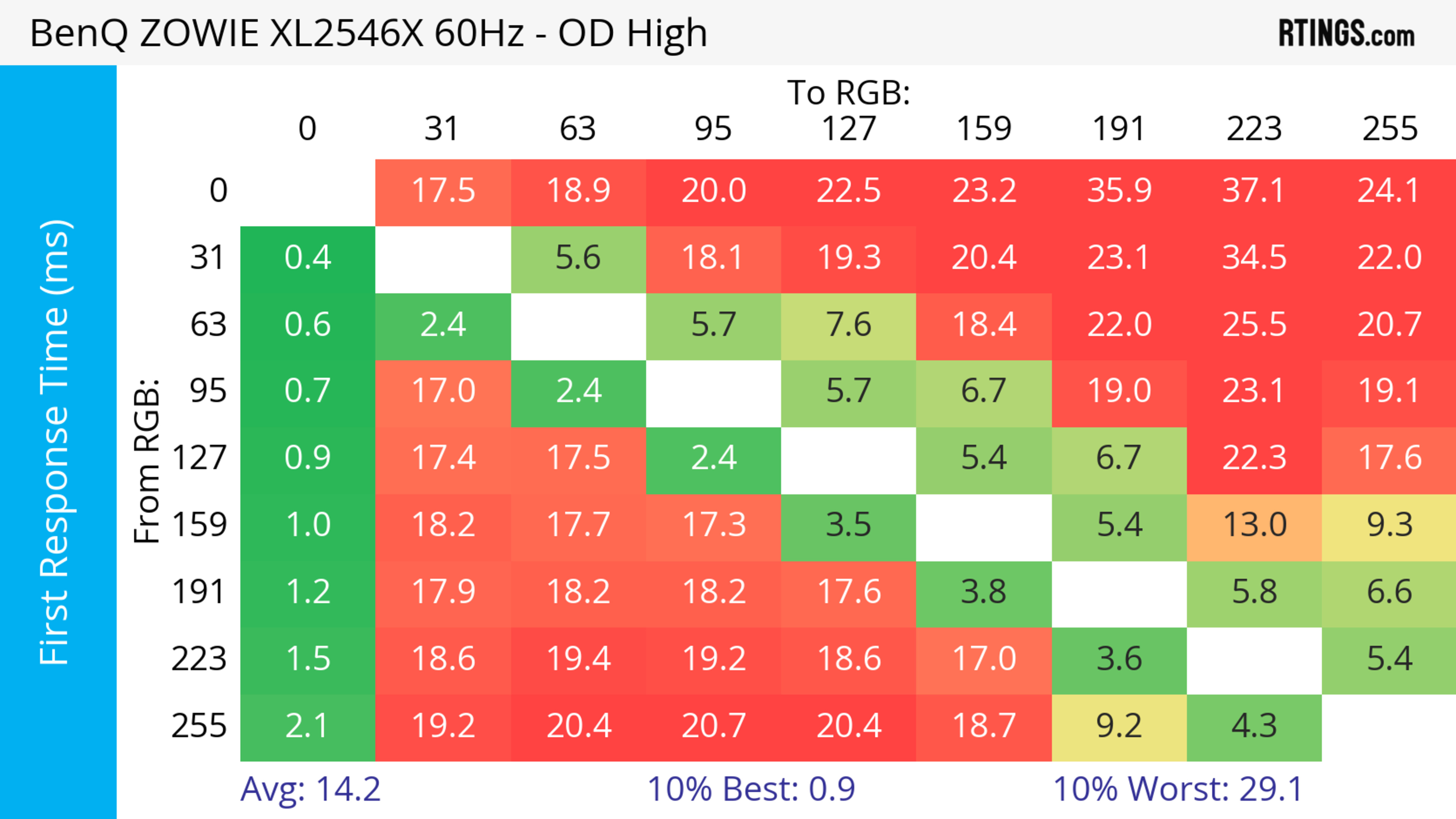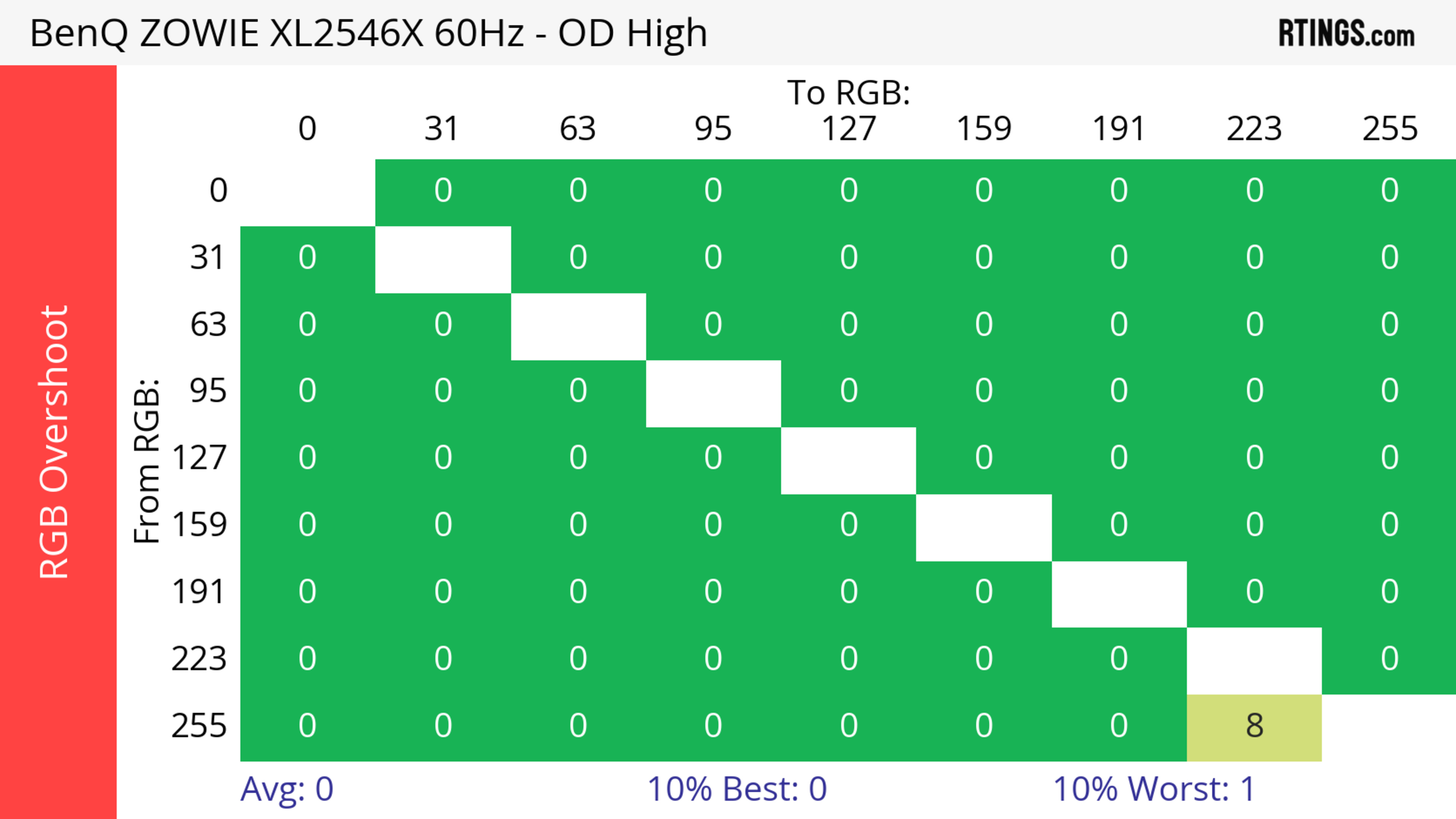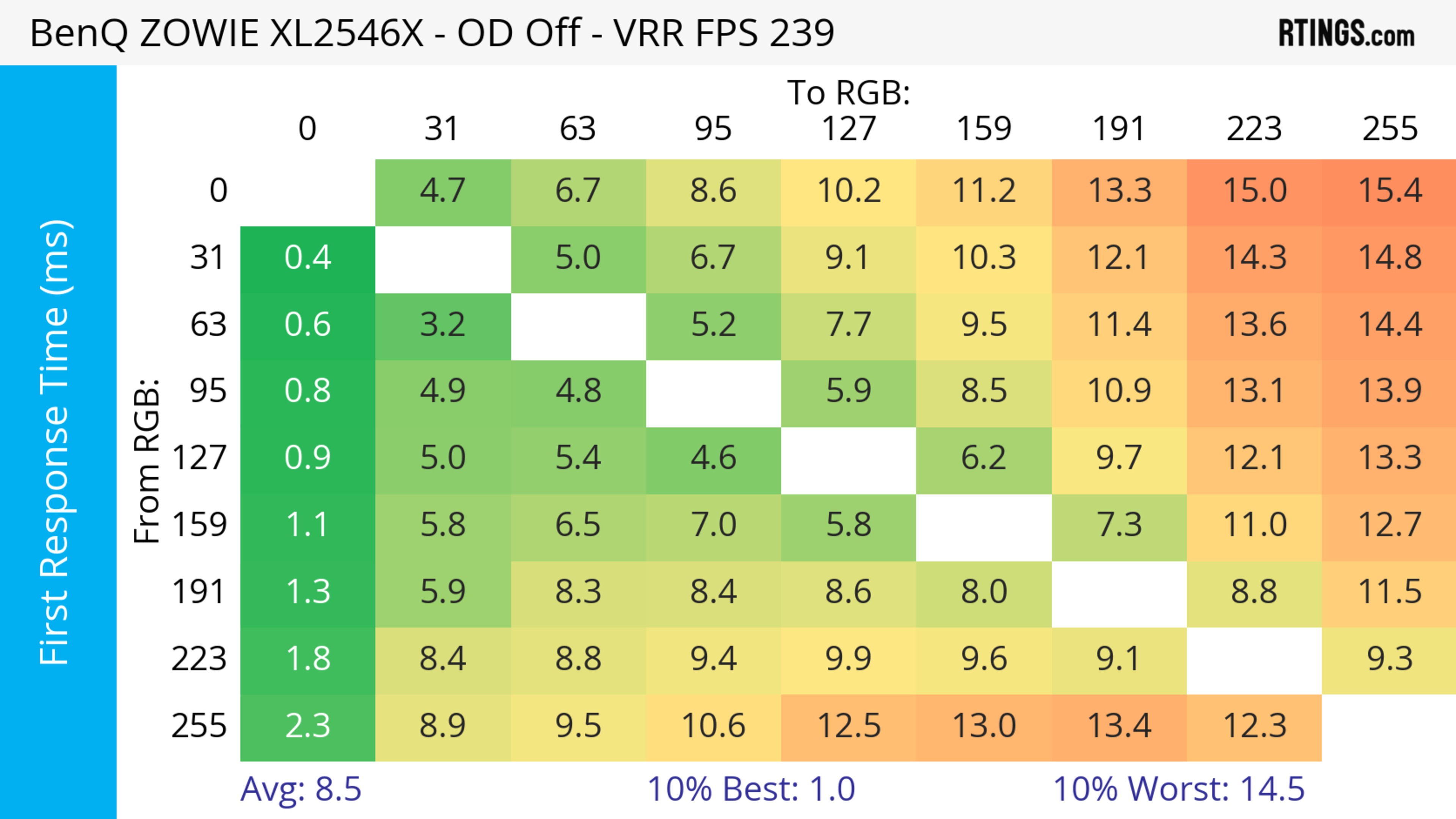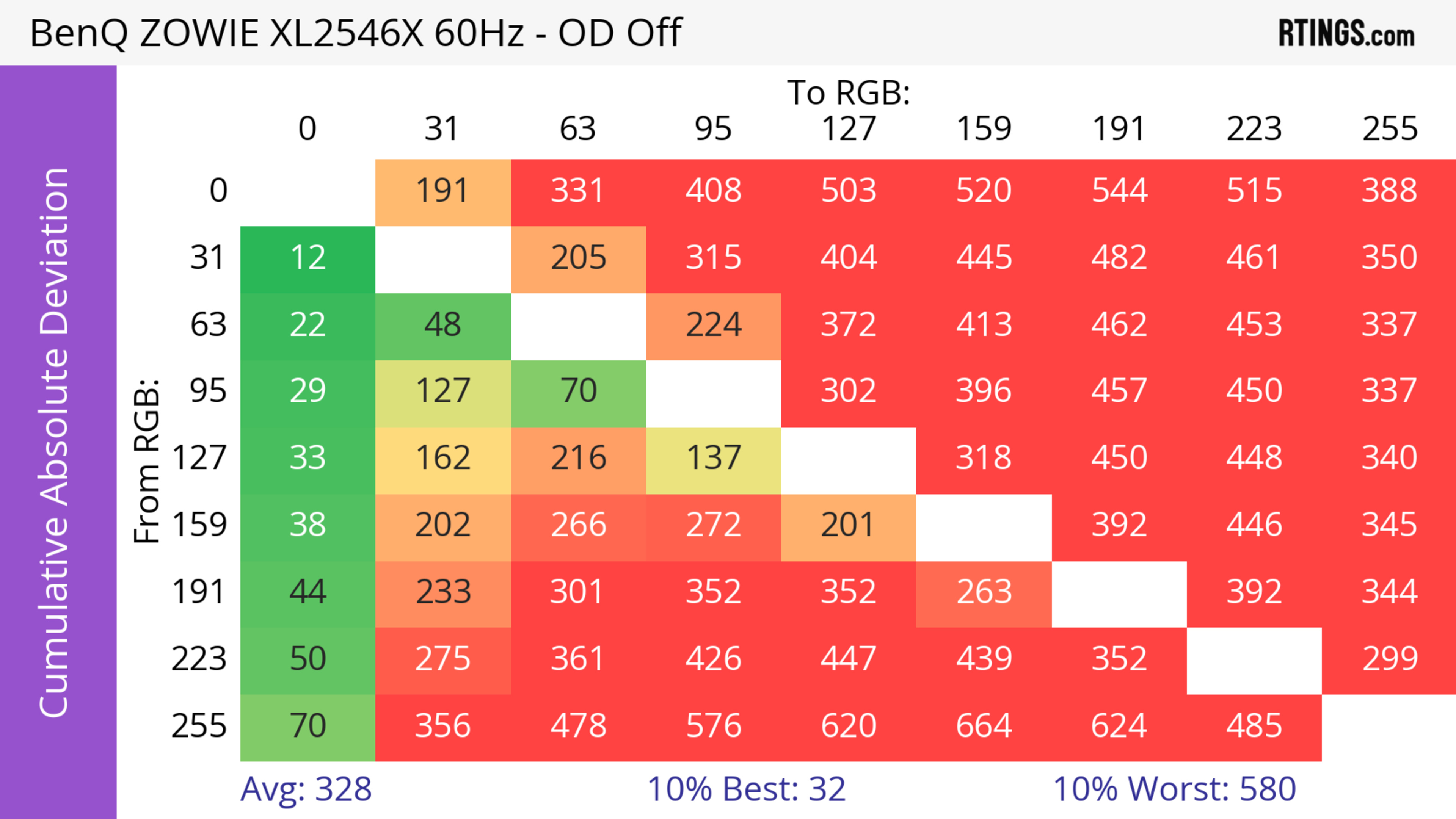The BenQ ZOWIE XL2546X has an impressive response time. It maintains a fast response time across its VRR range, leading to sharp motion. It also has excellent refresh rate compliance, meaning its response time is fast enough to take full advantage of 120 fps and 60 fps sources.