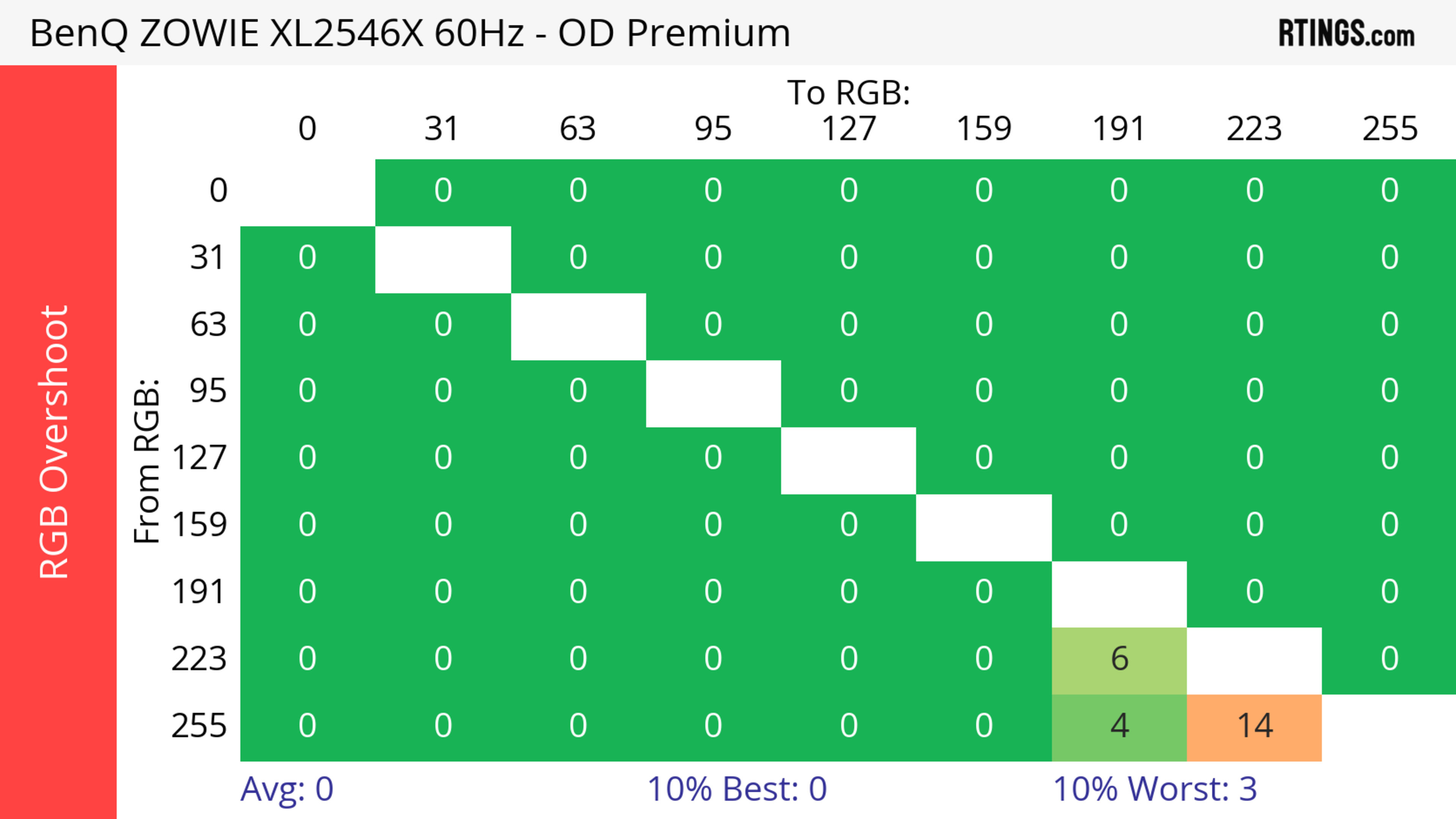 The CAD at 60Hz is decent, and fast-moving objects look fairly crisp. The 'Premium' overdrive setting has the best CAD if you set your monitor's refresh rate to 60Hz, as it has slightly less overshoot than 'Custom 11'. However, if you set the refresh rate to 240Hz and use VRR to go down to 60Hz, as seen in VRR Motion Performance, then 'Premium' performs considerably worse, and 'Custom 11' has the best CAD.