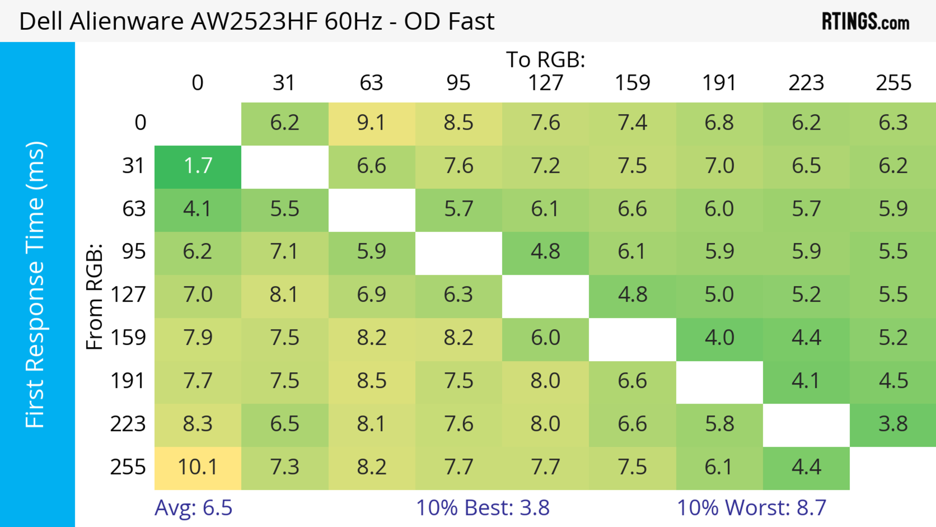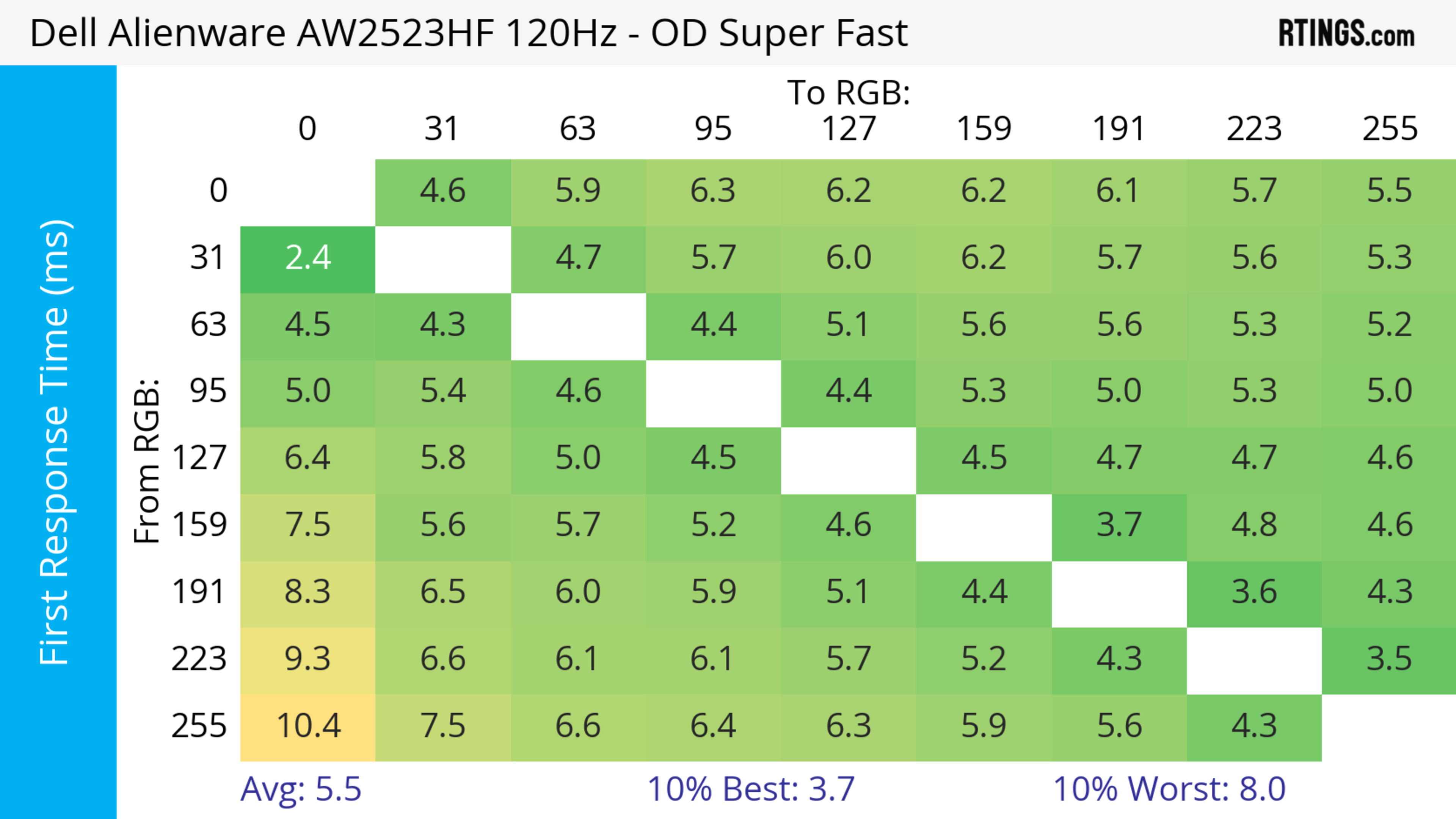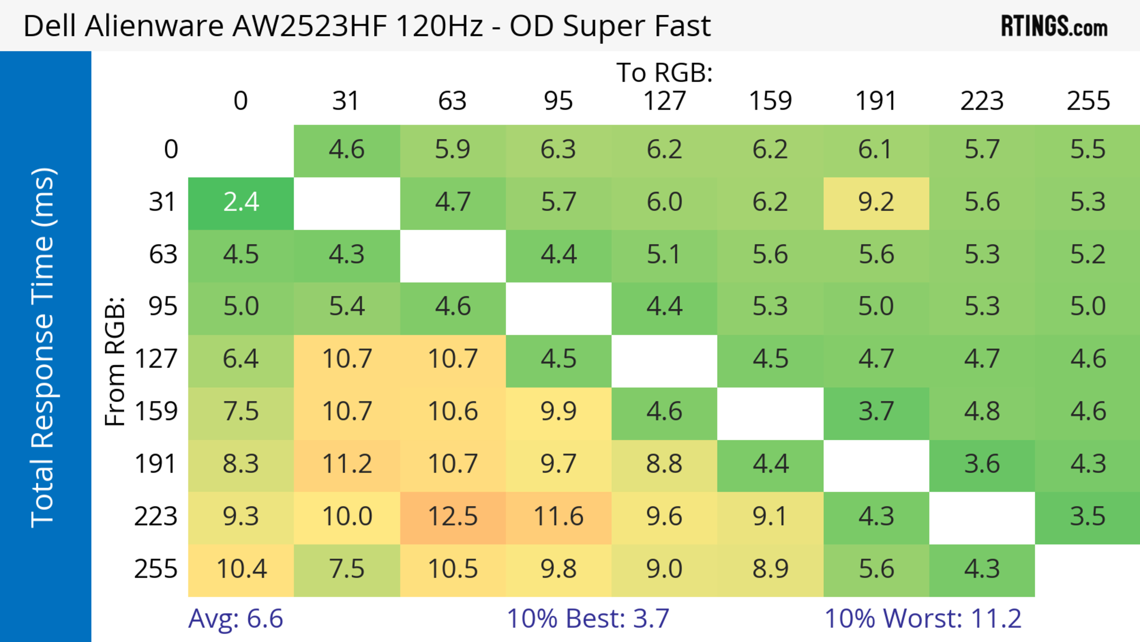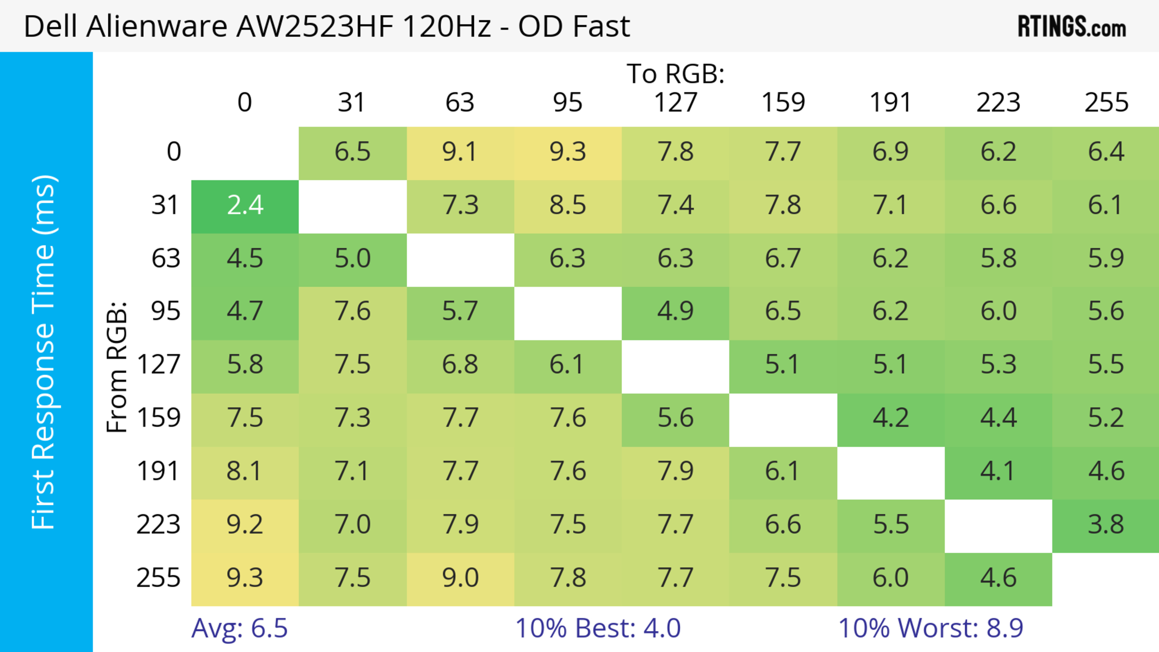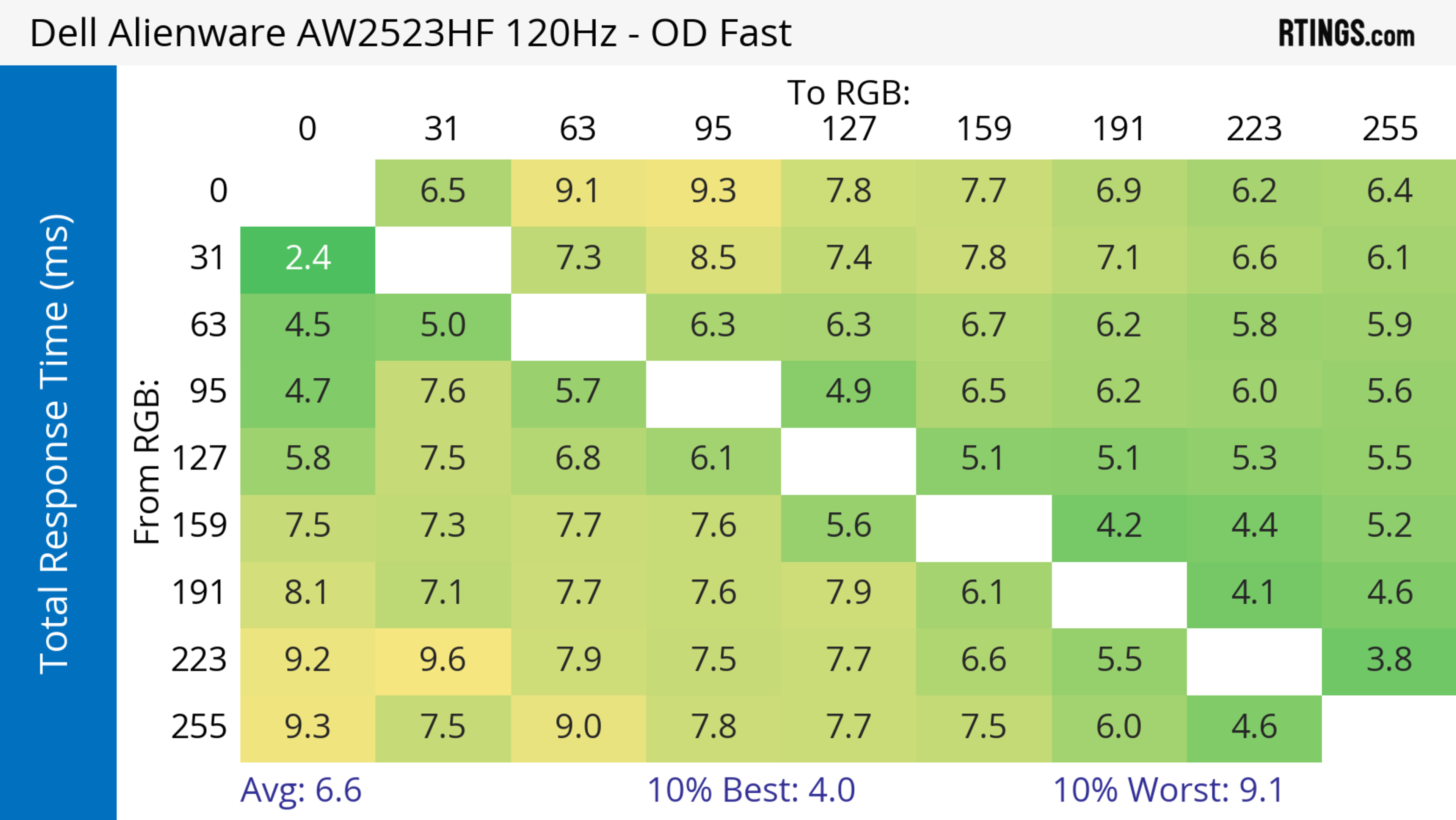 The Dell AW2523HF has good response time. Its response time is consistently fast across its entire refresh rate range, but it still has some blur with fast-moving objects.