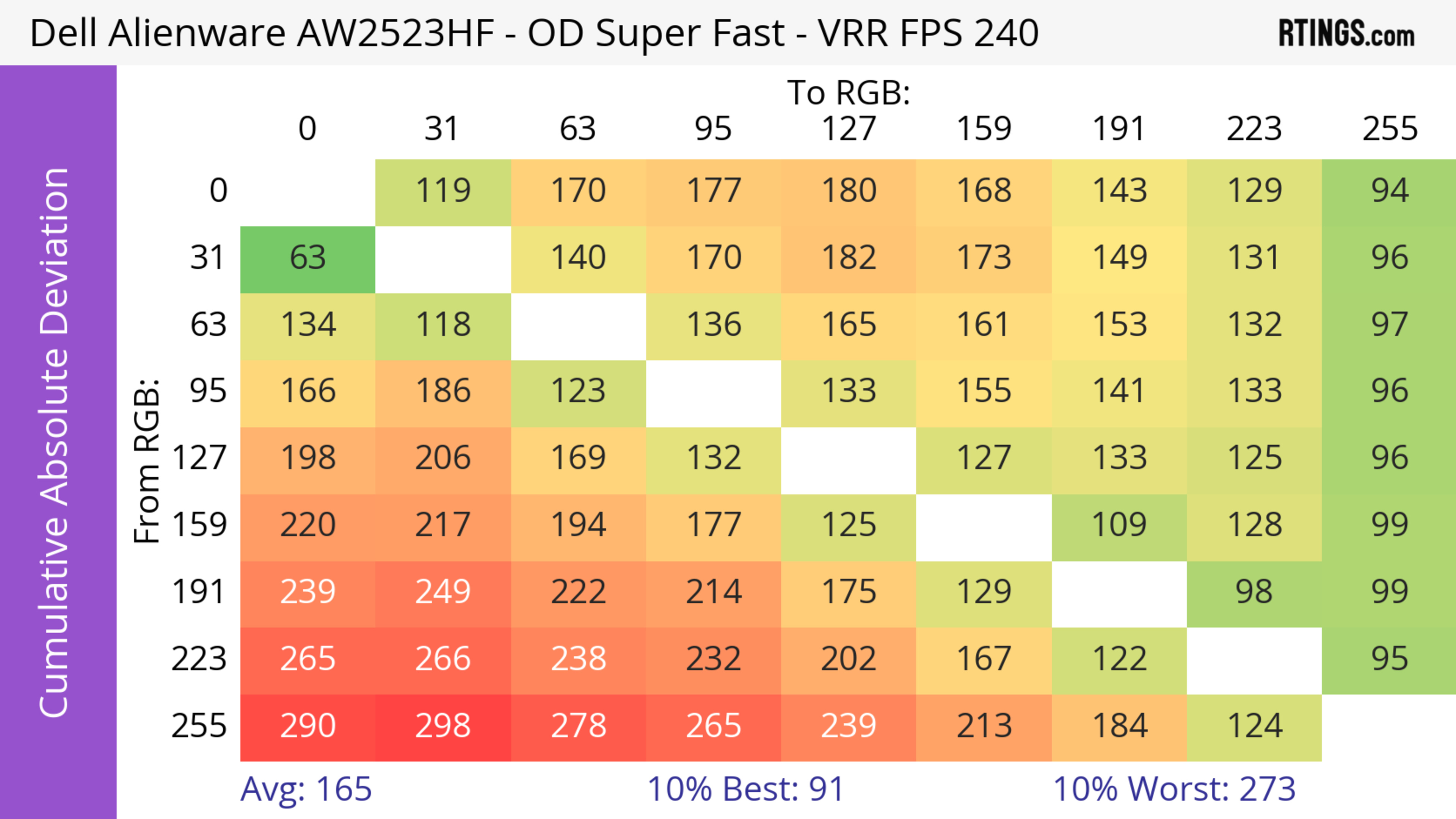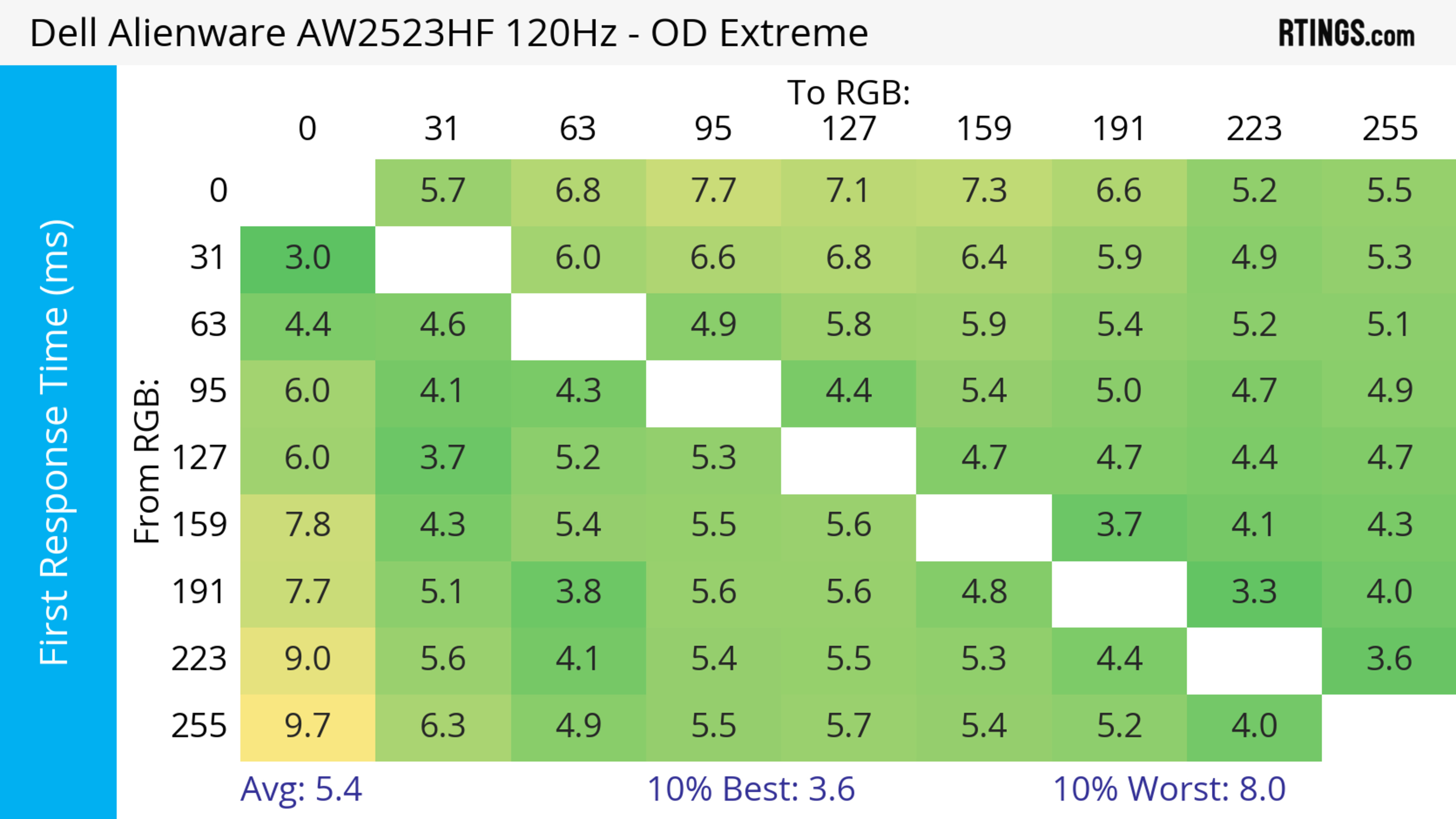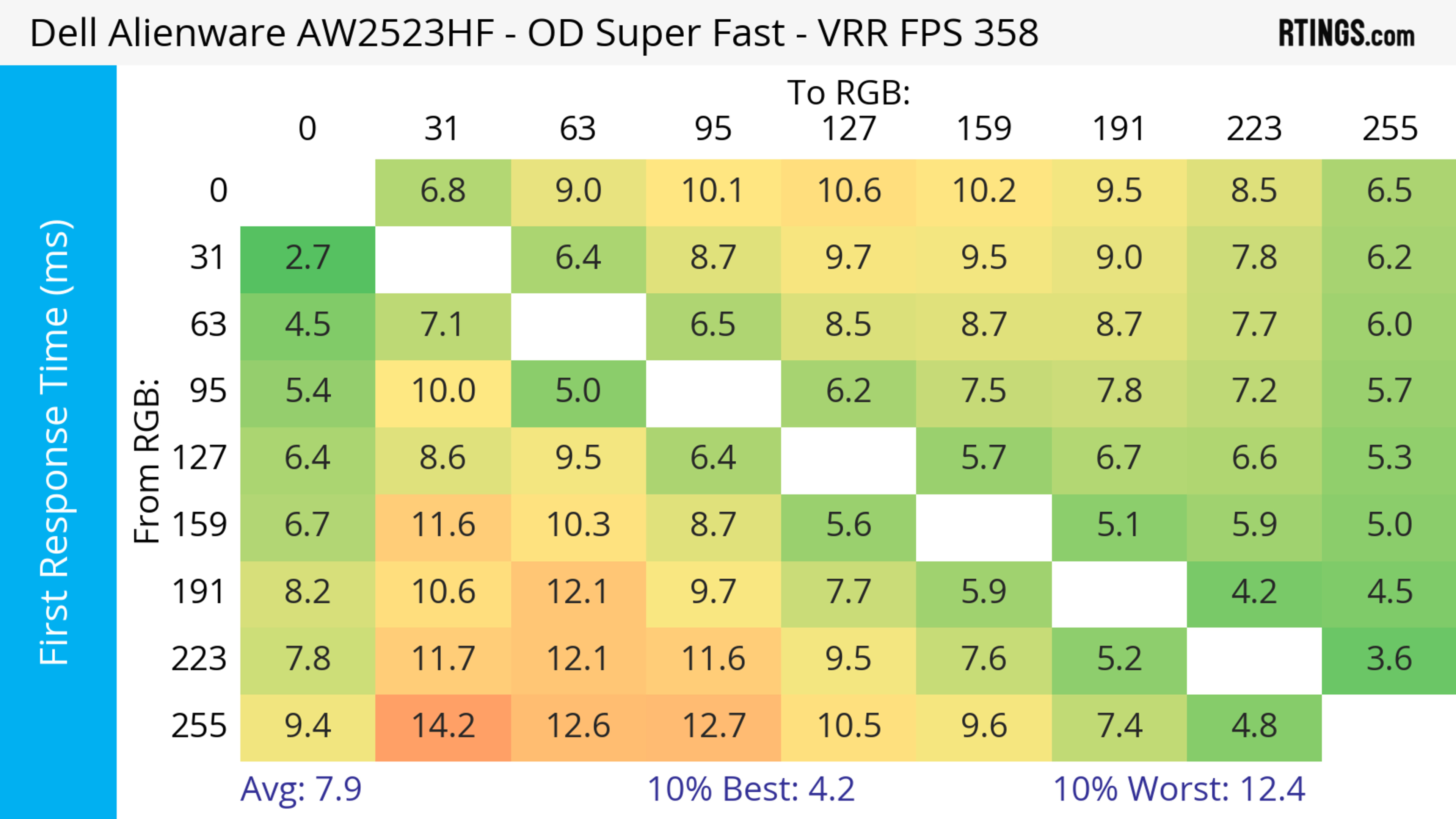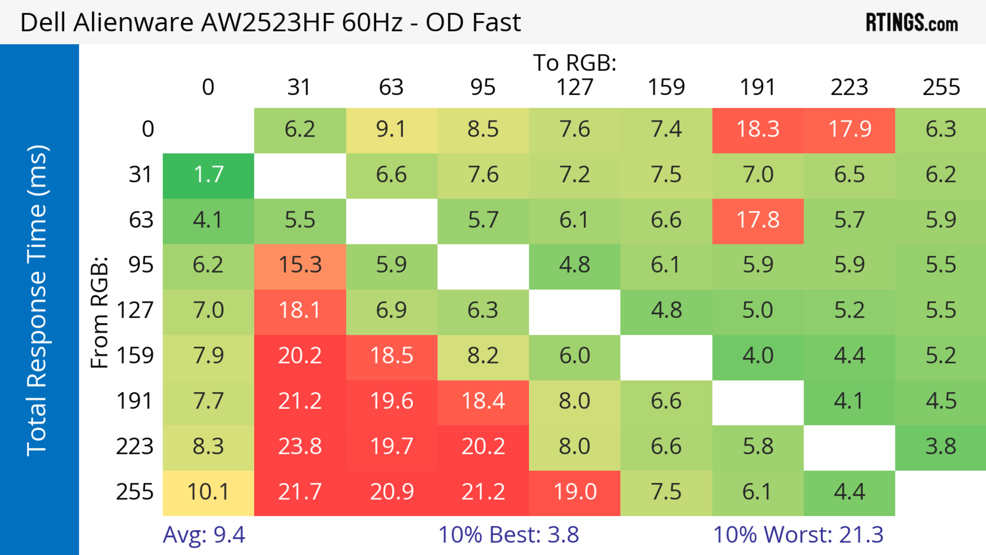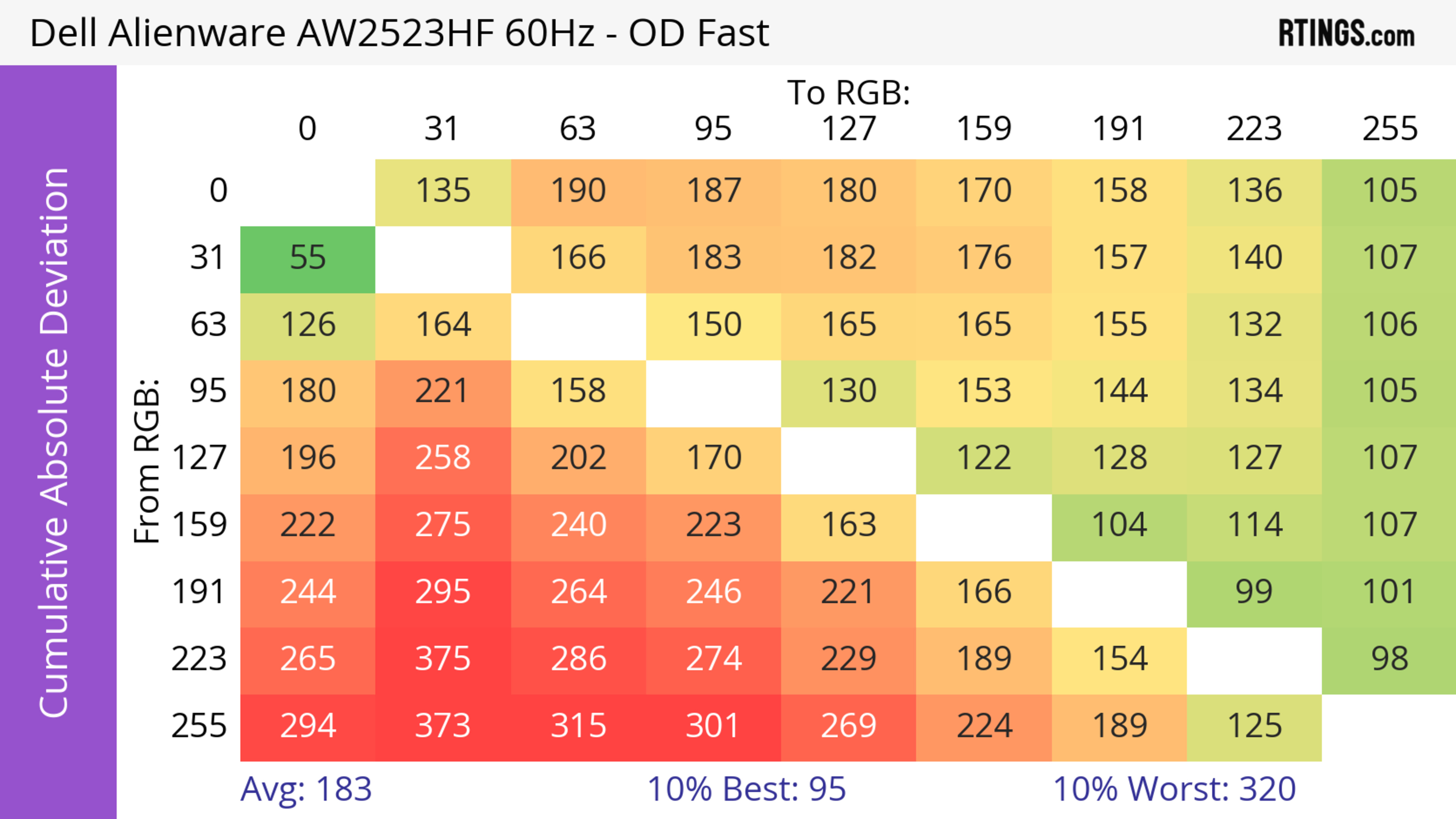 The Dell AW2523HF has good response time. Its response time is consistently fast across its entire refresh rate range, but it still has some blur with fast-moving objects.