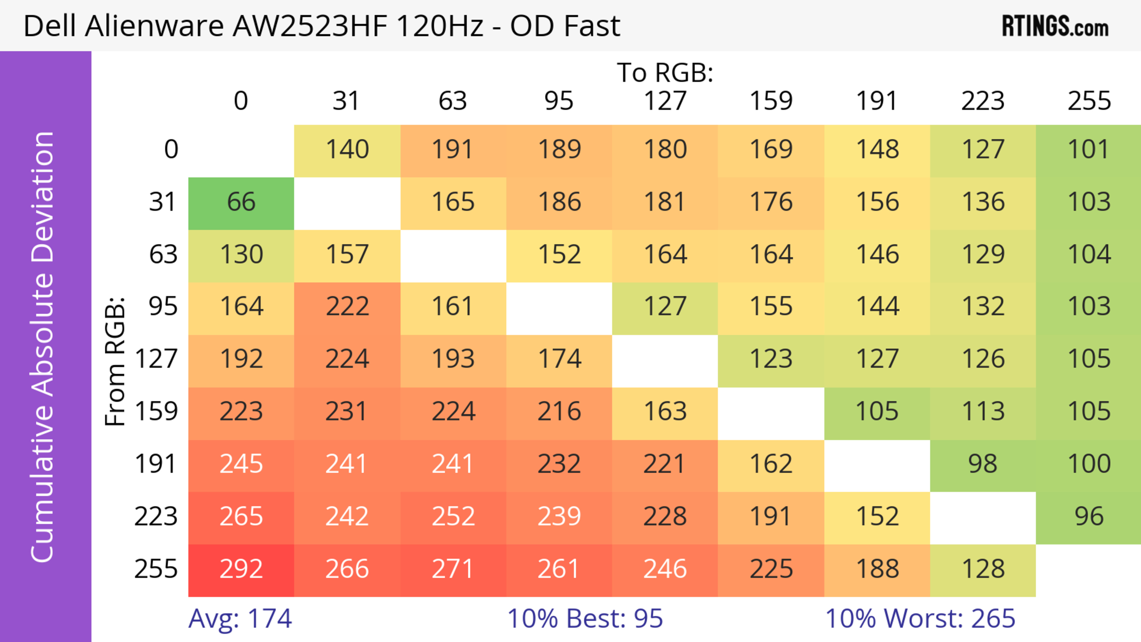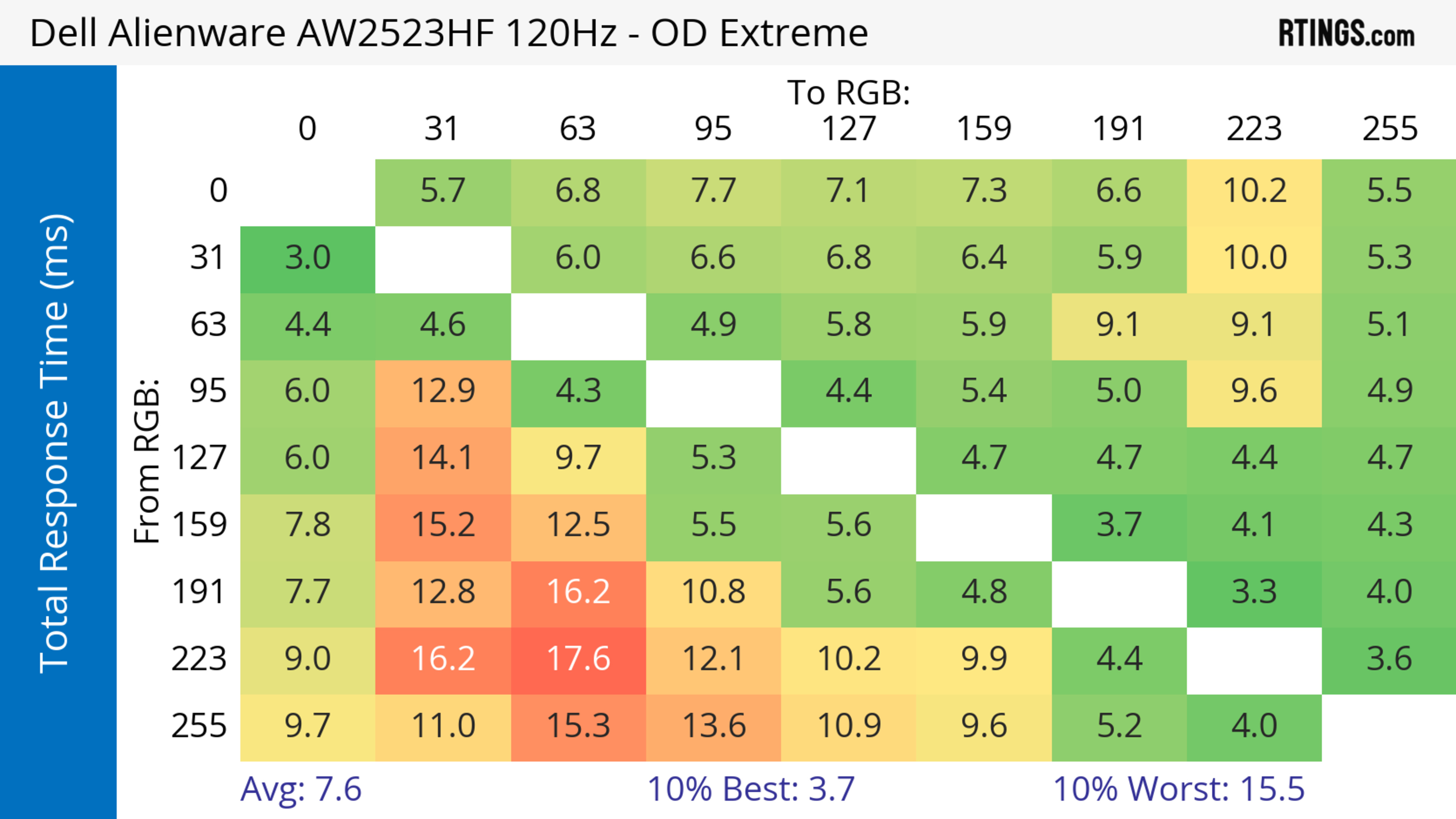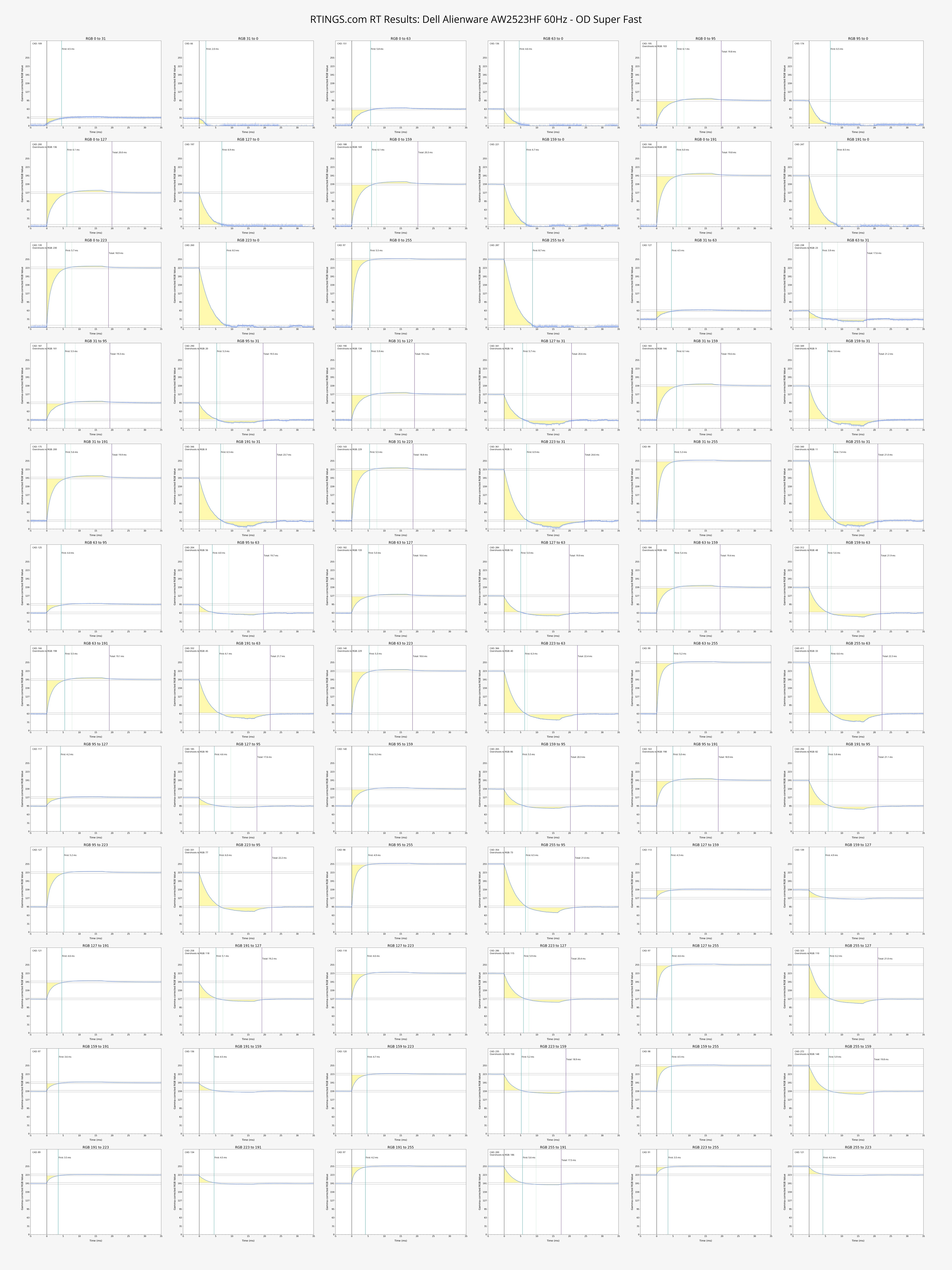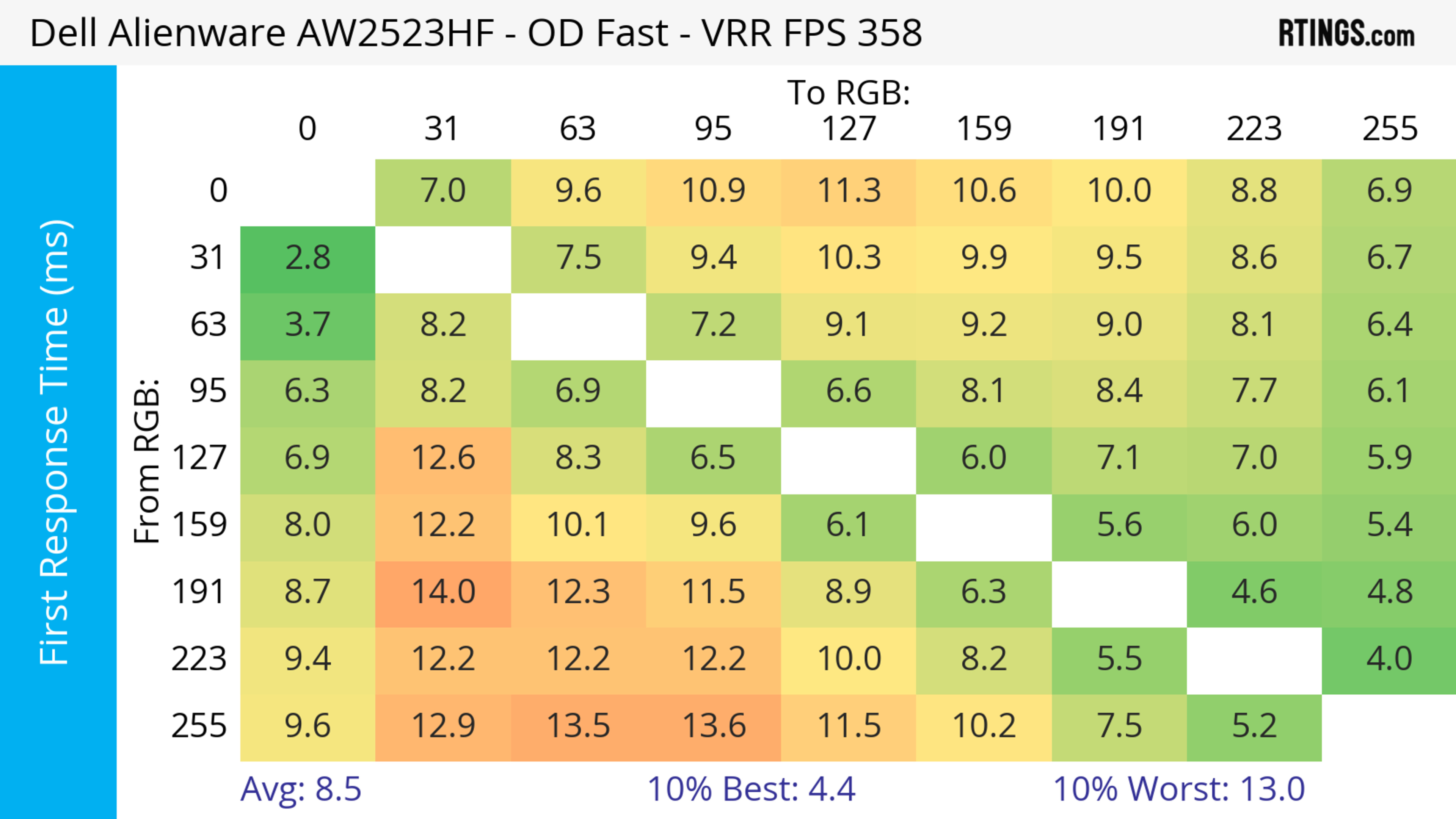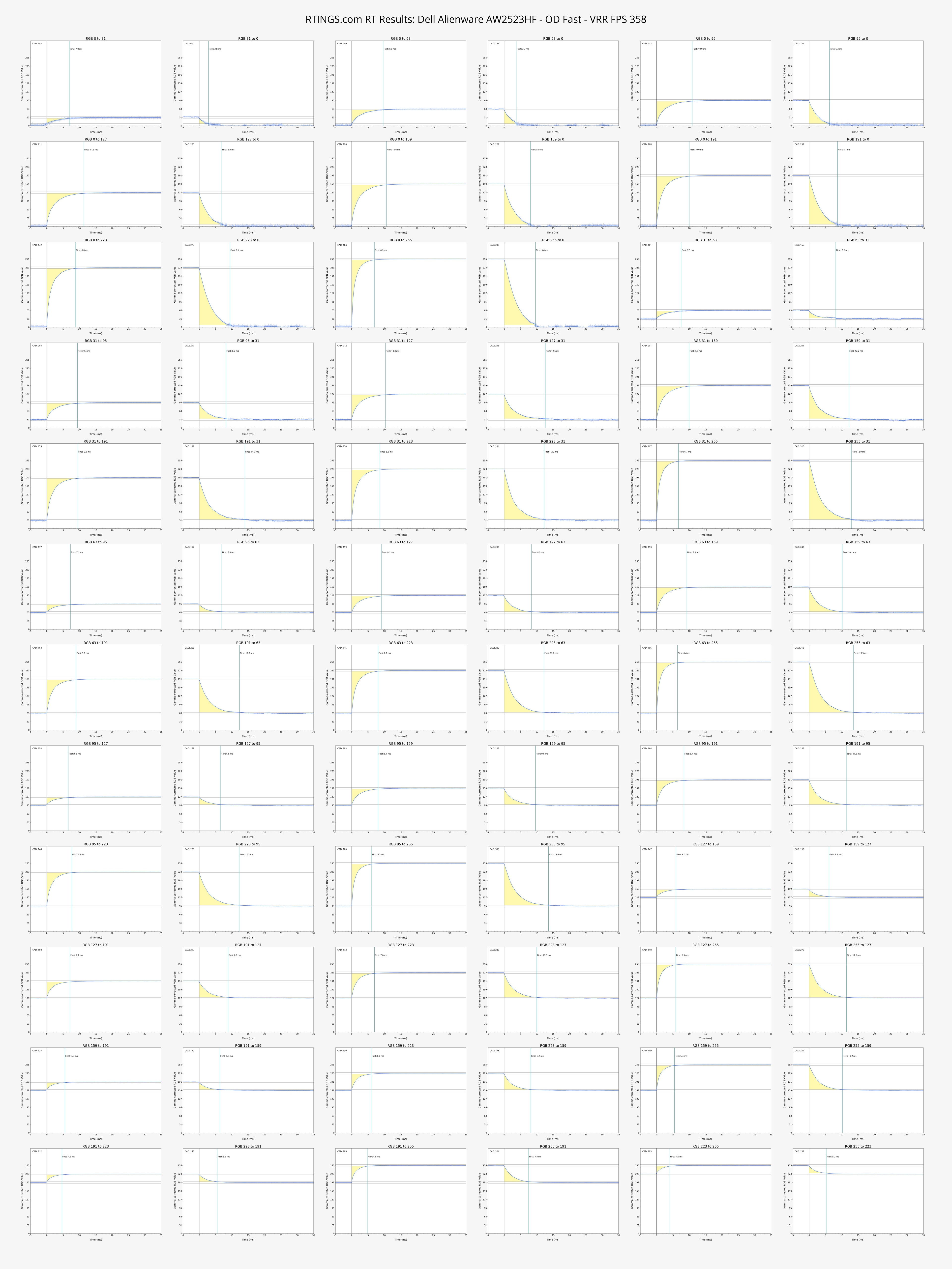The Dell AW2523HF has good response time. Its response time is consistently fast across its entire refresh rate range, but it still has some blur with fast-moving objects.