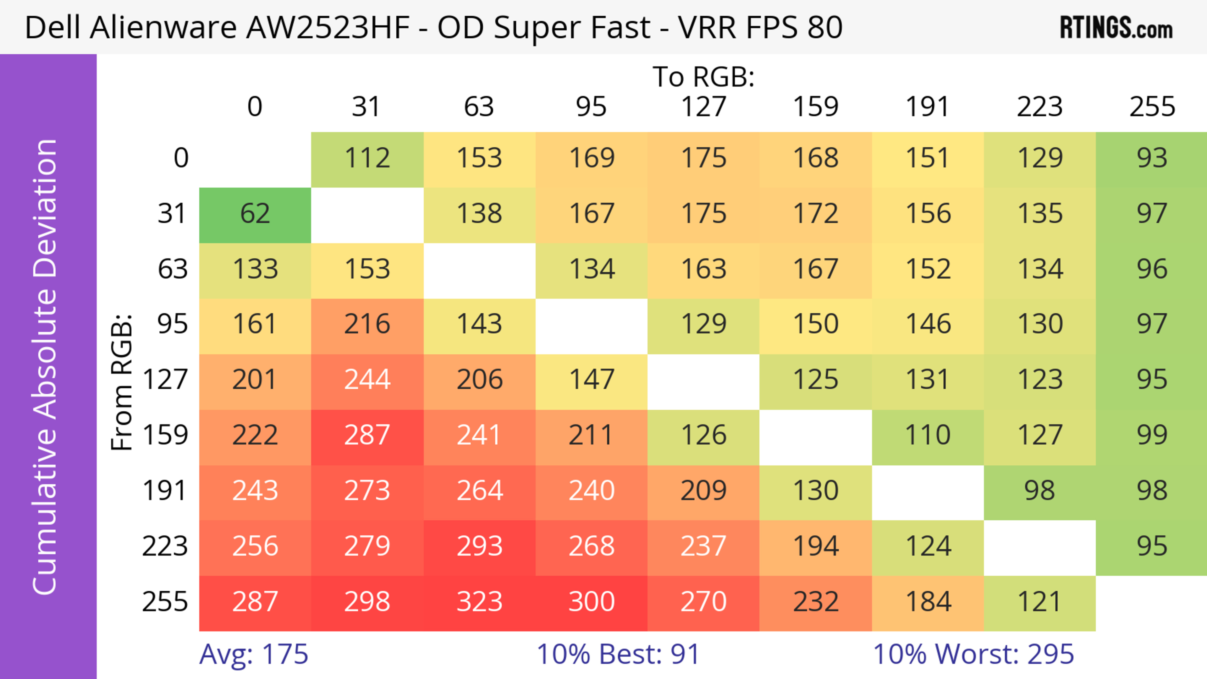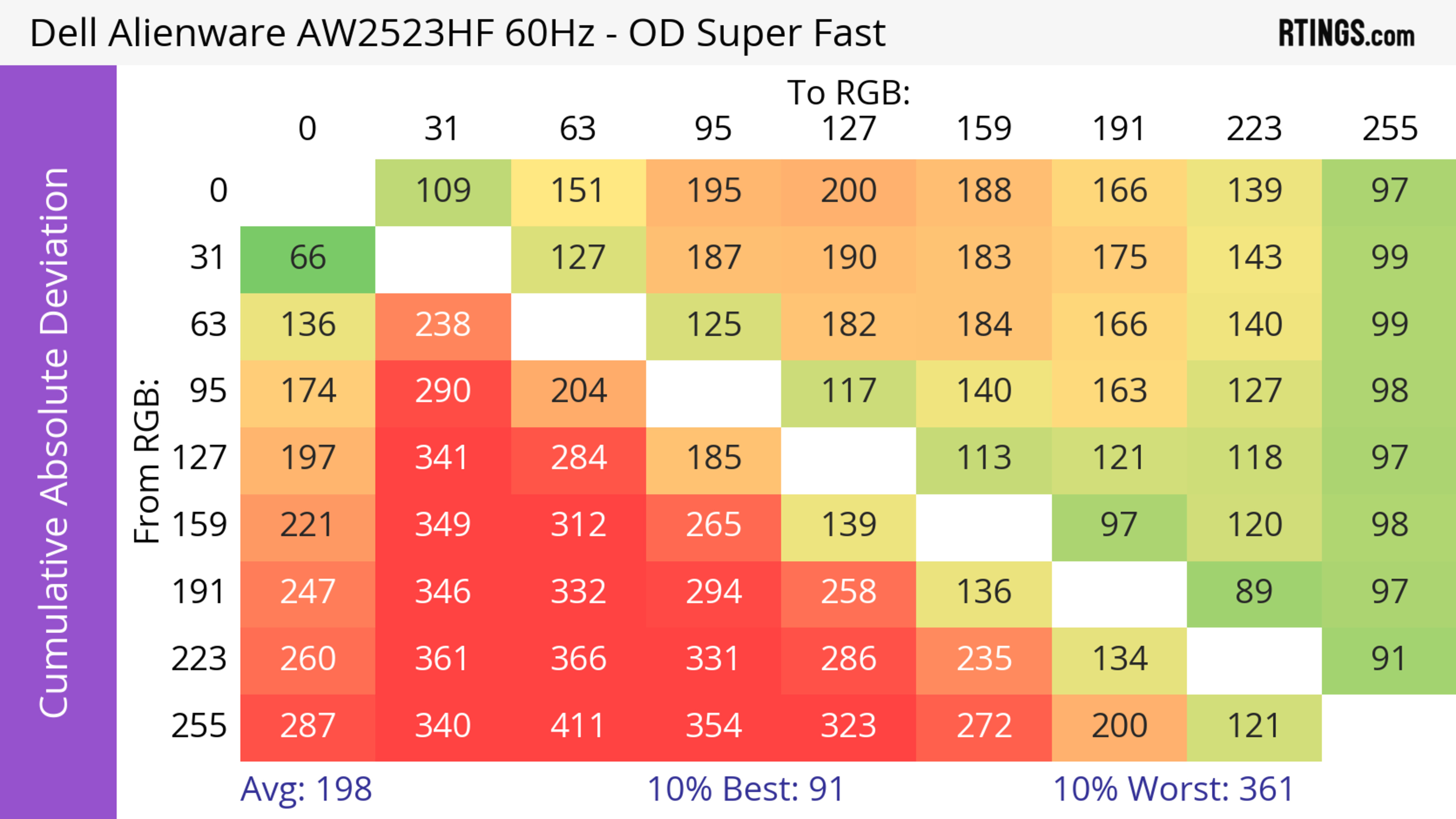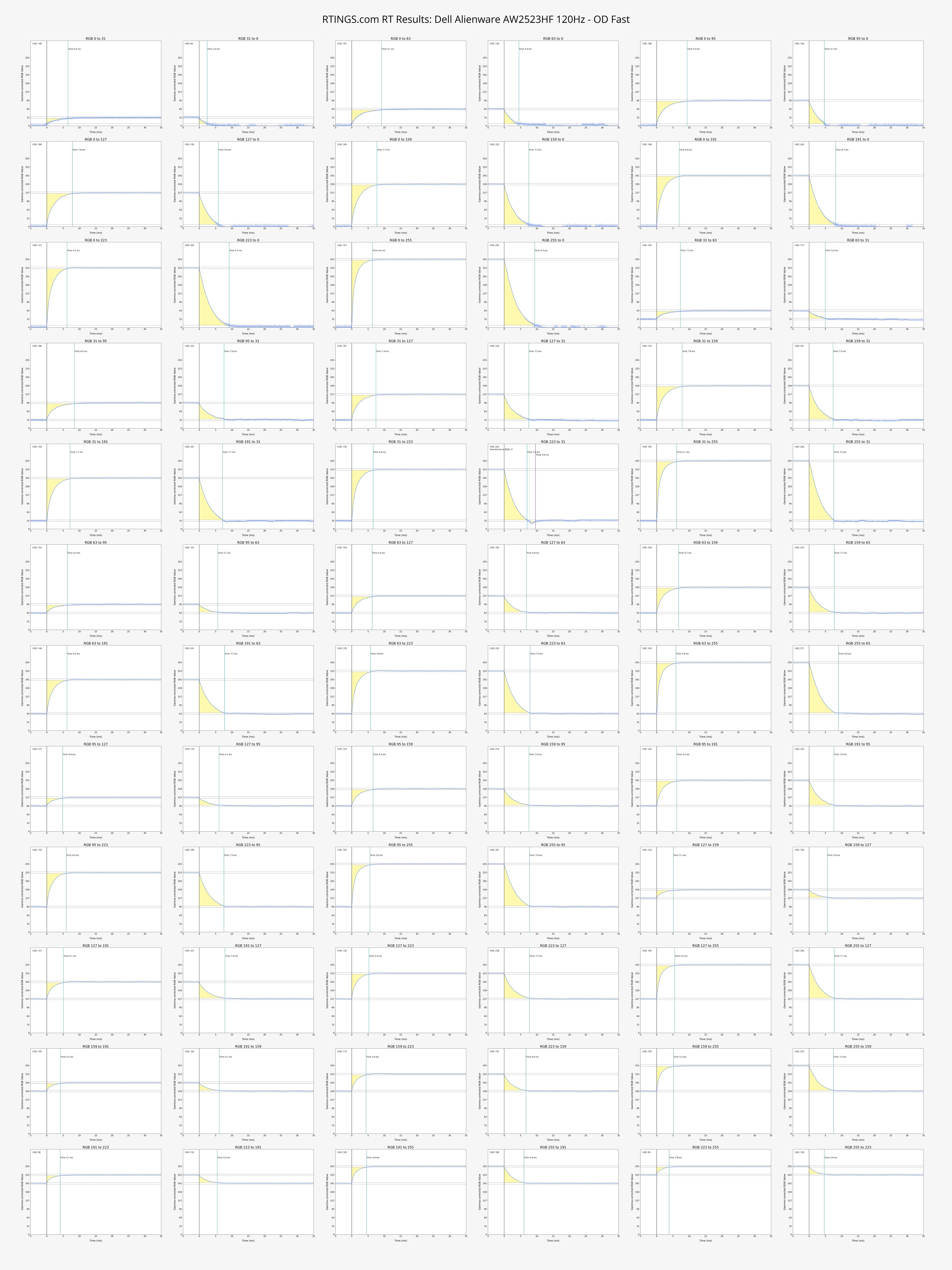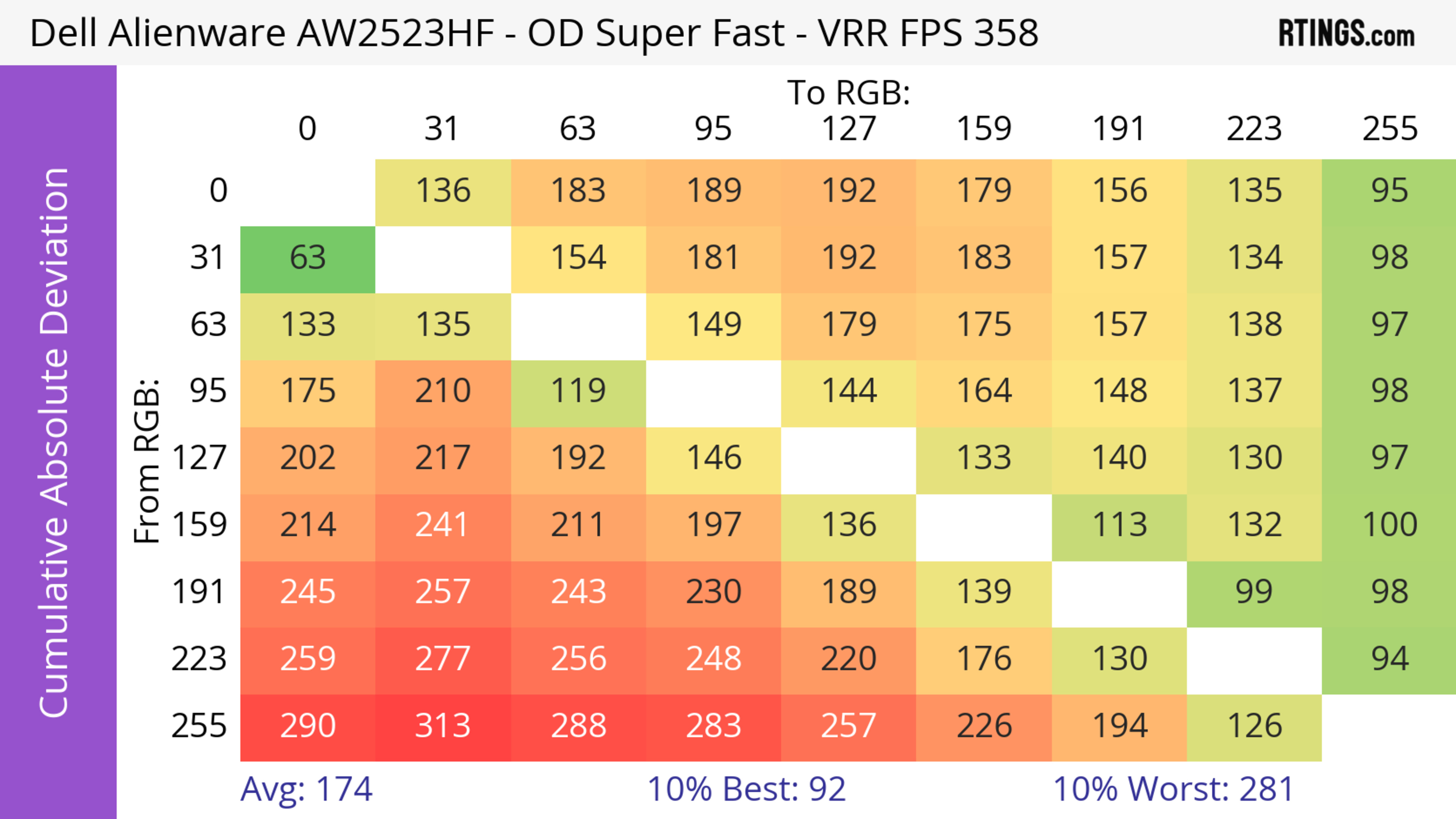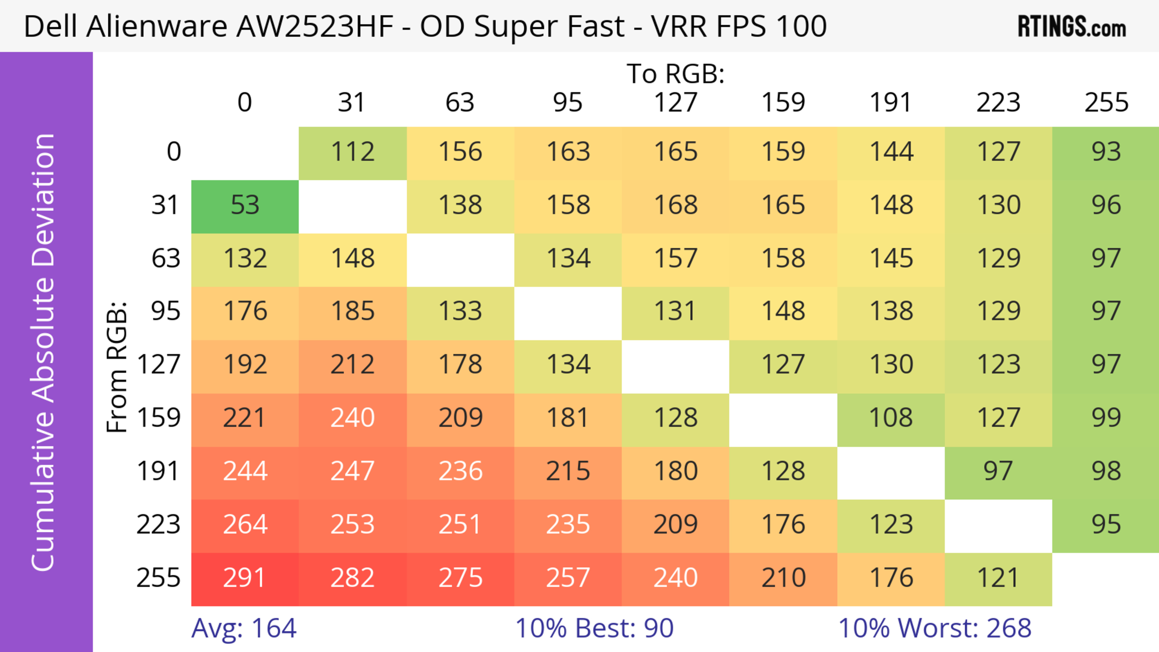 The Dell AW2523HF has good response time. Its response time is consistently fast across its entire refresh rate range, but it still has some blur with fast-moving objects.