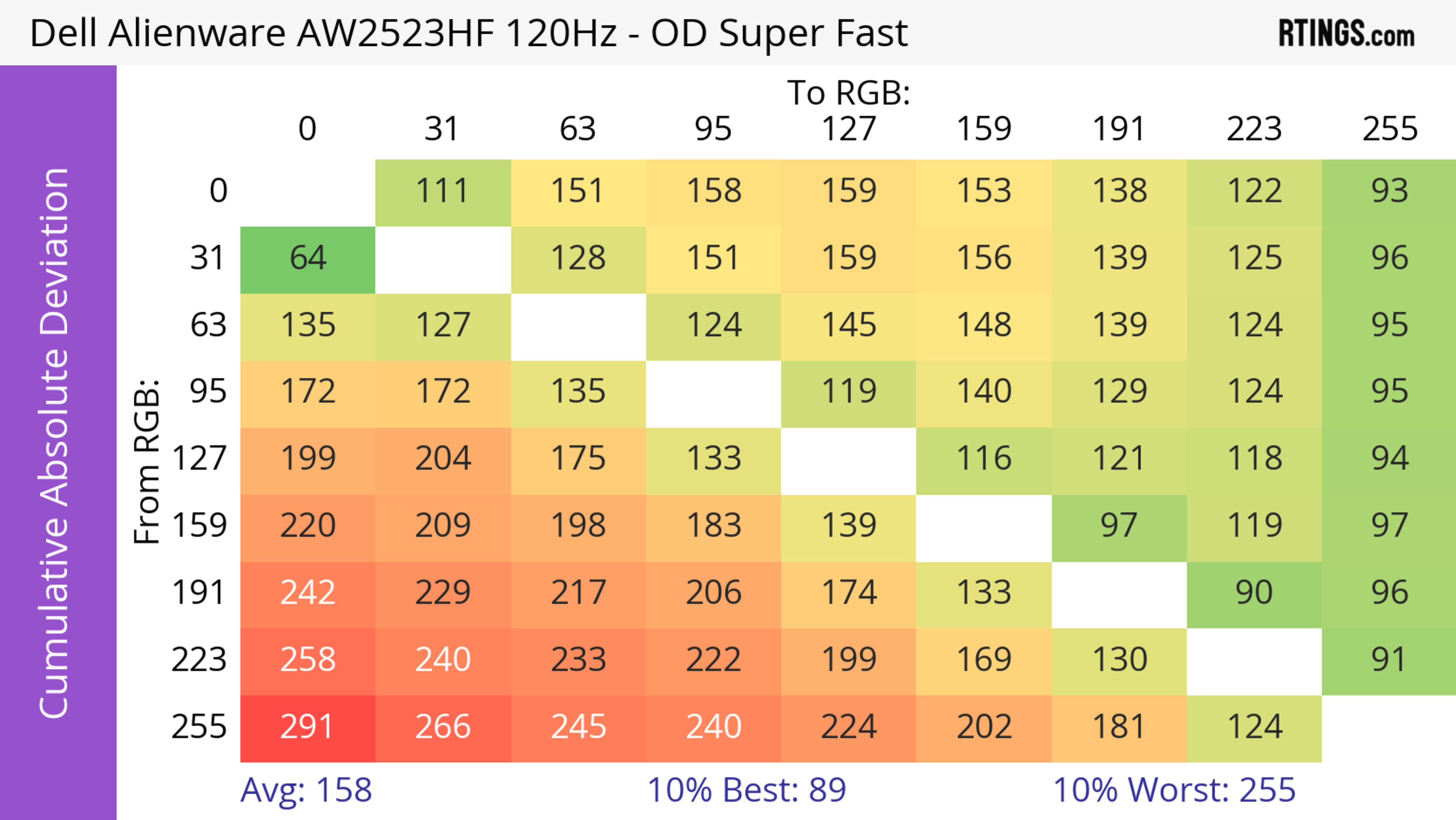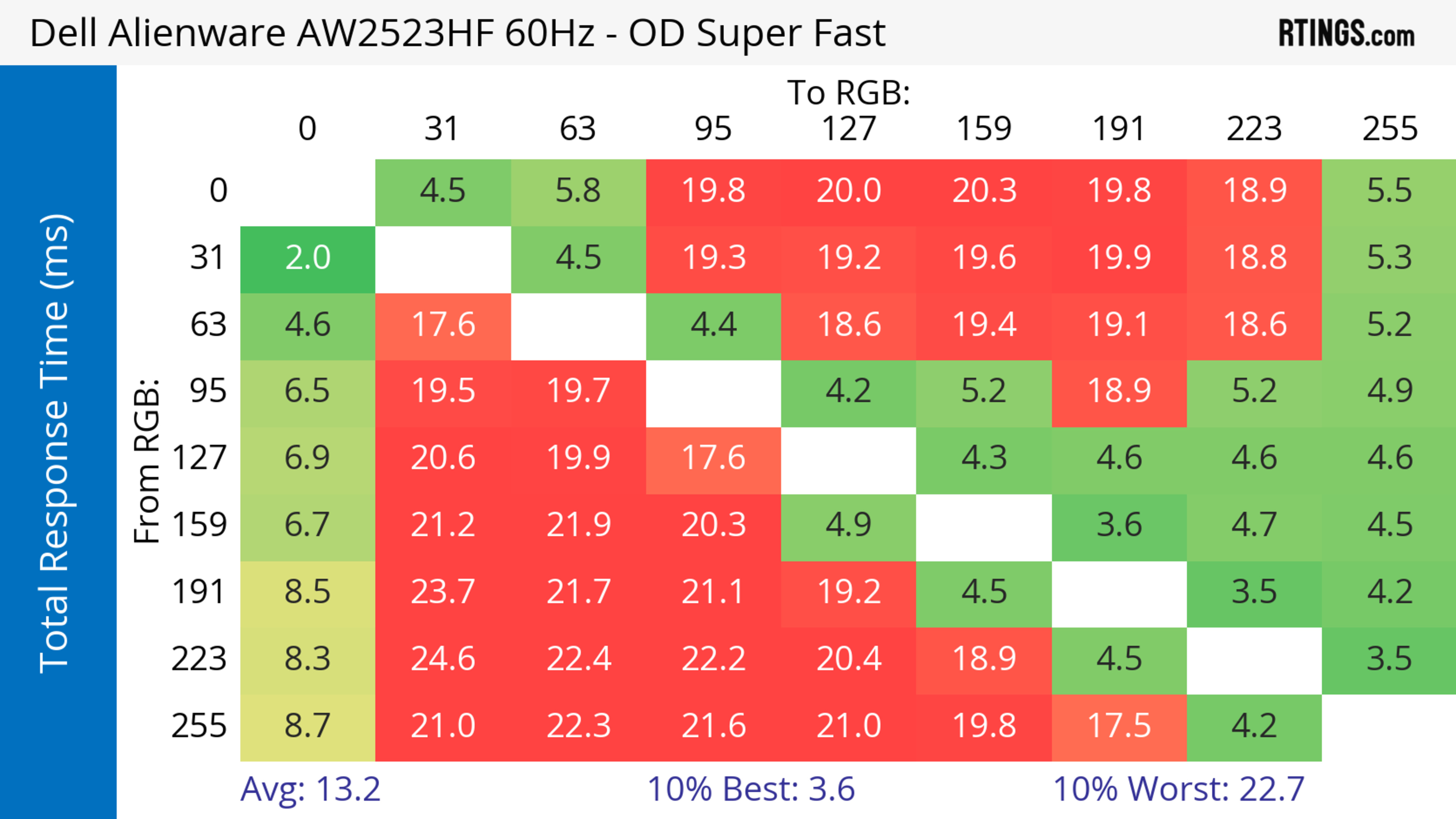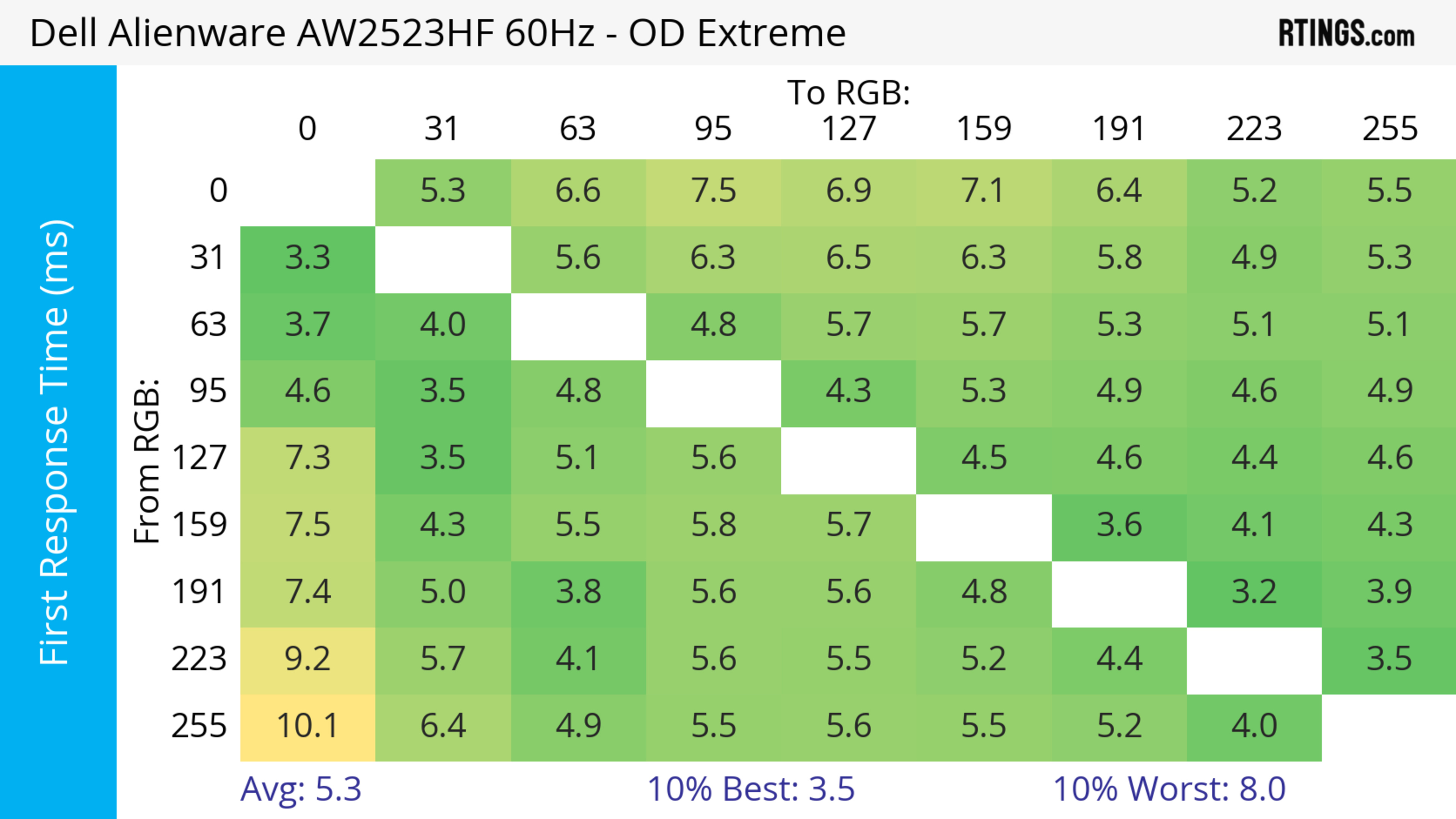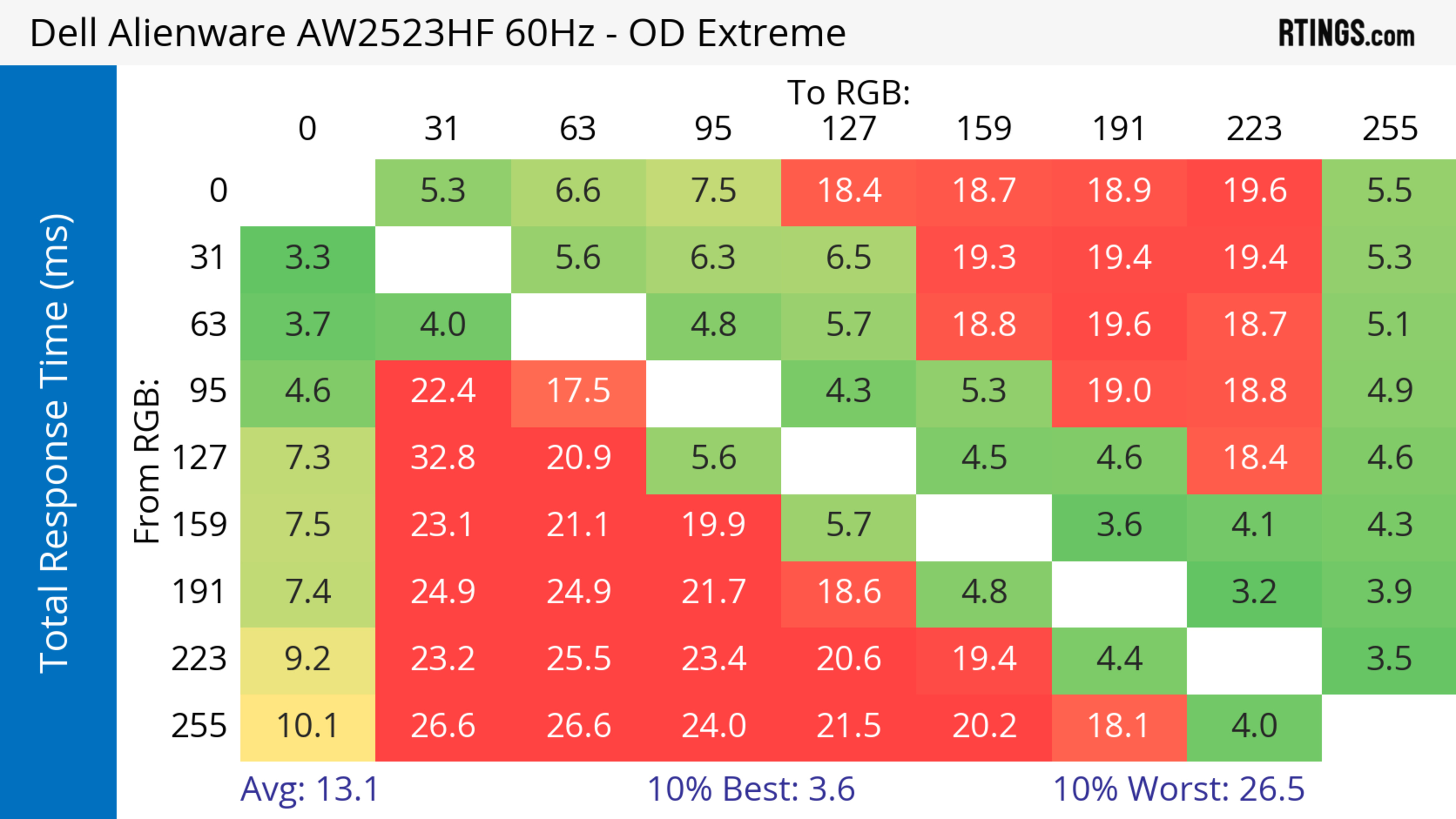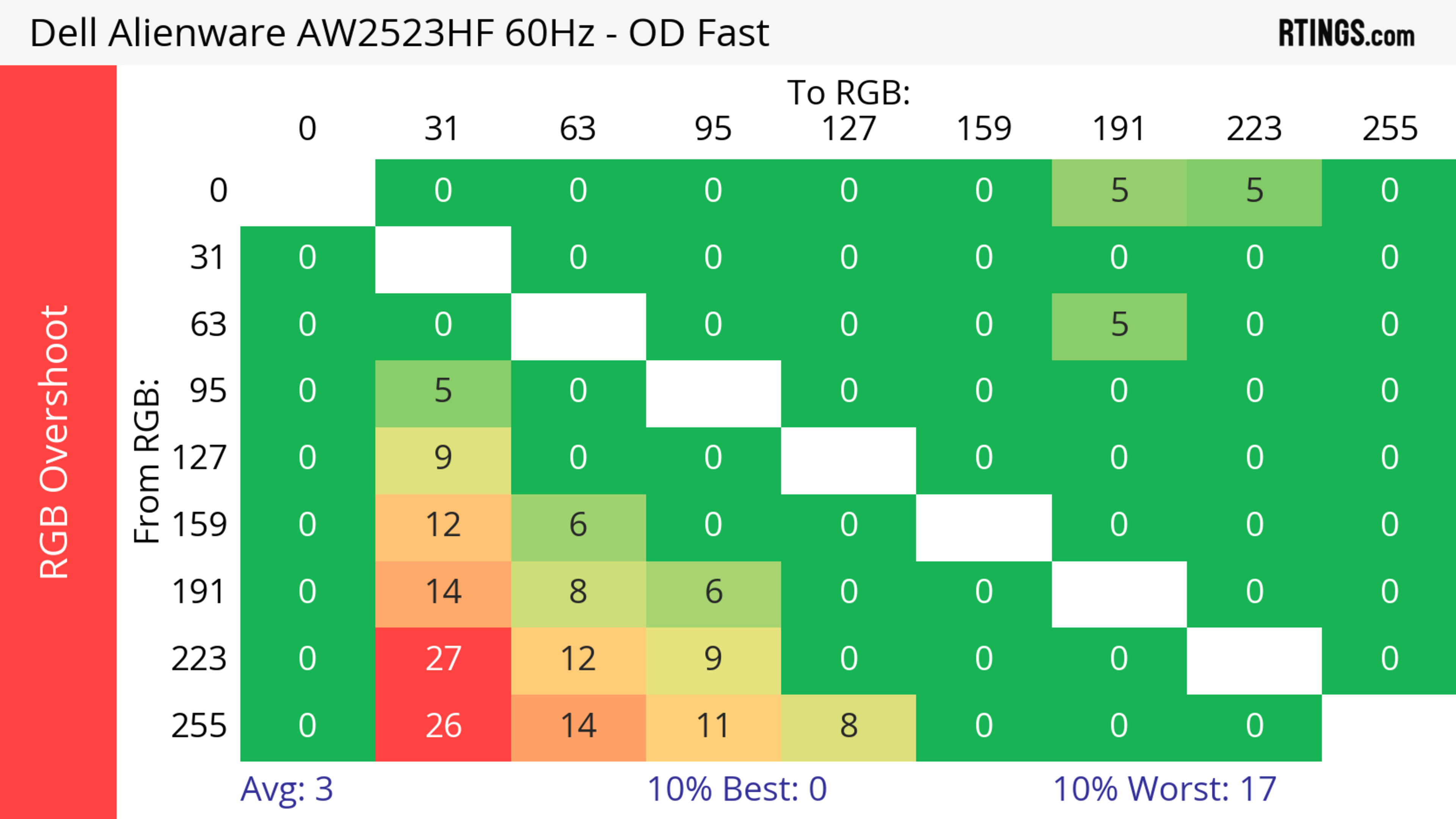 The Dell AW2523HF has good response time. Its response time is consistently fast across its entire refresh rate range, but it still has some blur with fast-moving objects.
