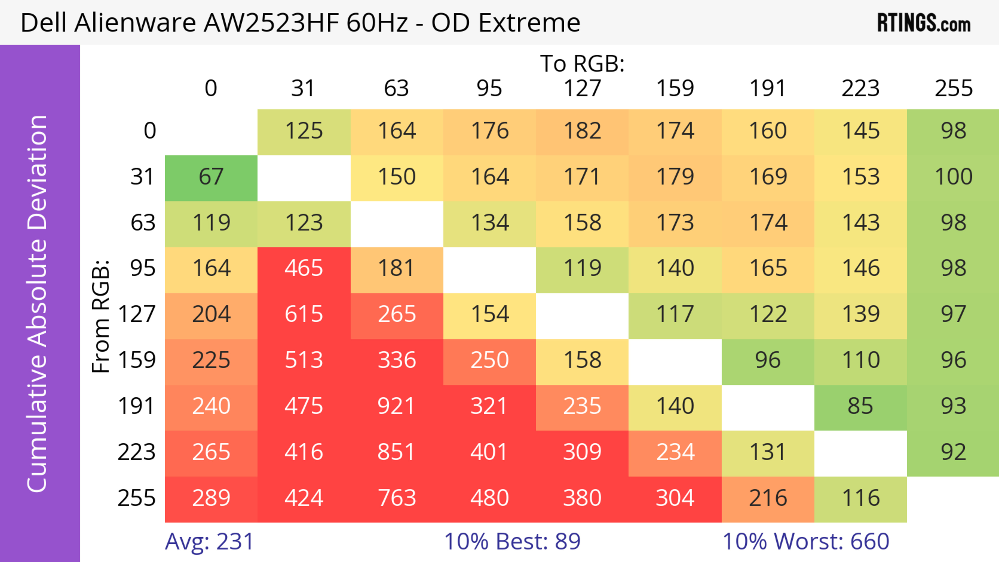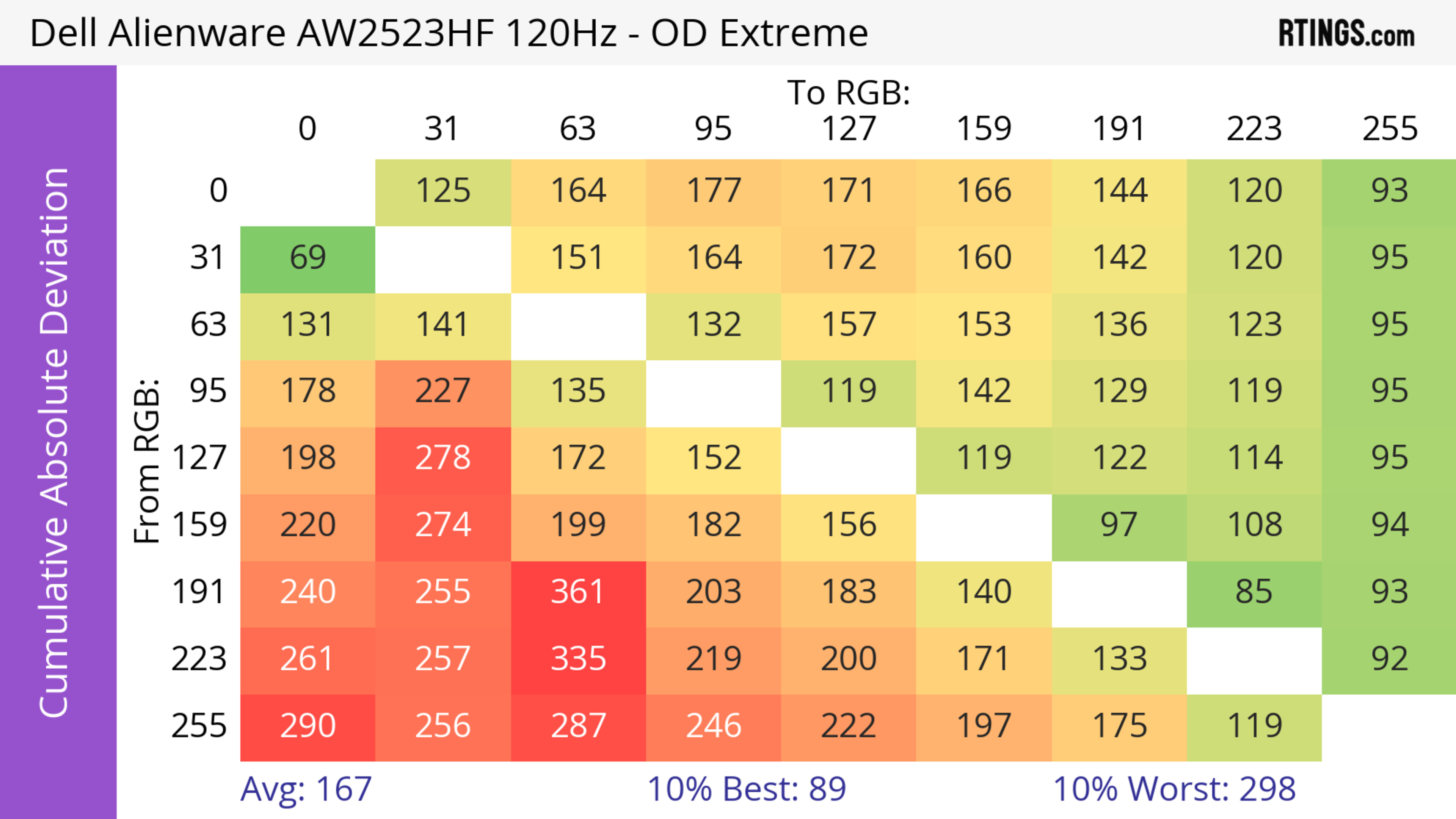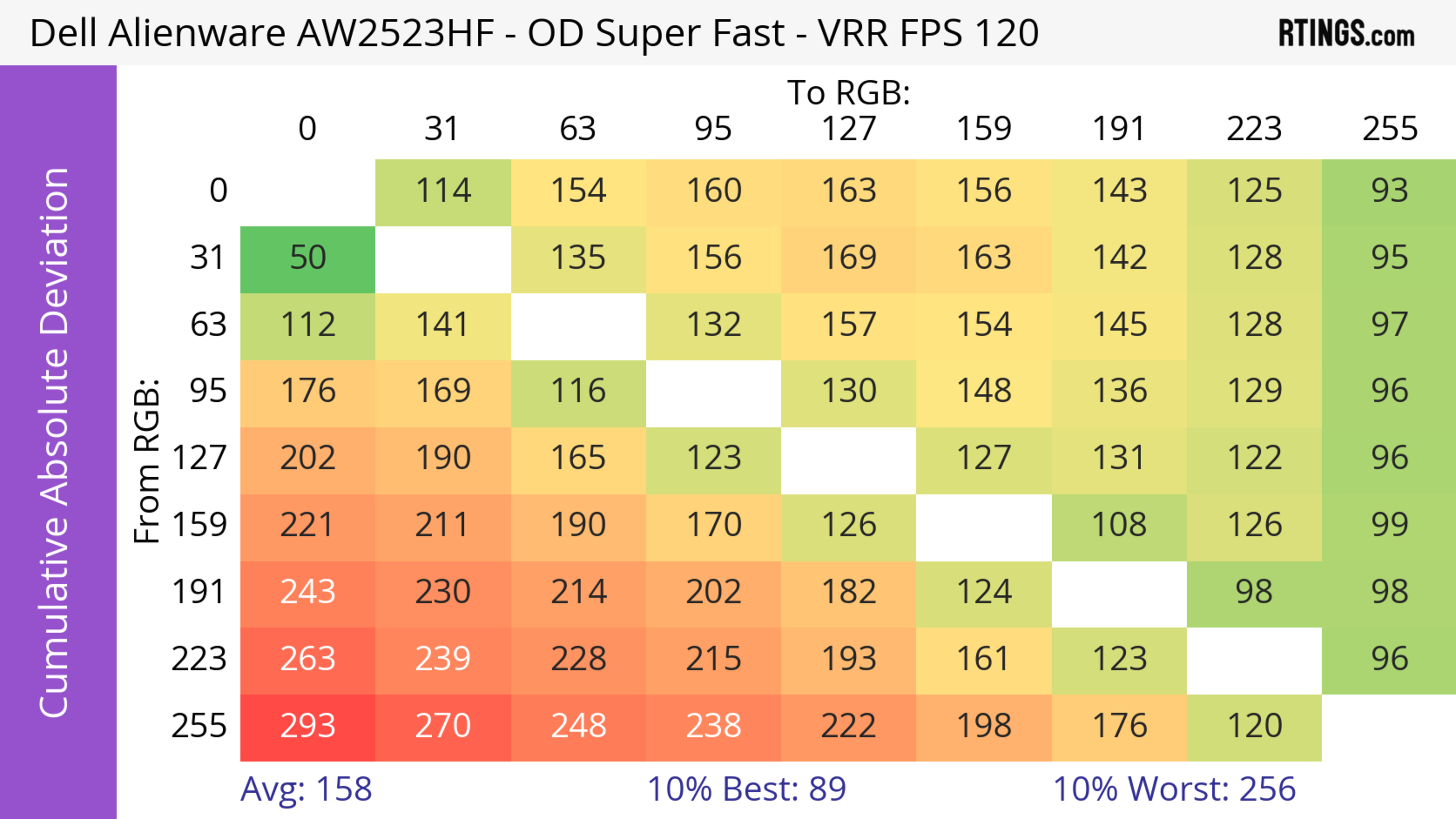 The Dell AW2523HF has great motion handling across its VRR range. All the overdrive settings are extremely consistent as the refresh rate drops, which is great. While the 'Extreme' setting performs the best at high refresh rates, 'Super Fast' is better at lower refresh rates.