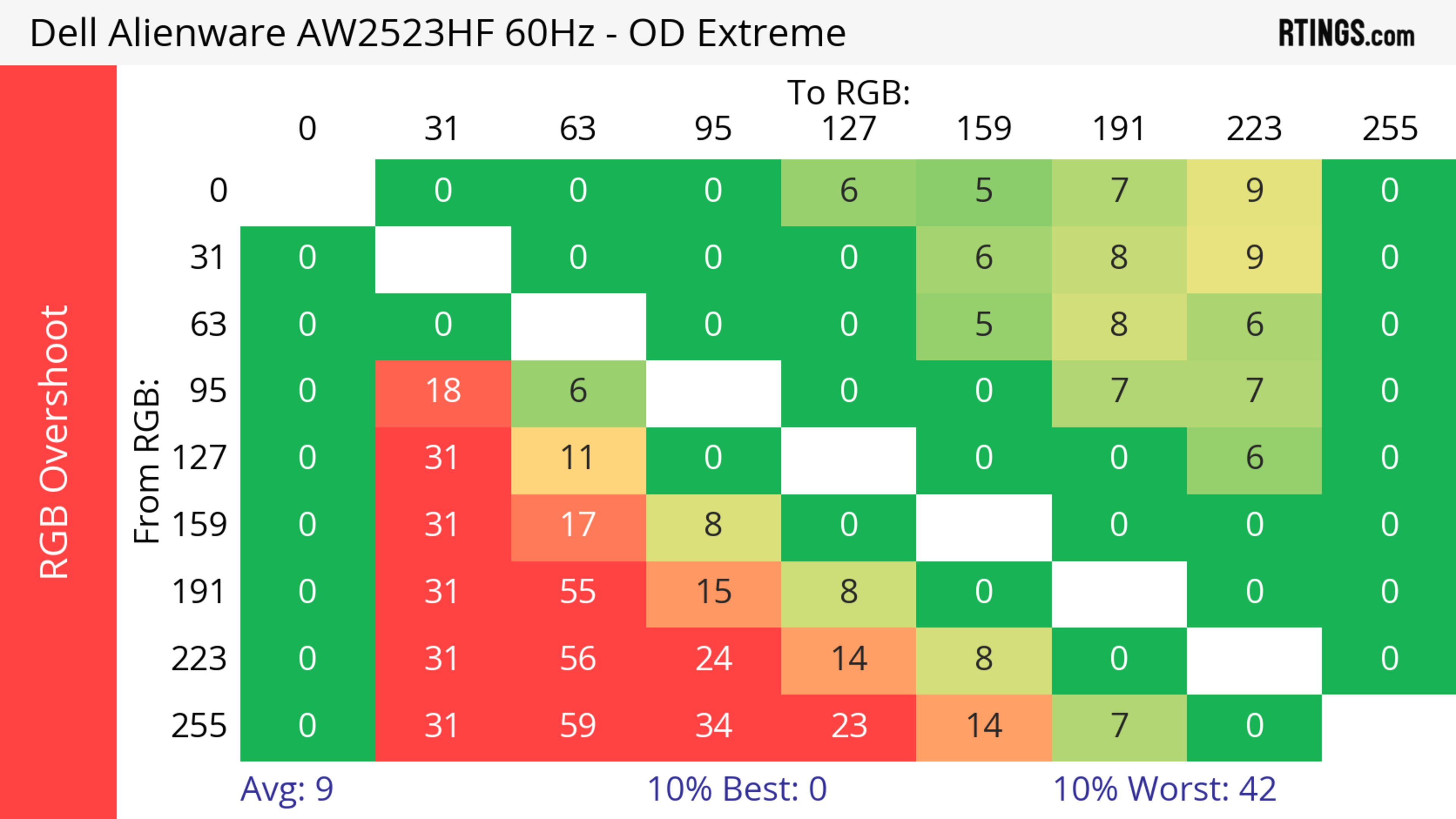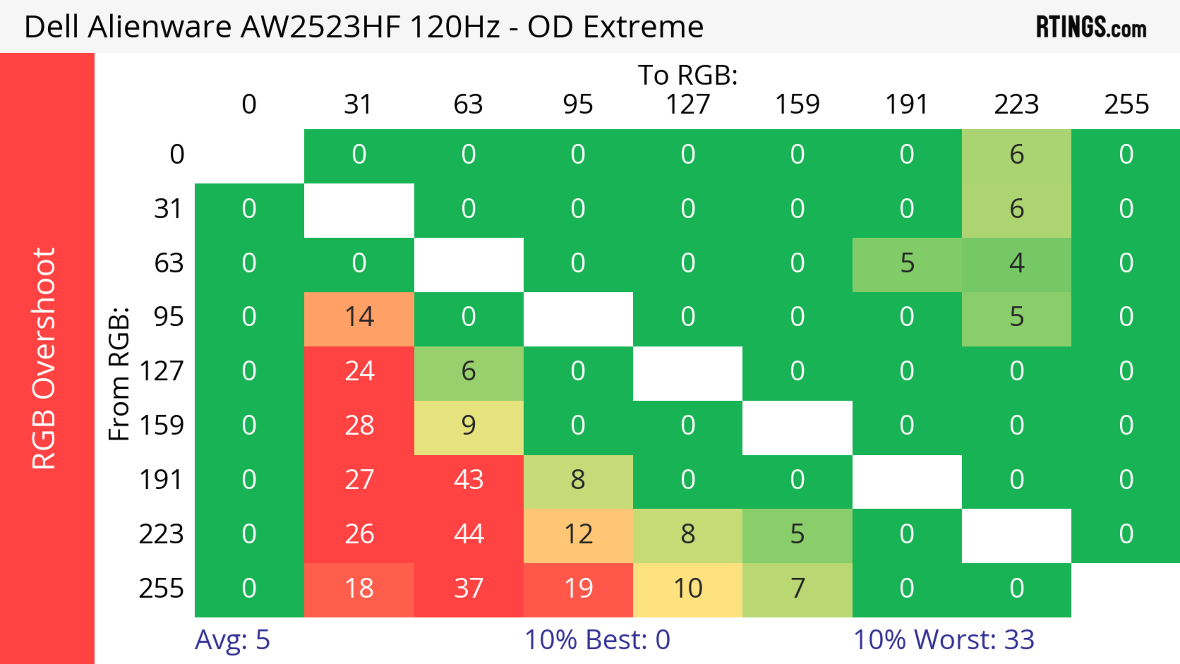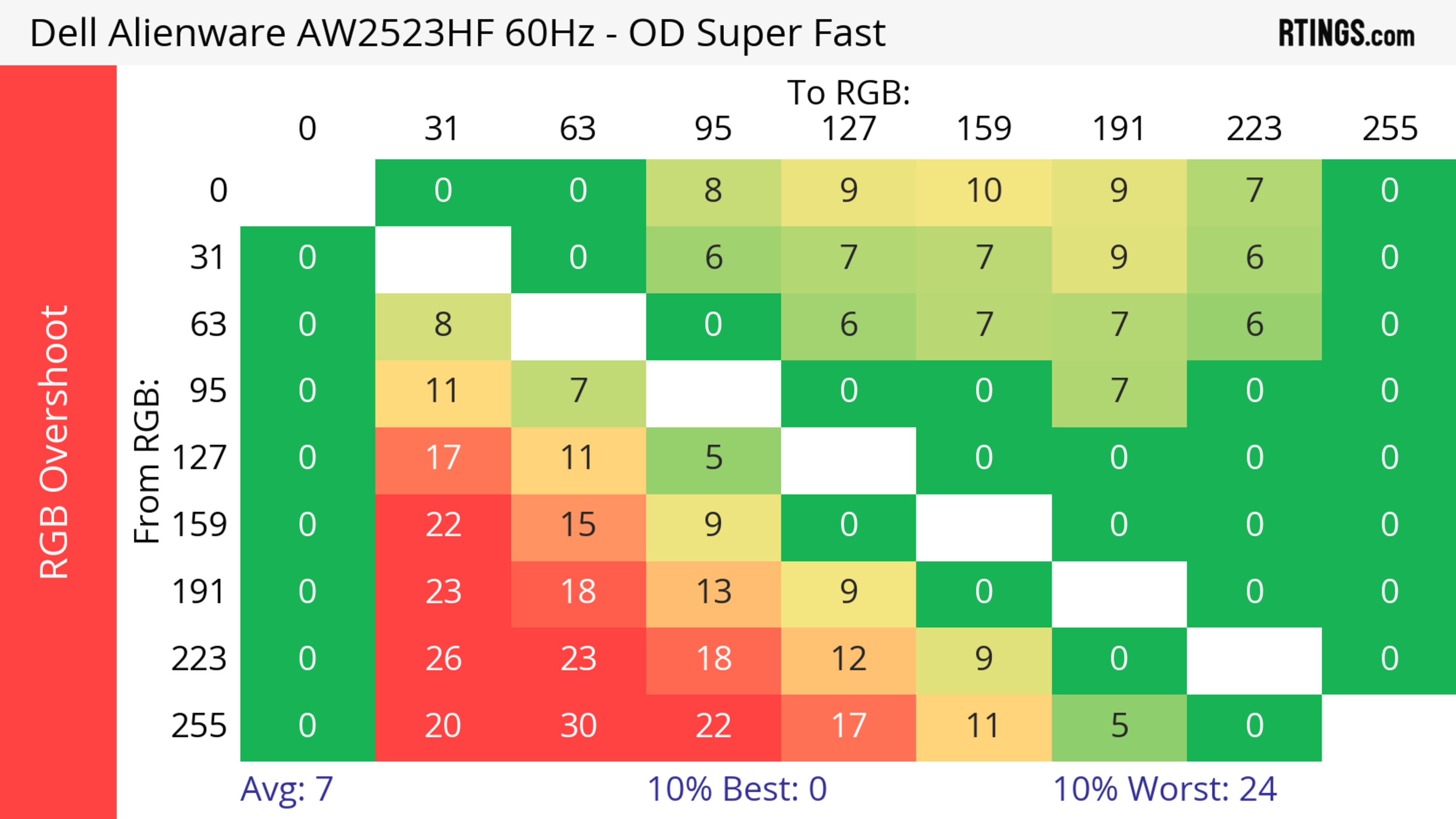 The Dell AW2523HF has great motion handling across its VRR range. All the overdrive settings are extremely consistent as the refresh rate drops, which is great. While the 'Extreme' setting performs the best at high refresh rates, 'Super Fast' is better at lower refresh rates.