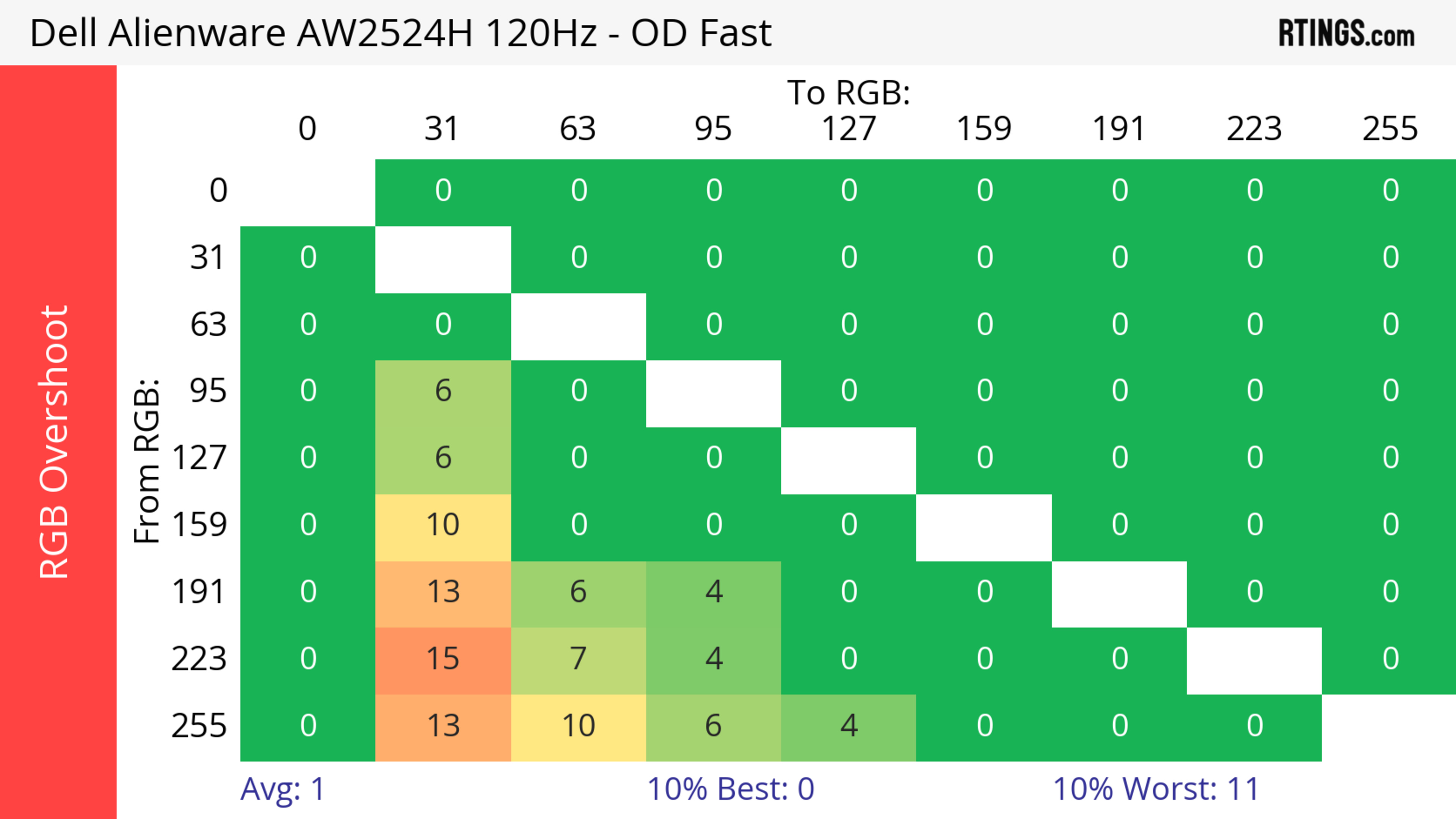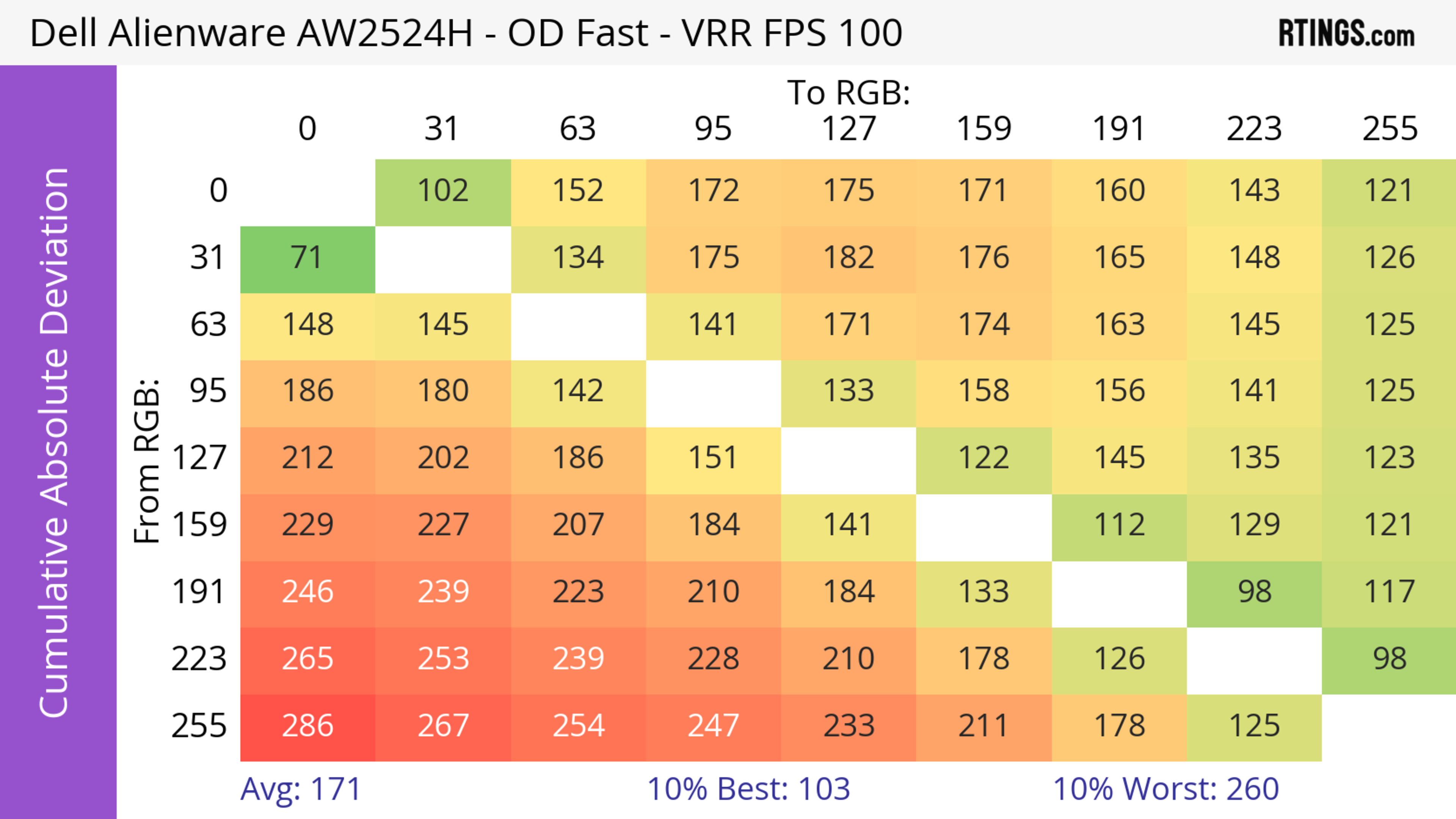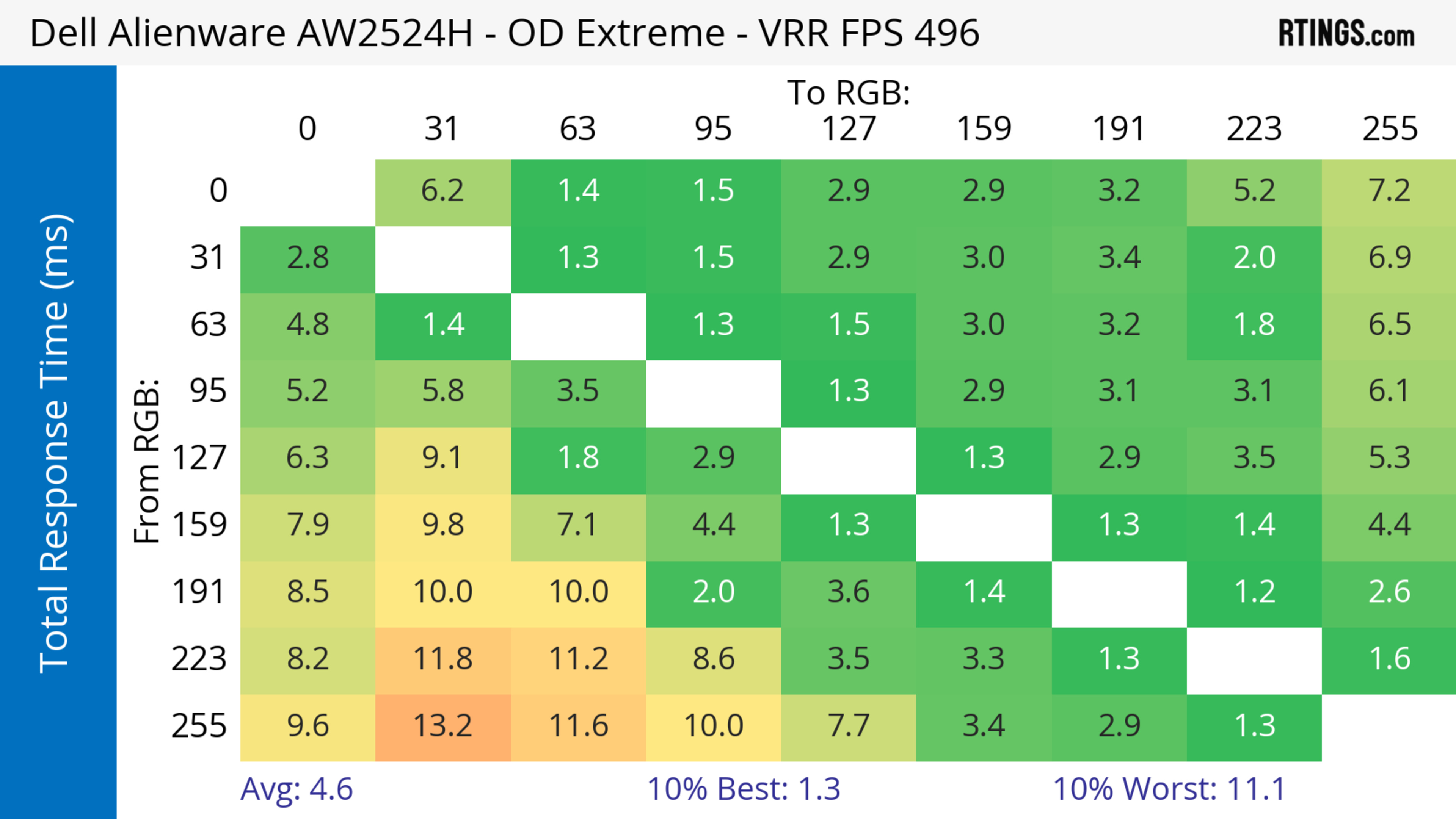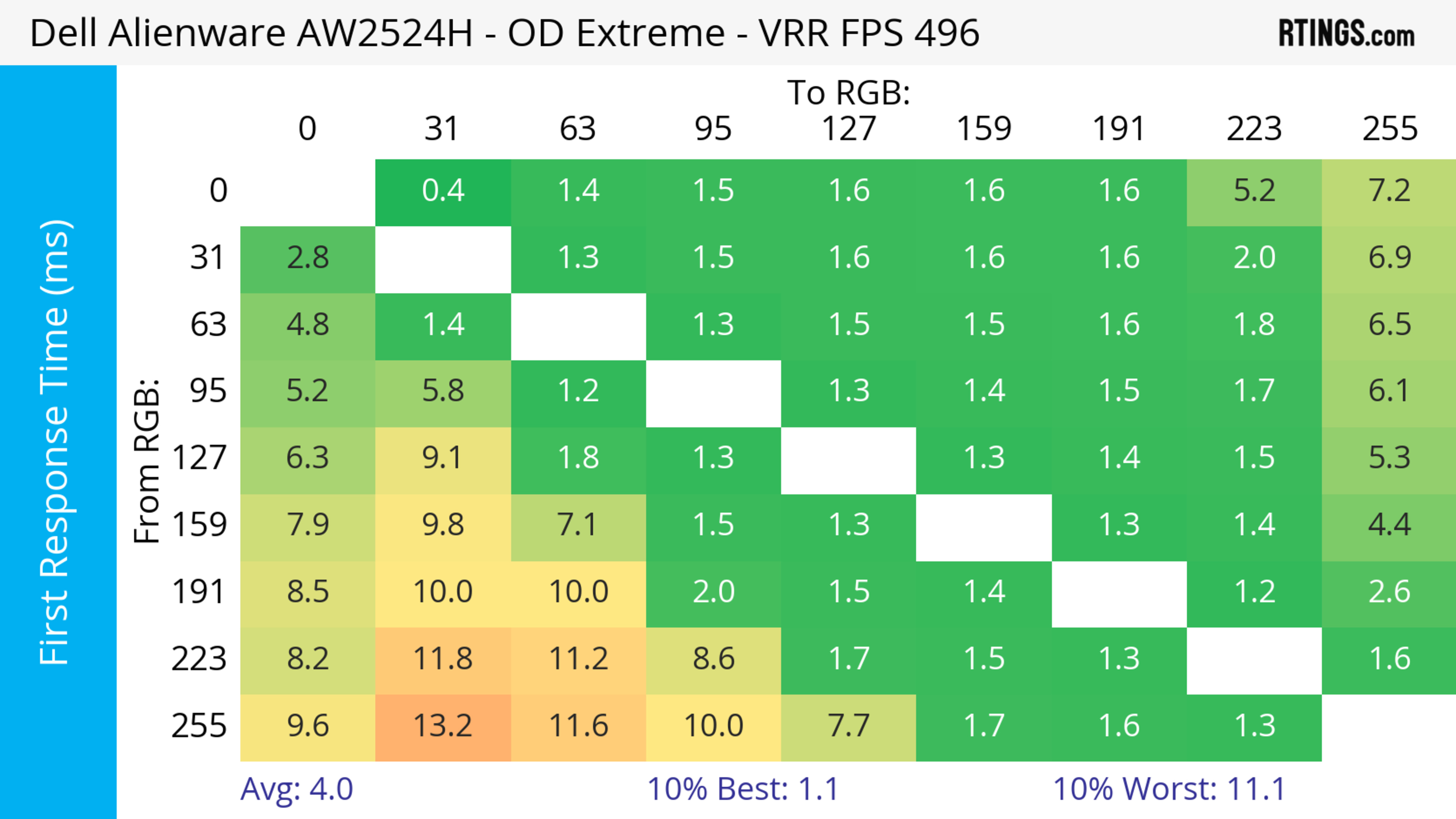 The refresh rate compliance is good. Although its response time isn't fast enough to make full color transitions before the monitor draws the next frame at the max refresh rate, it's much better at lower refresh rates.