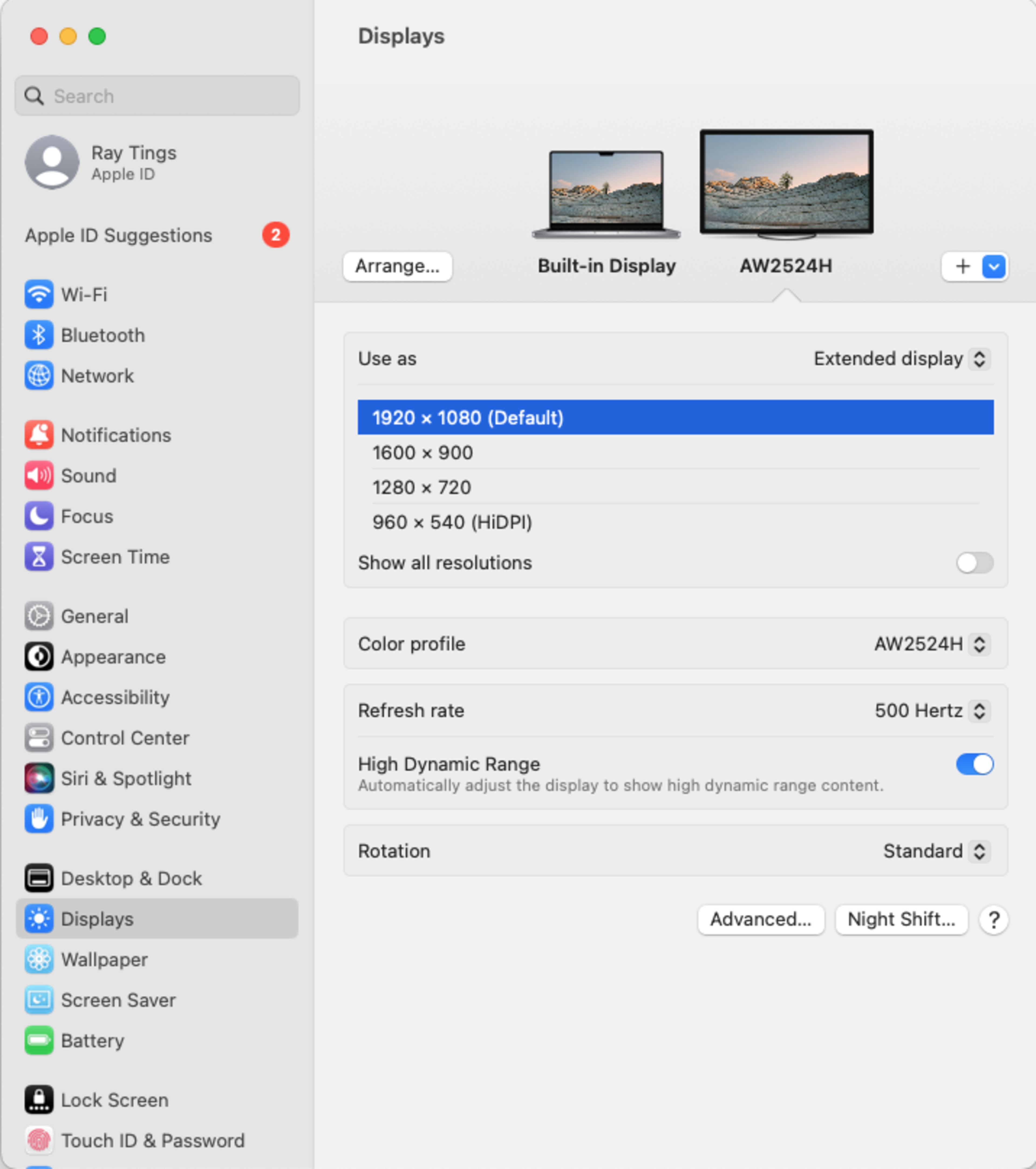 This monitor works well with macOS, and there aren't any issues like flickering. You can either send a fixed 500Hz refresh rate or use VRR up to 240Hz. HDR works well with either option, but it looks a bit washed out, which is a limitation of the monitor. If you're using a MacBook, windows stay in their place when waking it up from sleep or opening the lid.