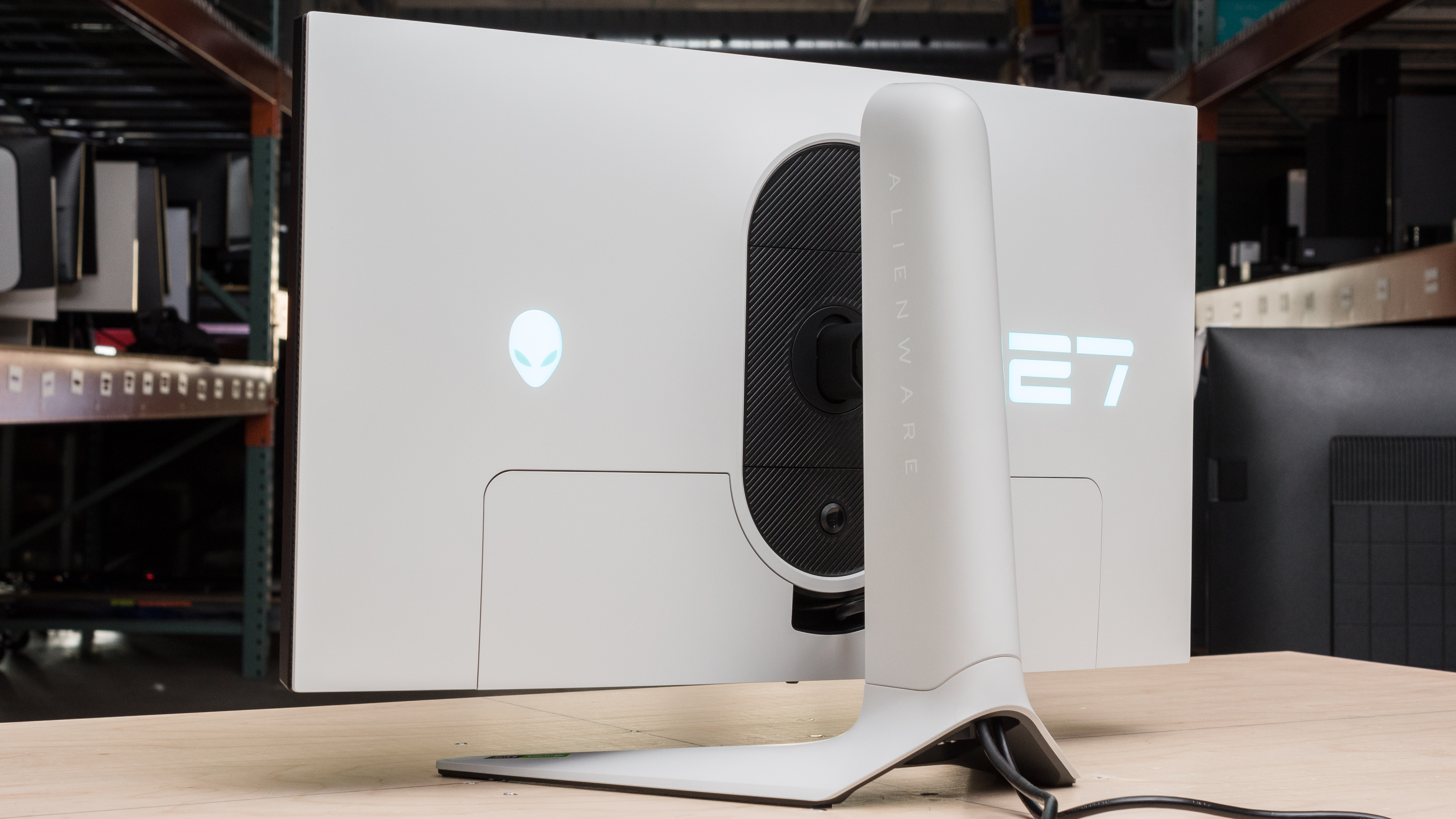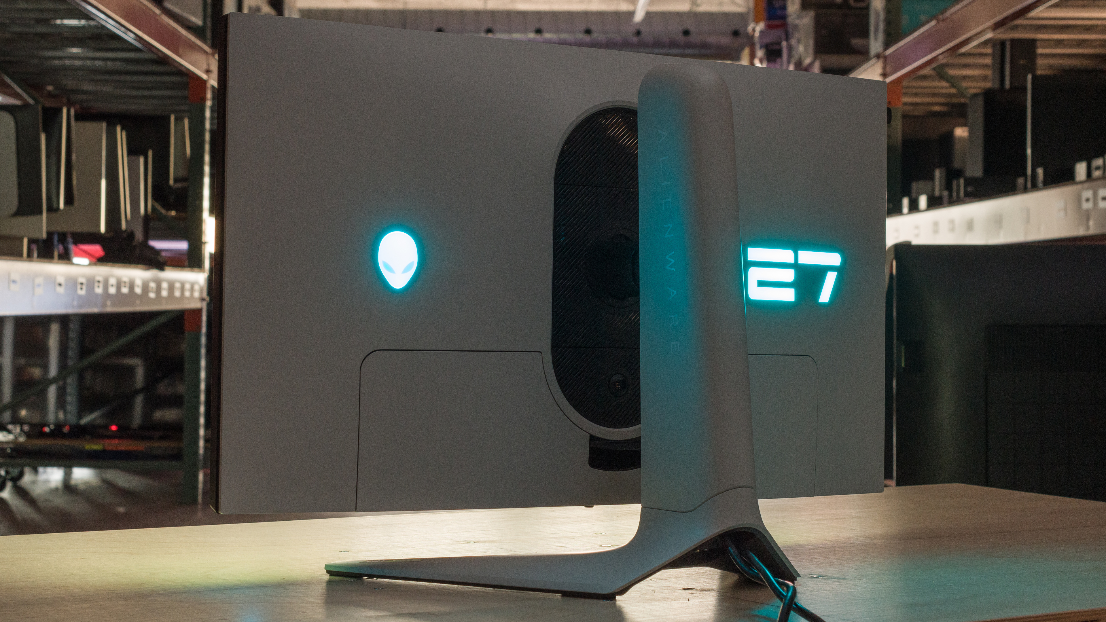 The Dell AW2723DF has a gamer-oriented design with typical Alienware branding throughout. It has a white body in the back with two RGB lighting zones, and there are black accents in front.