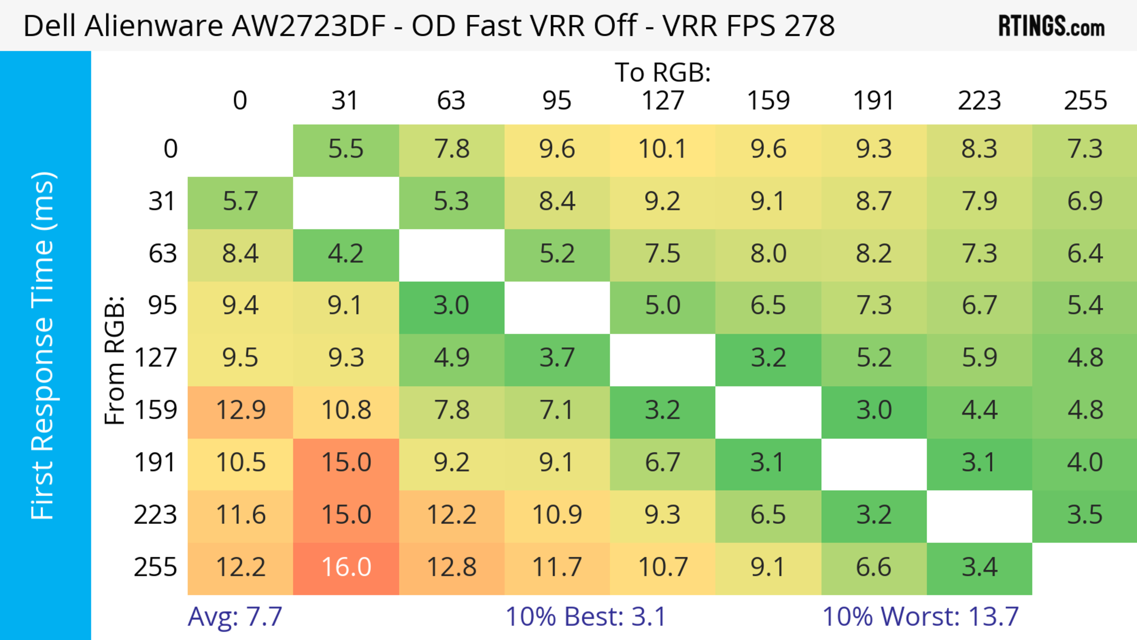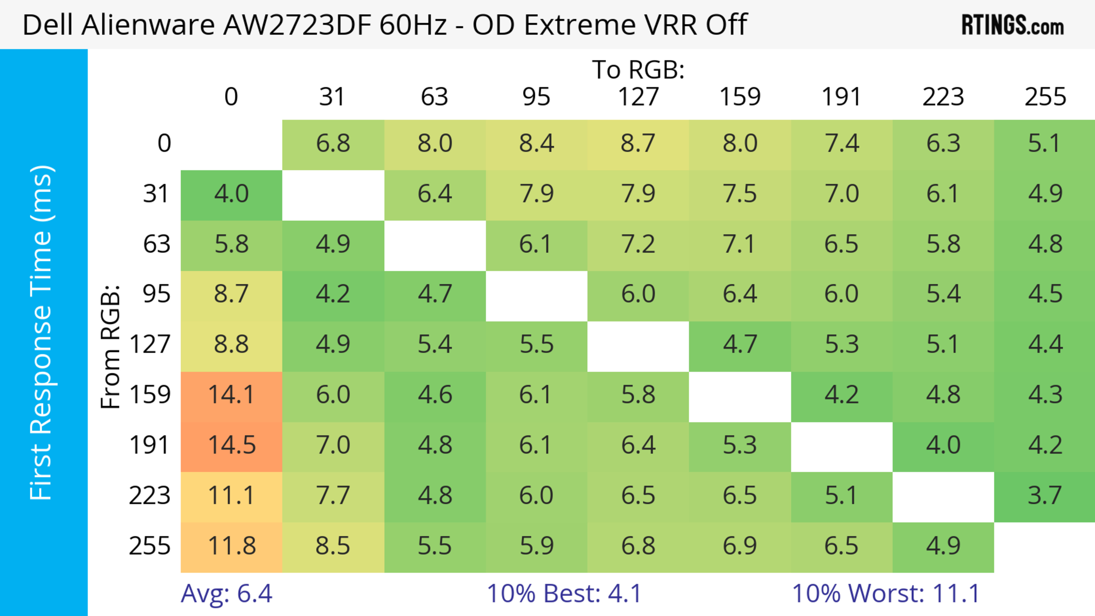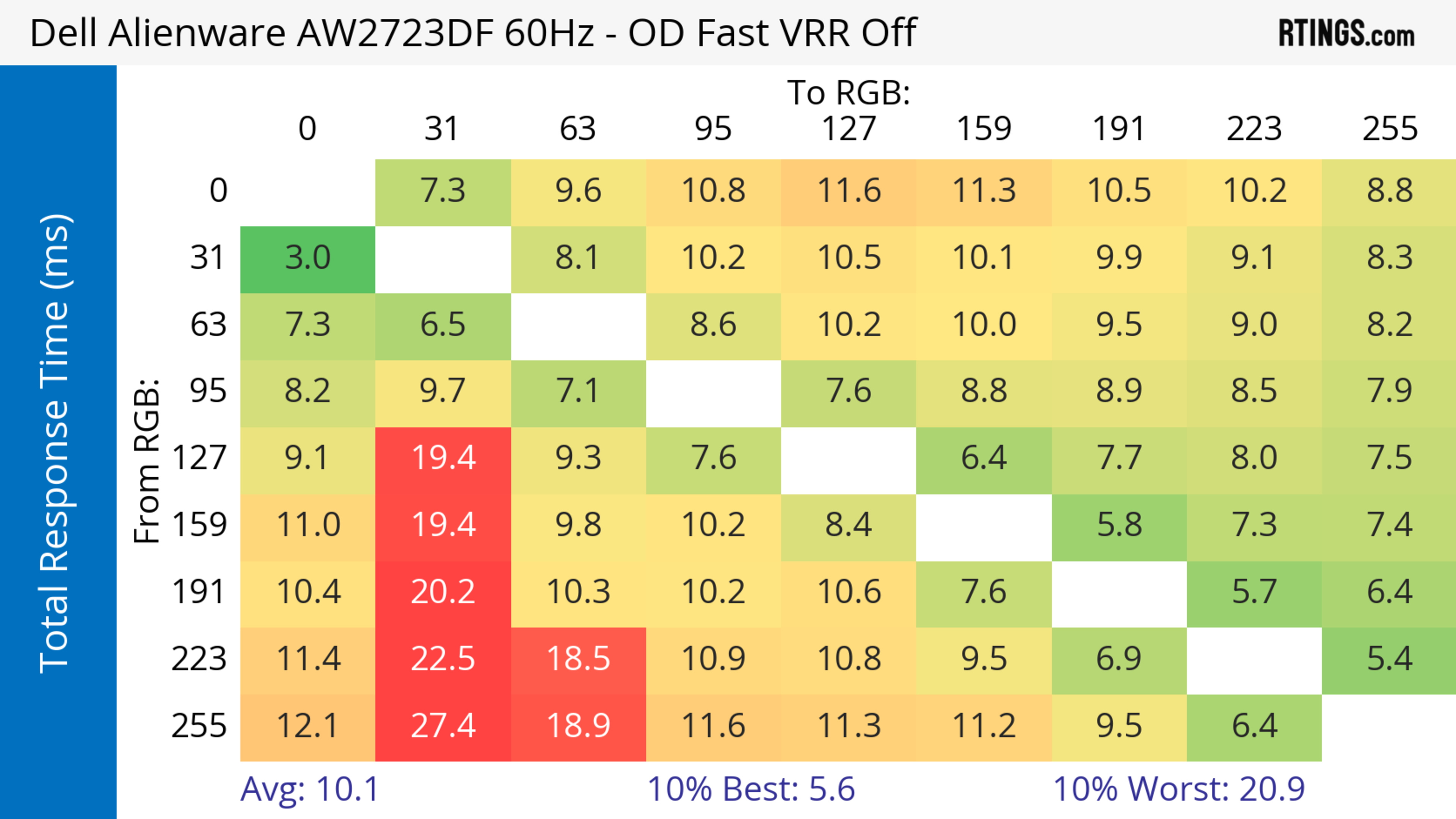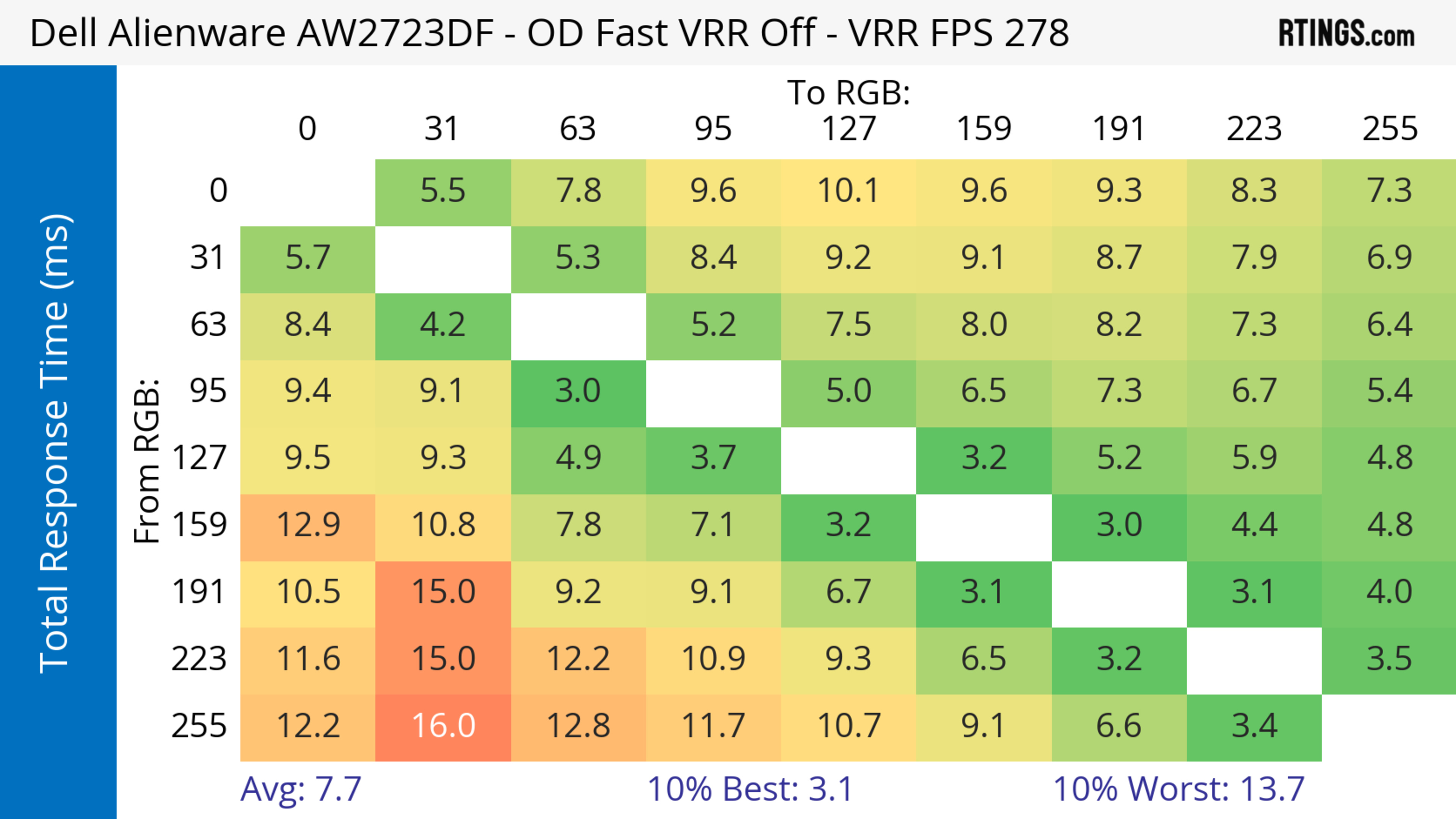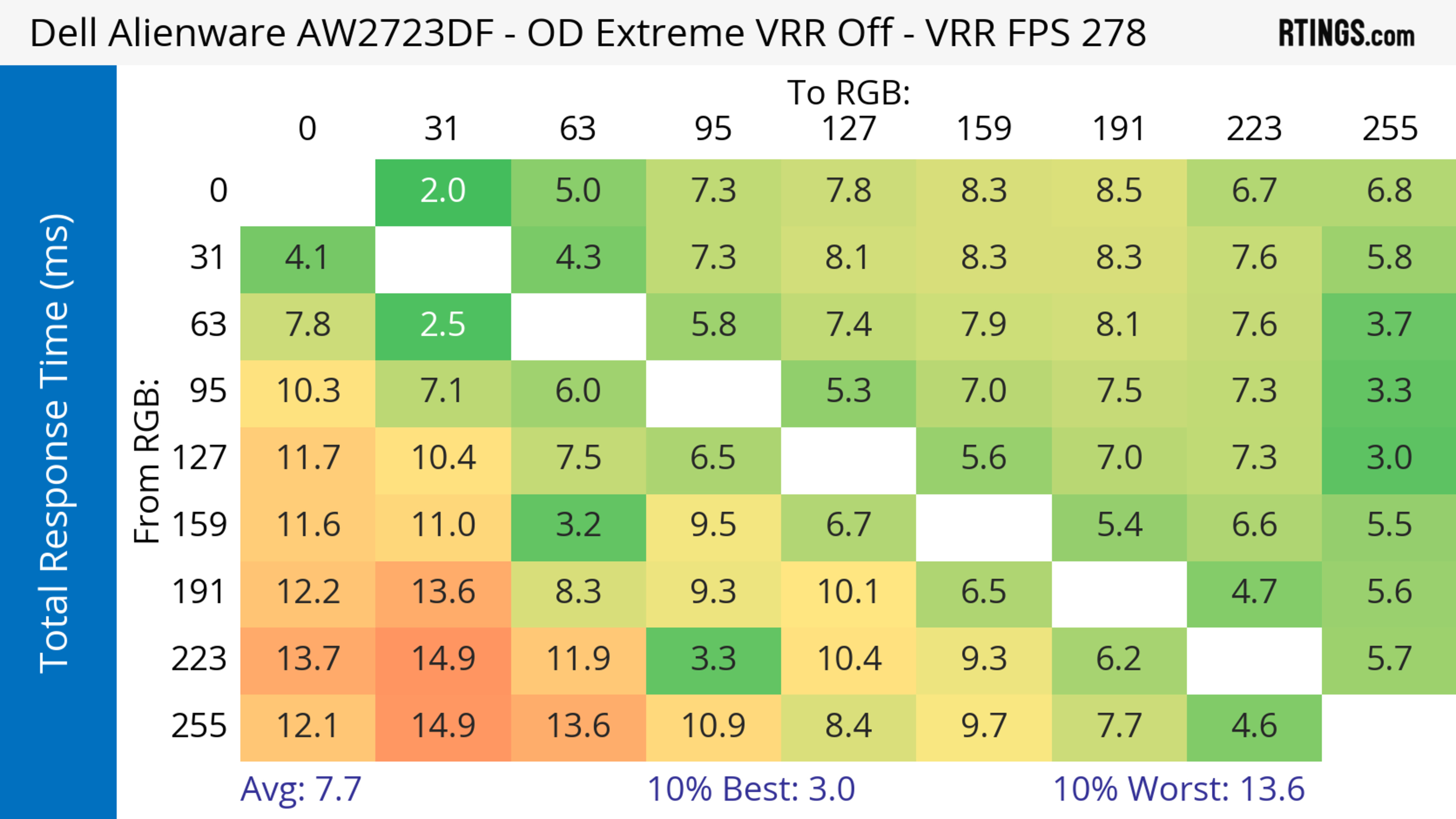 The Dell AW2723DF has a decent response time. It's consistently fast across its VRR range, but fast-moving objects still have motion blur.
