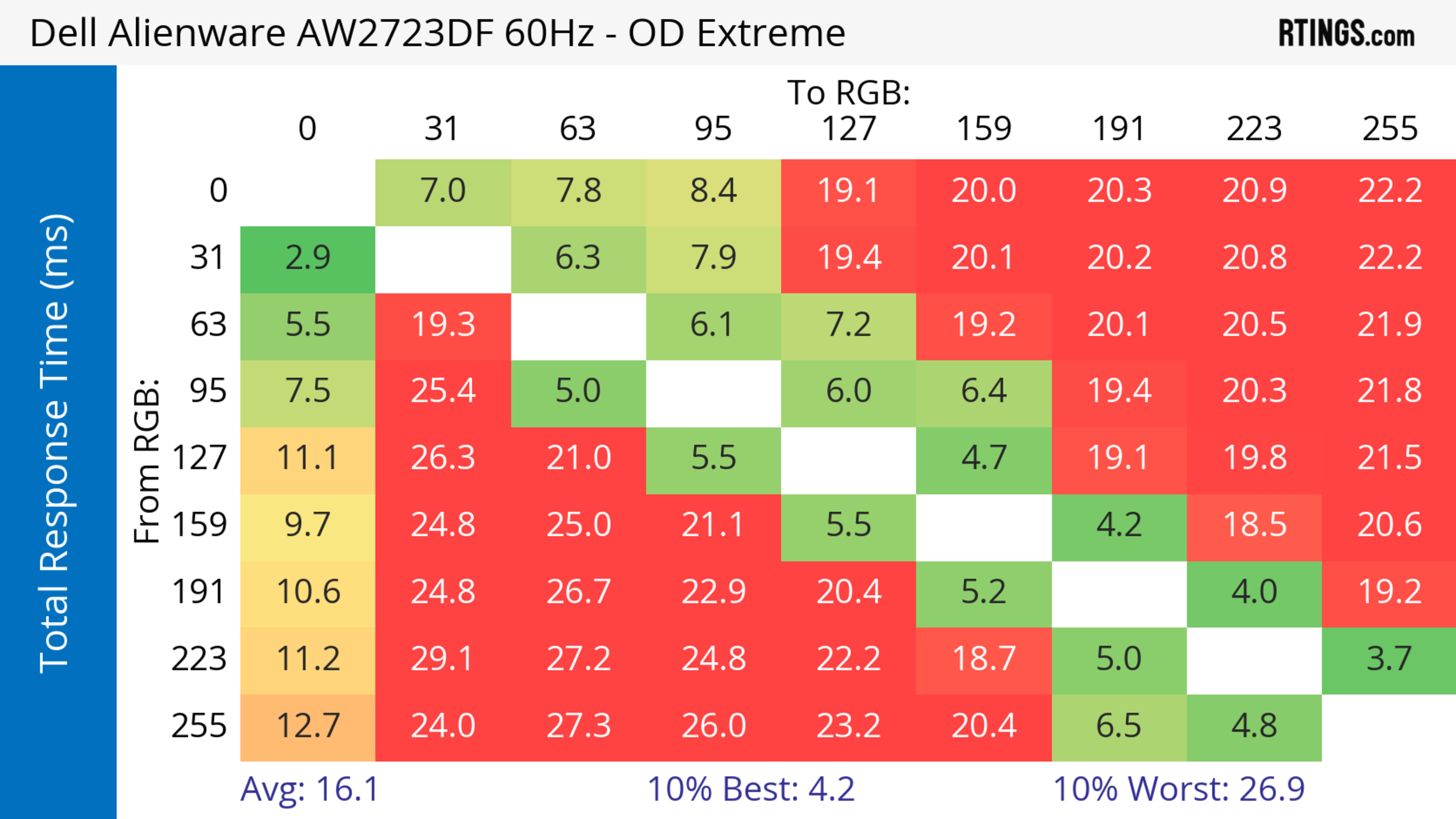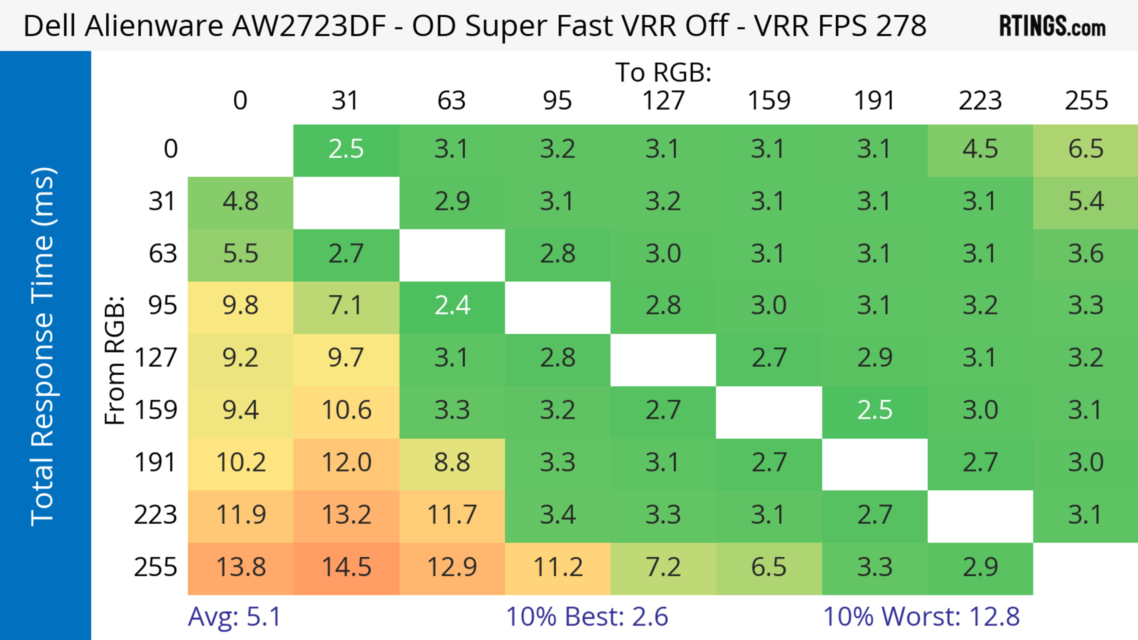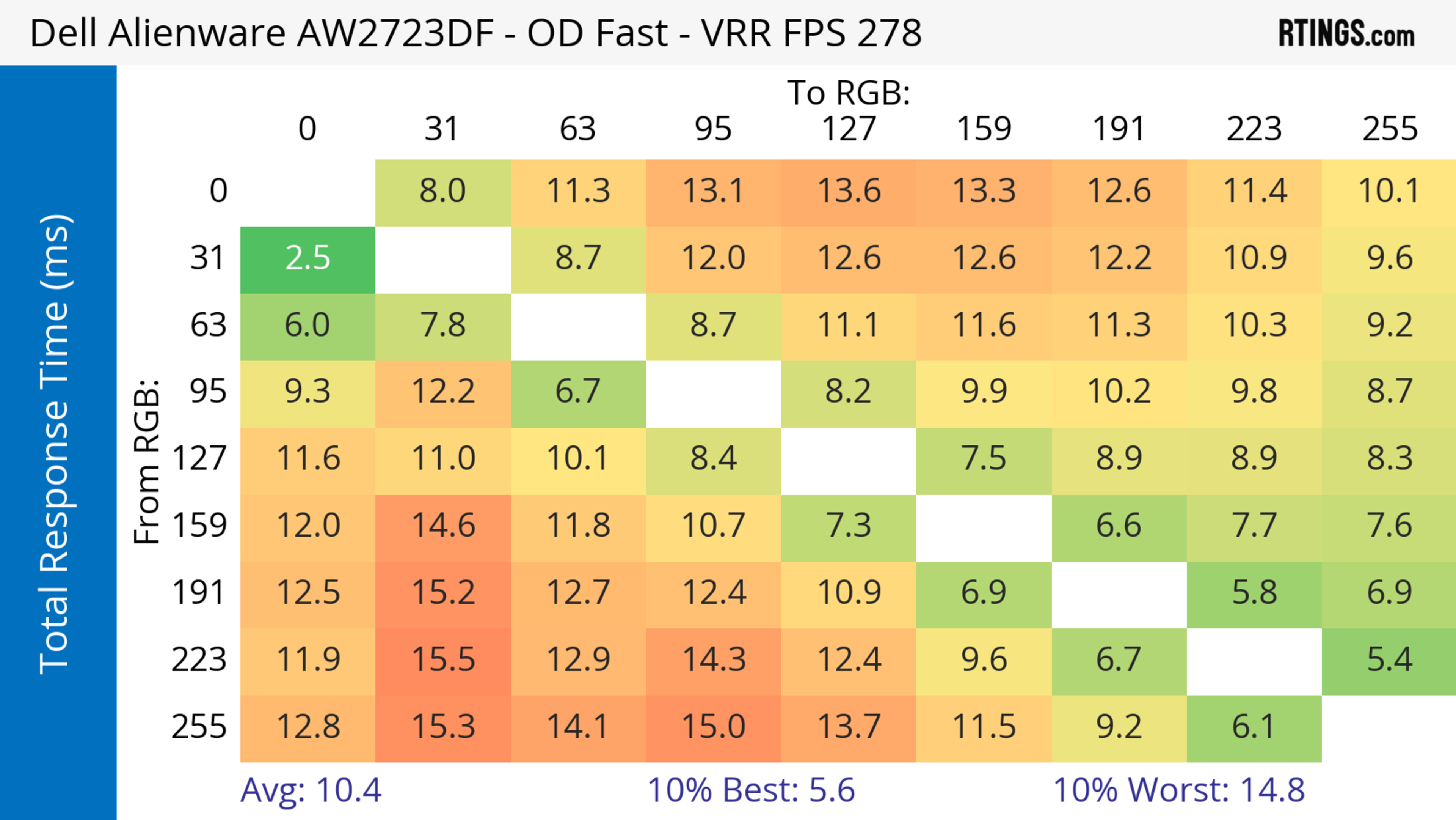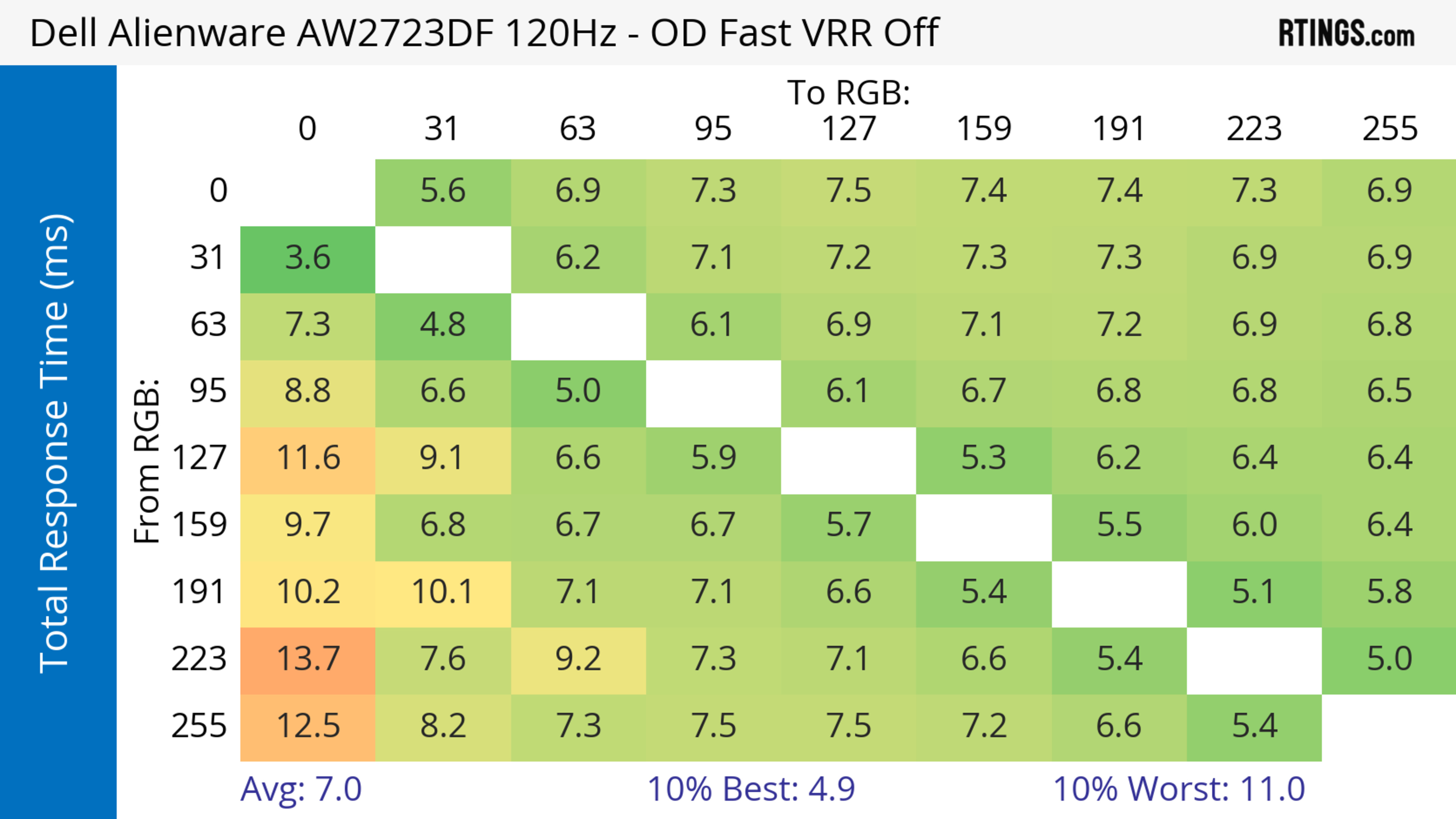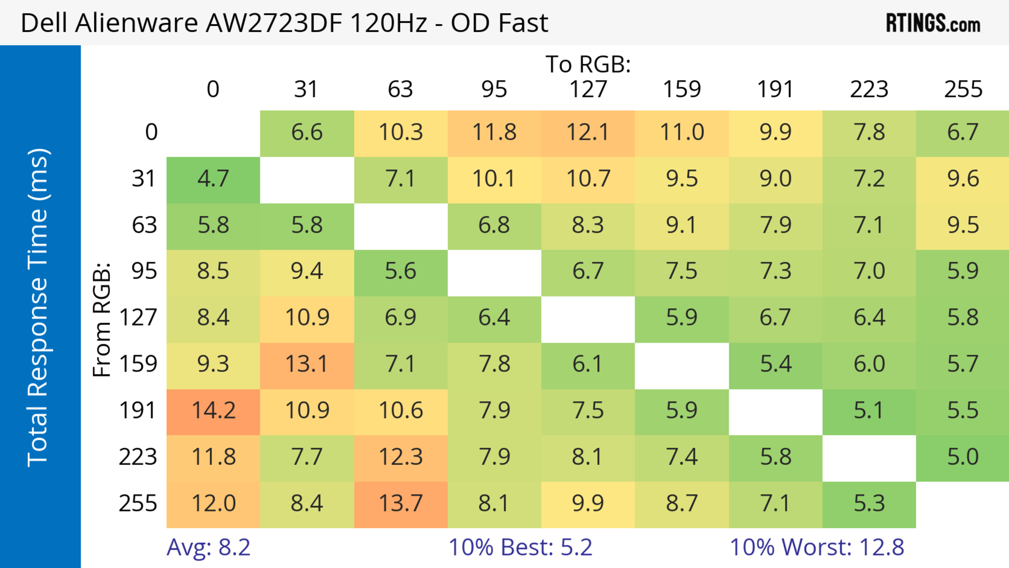 The Dell AW2723DF has a decent response time. It's consistently fast across its VRR range, but fast-moving objects still have motion blur.