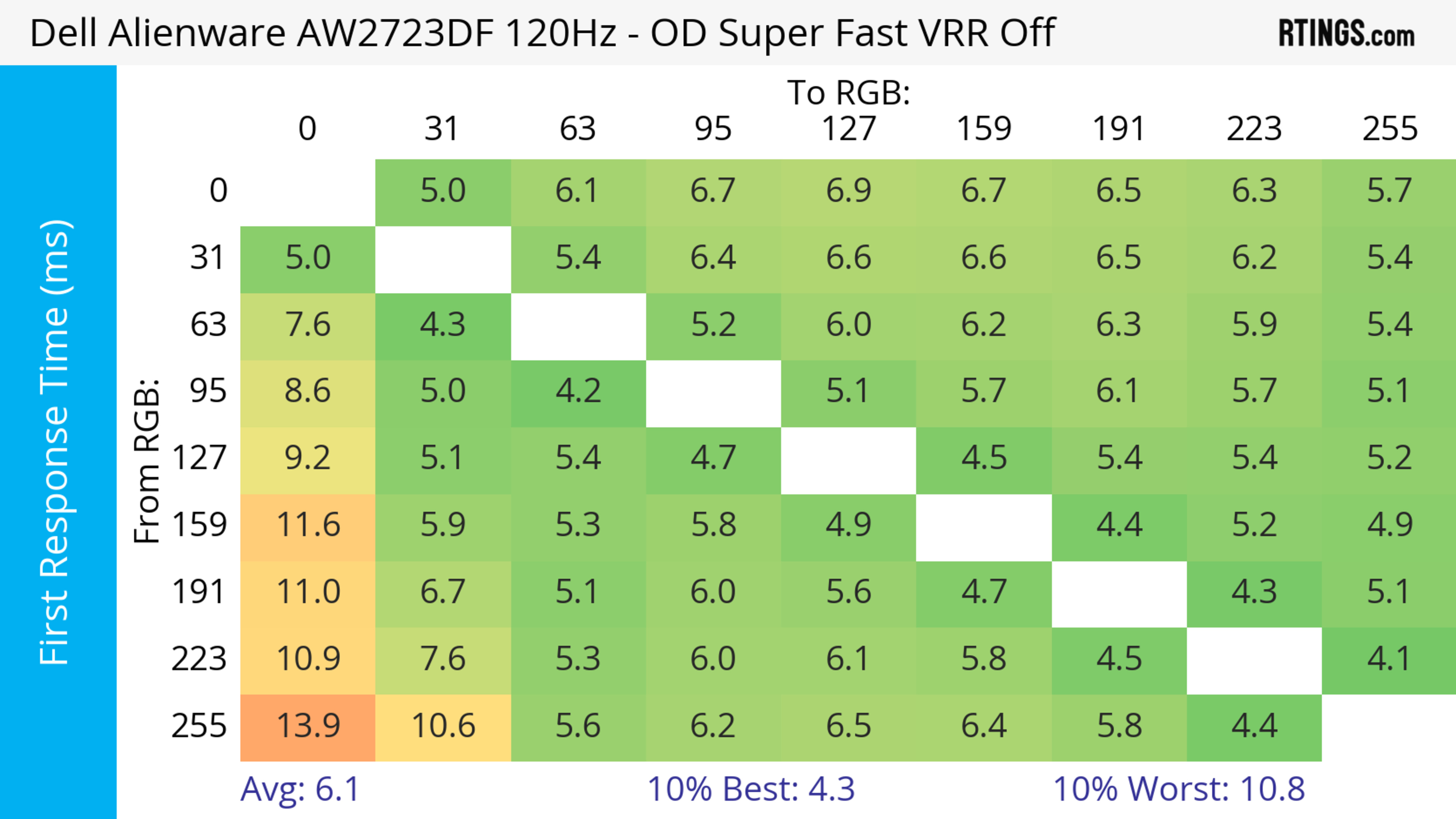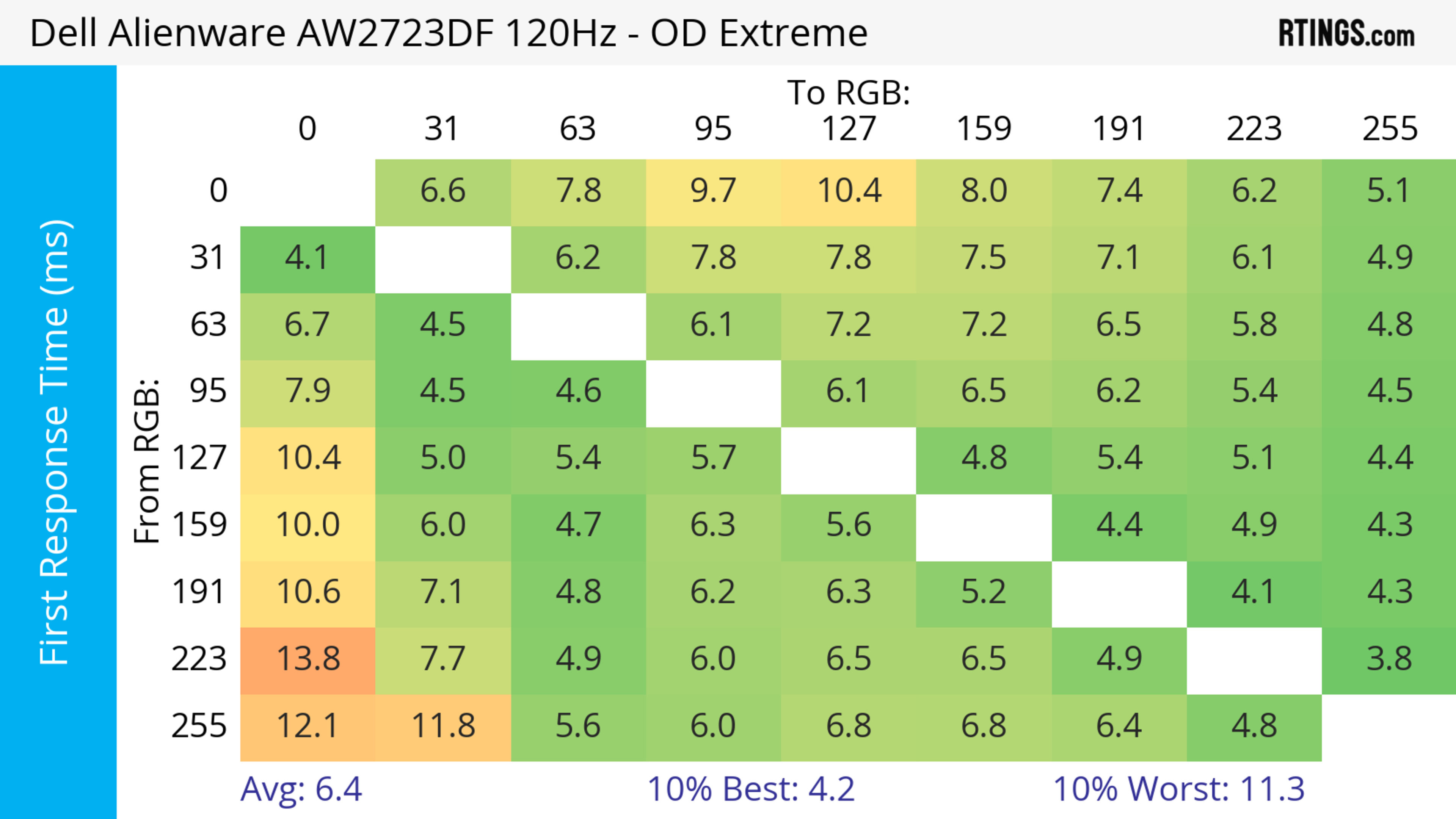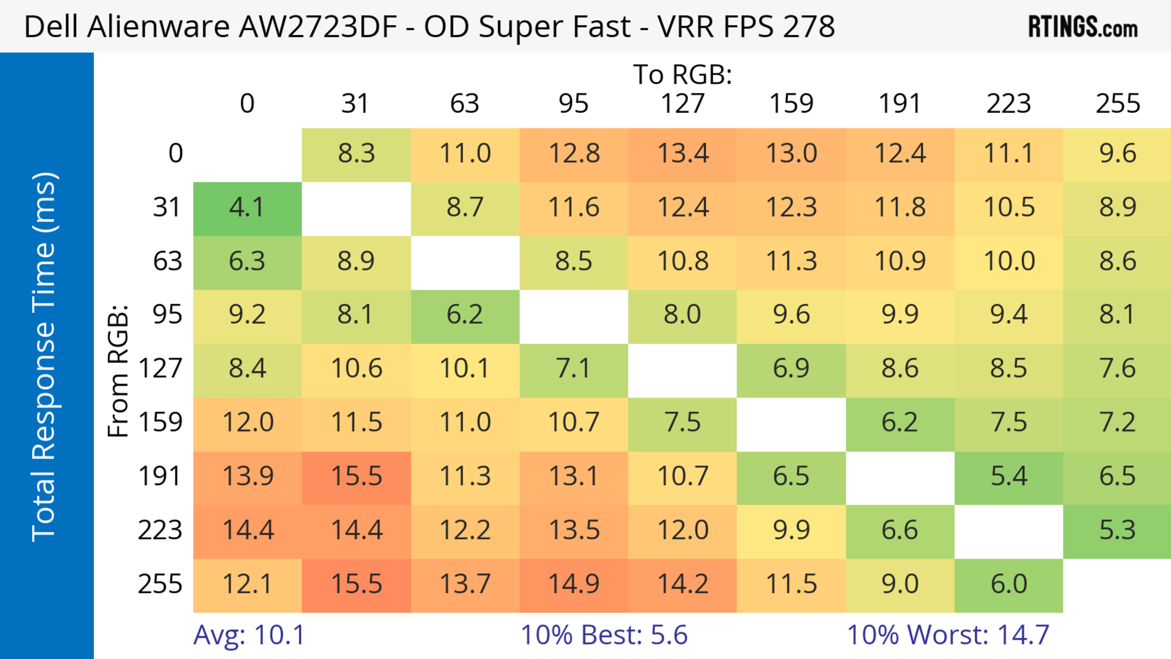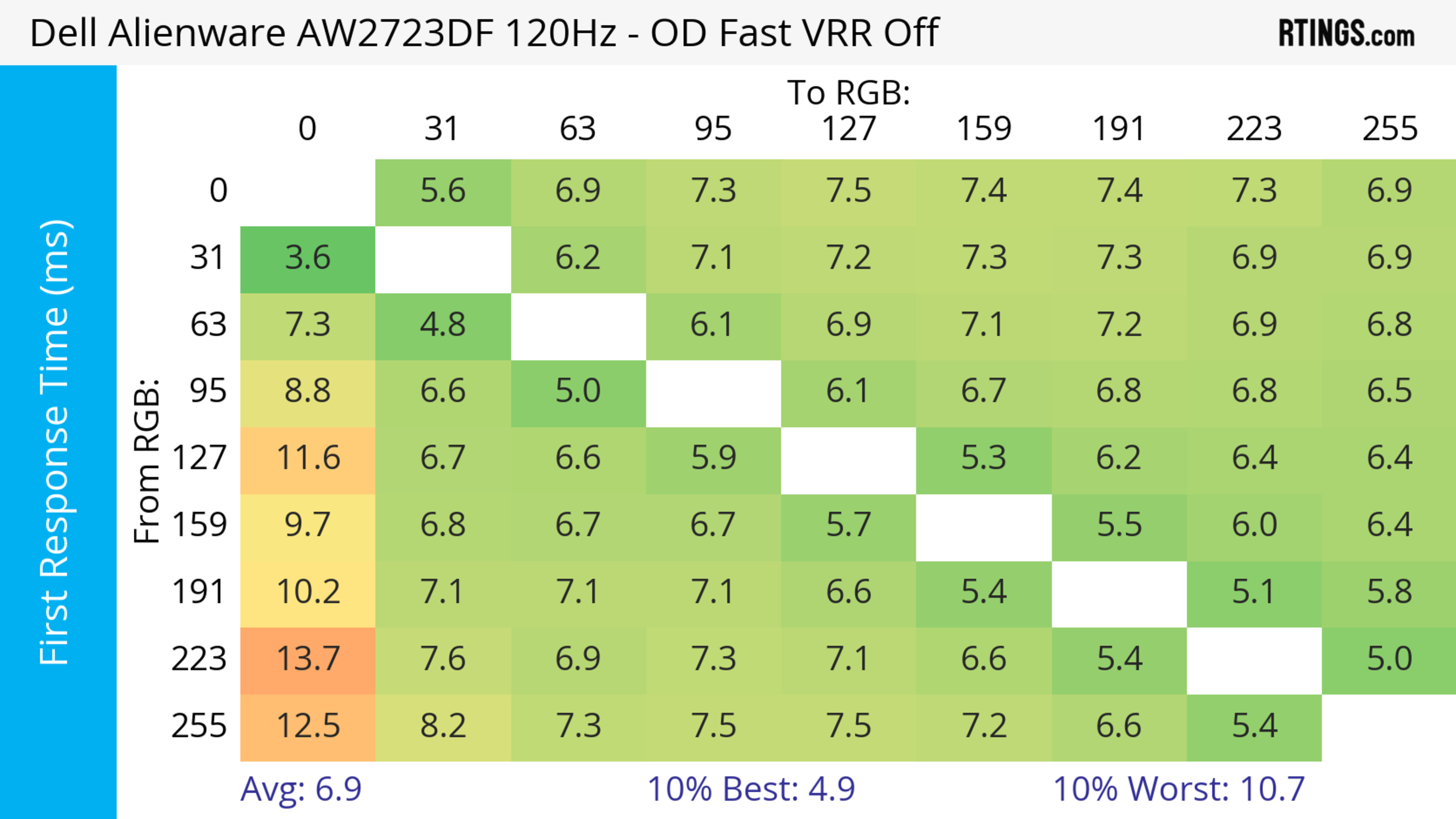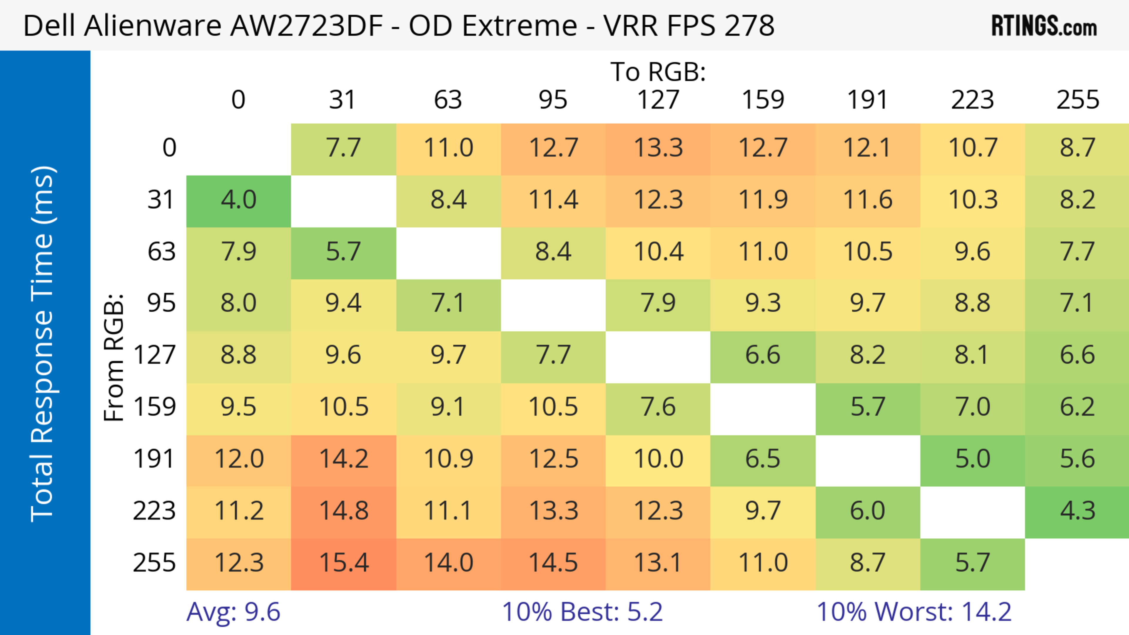 The Dell AW2723DF has a decent response time. It's consistently fast across its VRR range, but fast-moving objects still have motion blur.