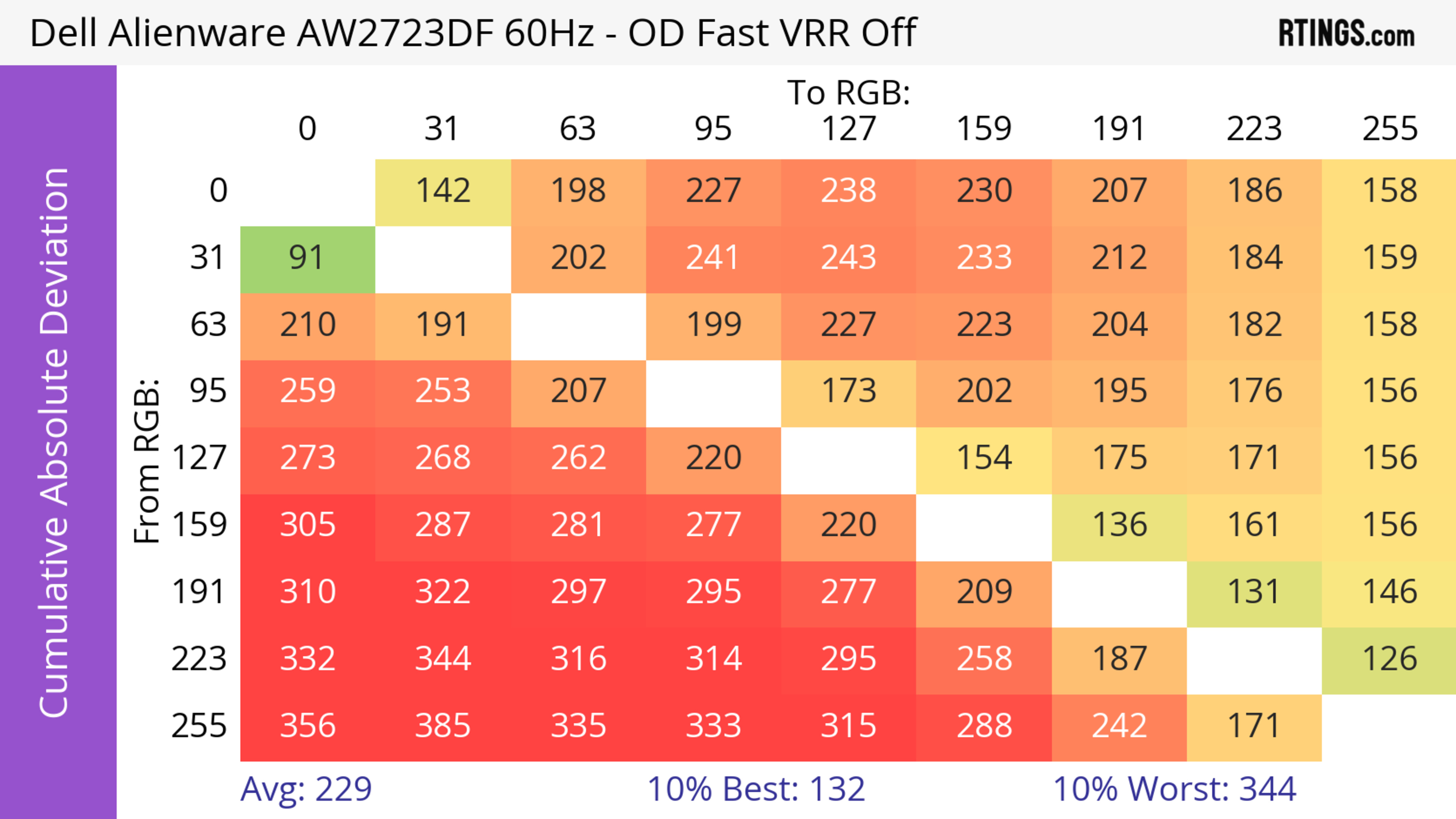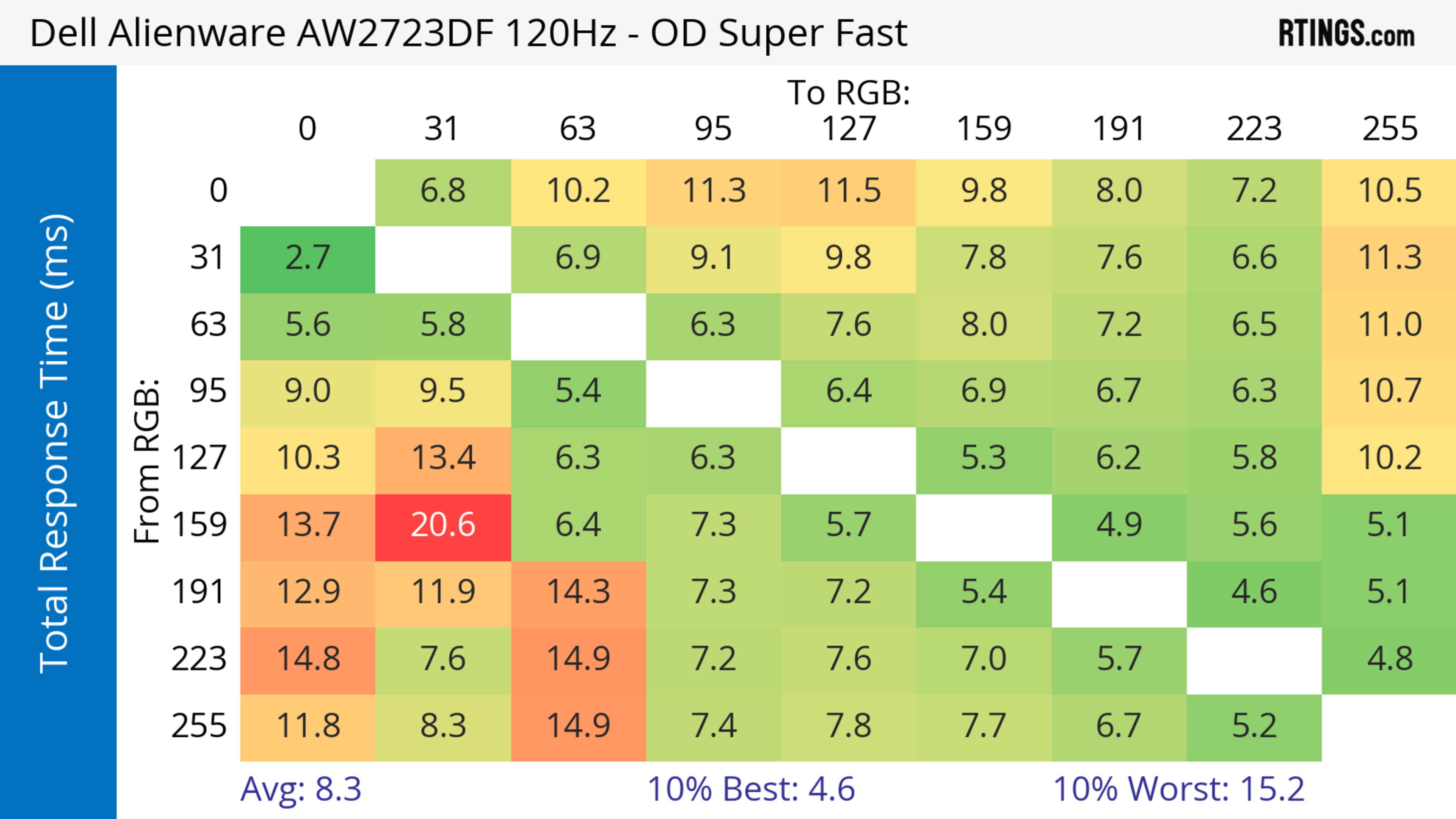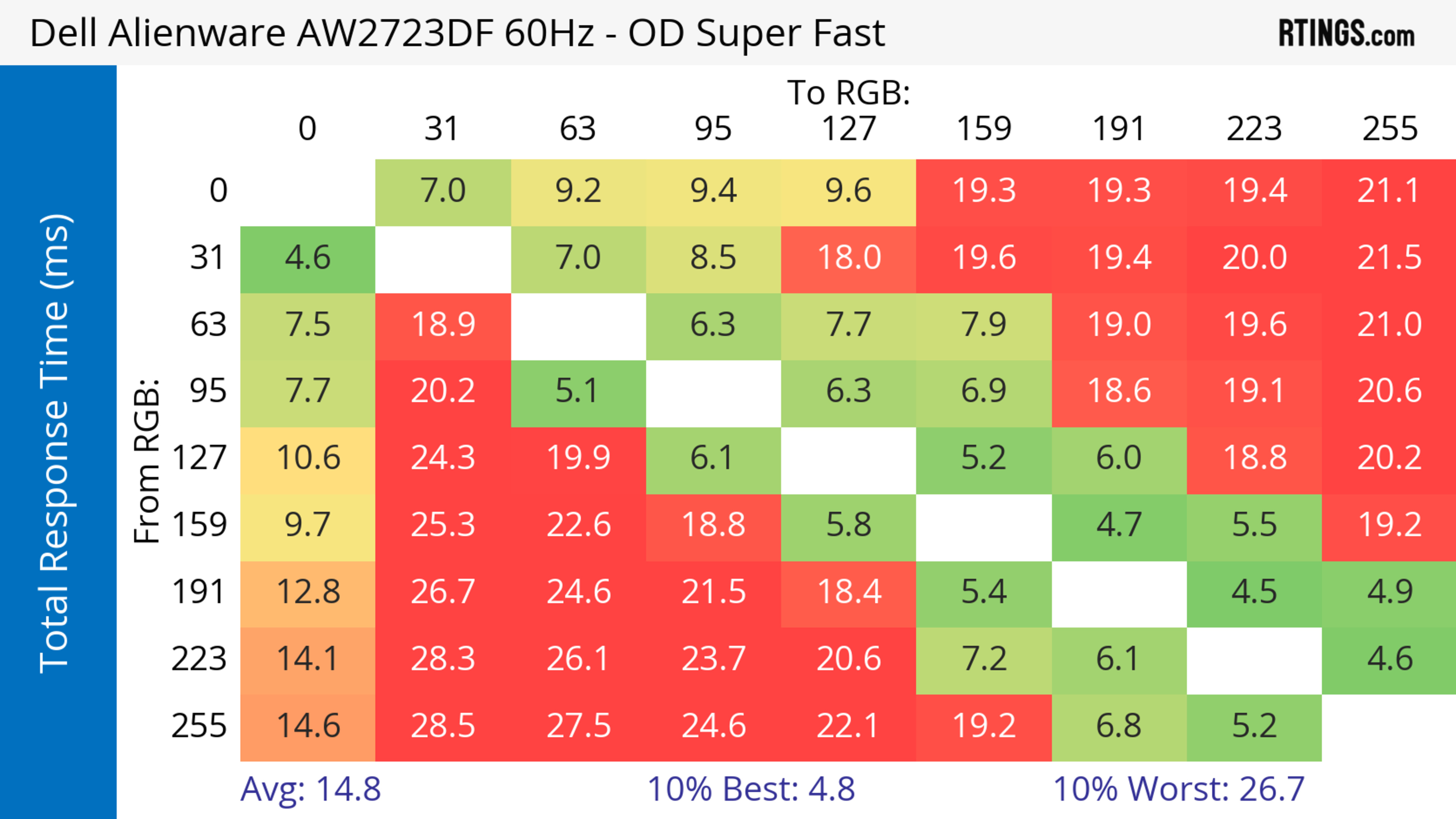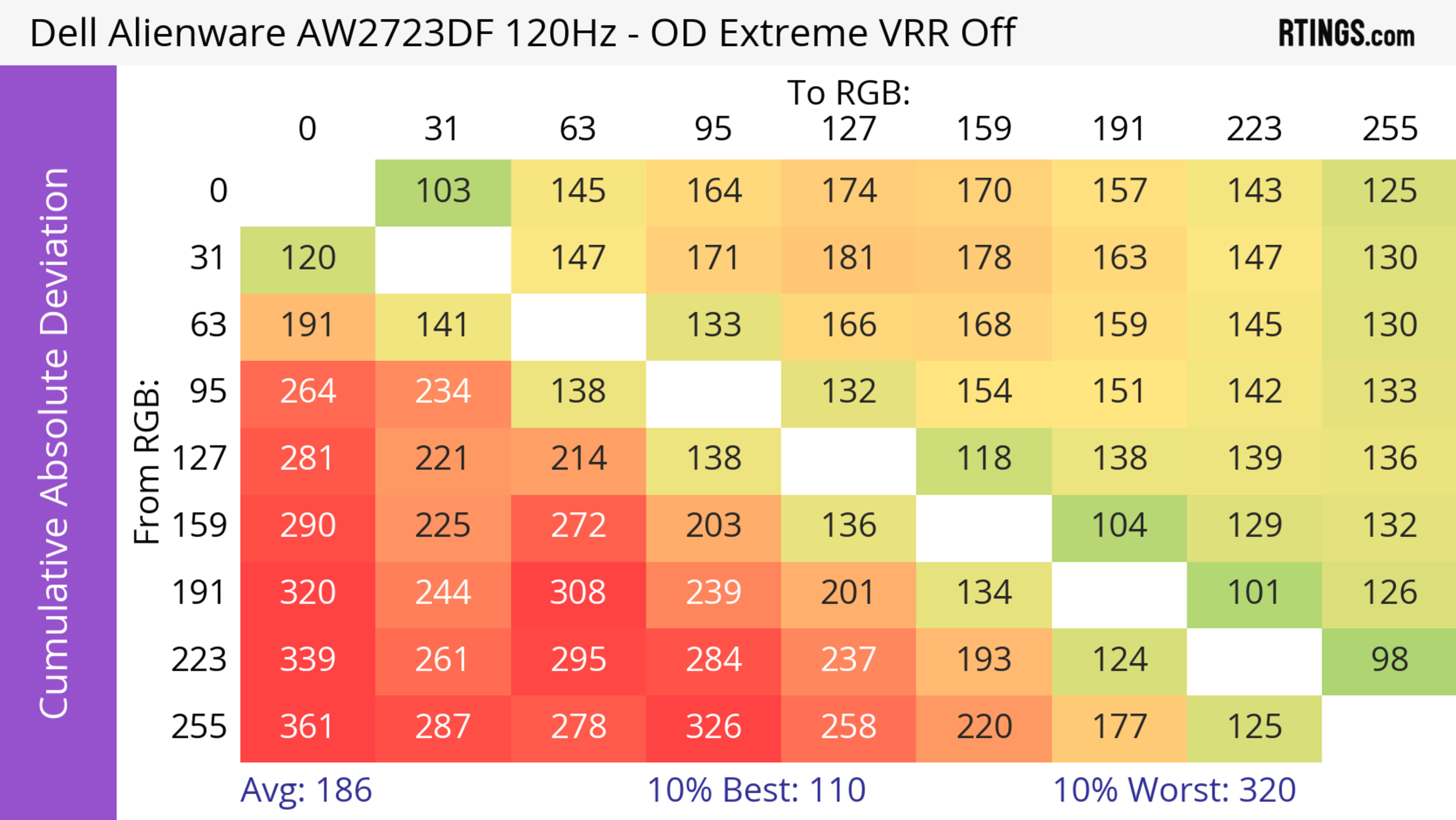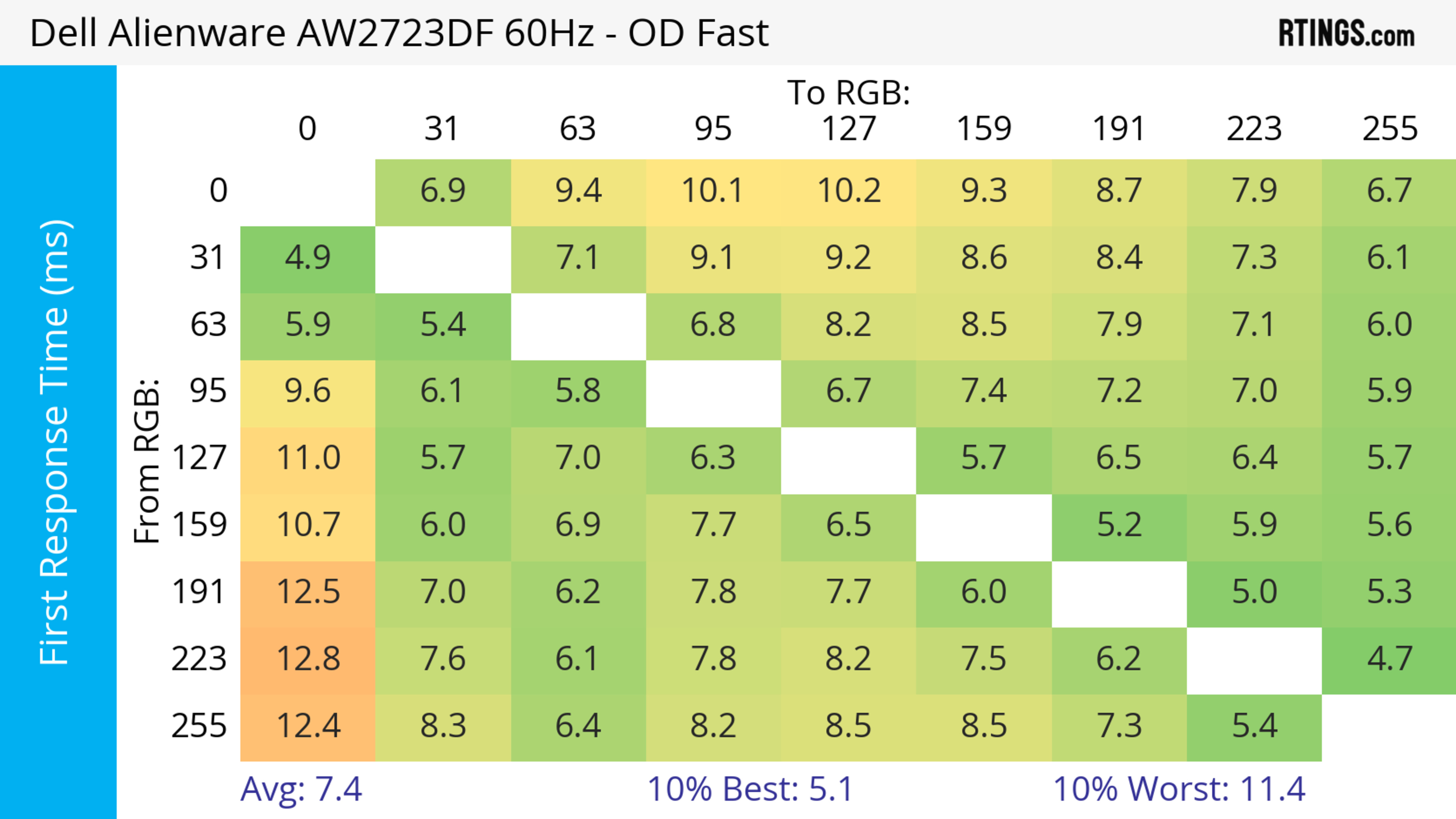 The Dell AW2723DF has a decent response time. It's consistently fast across its VRR range, but fast-moving objects still have motion blur.