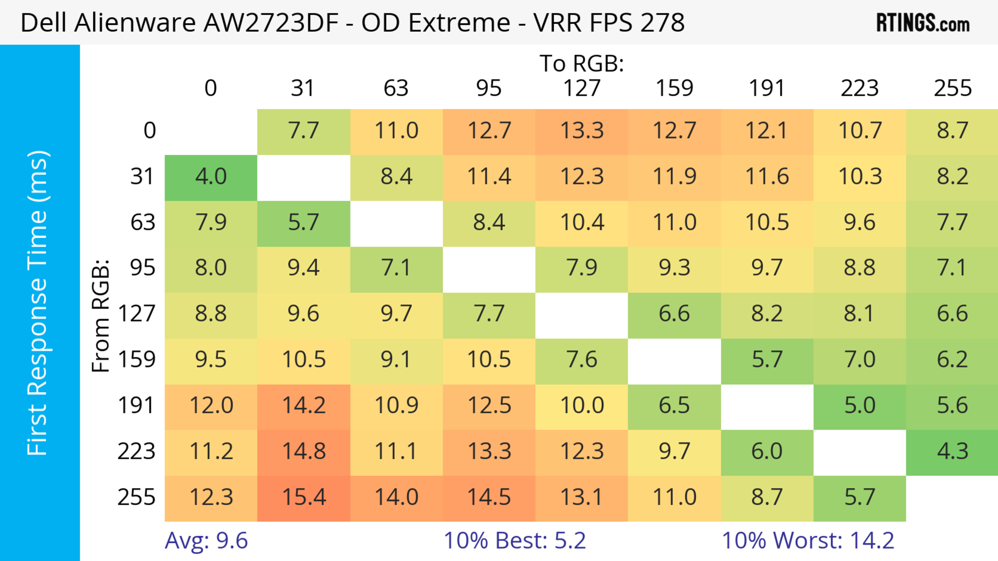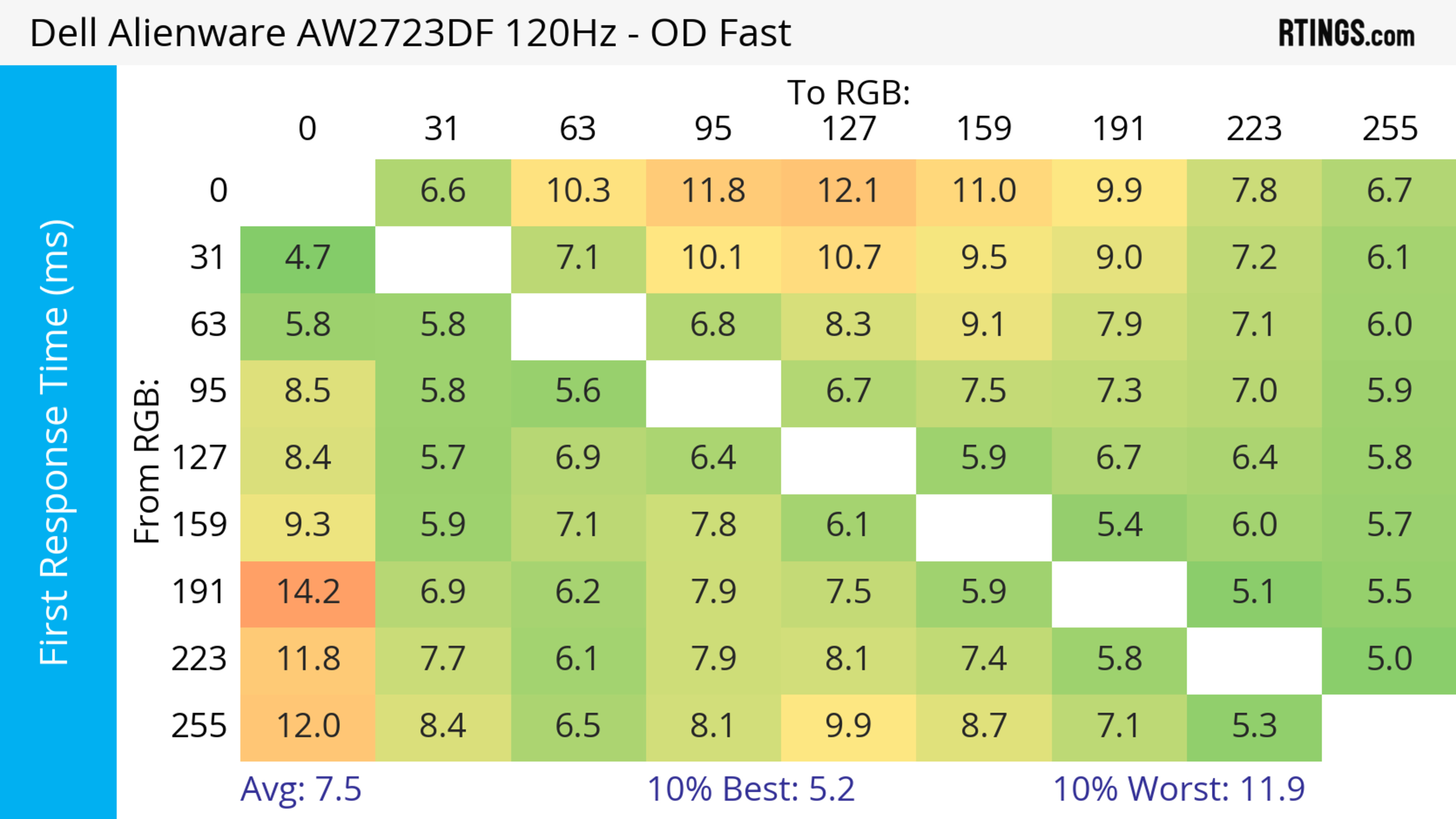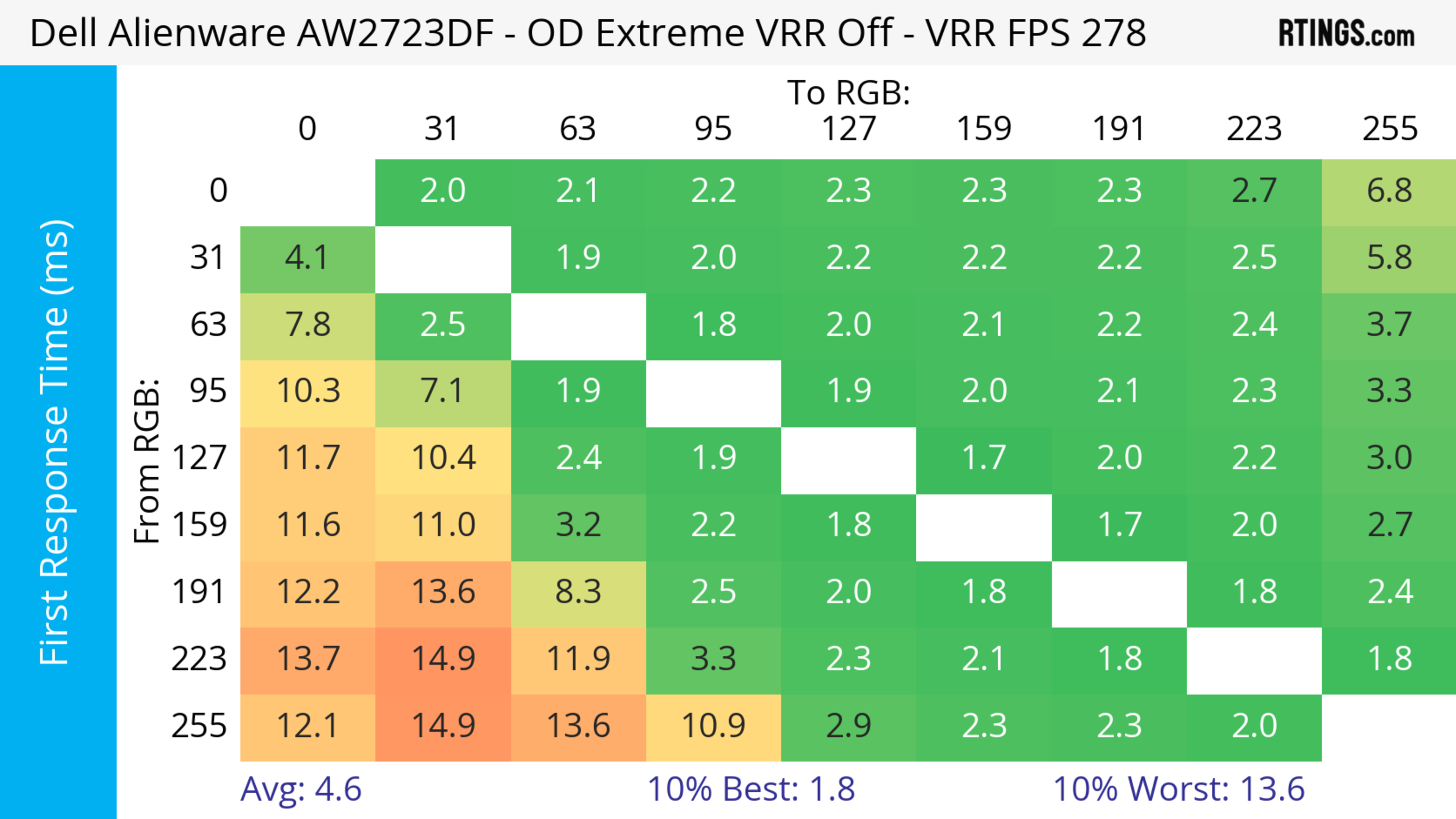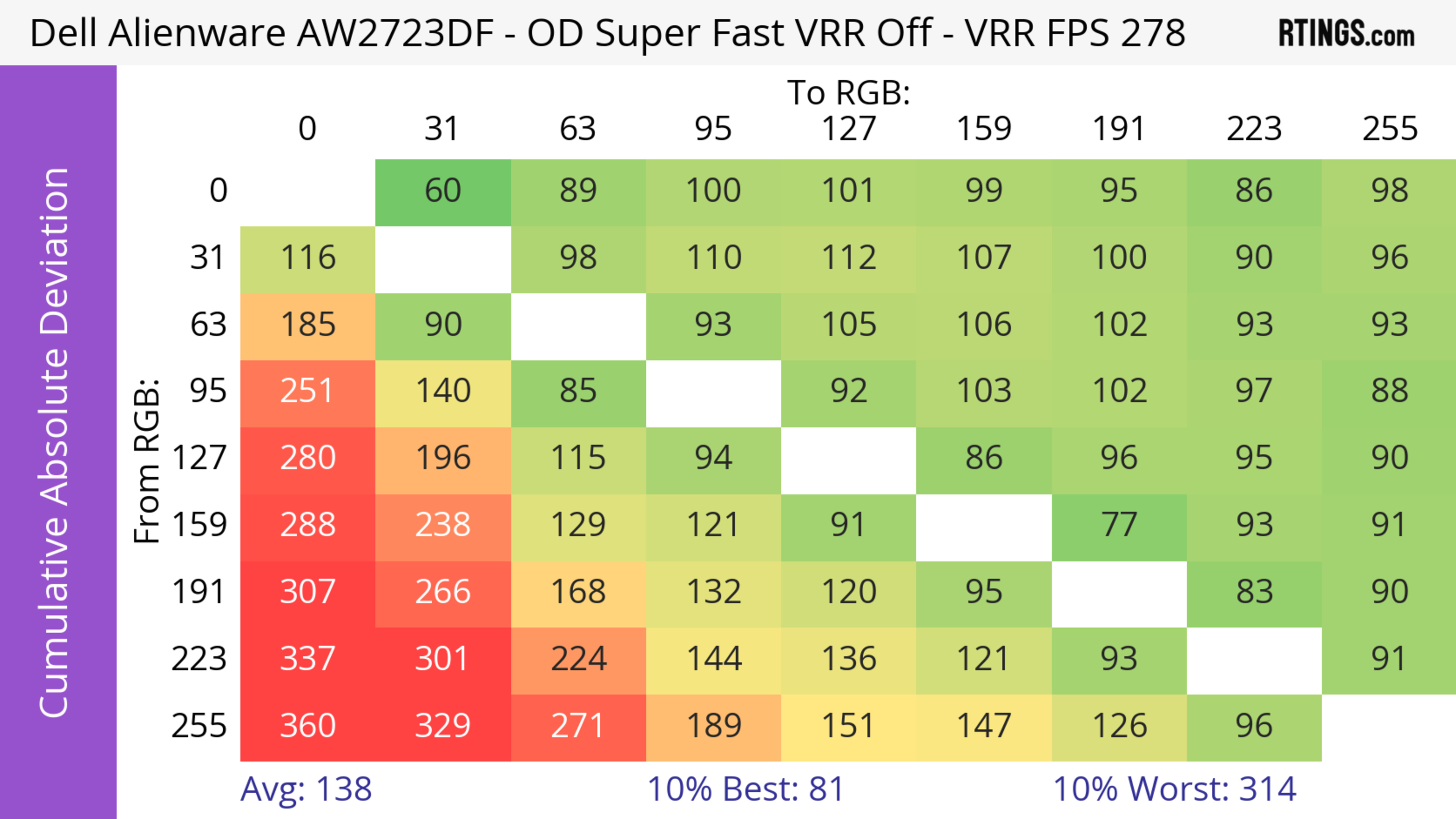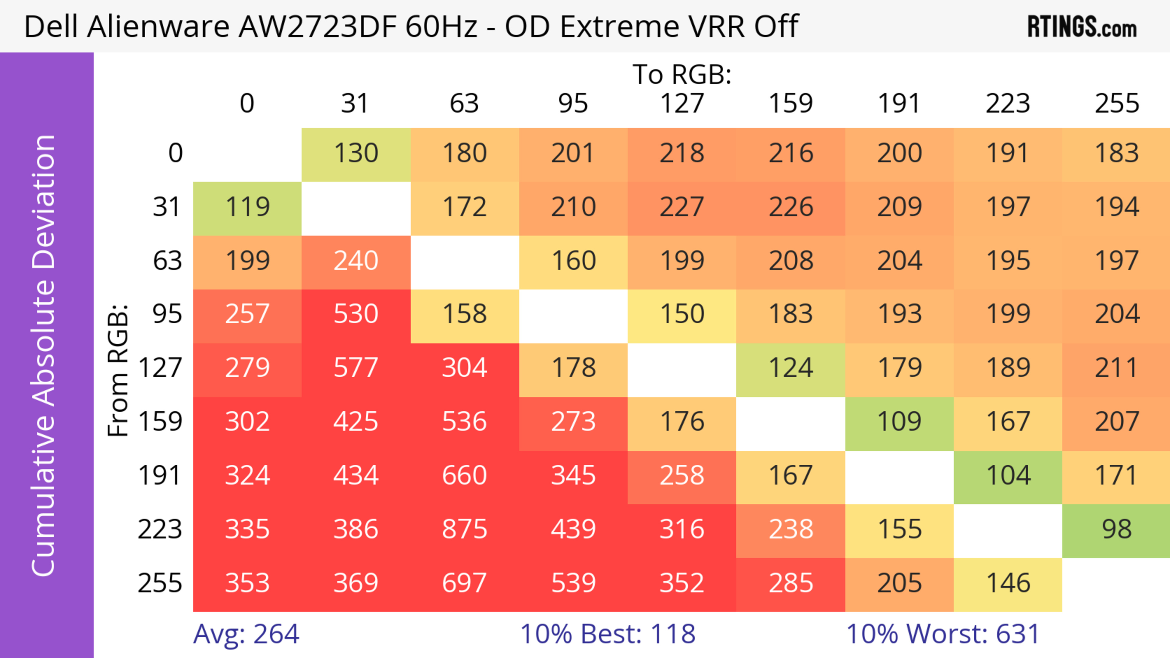 The Dell AW2723DF has a decent response time. It's consistently fast across its VRR range, but fast-moving objects still have motion blur.