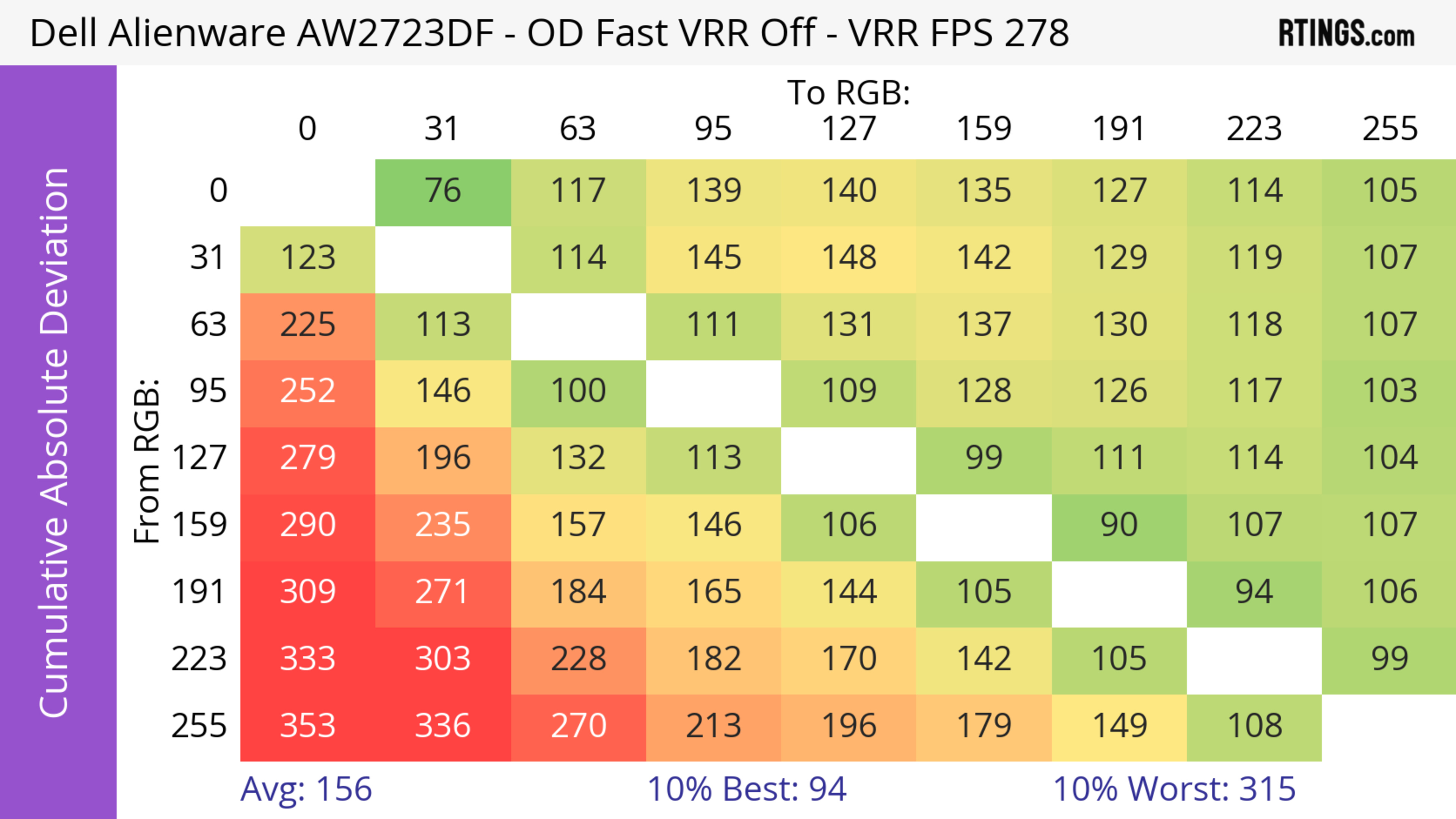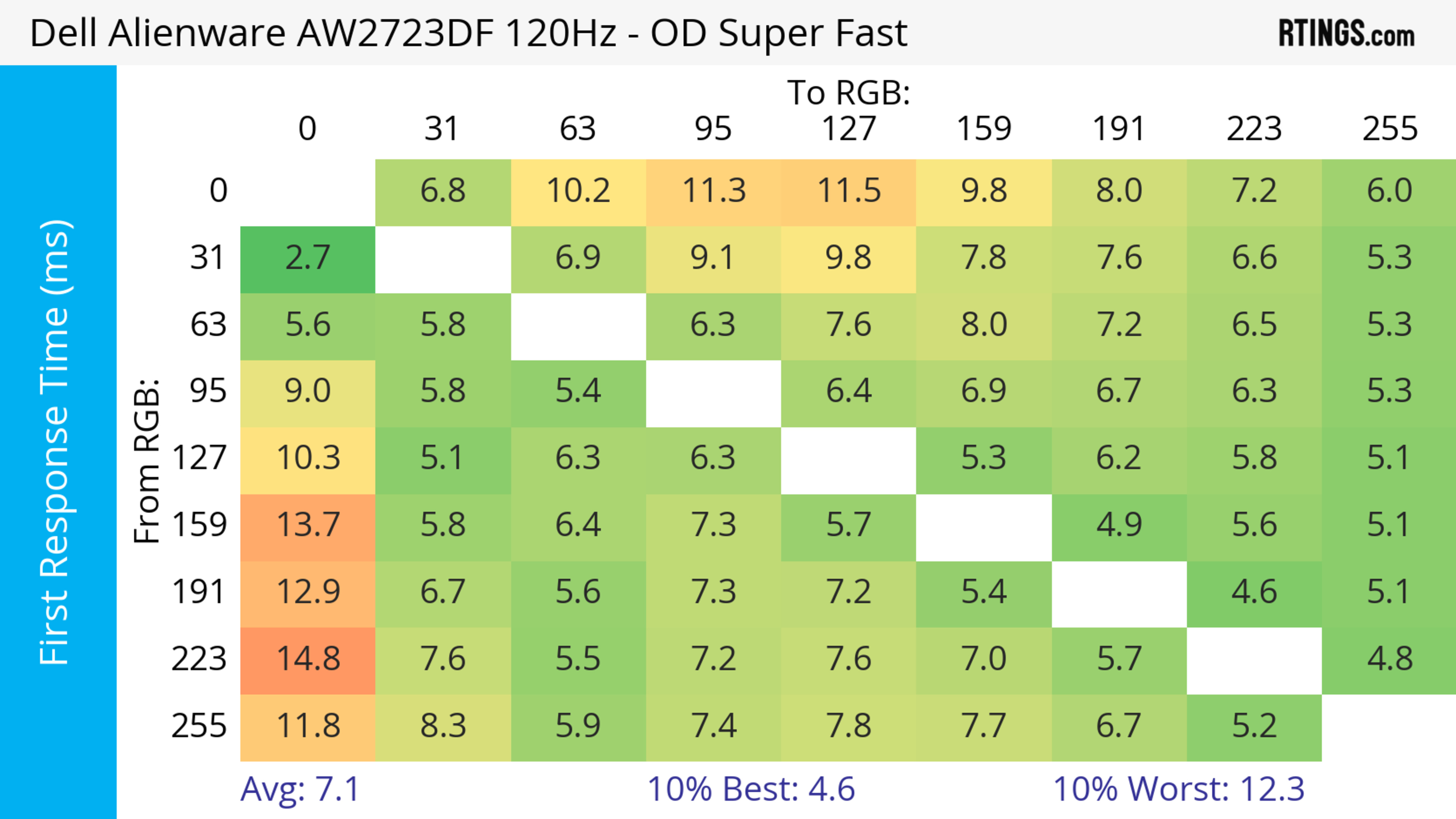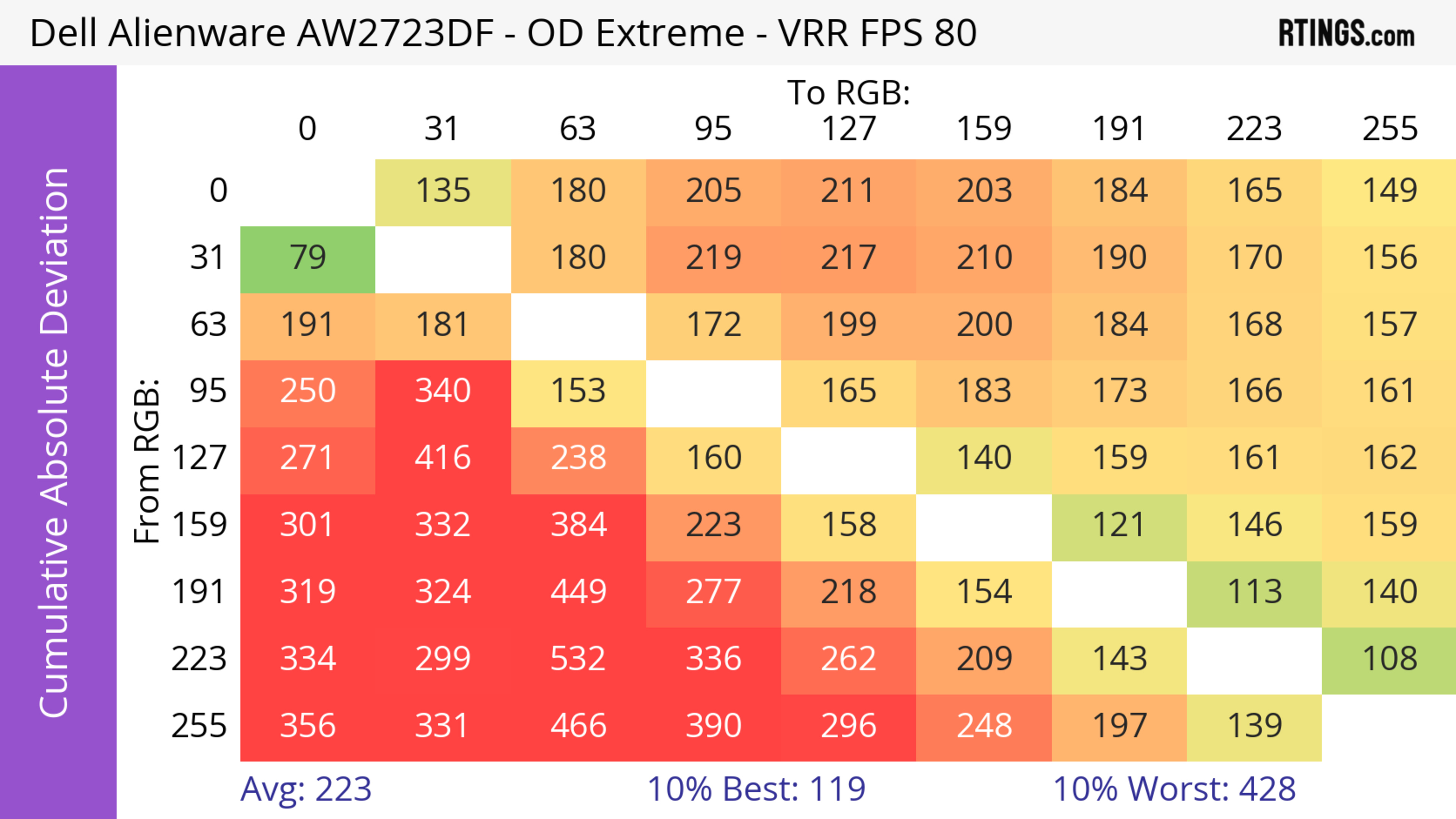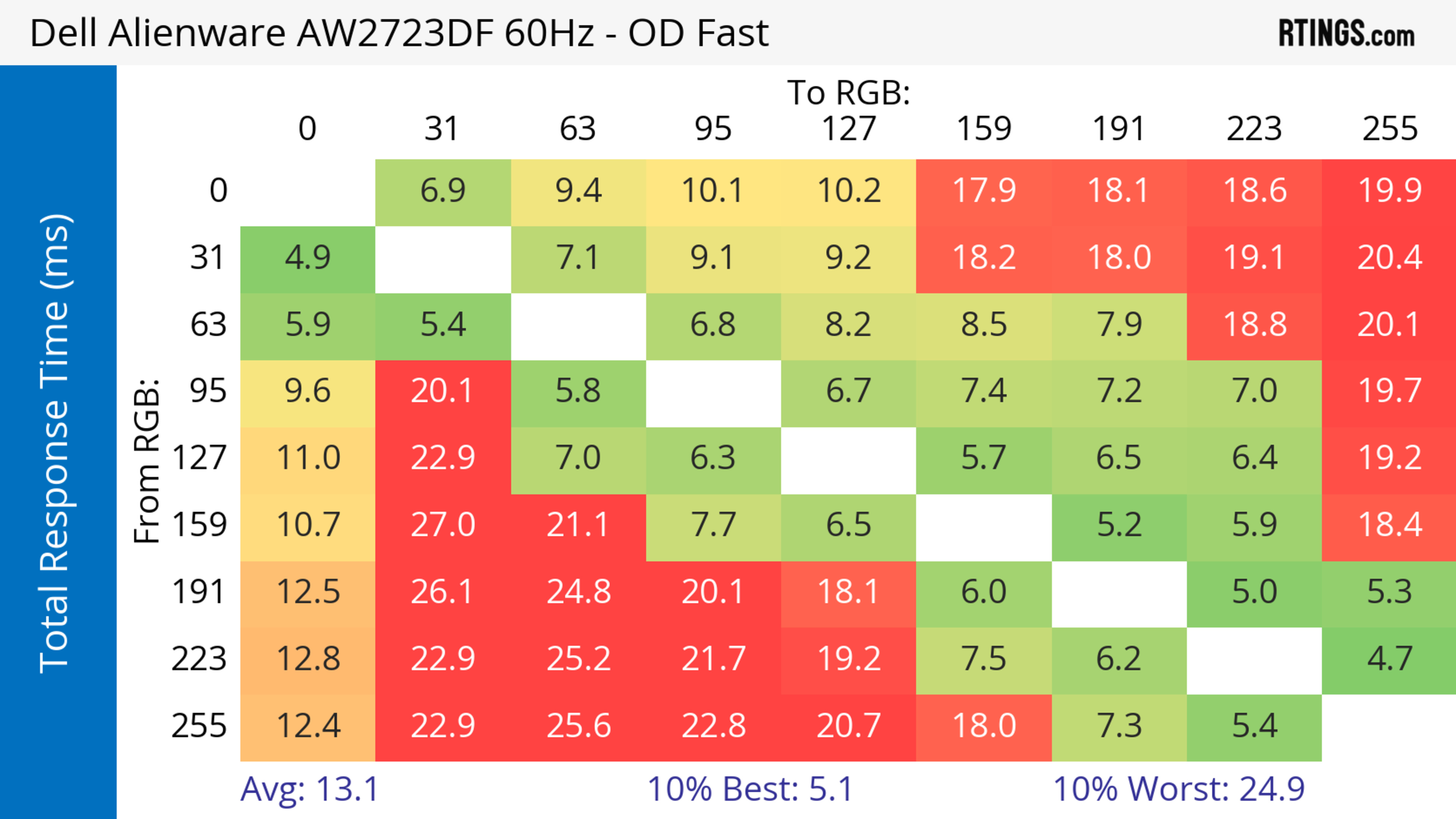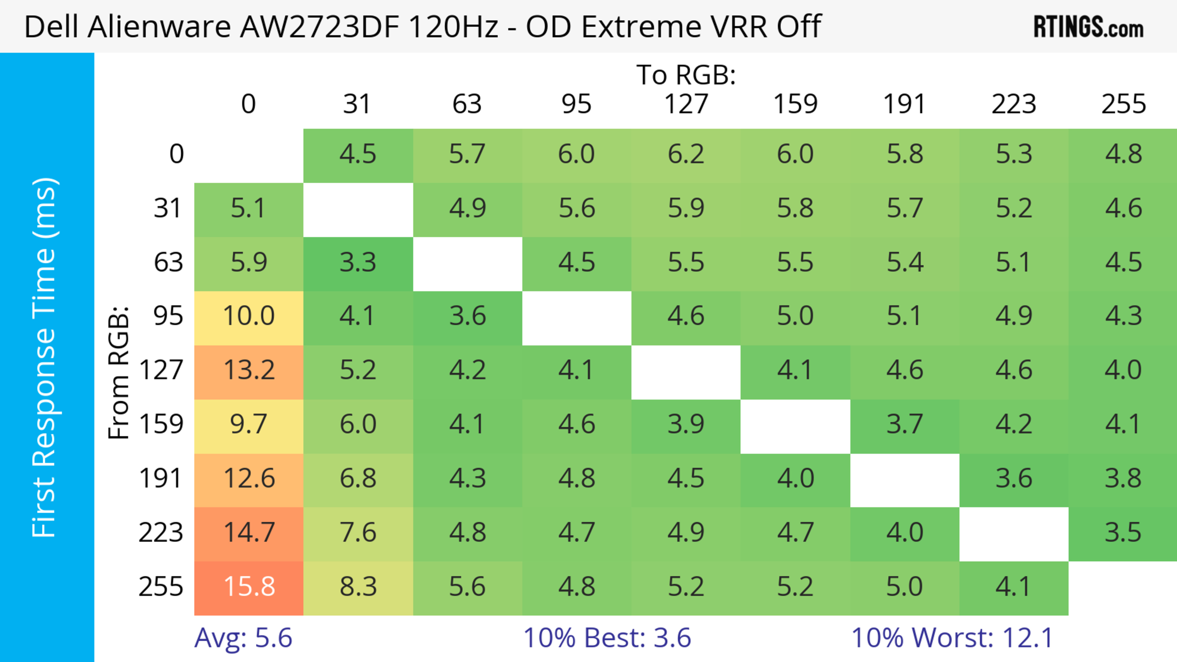 The Dell AW2723DF has a decent response time. It's consistently fast across its VRR range, but fast-moving objects still have motion blur.