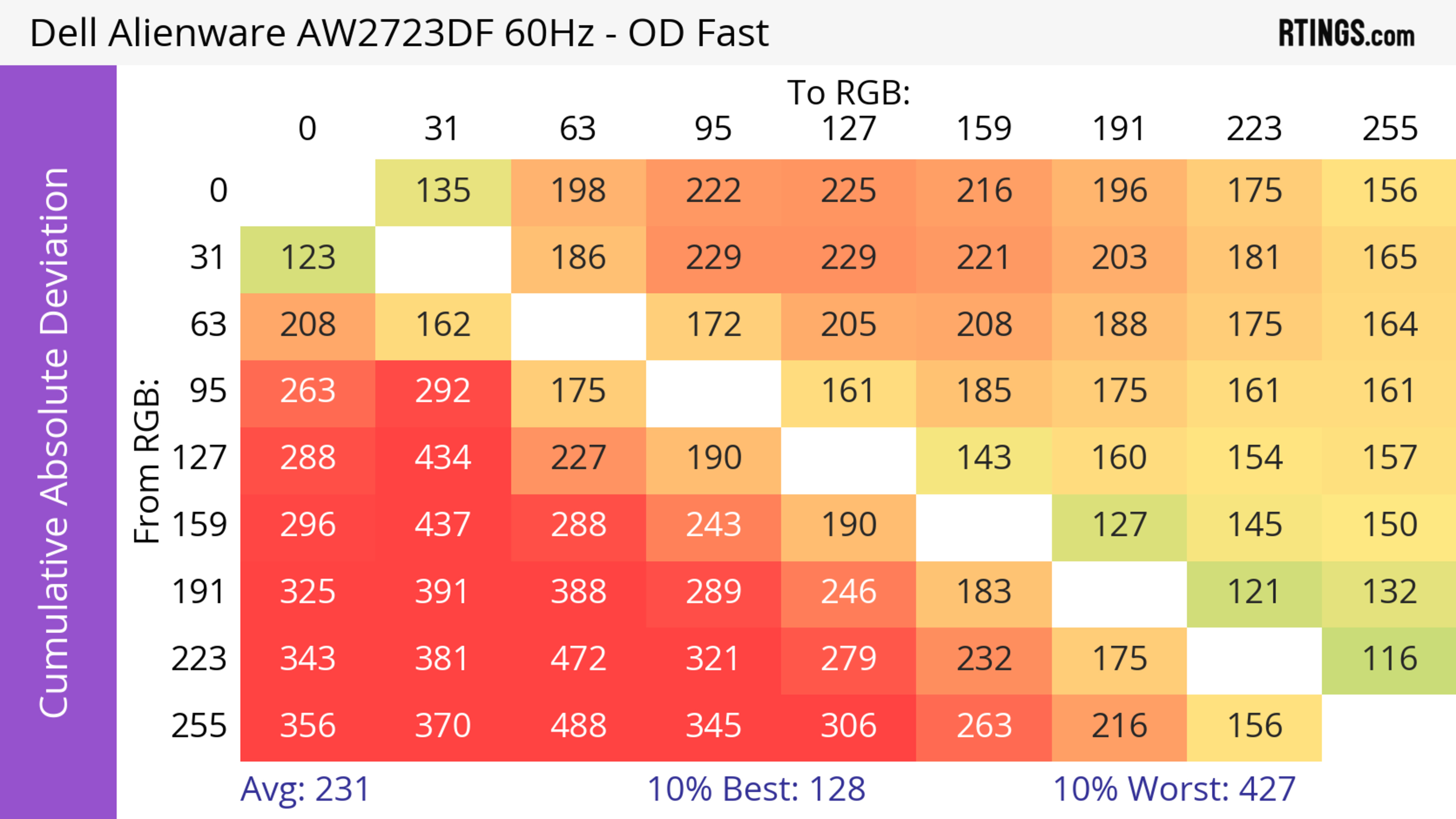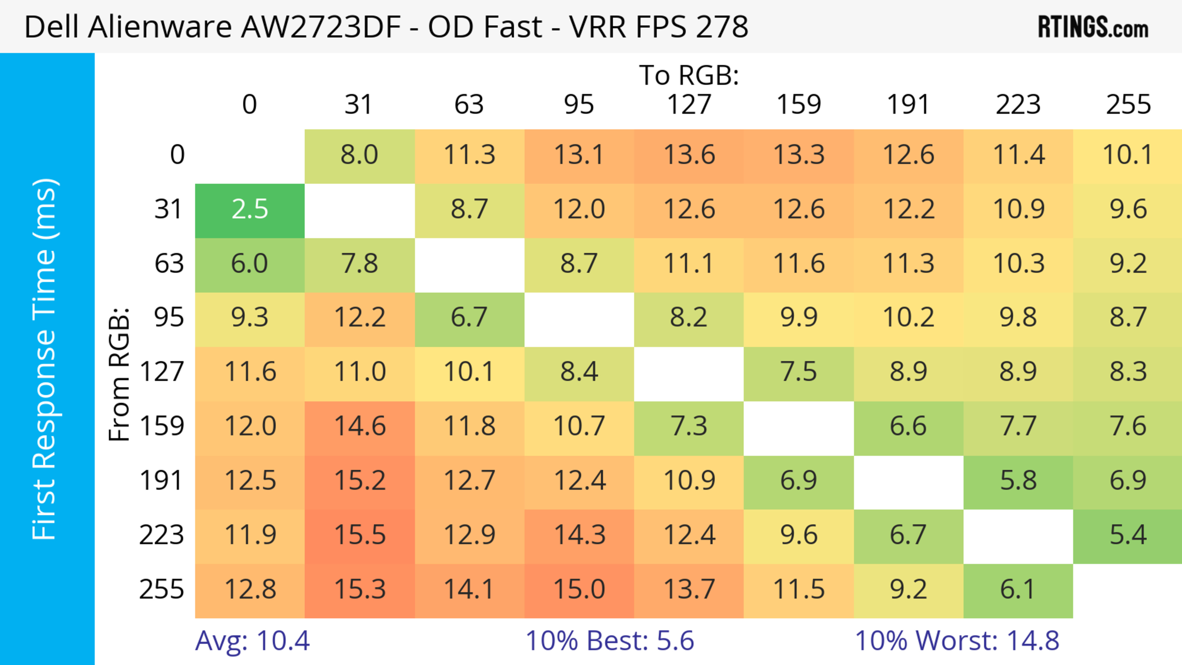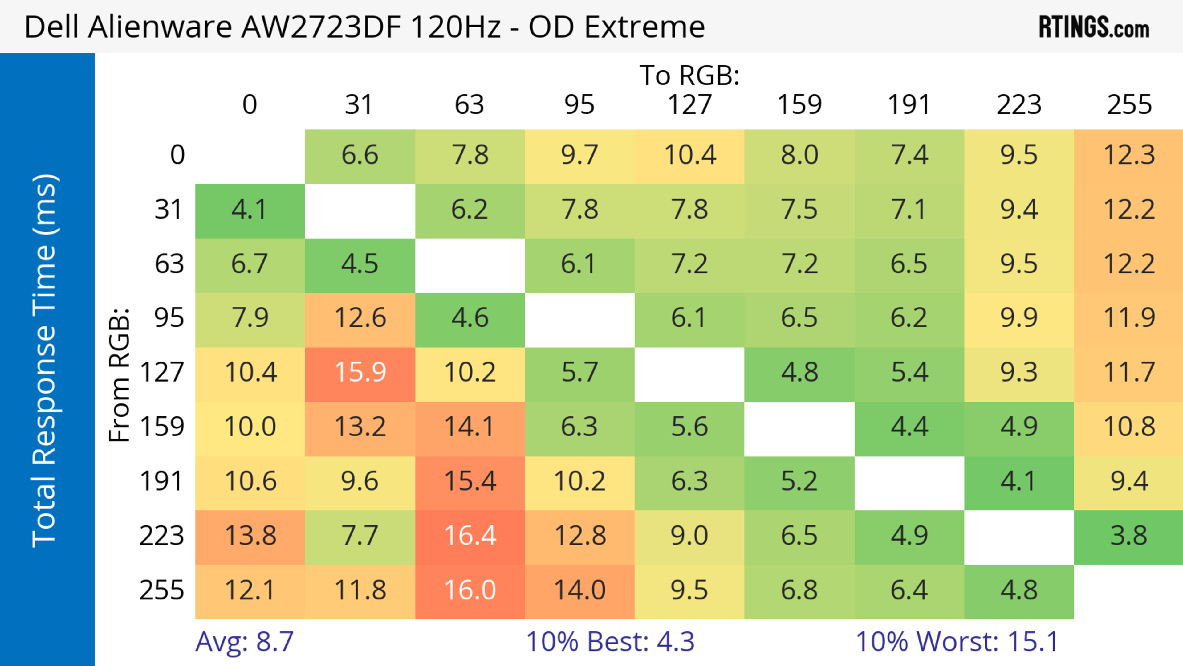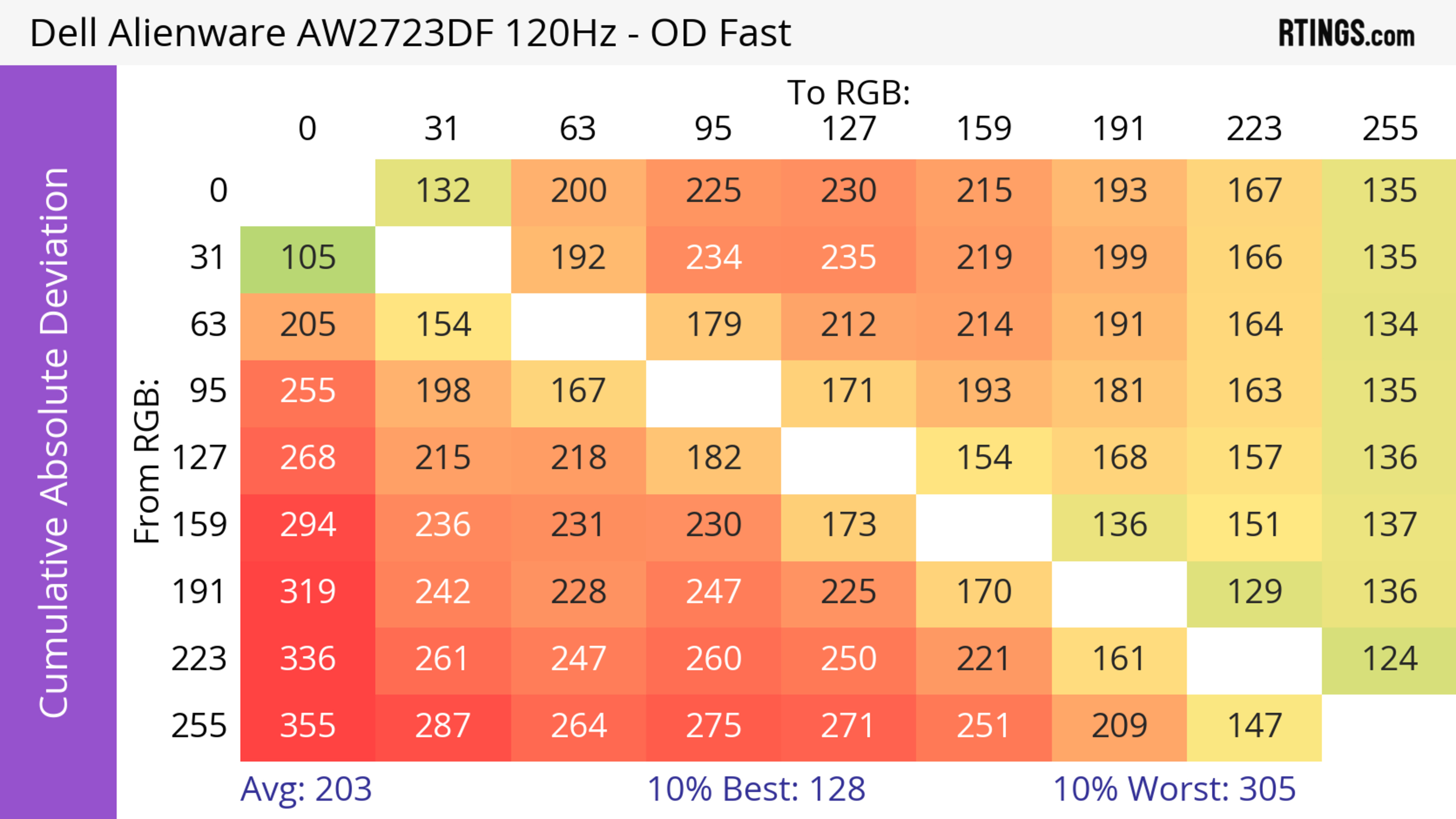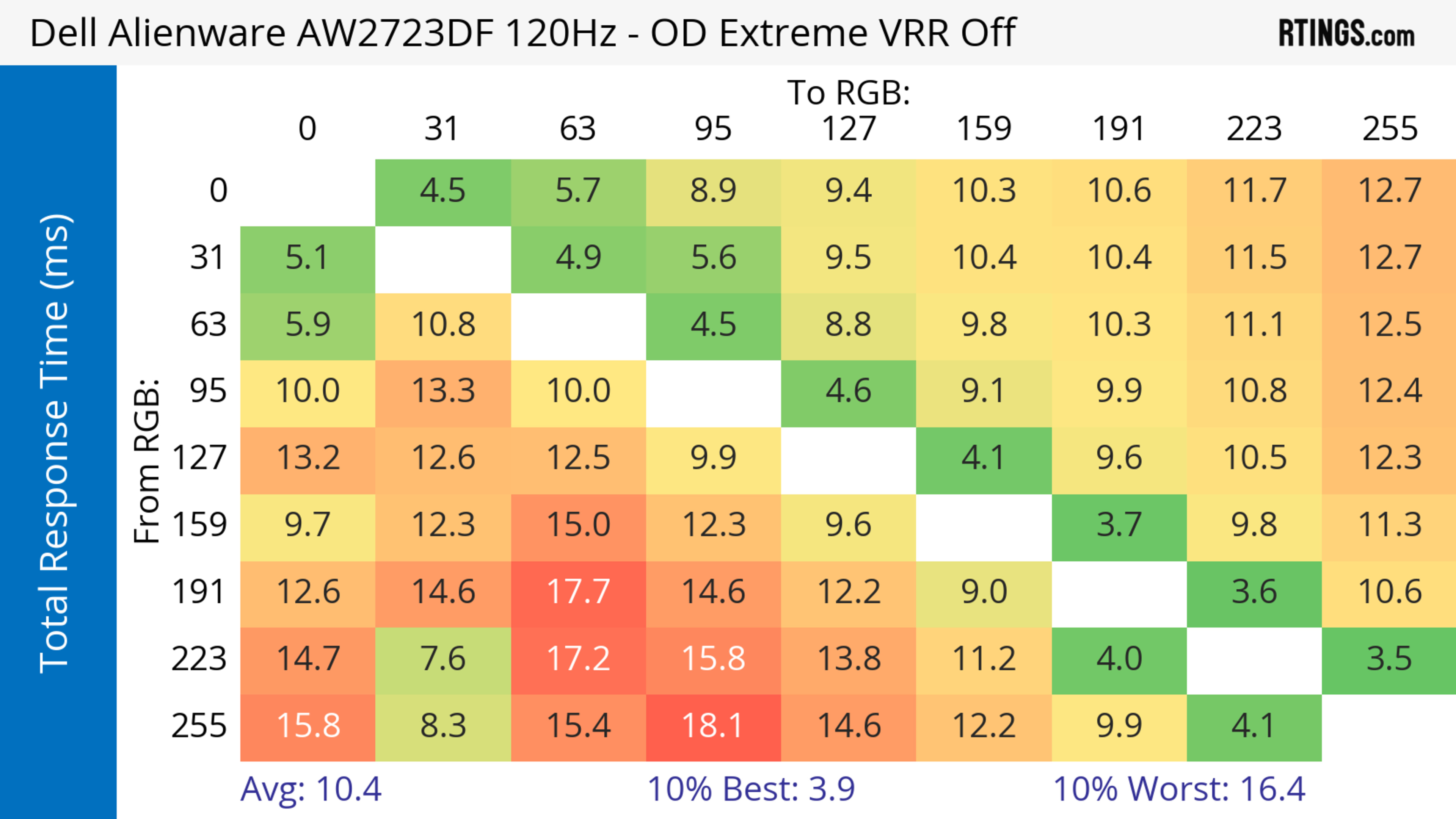 The Dell AW2723DF has a decent response time. It's consistently fast across its VRR range, but fast-moving objects still have motion blur.