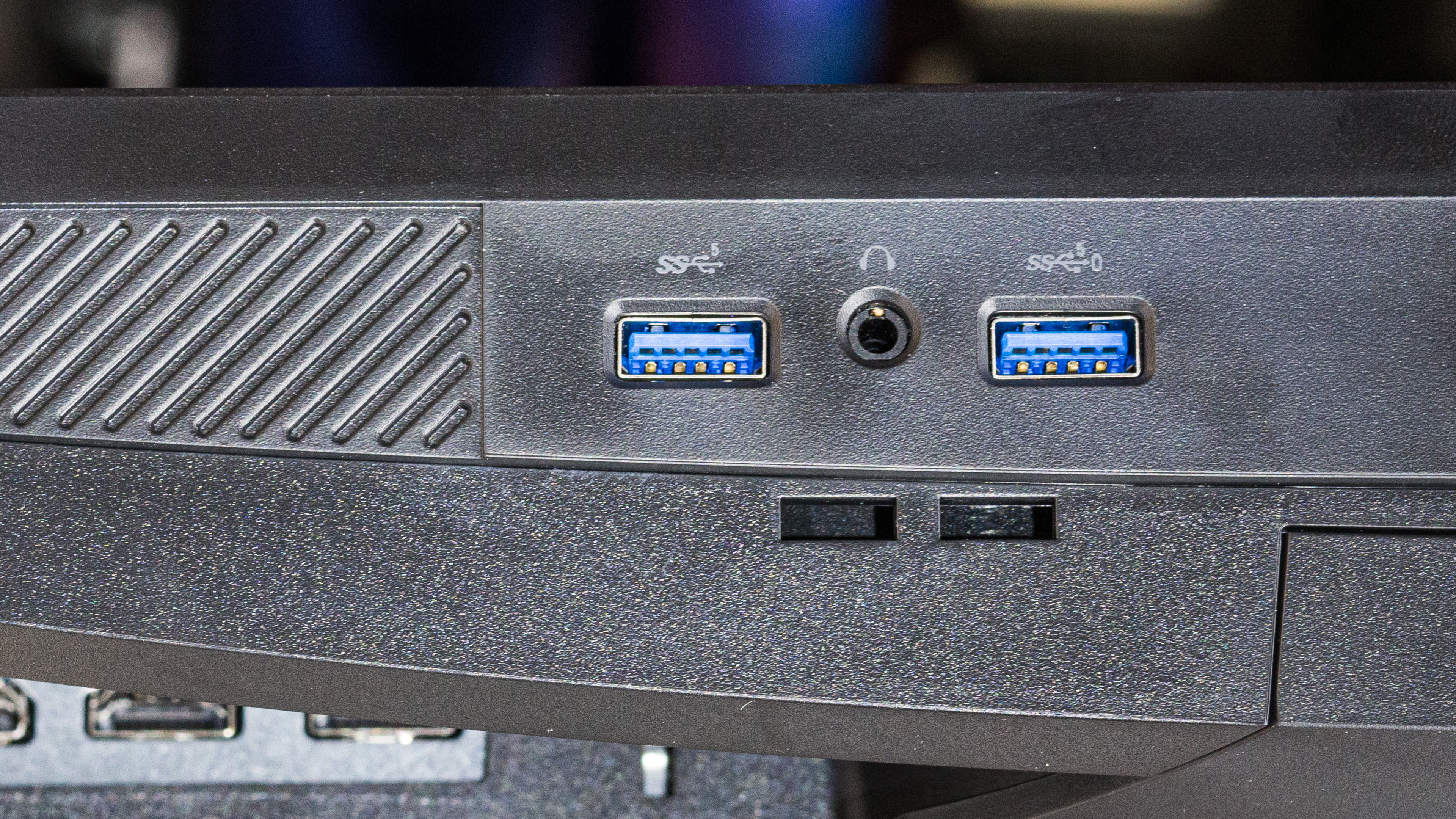 There's a joystick underneath the center branding to control the on-screen display, and there's a power button on the right side.