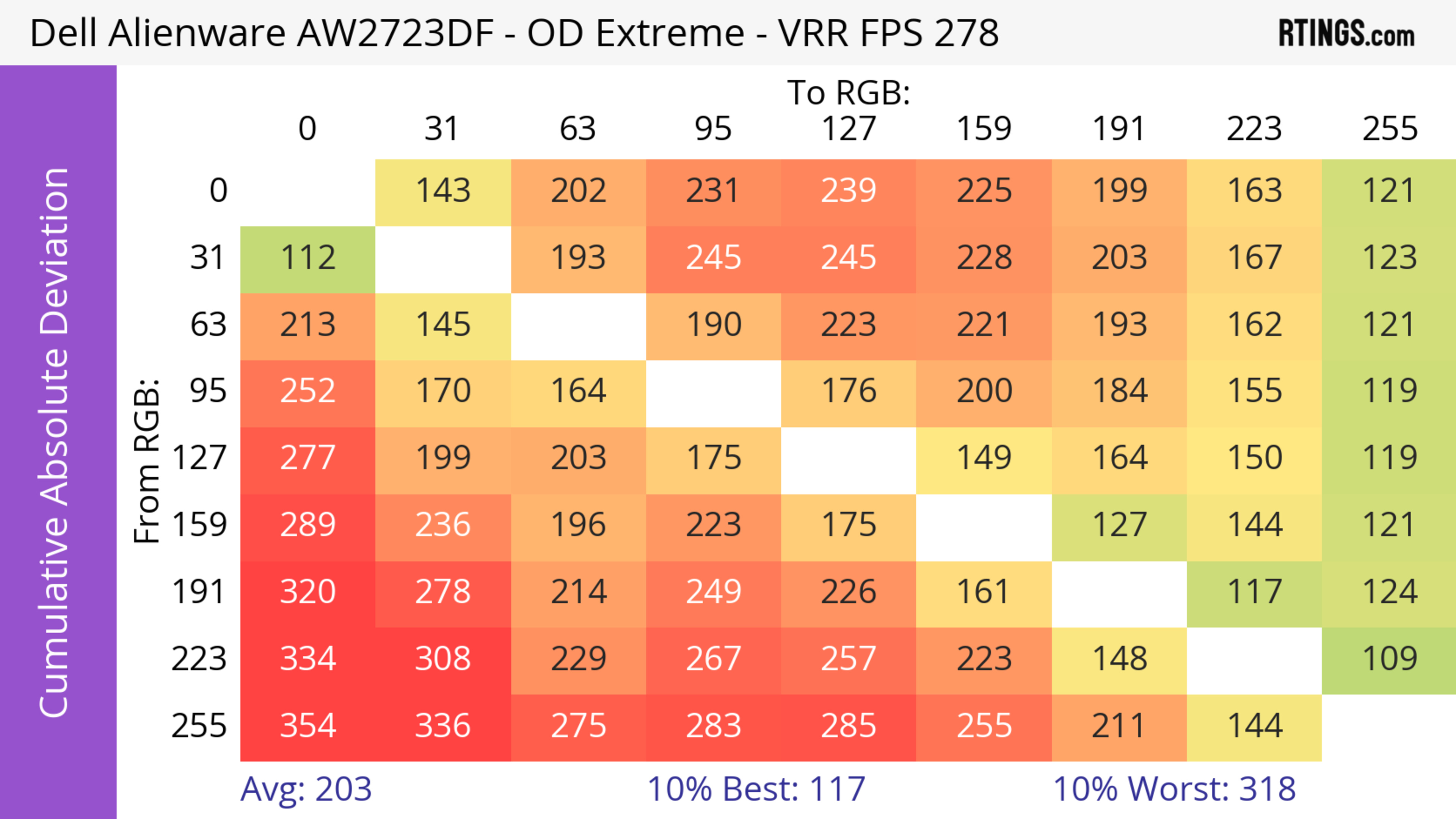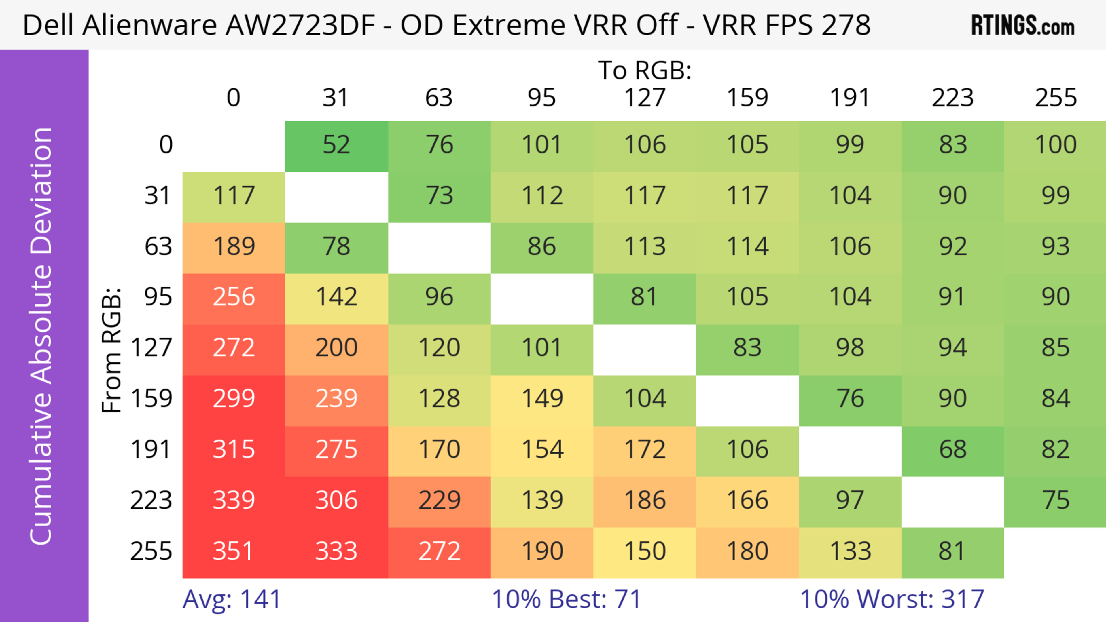 The CAD at the max refresh rate of 280Hz is good. Motion looks sharp without much blur. That said, the overdrive settings perform differently if you enable VRR, as it looks much better if you disable VRR altogether. All three overdrive settings perform similarly with VRR enabled, but the 'Extreme' setting has the lowest CAD and best motion handling.