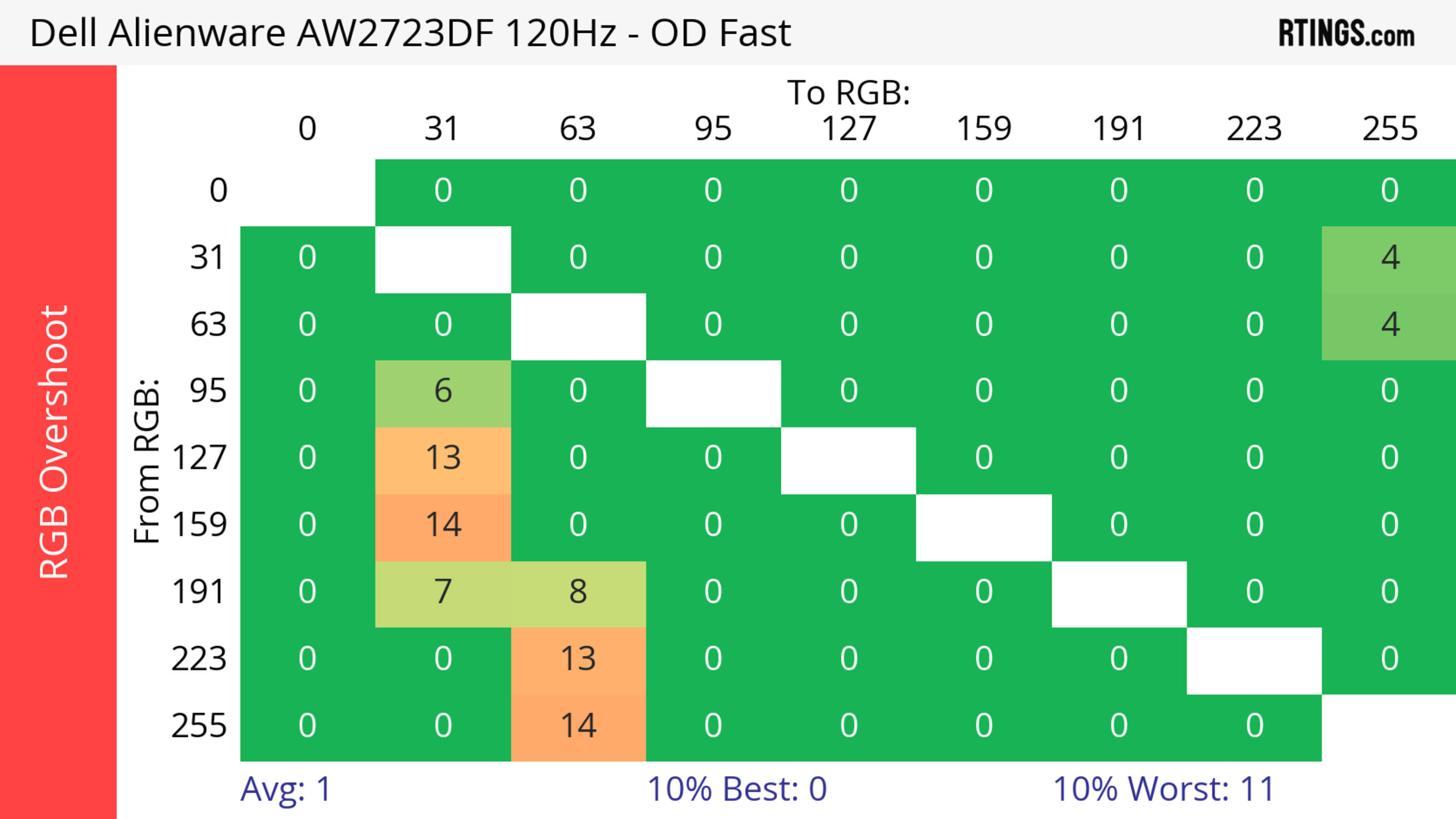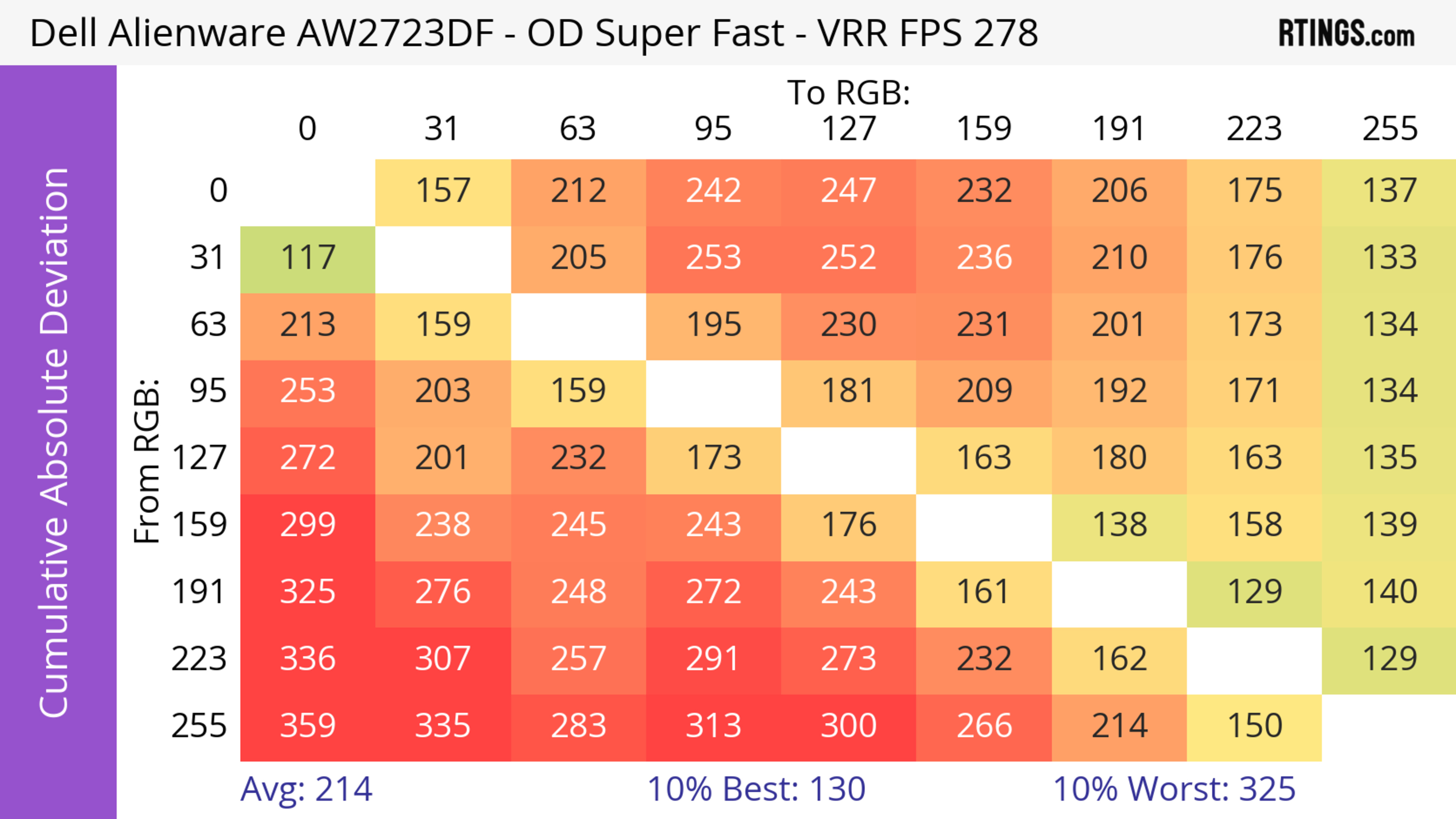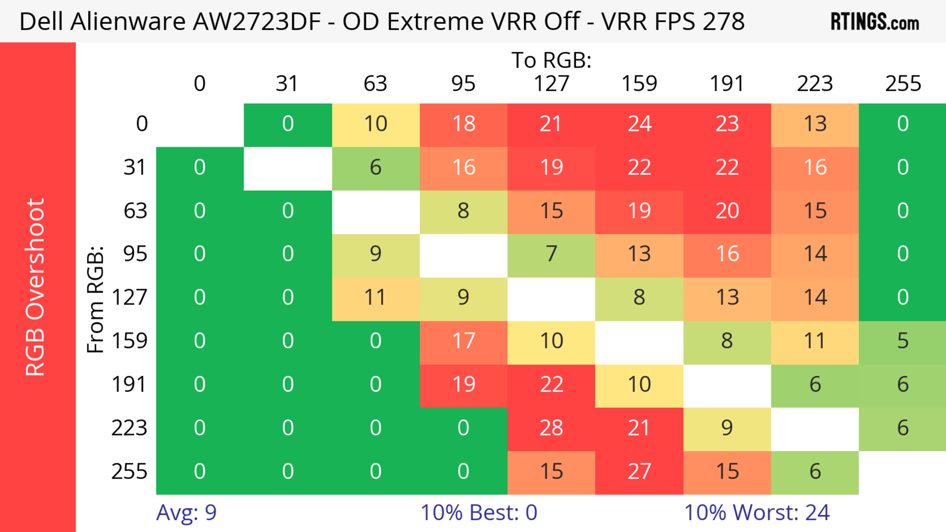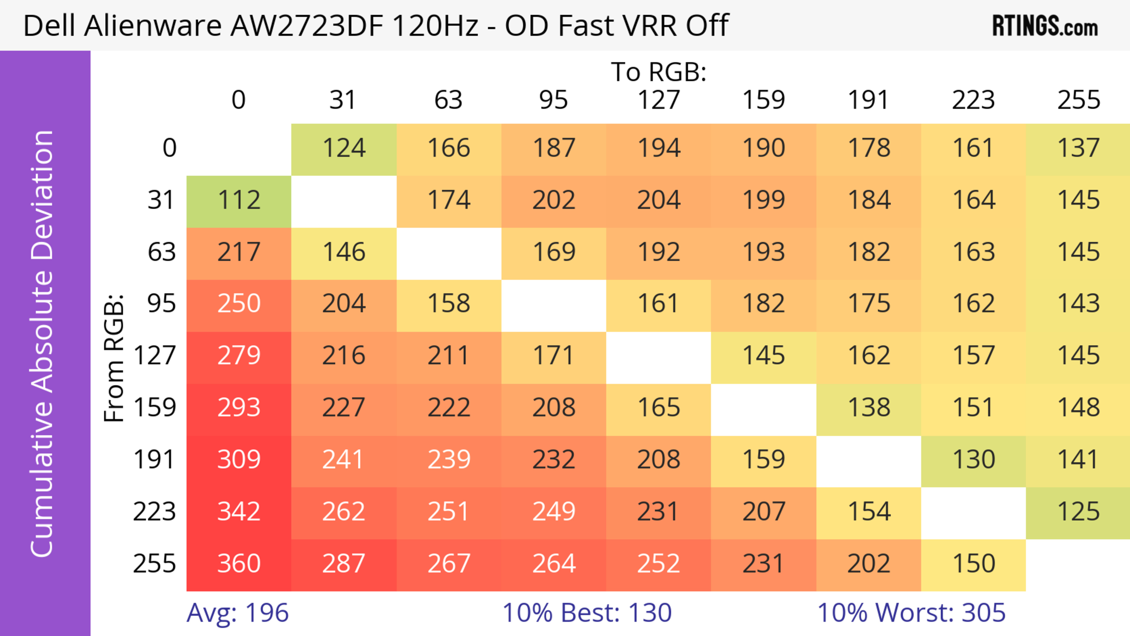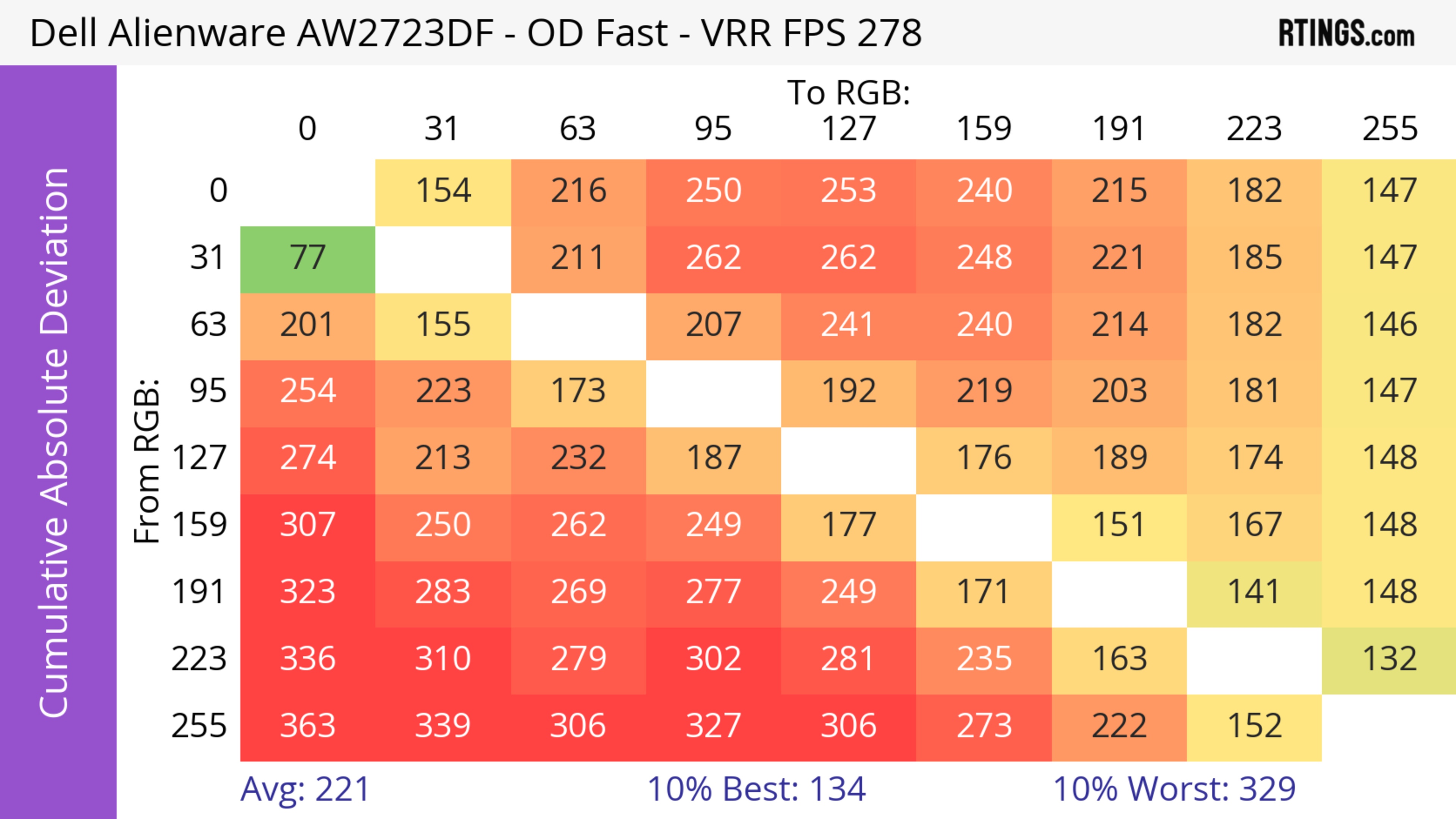 The Dell AW2723DF has a mediocre contrast ratio. It means that blacks look gray next to bright highlights, and it isn't ideal for dark room viewing. Although it has a local dimming feature, it doesn't do much to improve the contrast. If you would rather get a 240Hz monitor with a higher contrast ratio, then consider the Samsung Odyssey G6/G65D S32BG65D.