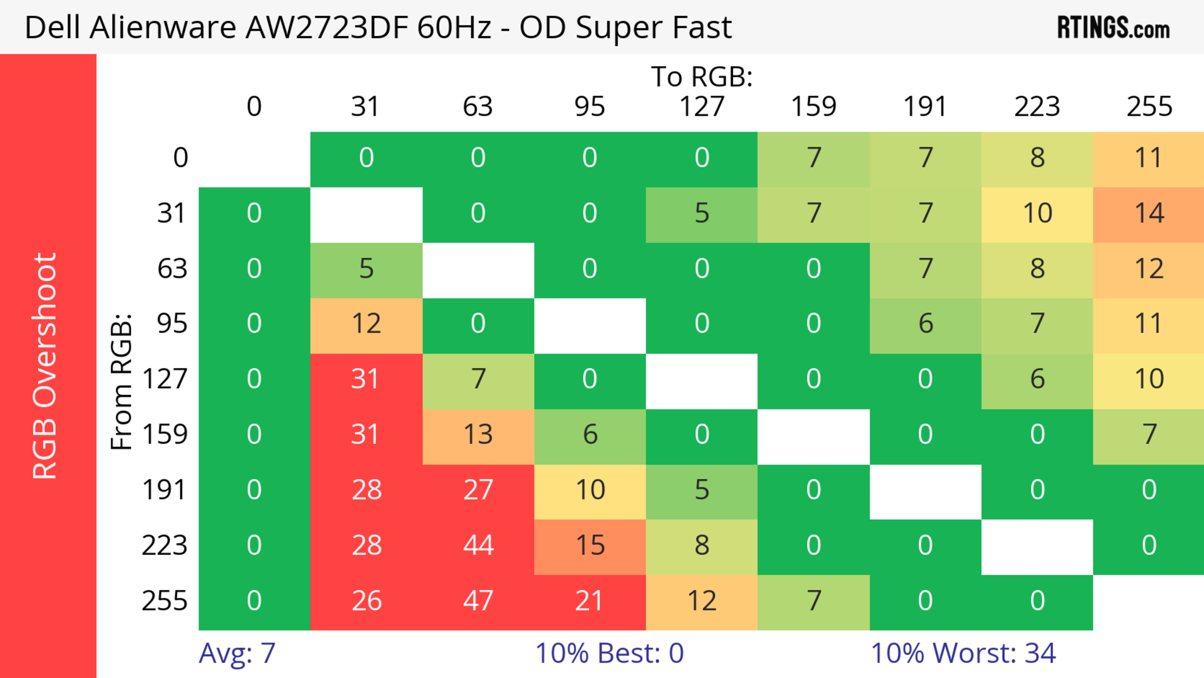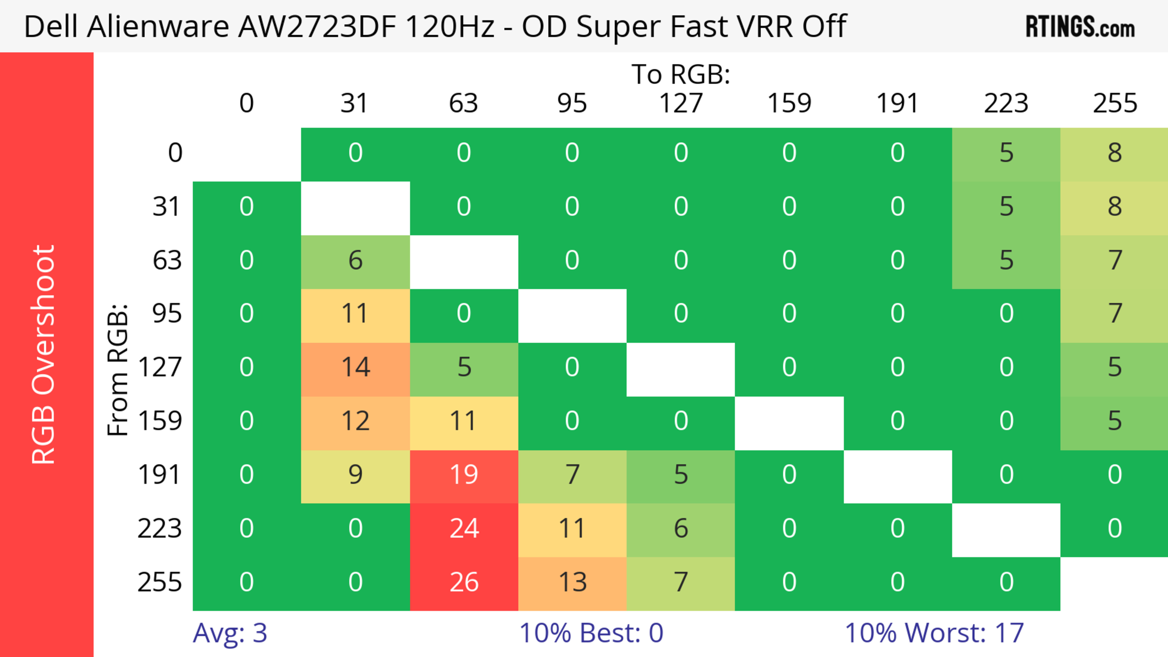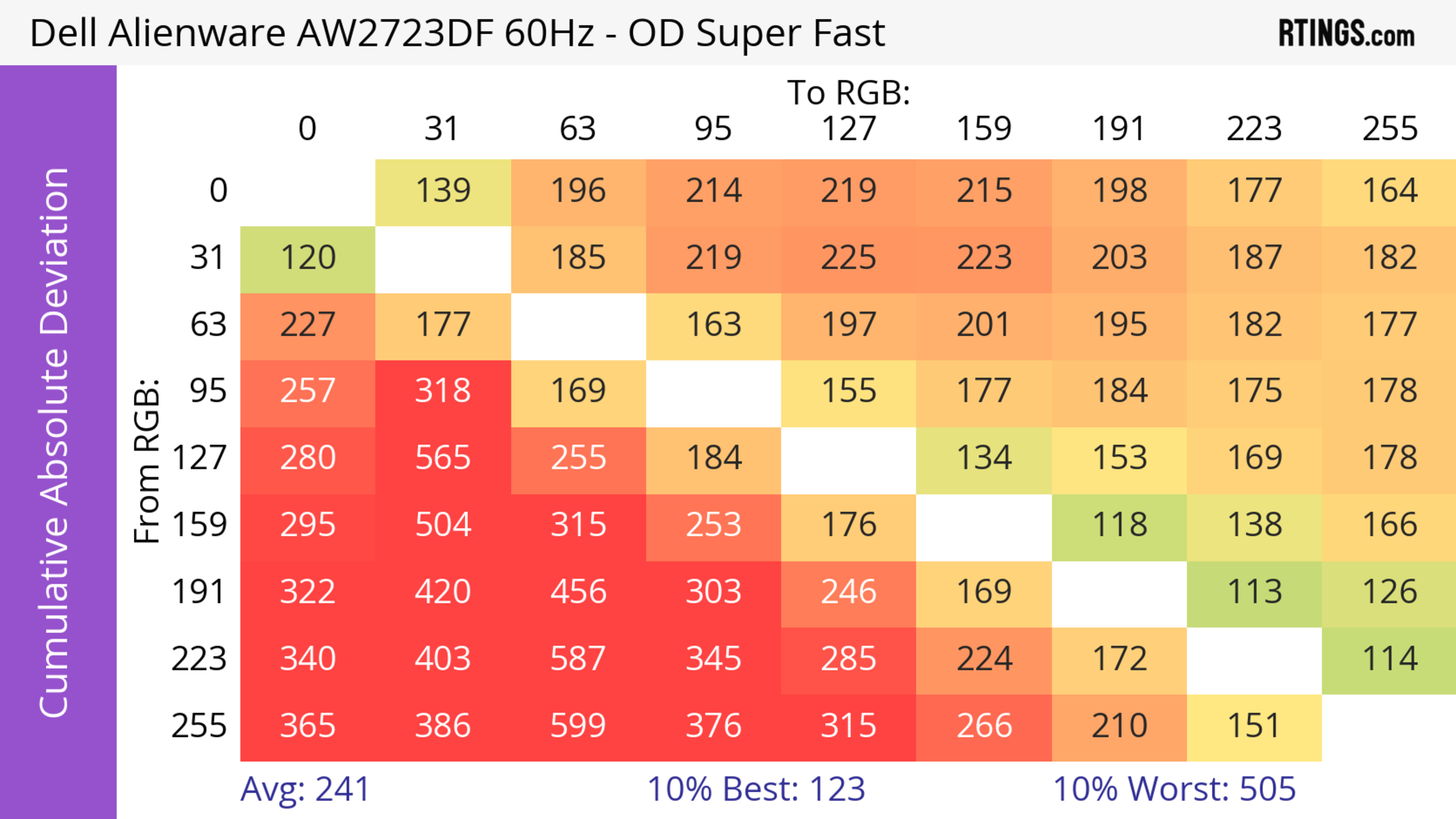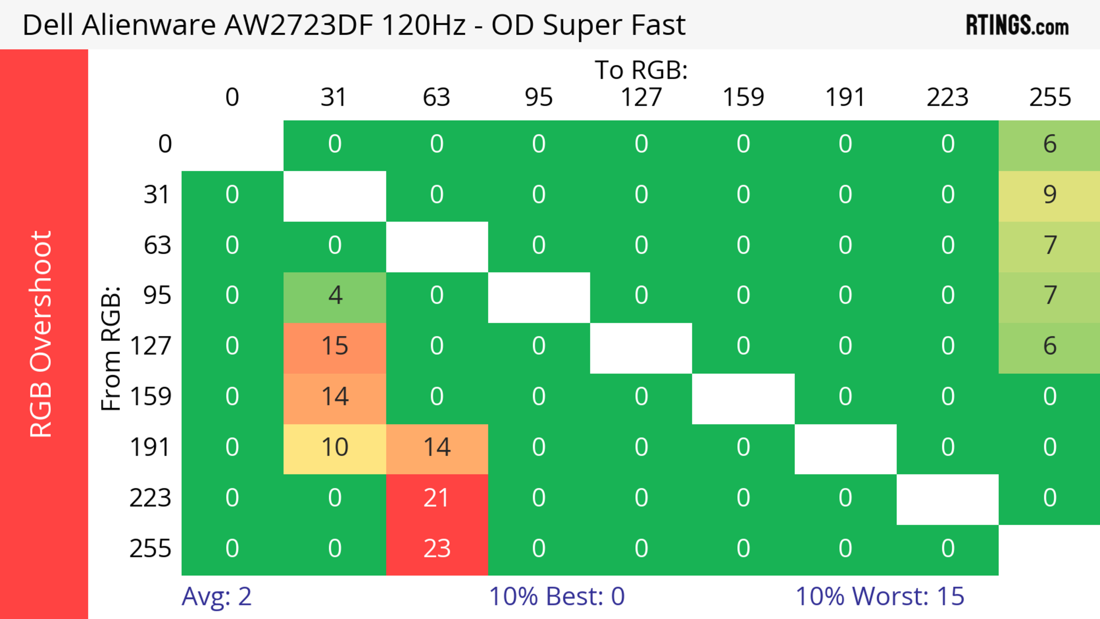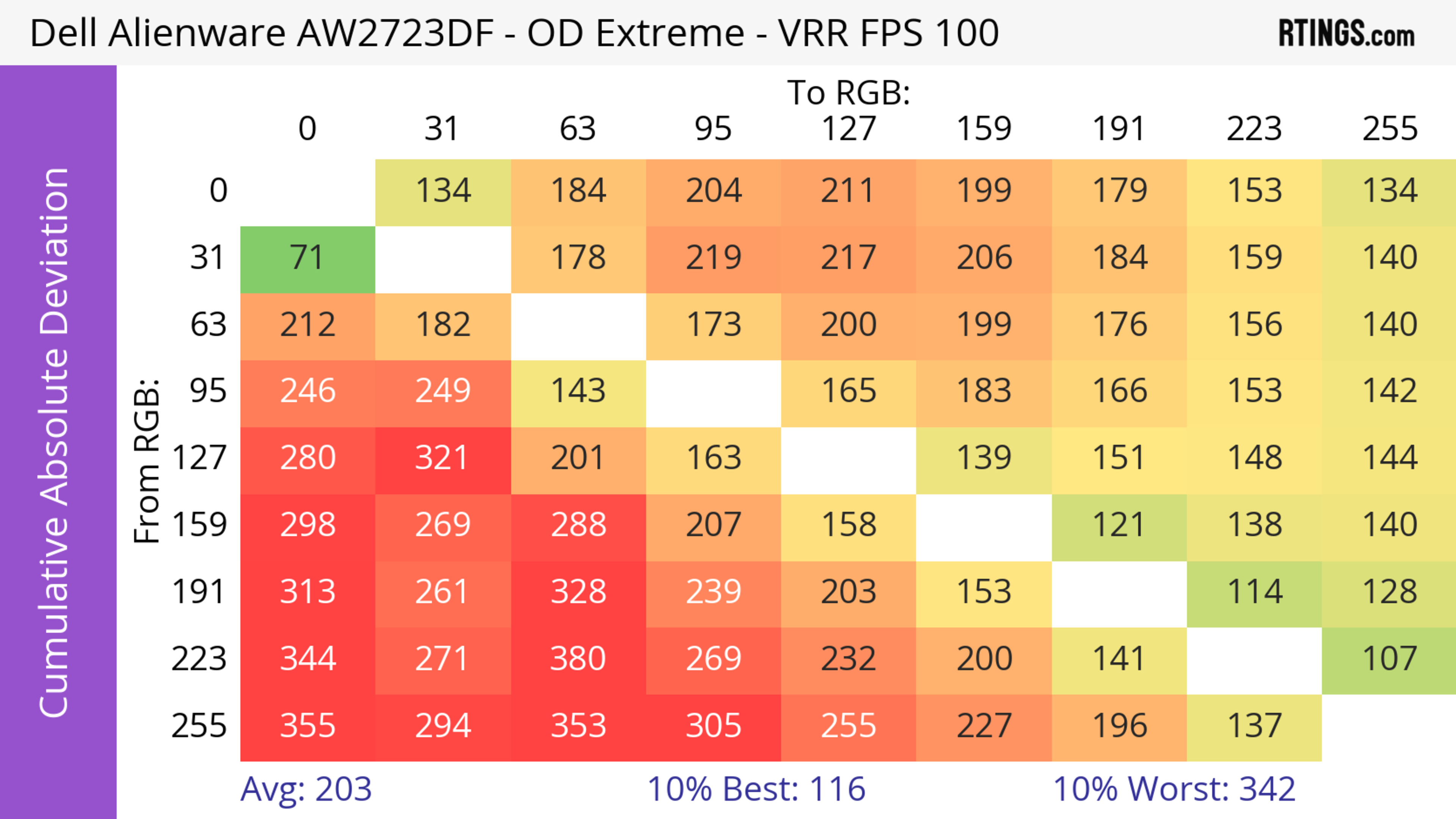 The Dell AW2723DF has a mediocre contrast ratio. It means that blacks look gray next to bright highlights, and it isn't ideal for dark room viewing. Although it has a local dimming feature, it doesn't do much to improve the contrast. If you would rather get a 240Hz monitor with a higher contrast ratio, then consider the Samsung Odyssey G6/G65D S32BG65D.