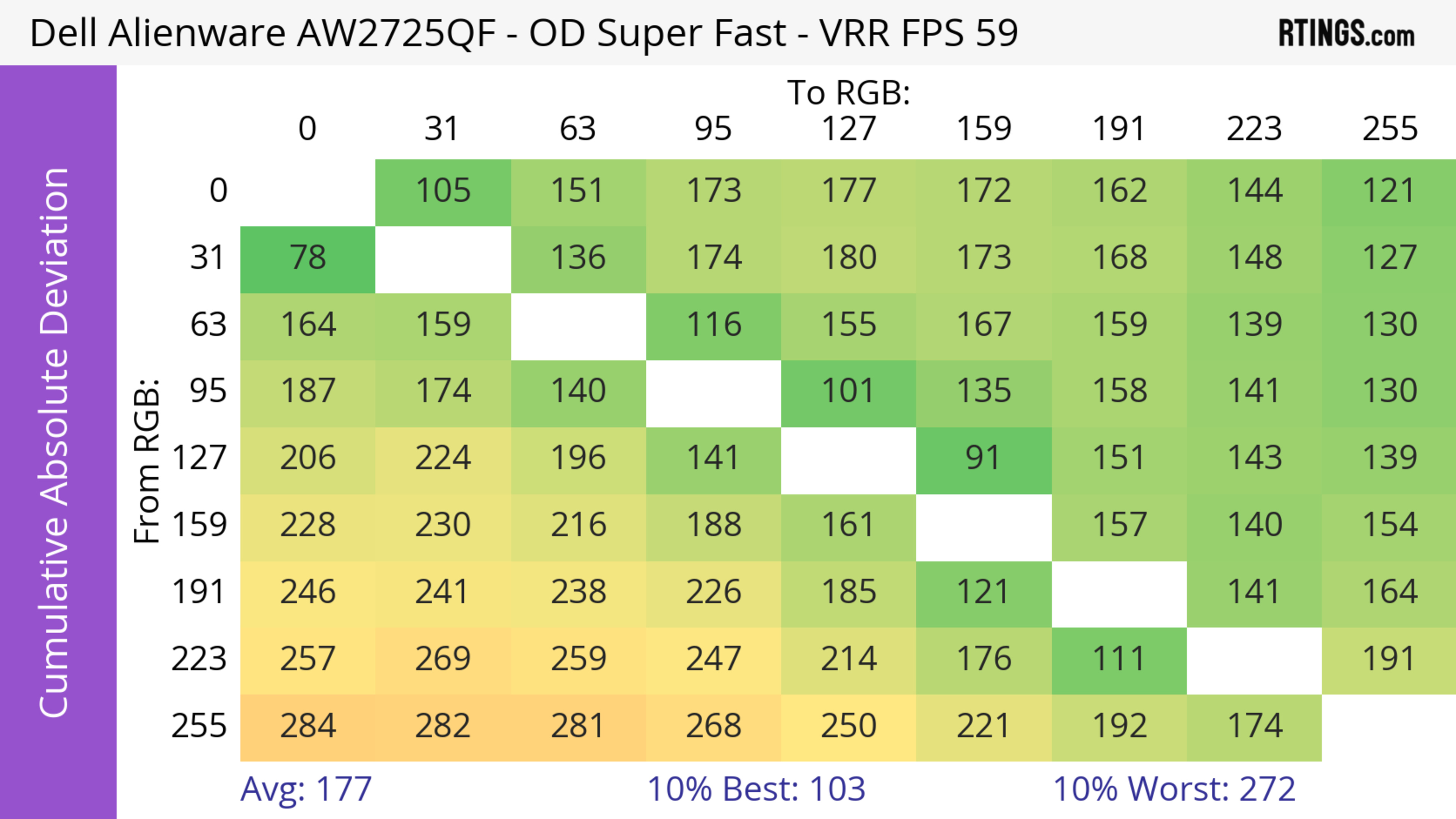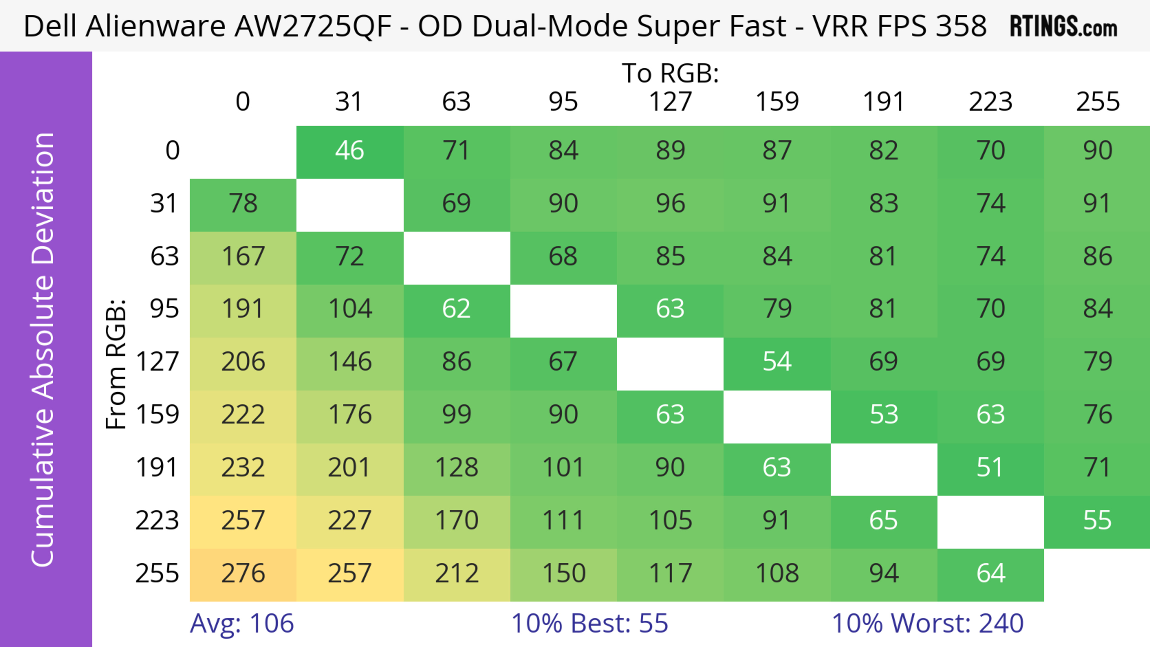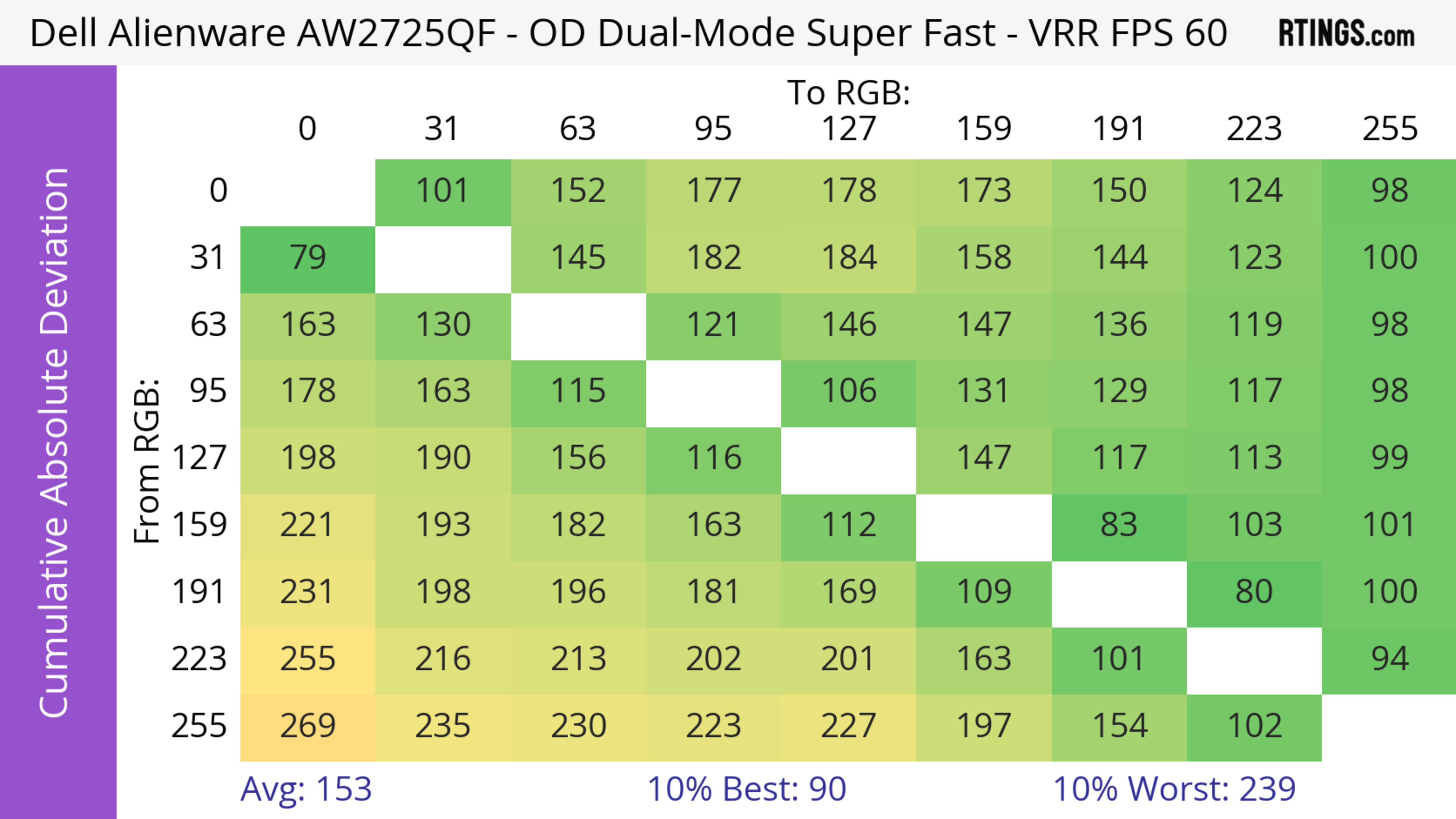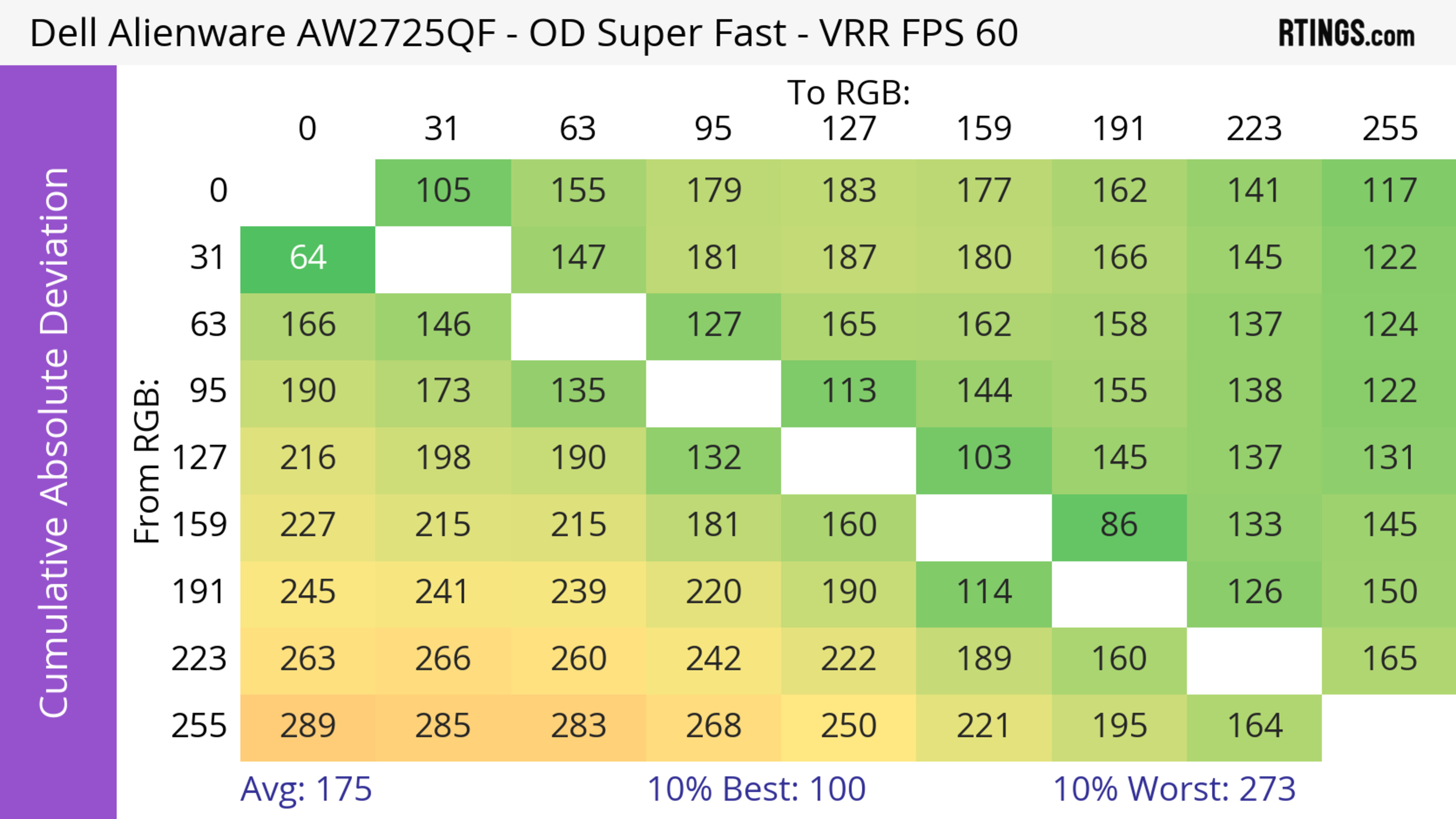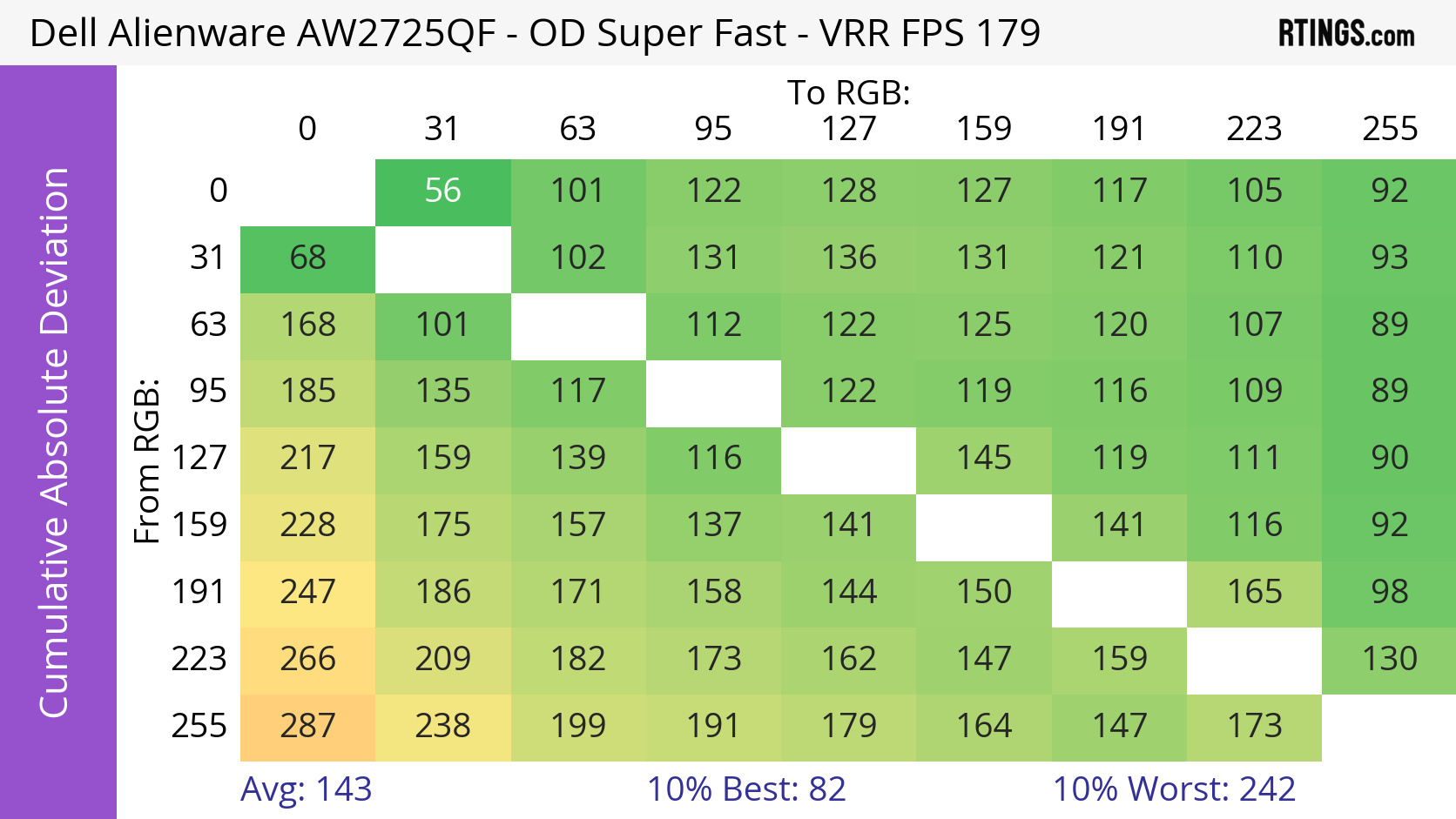 The refresh rate compliance is good. Its response time isn't fast enough to make full-color transitions before the monitor draws the next frame at high frame rates. However, it's much better at 60 fps. The 'Fast' and 'Super Fast' settings perform similarly, but 'Extreme' is much worse above 165 fps, as explained in VRR Motion Performance.