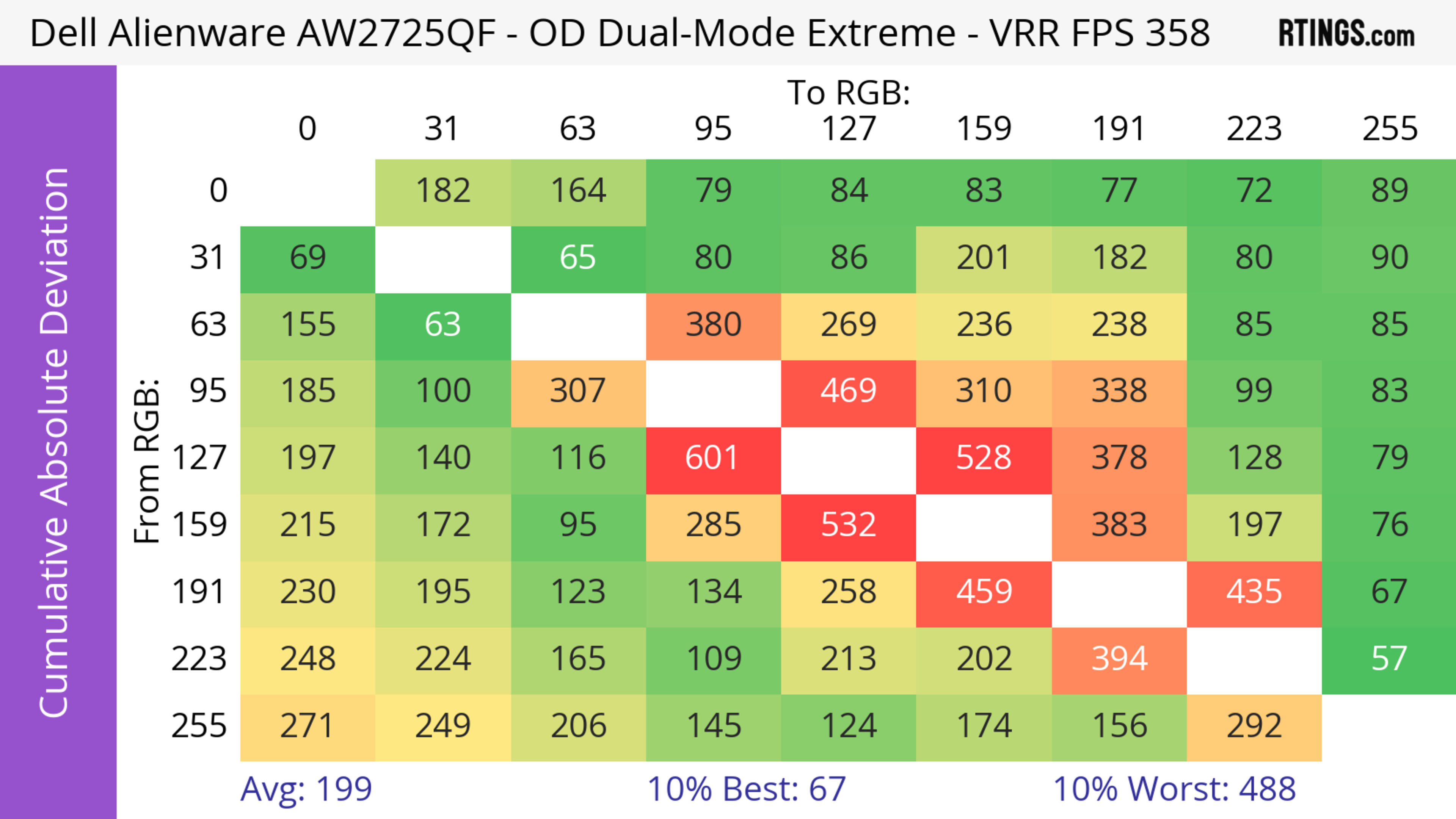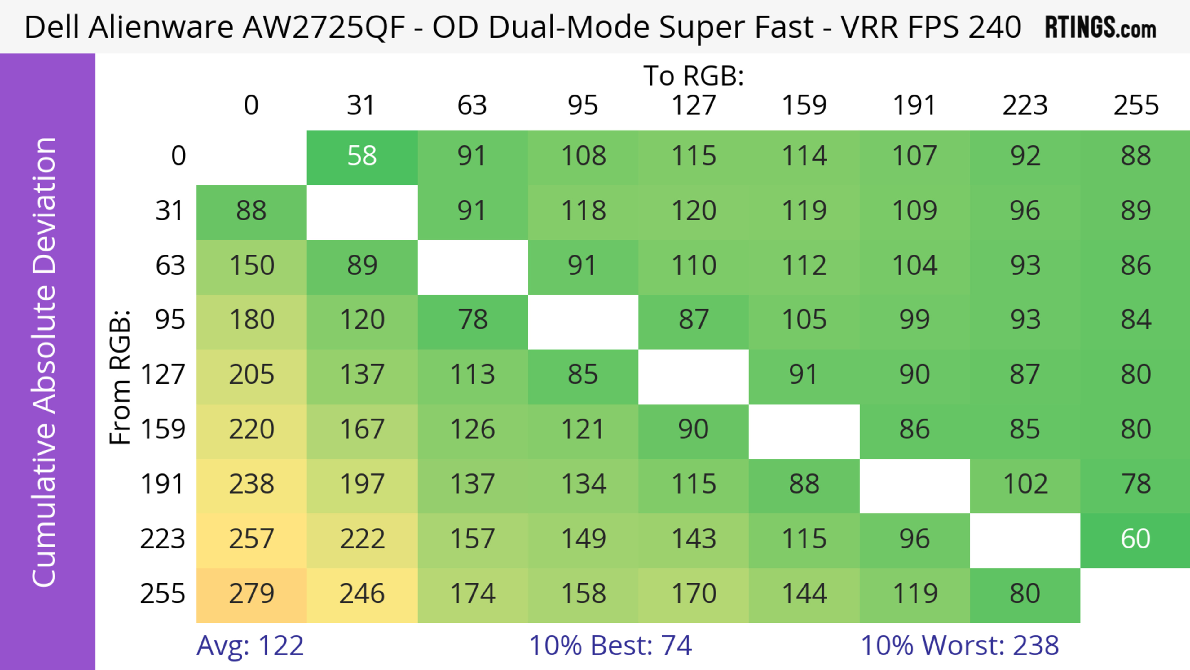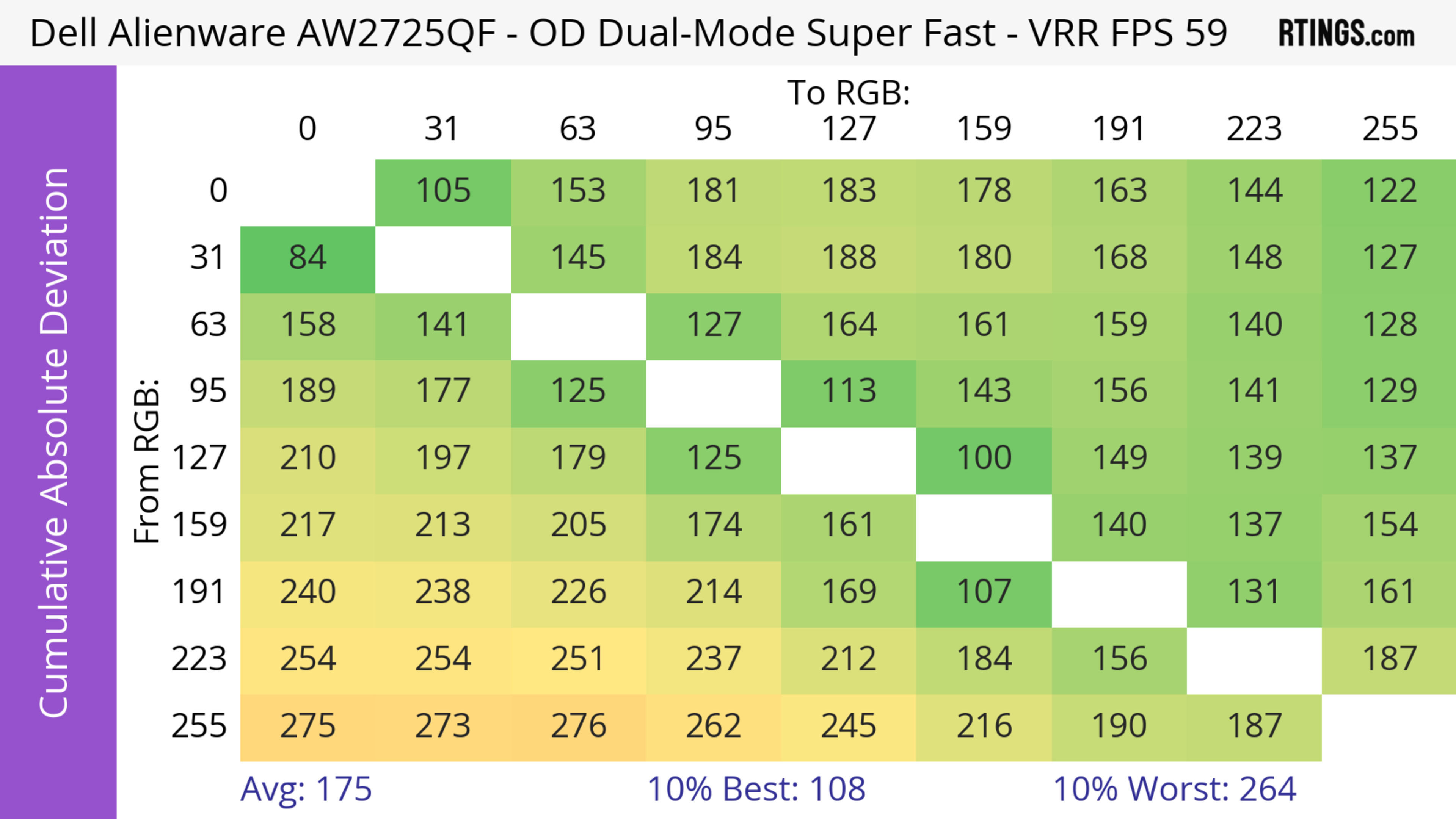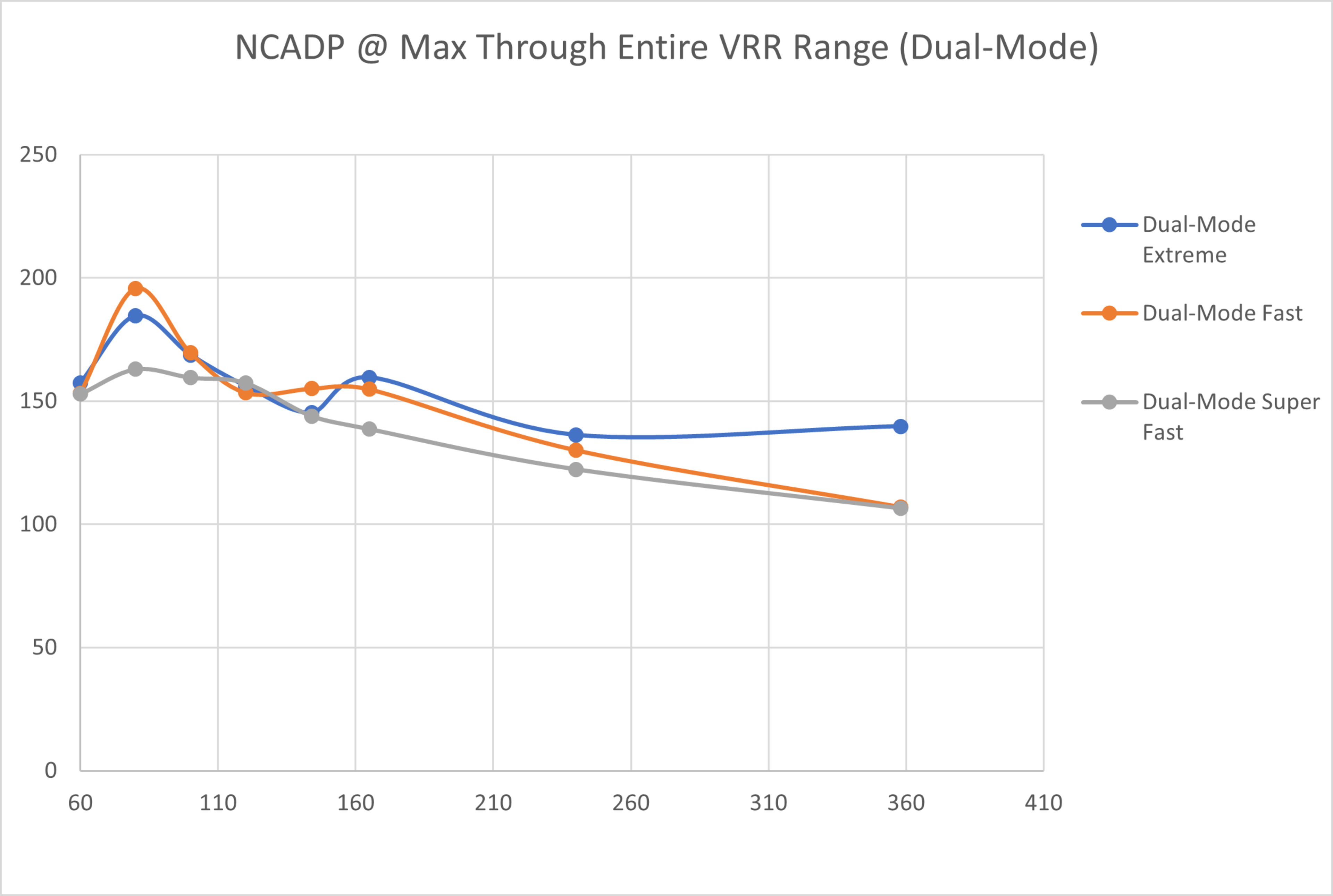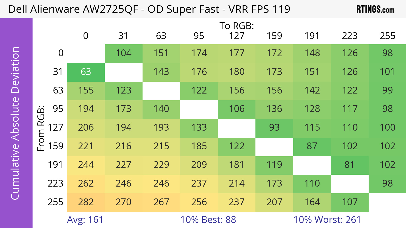 The refresh rate compliance is good. Its response time isn't fast enough to make full-color transitions before the monitor draws the next frame at high frame rates. However, it's much better at 60 fps. The 'Fast' and 'Super Fast' settings perform similarly, but 'Extreme' is much worse above 165 fps, as explained in VRR Motion Performance.