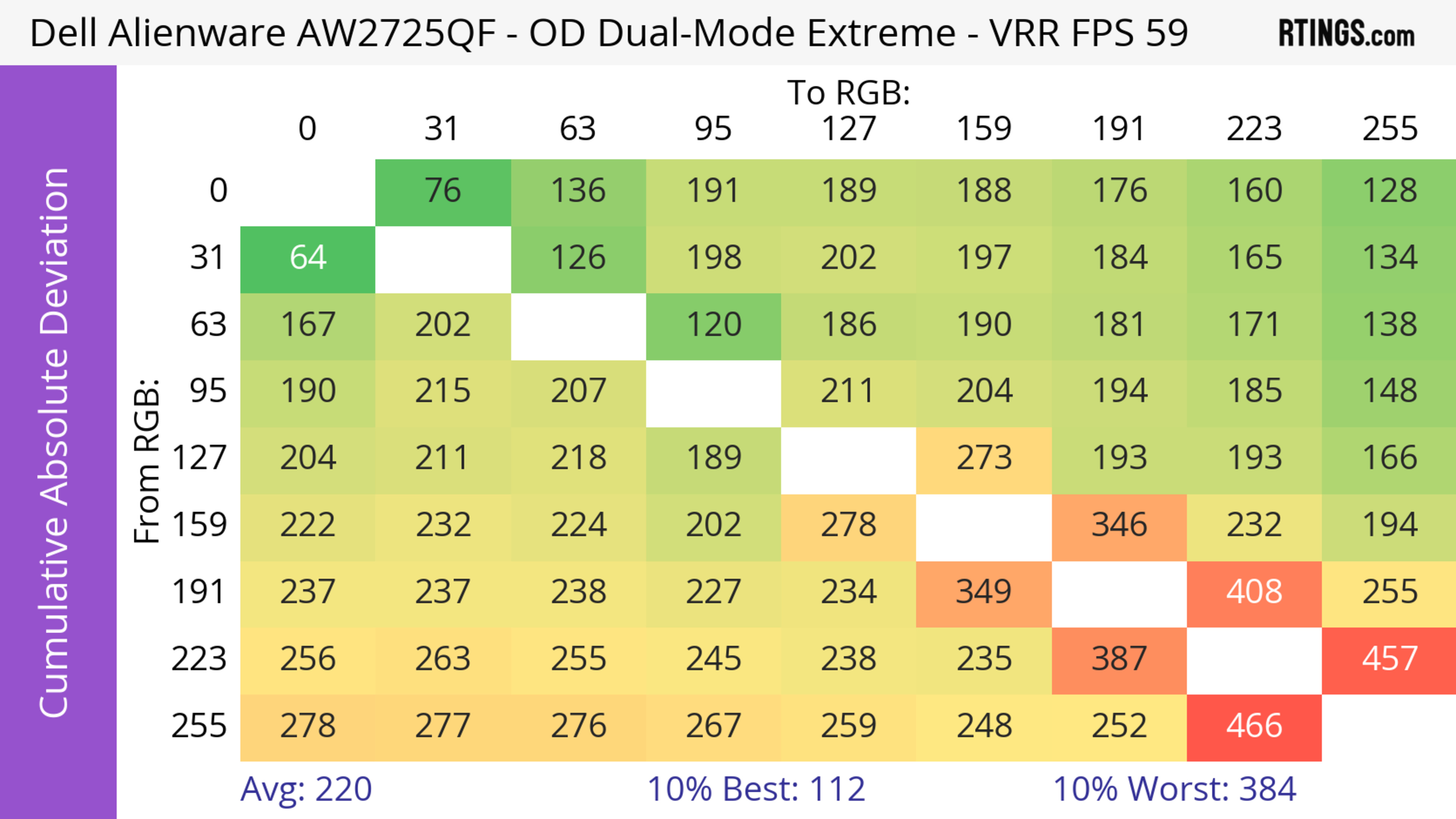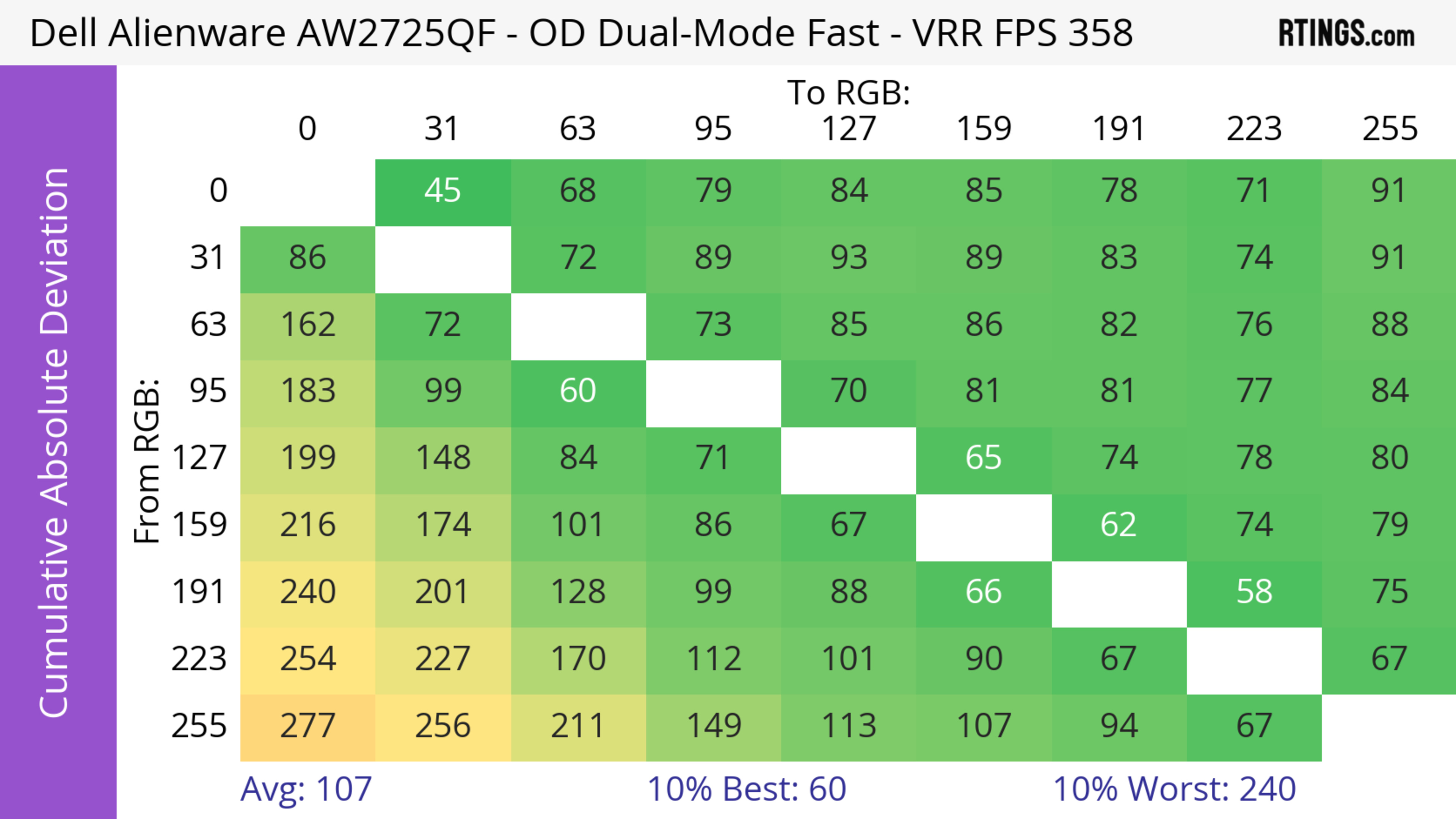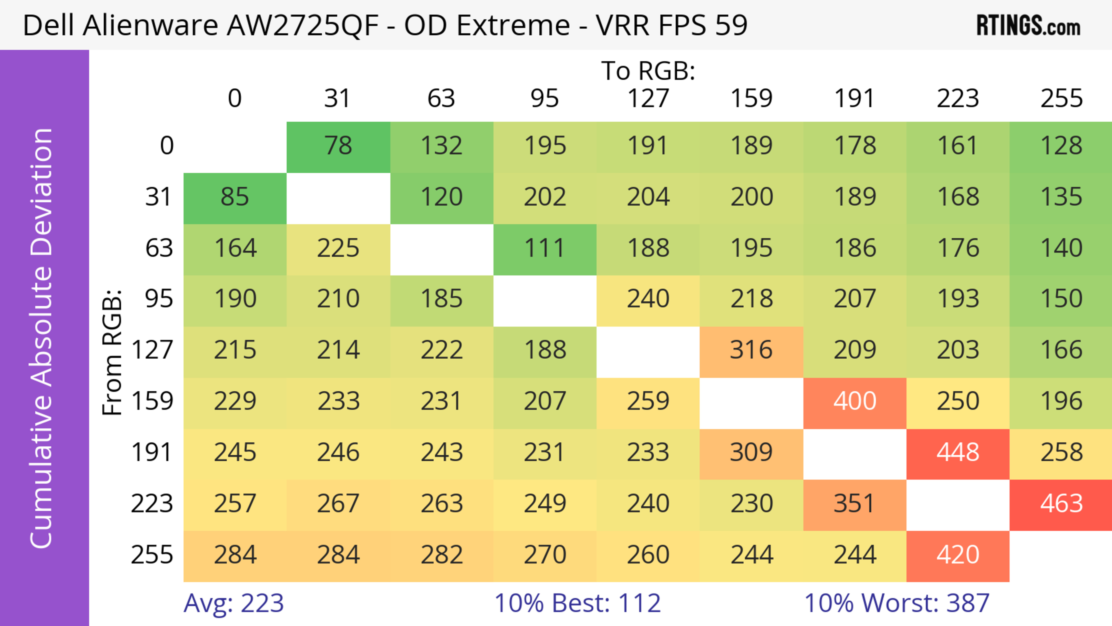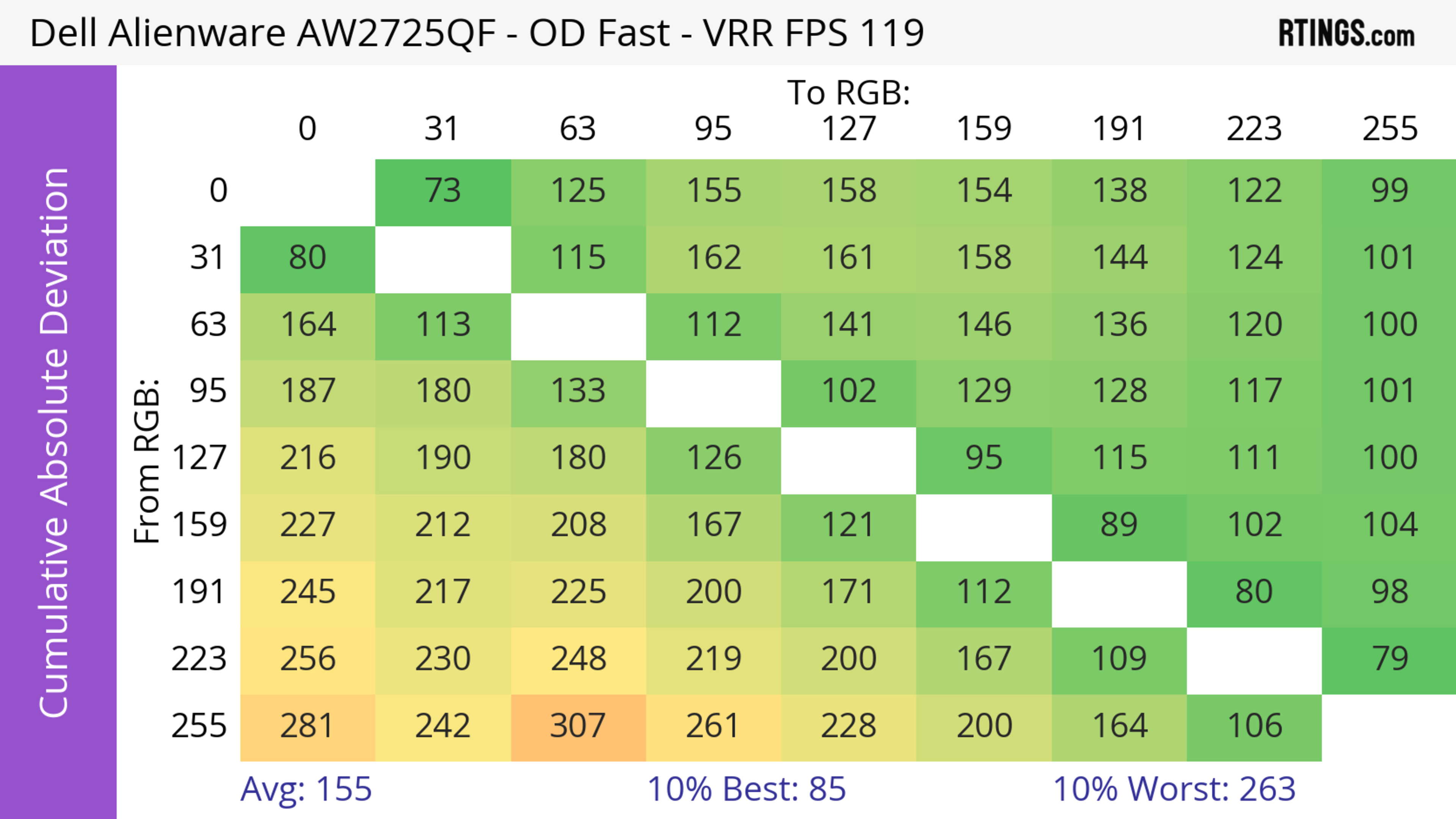 The refresh rate compliance is good. Its response time isn't fast enough to make full-color transitions before the monitor draws the next frame at high frame rates. However, it's much better at 60 fps. The 'Fast' and 'Super Fast' settings perform similarly, but 'Extreme' is much worse above 165 fps, as explained in VRR Motion Performance.