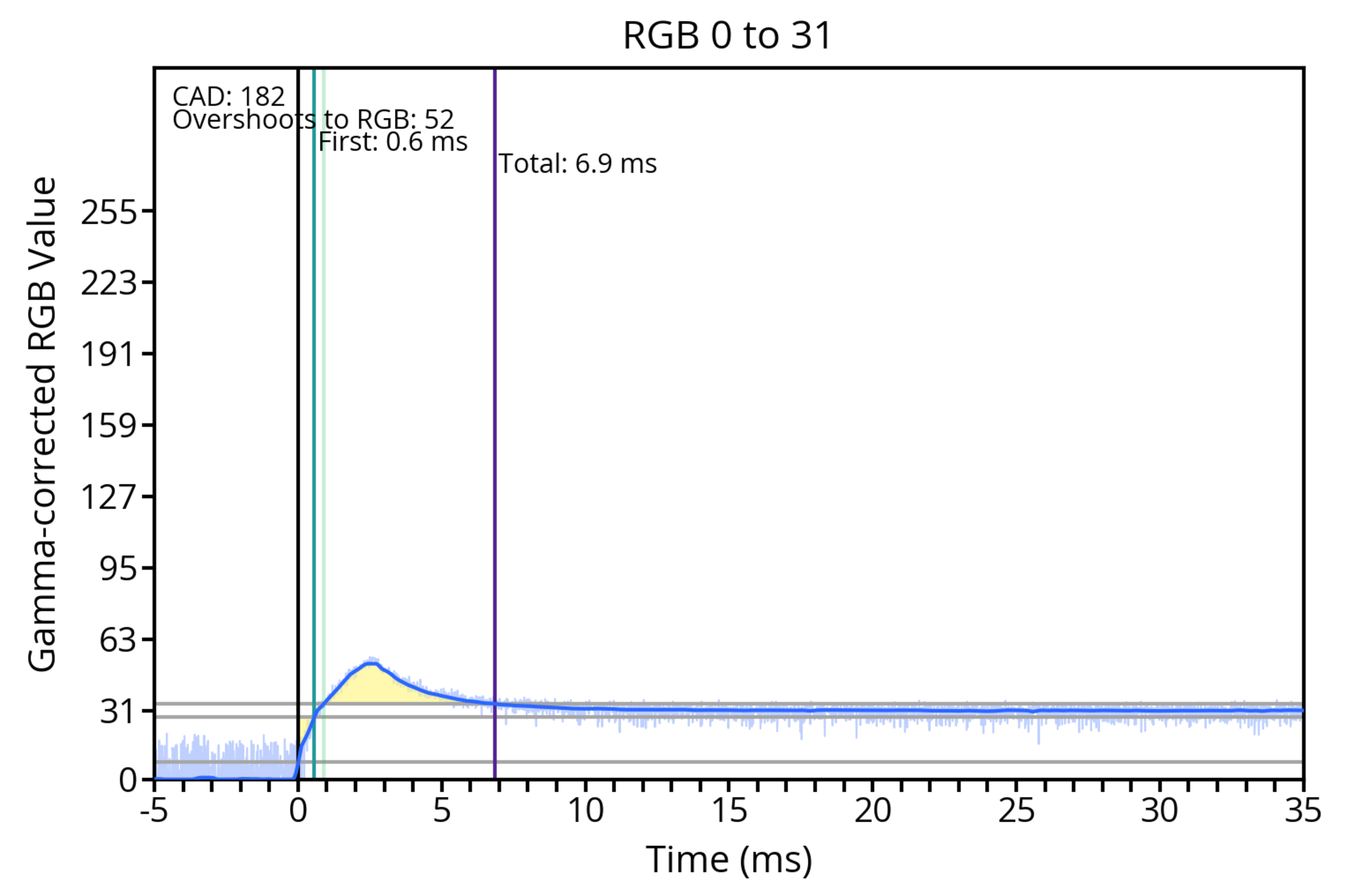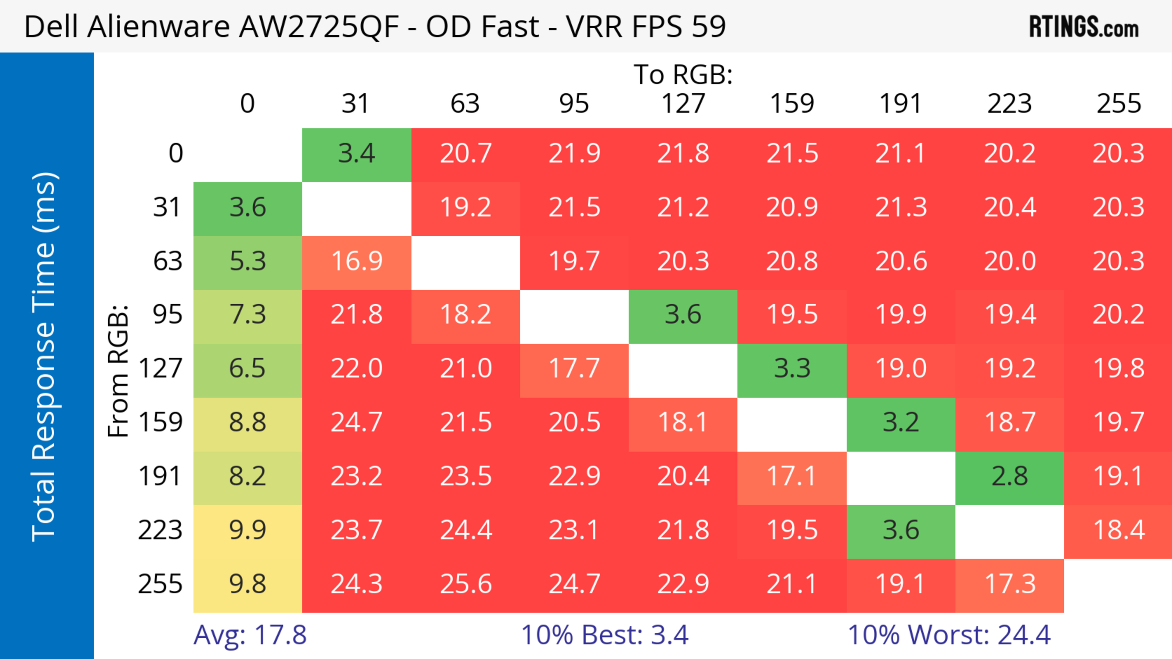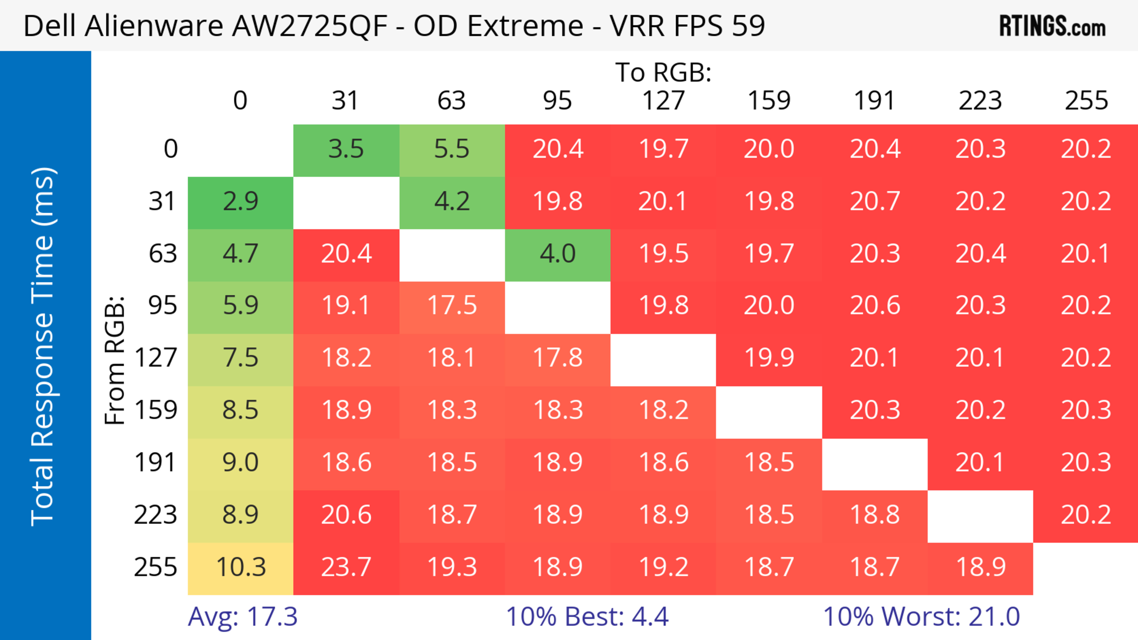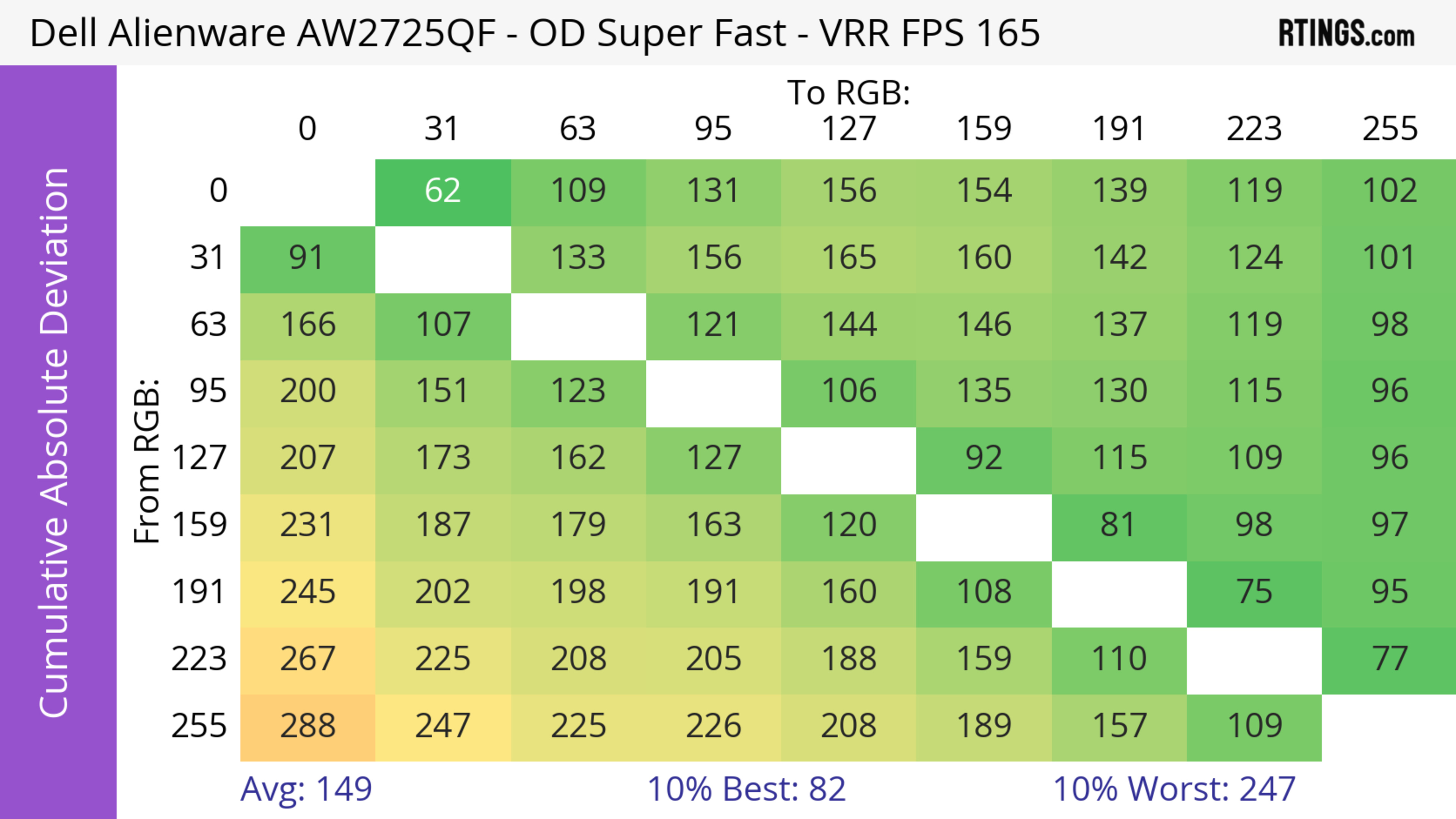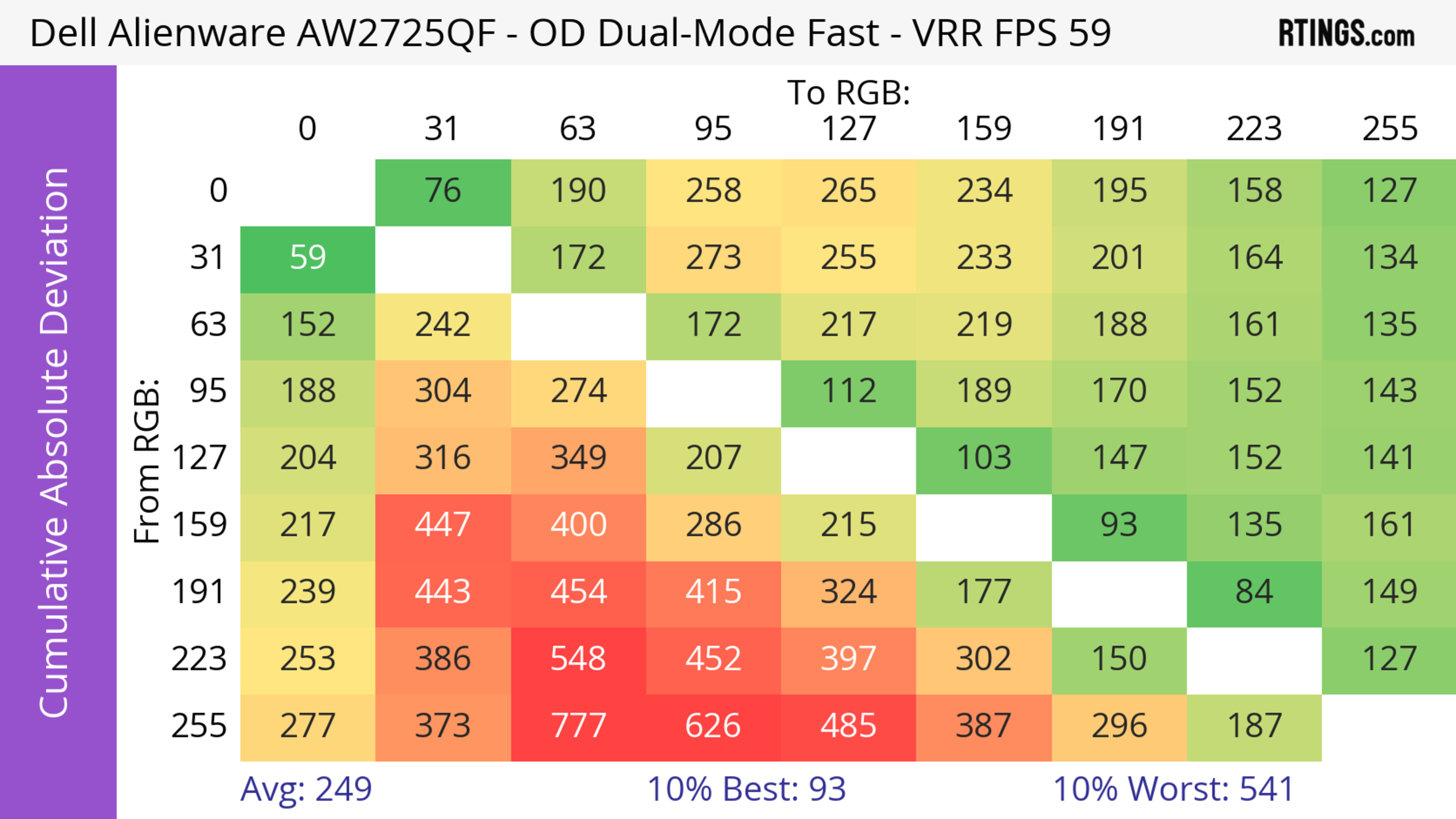 The refresh rate compliance is good. Its response time isn't fast enough to make full-color transitions before the monitor draws the next frame at high frame rates. However, it's much better at 60 fps. The 'Fast' and 'Super Fast' settings perform similarly, but 'Extreme' is much worse above 165 fps, as explained in VRR Motion Performance.