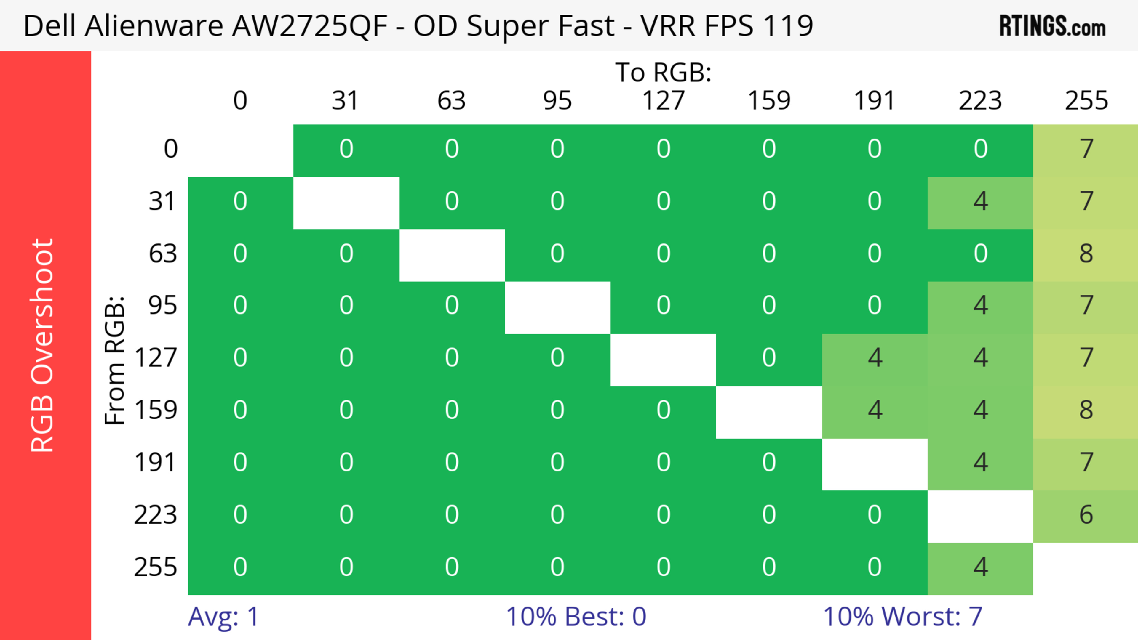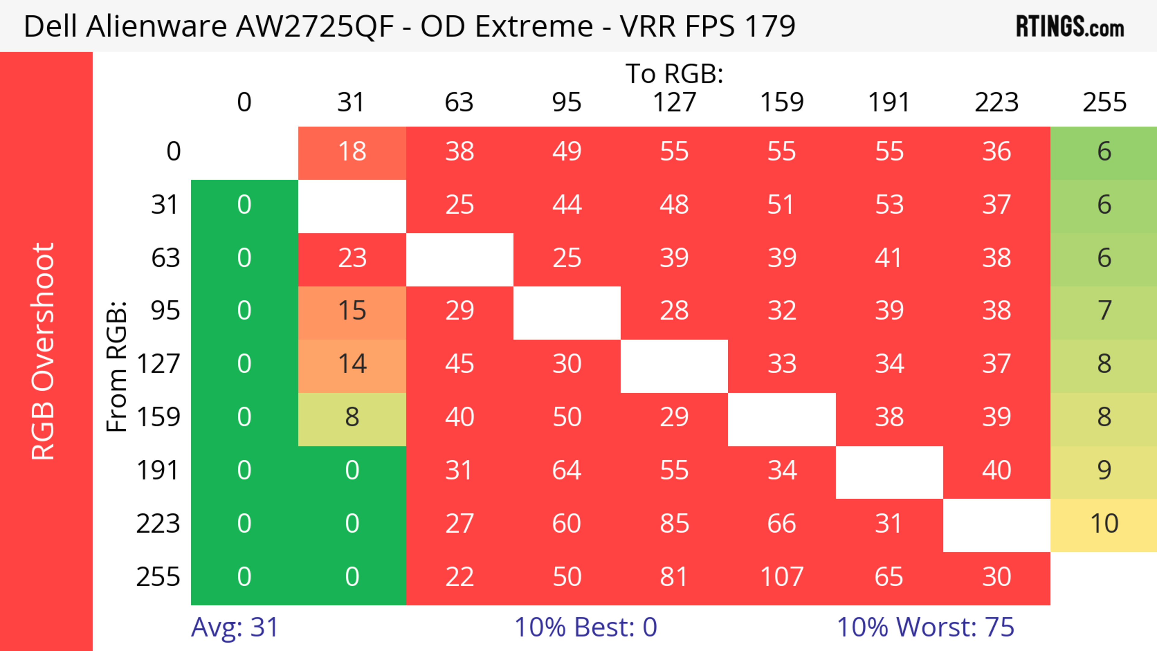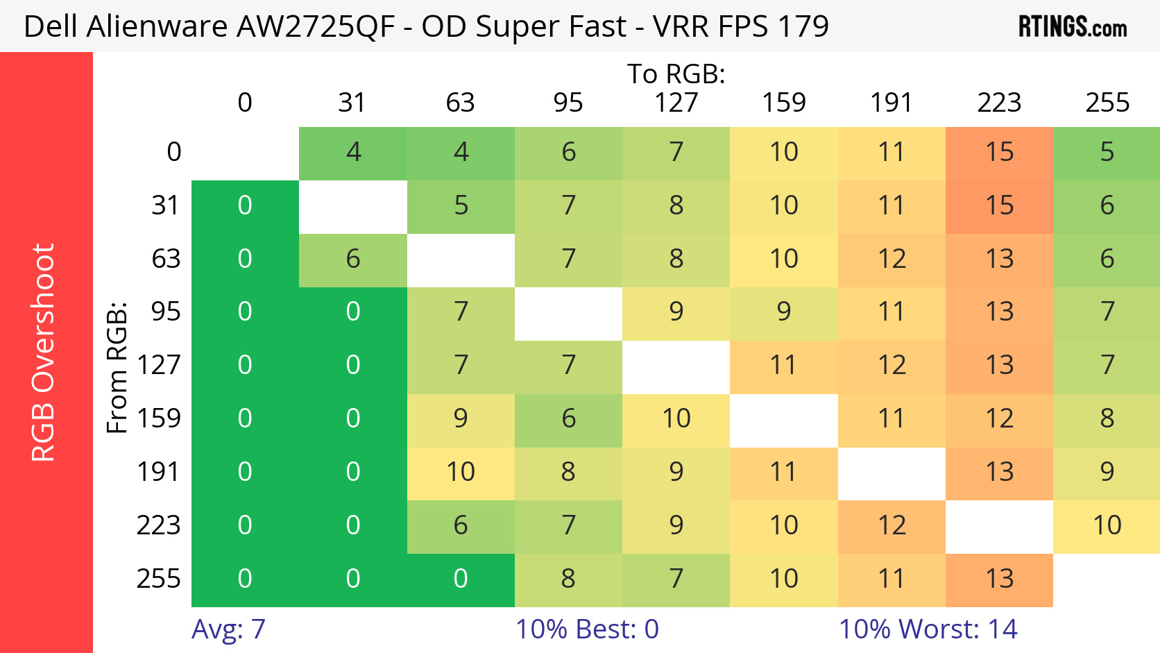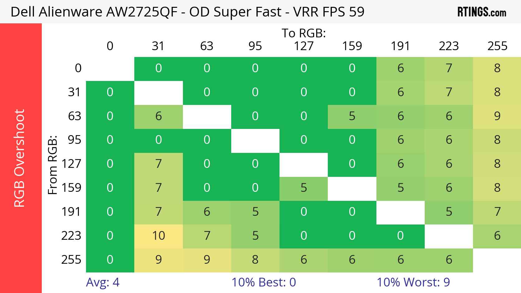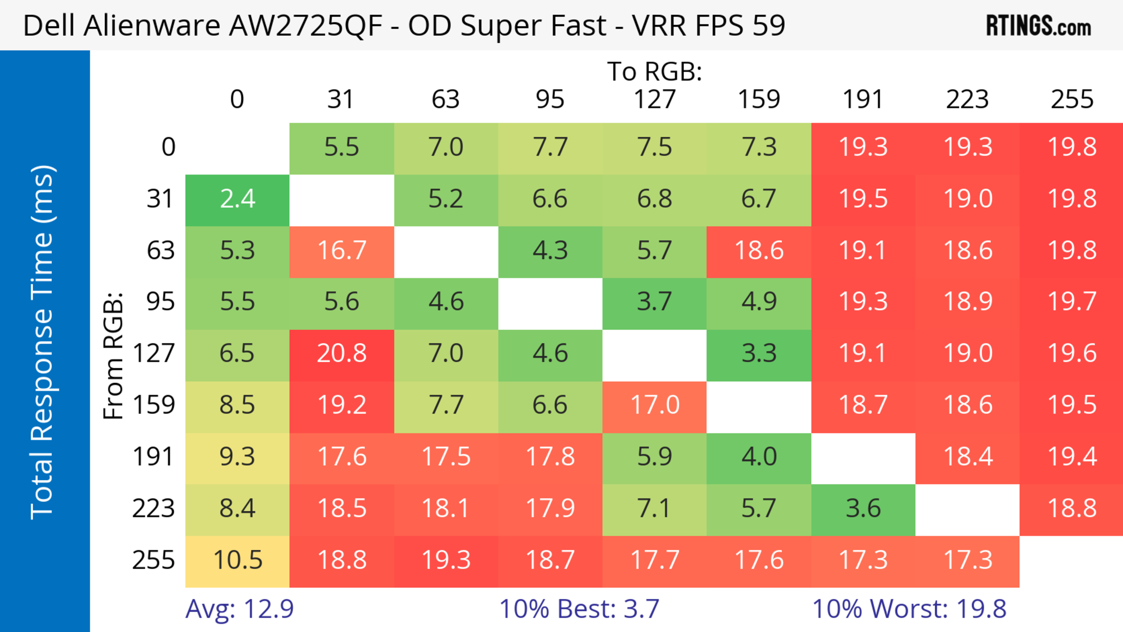 The refresh rate compliance is good. Its response time isn't fast enough to make full-color transitions before the monitor draws the next frame at high frame rates. However, it's much better at 60 fps. The 'Fast' and 'Super Fast' settings perform similarly, but 'Extreme' is much worse above 165 fps, as explained in VRR Motion Performance.