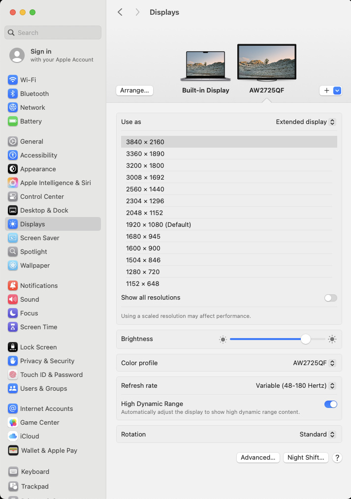 This monitor works well with macOS. There aren't any connection issues over DisplayPort or HDMI in either of the Dual-Resolution modes. That said, HDR looks a bit undersaturated compared to SDR, but the 'Desktop,' 'Custom Color HDR,' and 'DisplayHDR 600' modes look closest to a MacBook display in terms of accuracy.