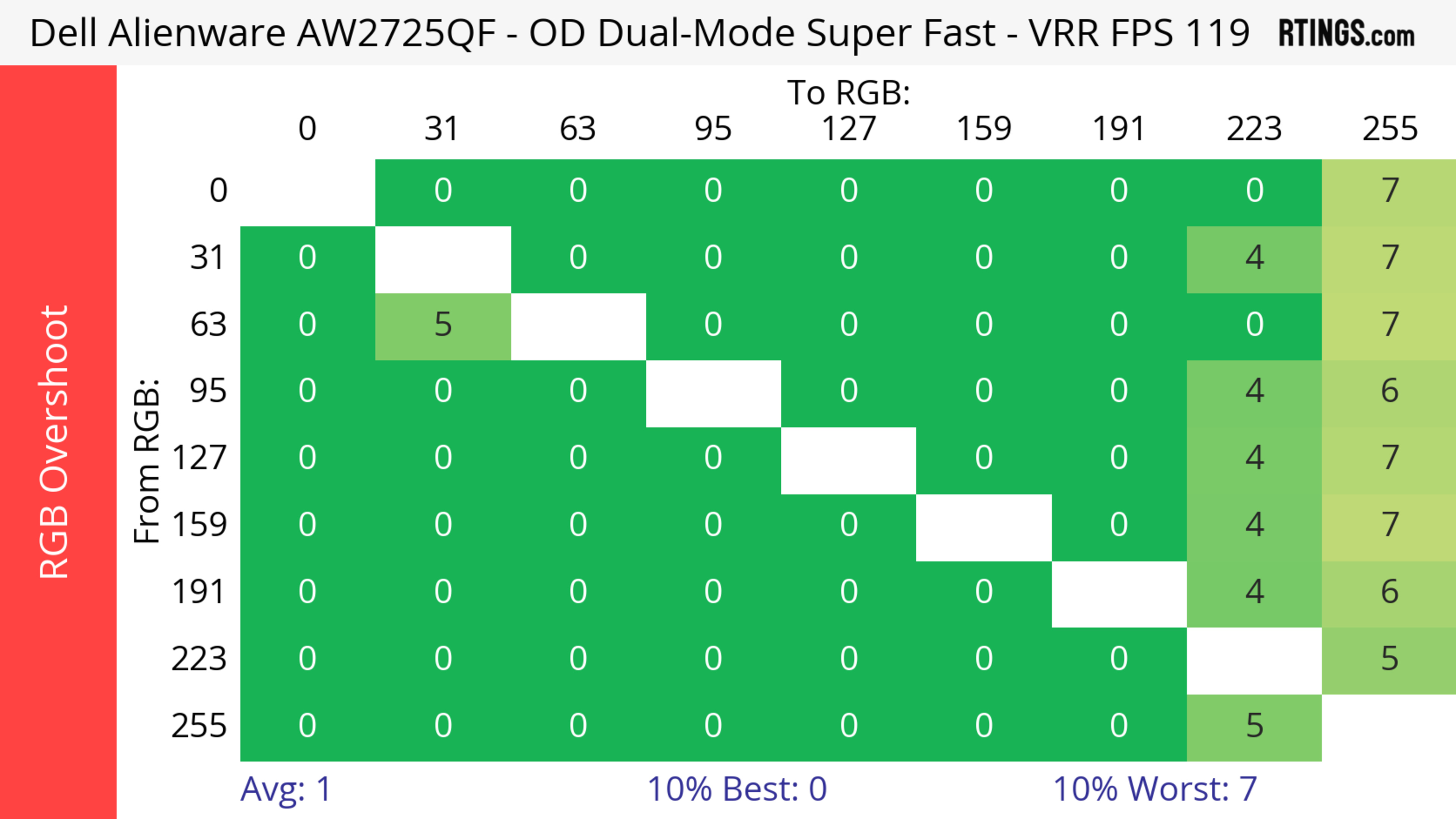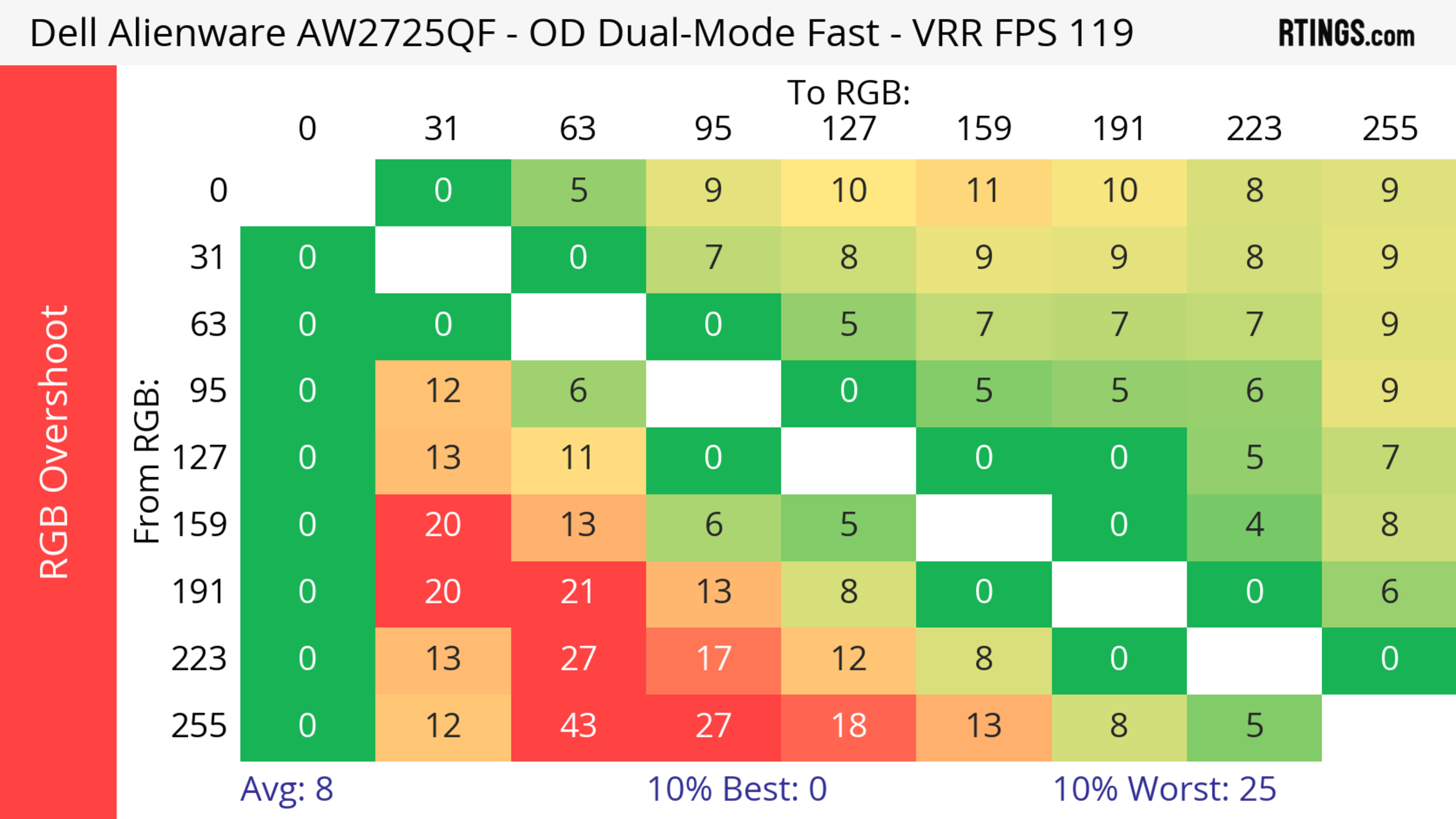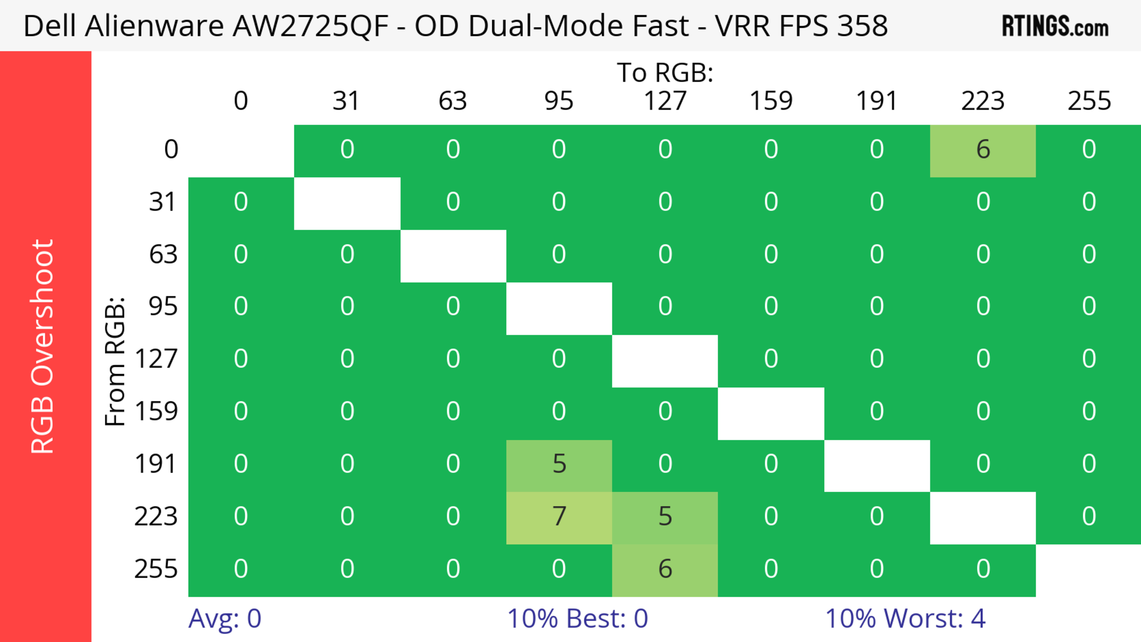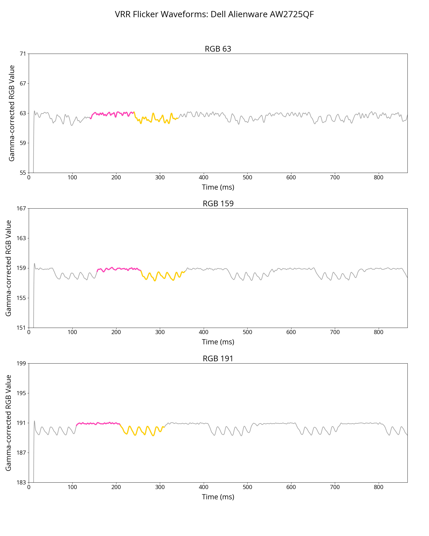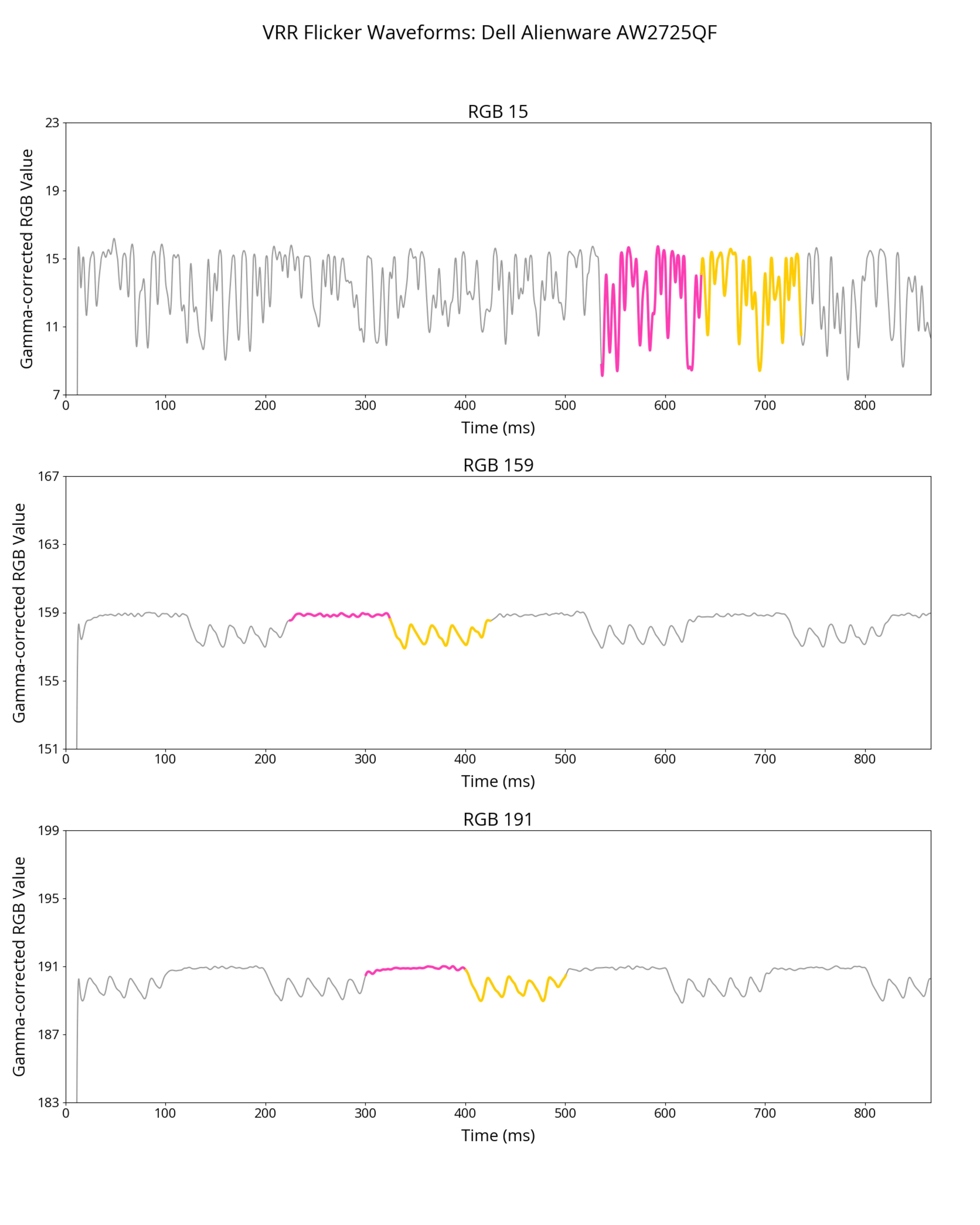 The Dell AW2725QF has a bit of VRR flicker with changing frame rates in the 4k Dual-Resolution mode. While it isn't as bad as what the score suggests, you can see it more in person than in the video. That said, it's minimal in dark scenes and not distracting. However, there's more flicker in the 1080p Dual-Resolution mode due to the larger refresh rate range. You can see the results below:
