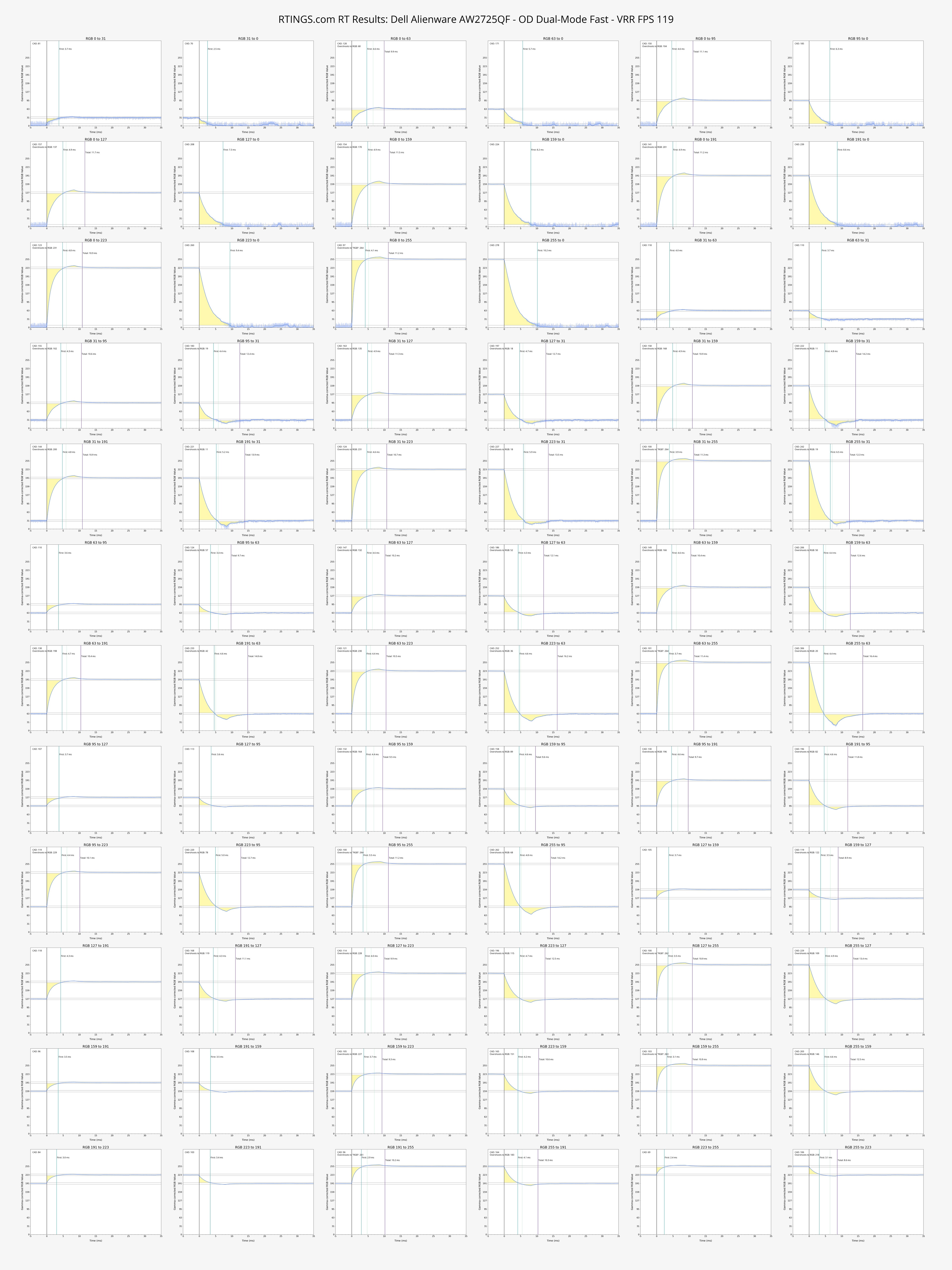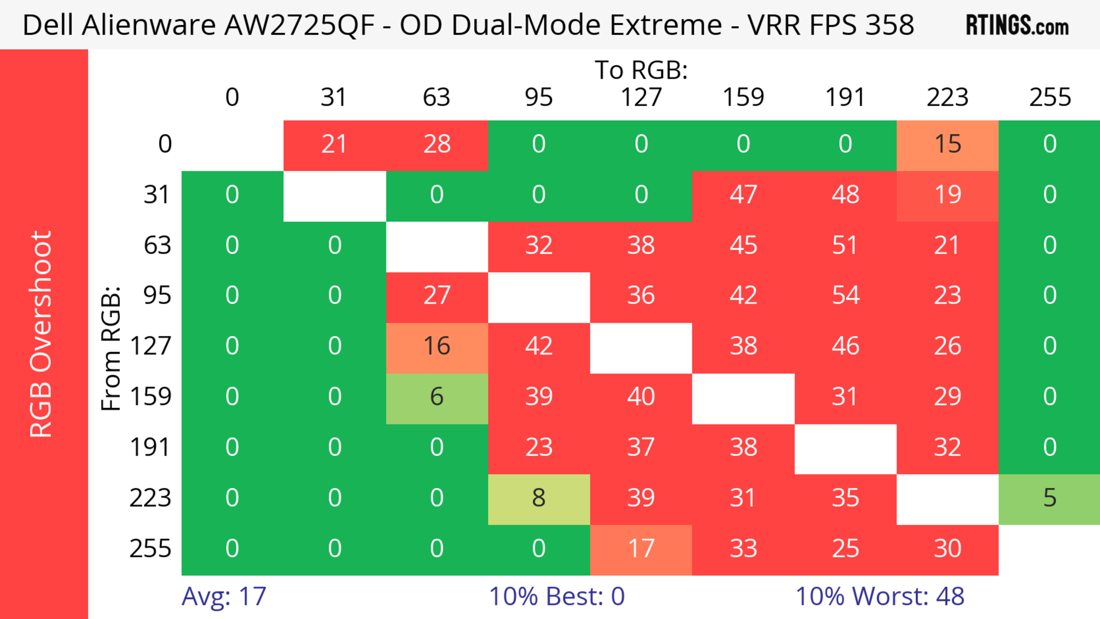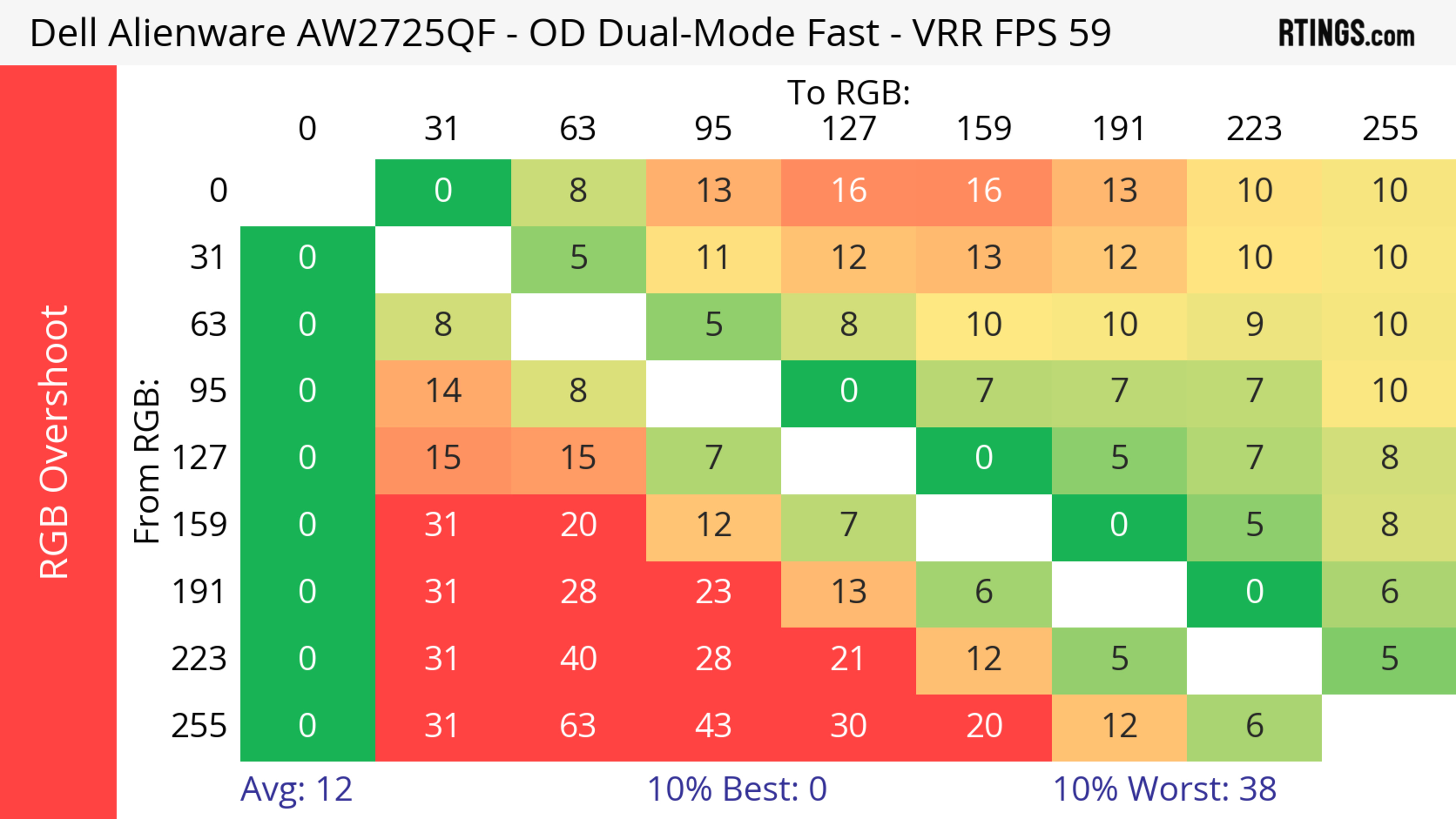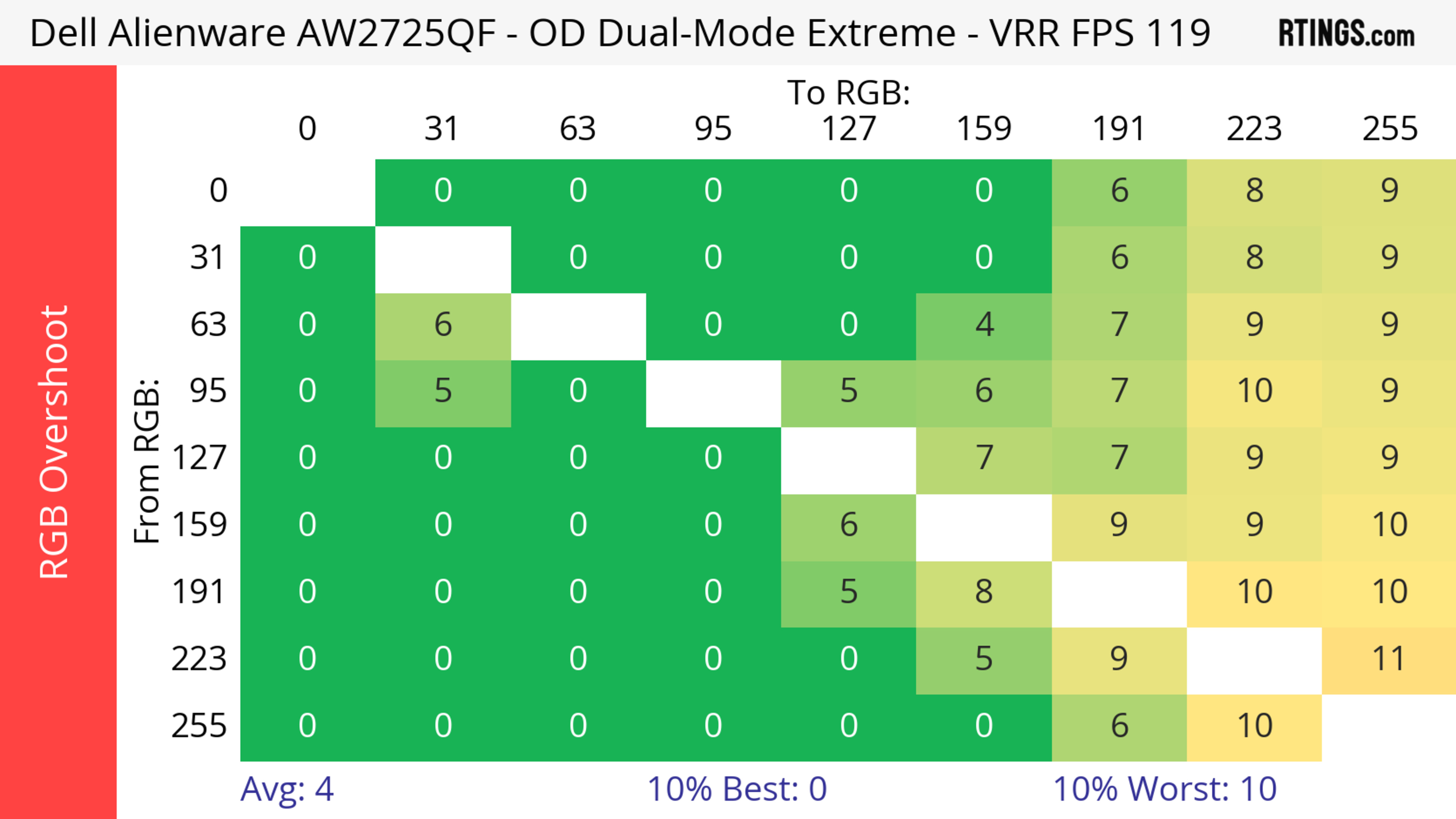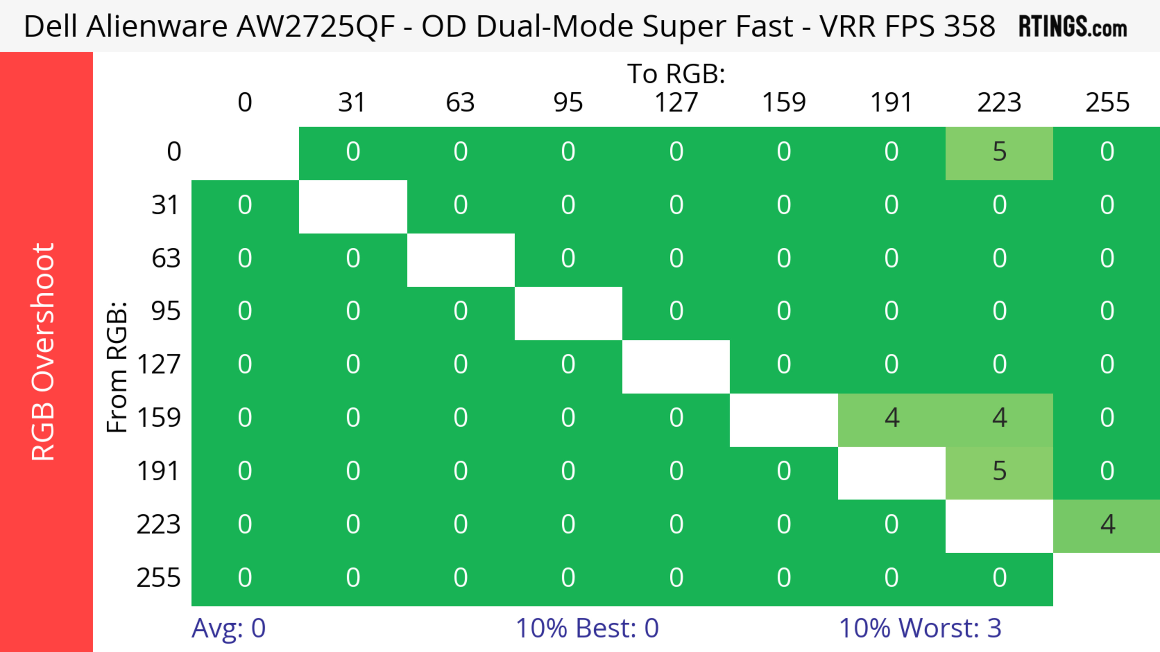 The Dell AW2725QF has a bit of VRR flicker with changing frame rates in the 4k Dual-Resolution mode. While it isn't as bad as what the score suggests, you can see it more in person than in the video. That said, it's minimal in dark scenes and not distracting. However, there's more flicker in the 1080p Dual-Resolution mode due to the larger refresh rate range. You can see the results below: