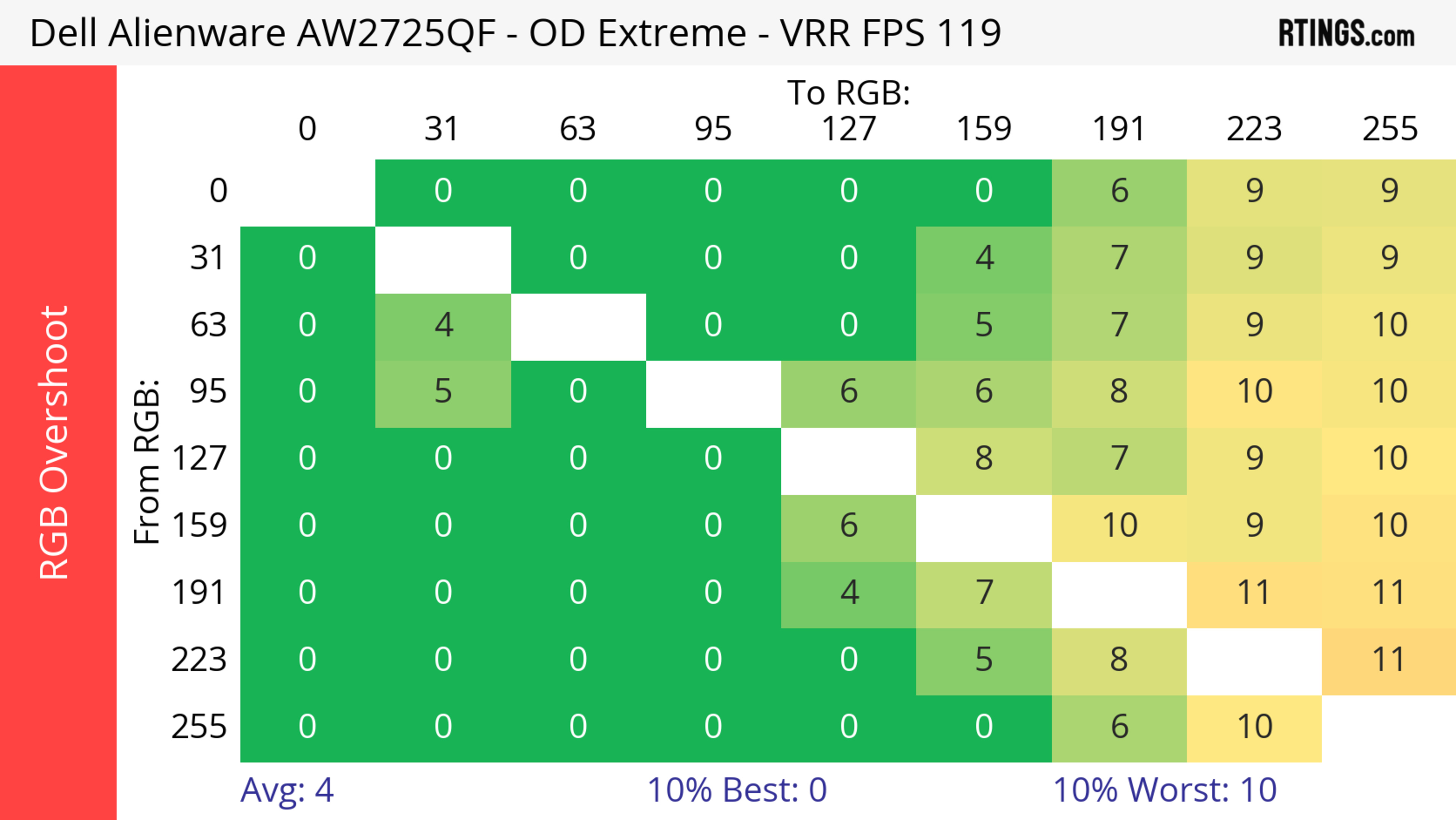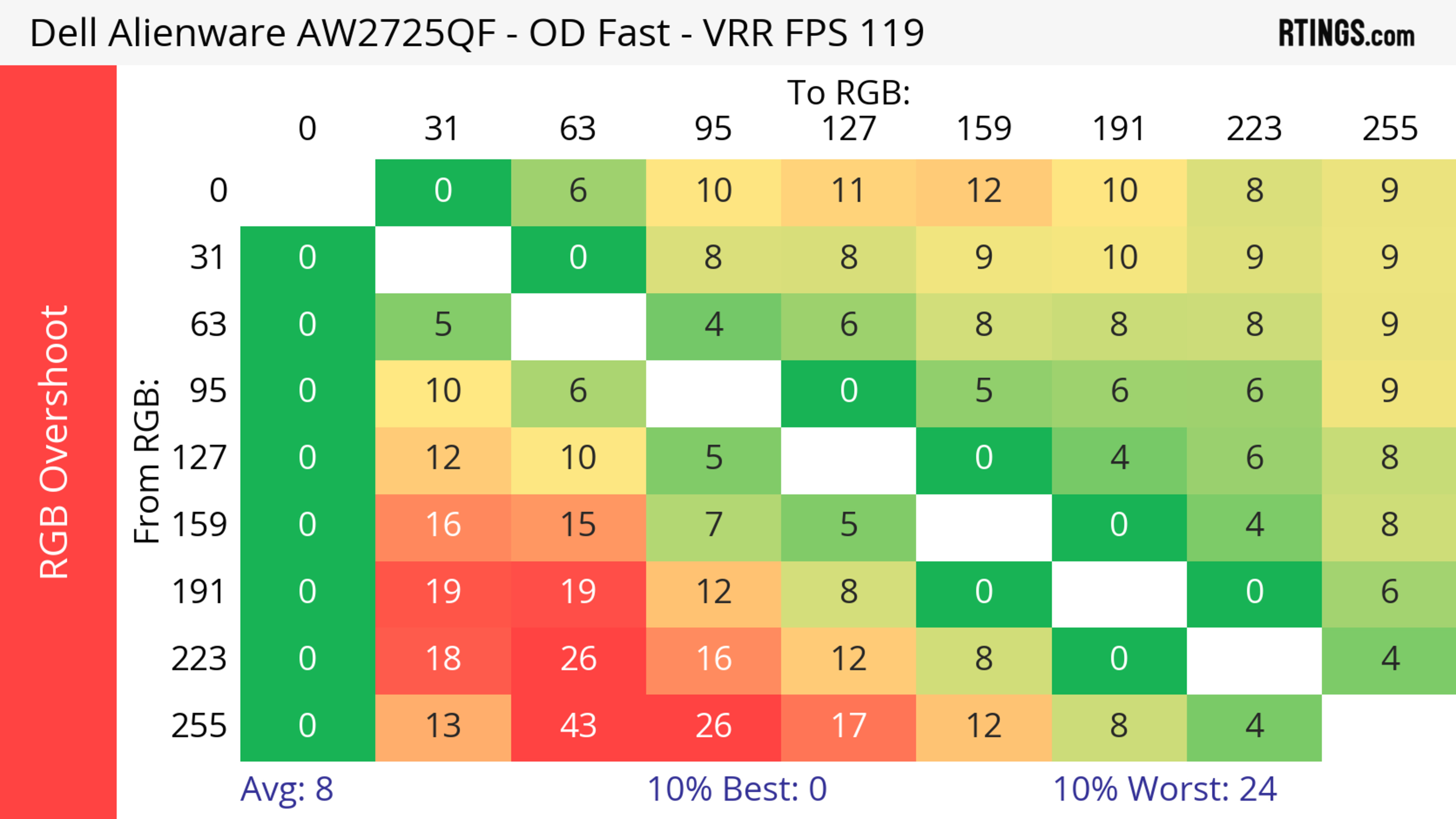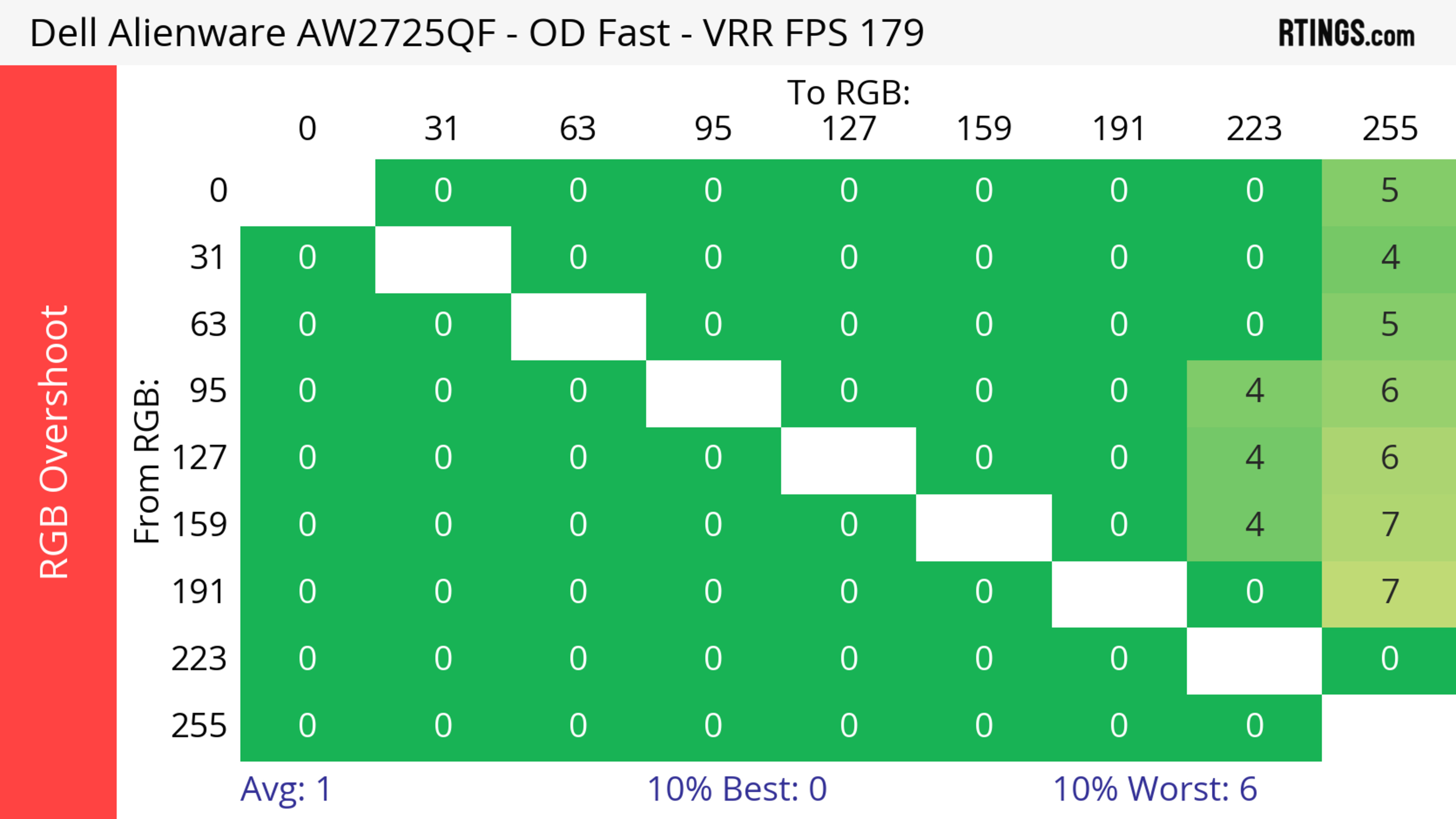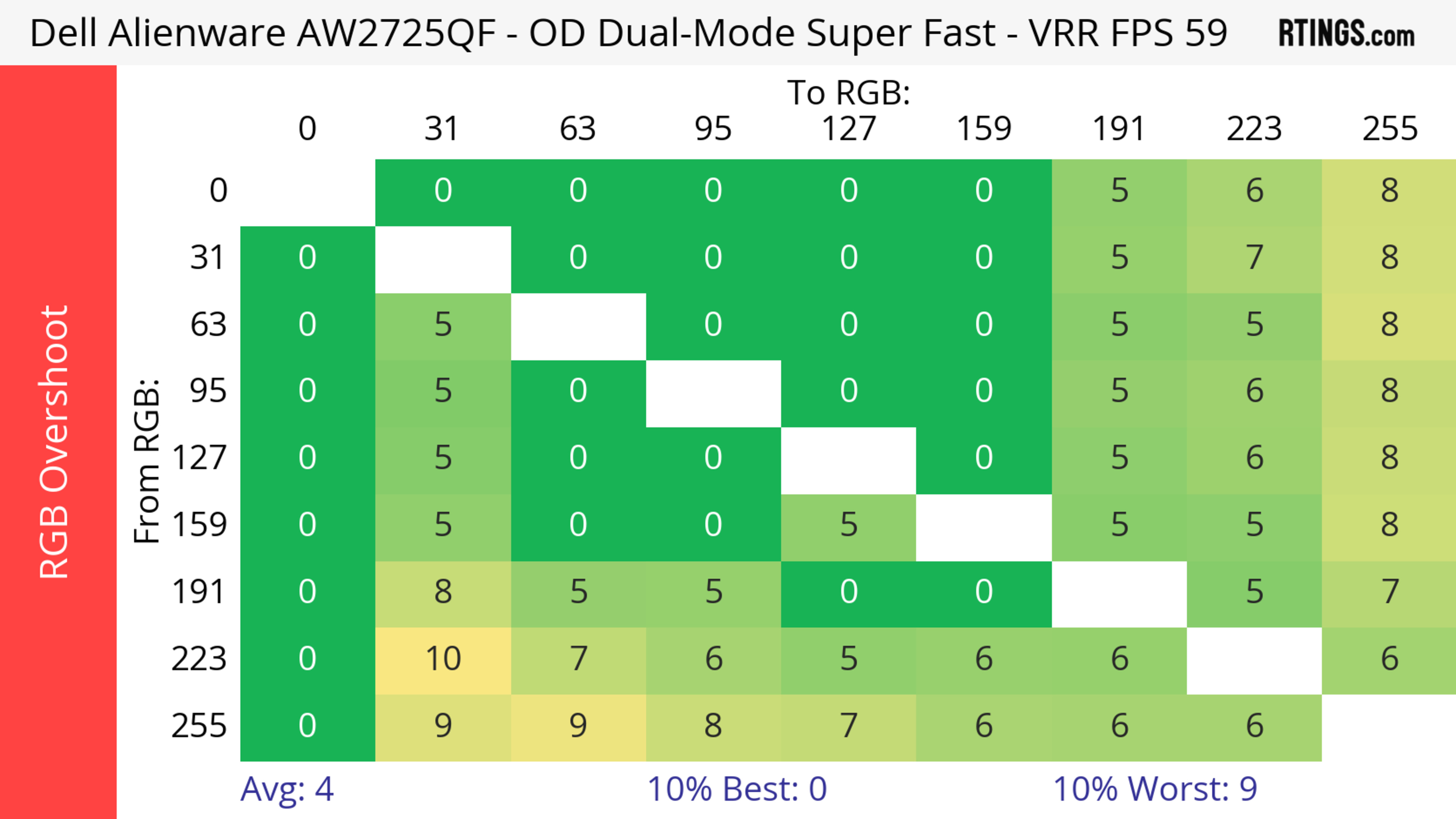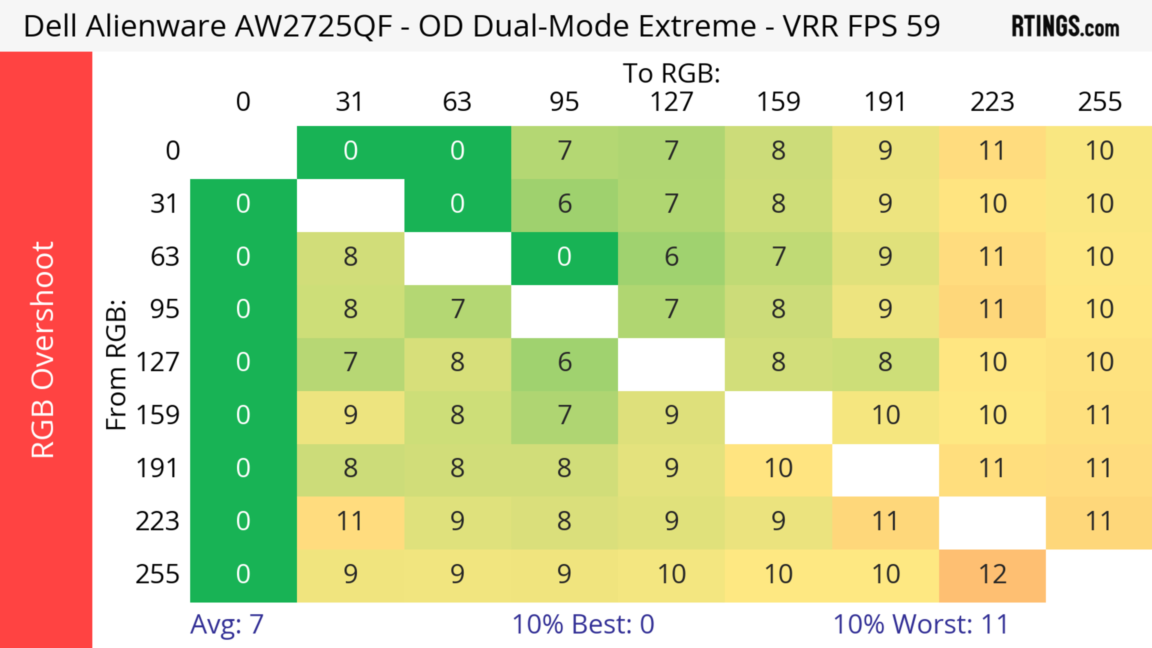 The Dell AW2725QF has a bit of VRR flicker with changing frame rates in the 4k Dual-Resolution mode. While it isn't as bad as what the score suggests, you can see it more in person than in the video. That said, it's minimal in dark scenes and not distracting. However, there's more flicker in the 1080p Dual-Resolution mode due to the larger refresh rate range. You can see the results below: