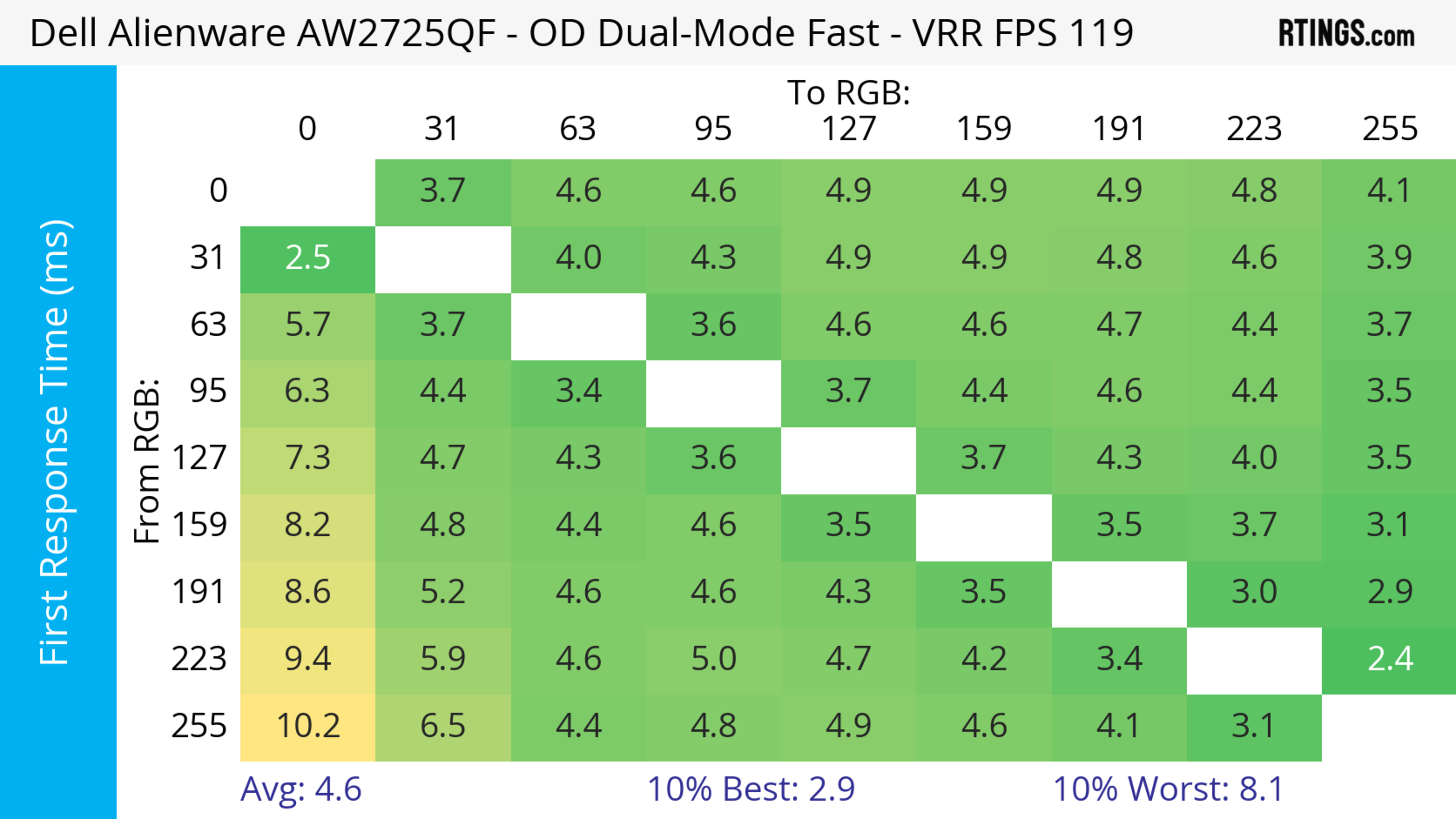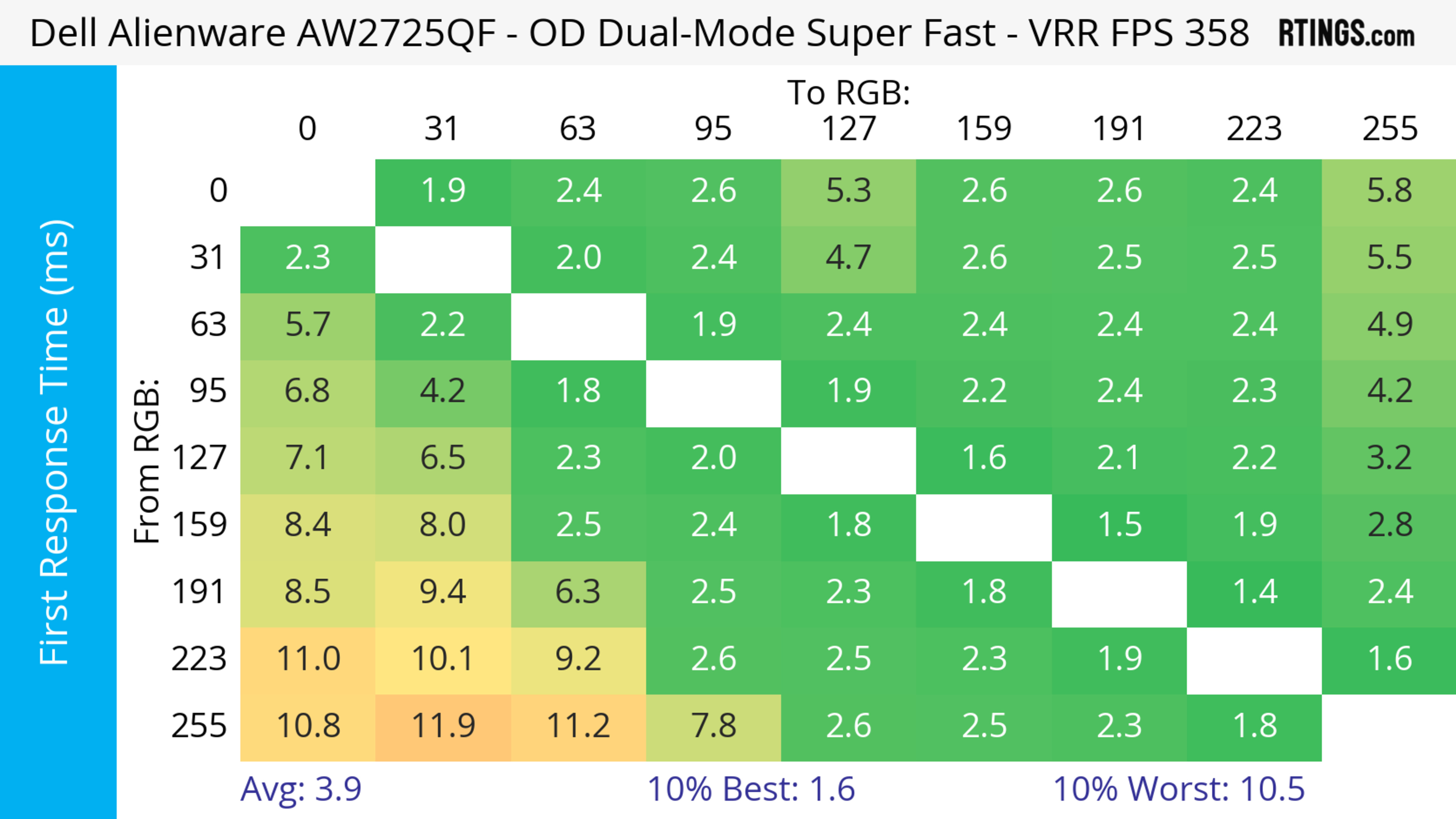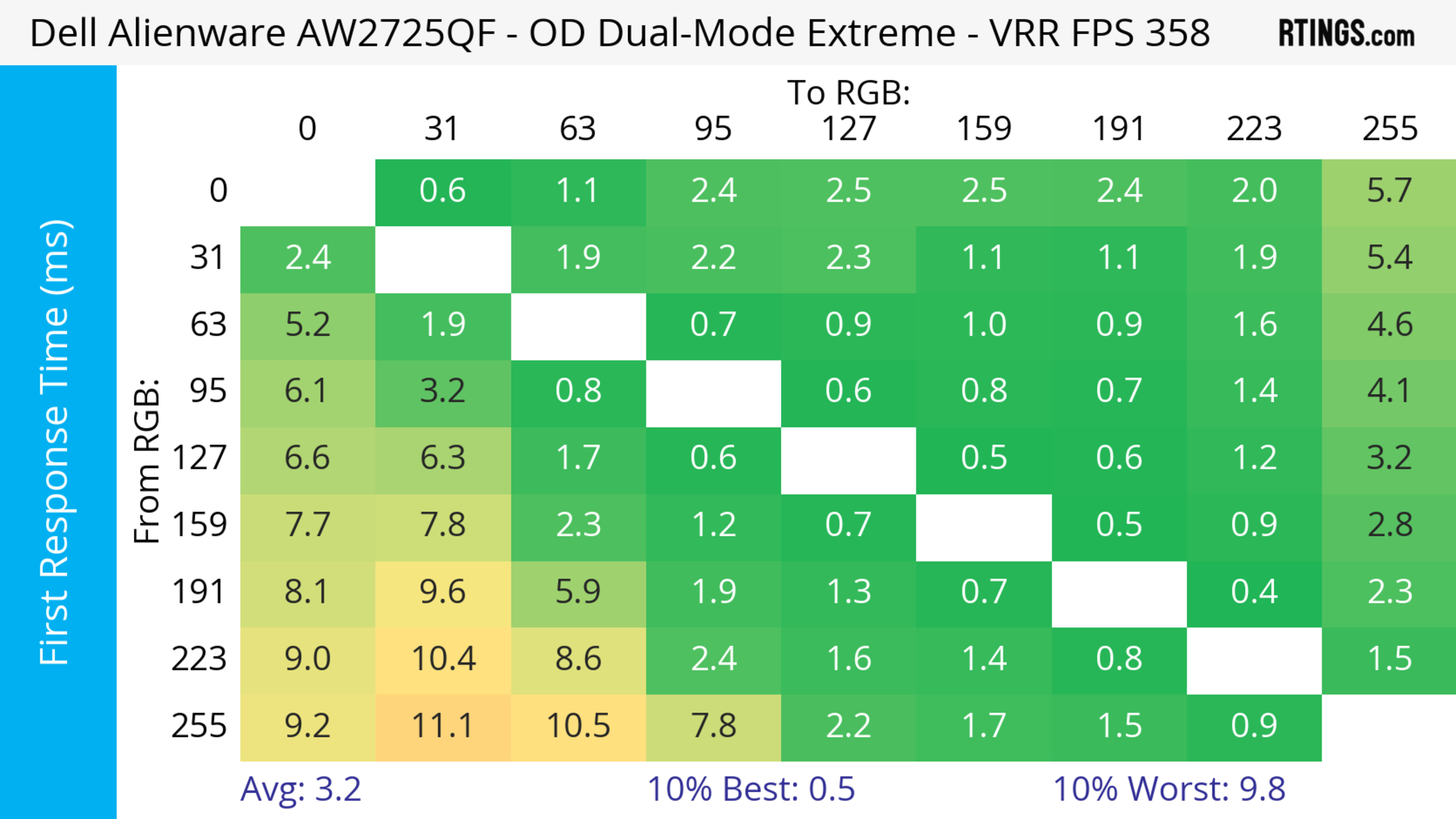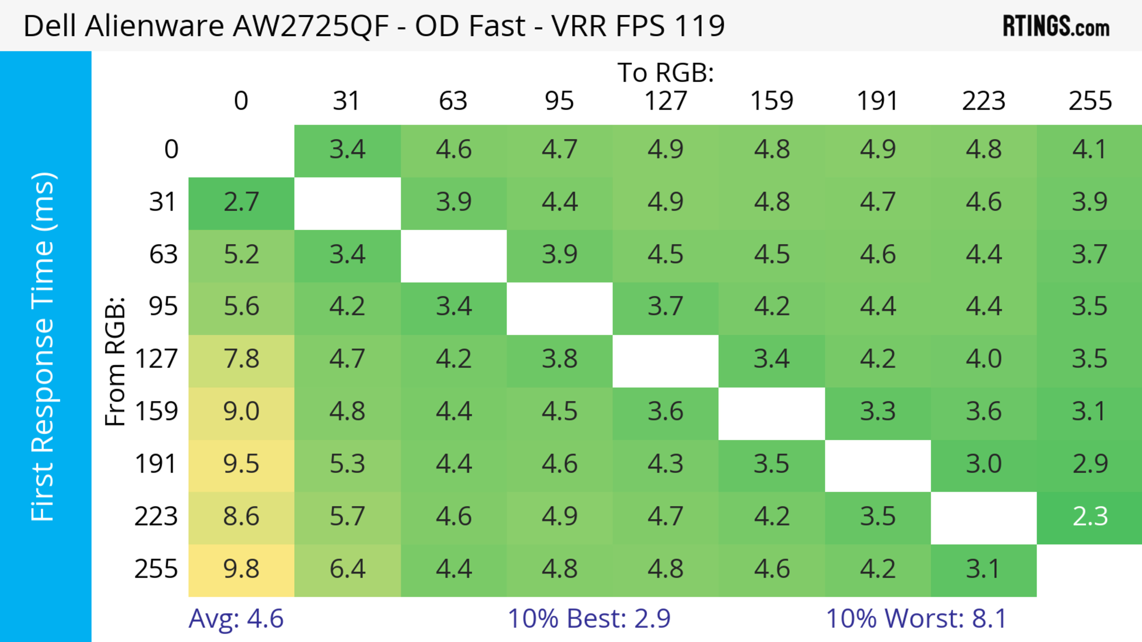 The Dell AW2725QF has low input lag for a responsive feel. These results are in the 4k Dual-Resolution mode, and the results are the same in the 1080p Dual-Resolution mode. The input lag at 360Hz is 2.6 ms.