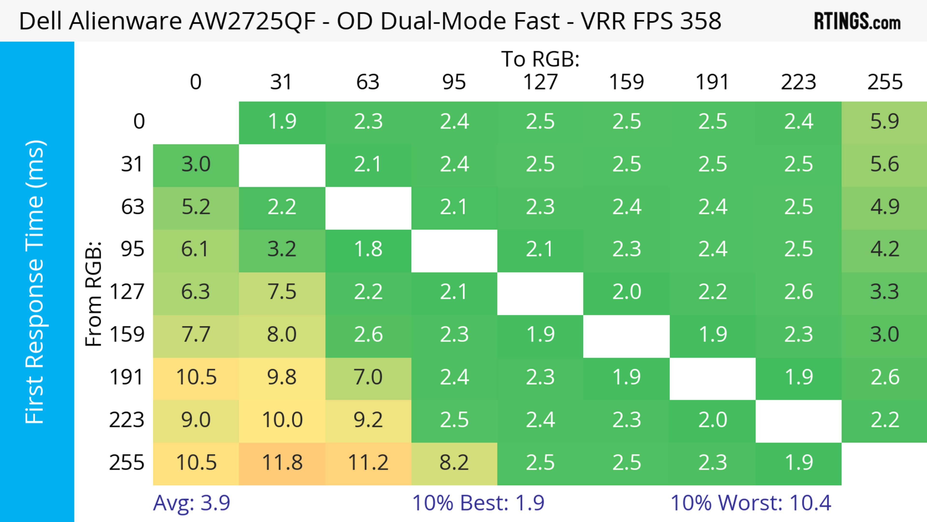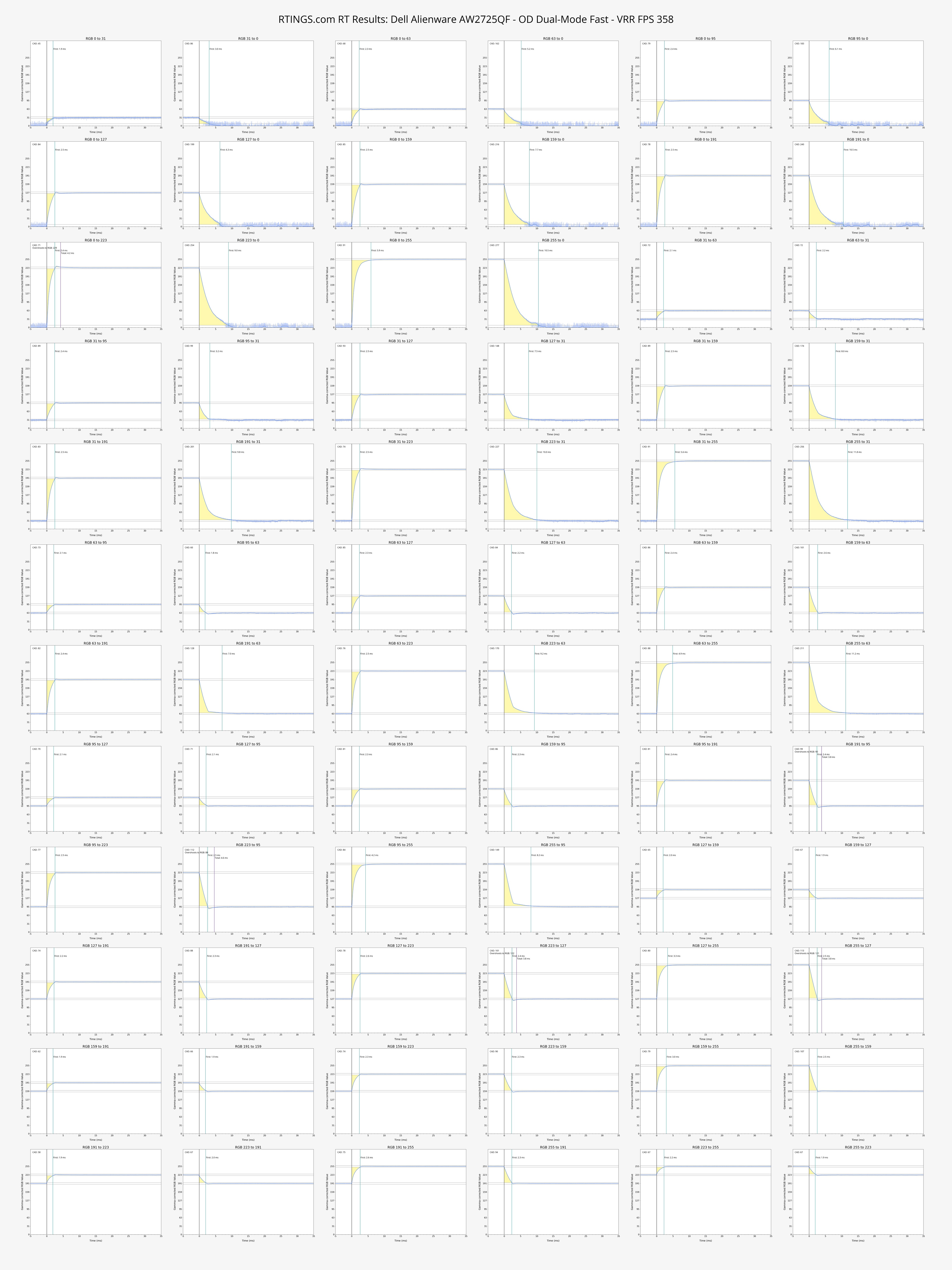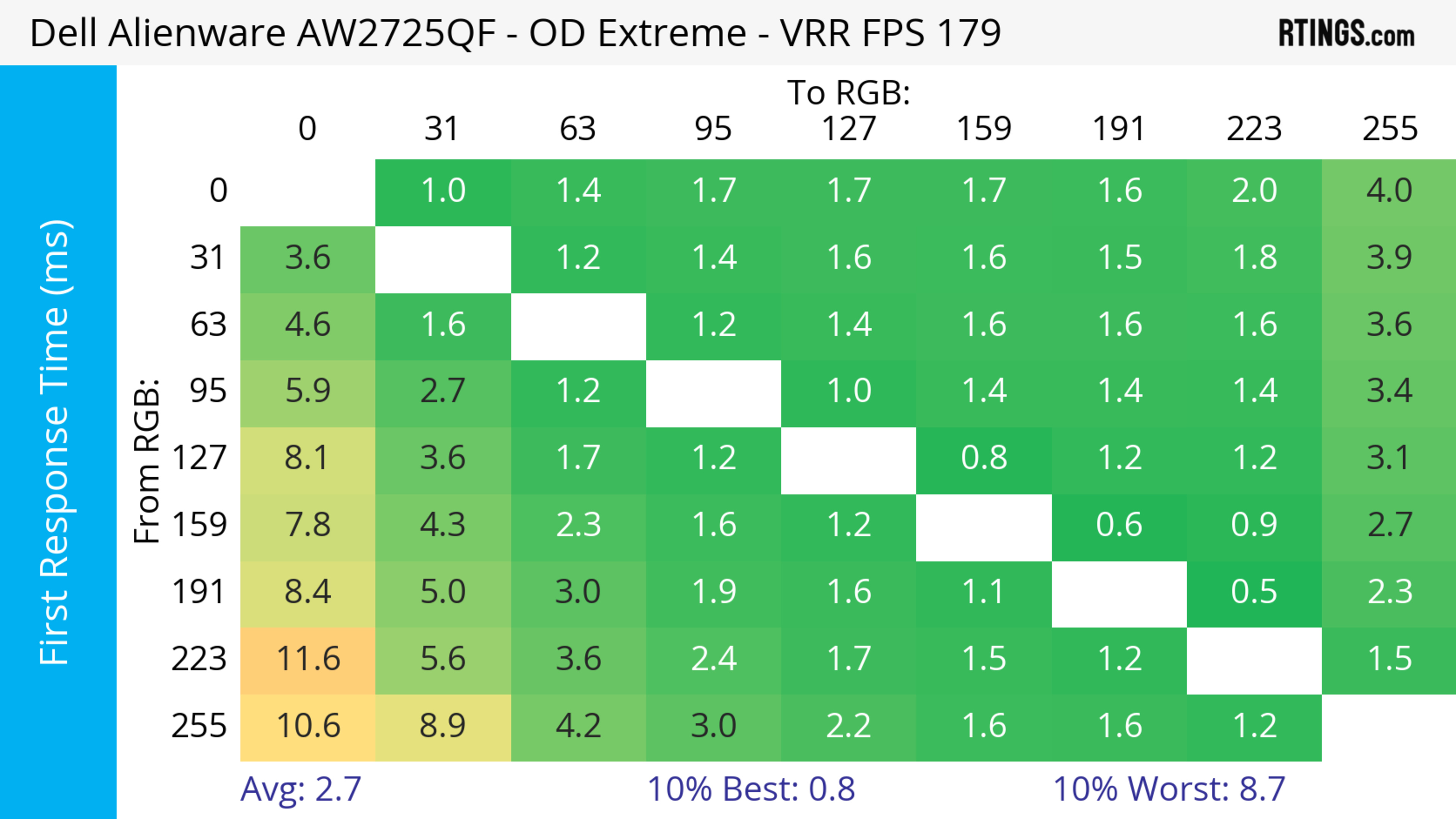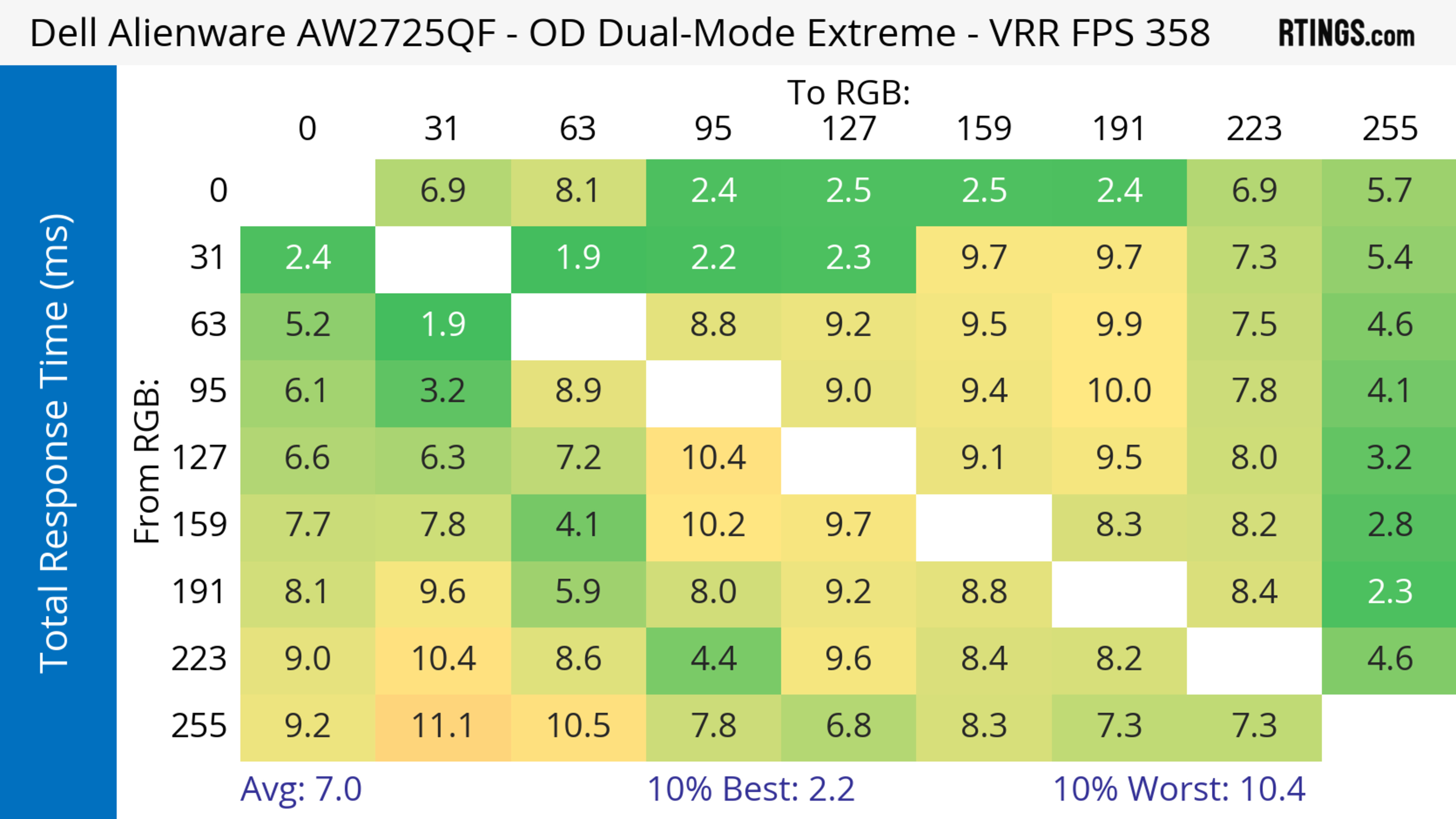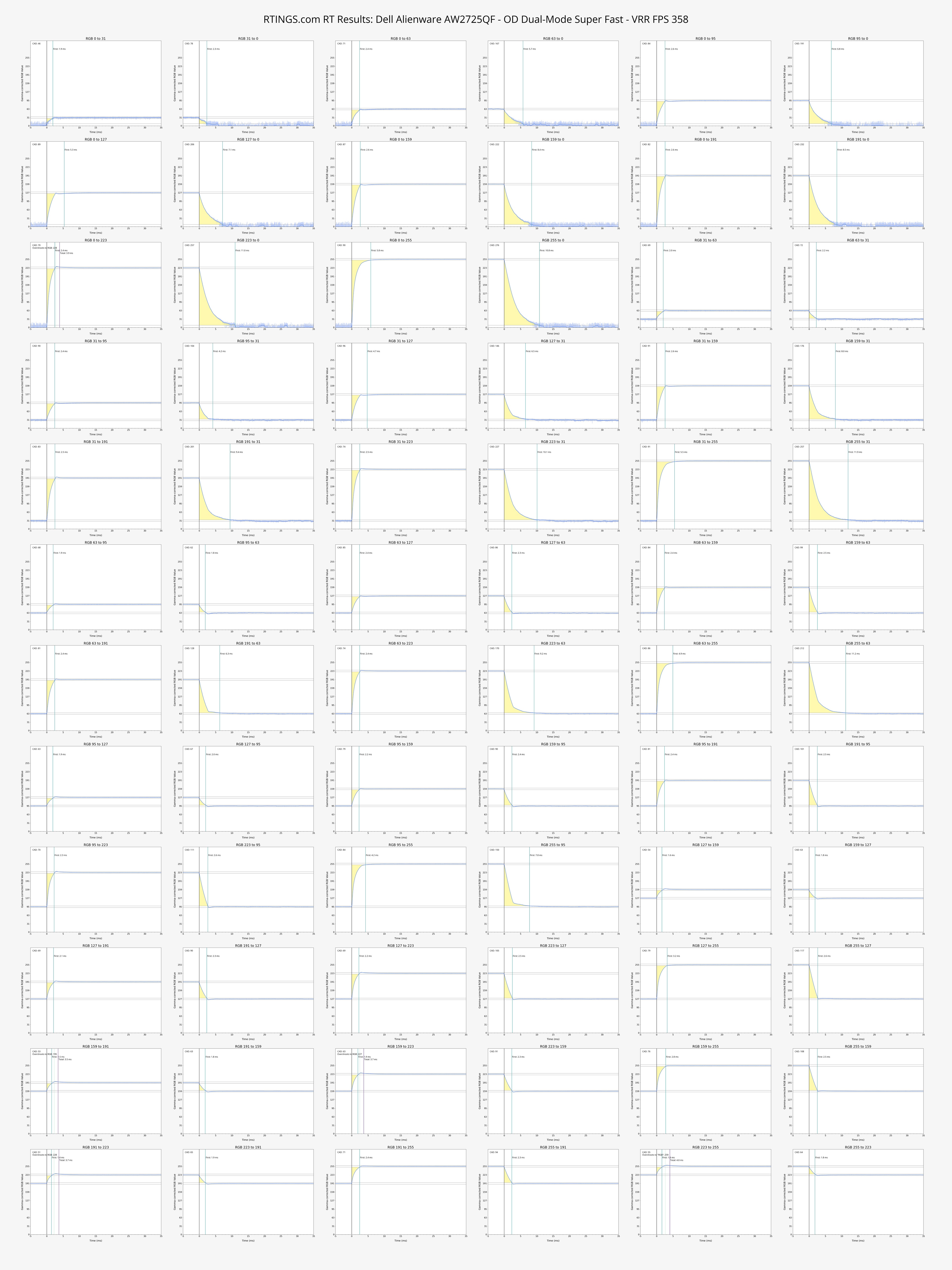 The Dell AW2725QF has low input lag for a responsive feel. These results are in the 4k Dual-Resolution mode, and the results are the same in the 1080p Dual-Resolution mode. The input lag at 360Hz is 2.6 ms.