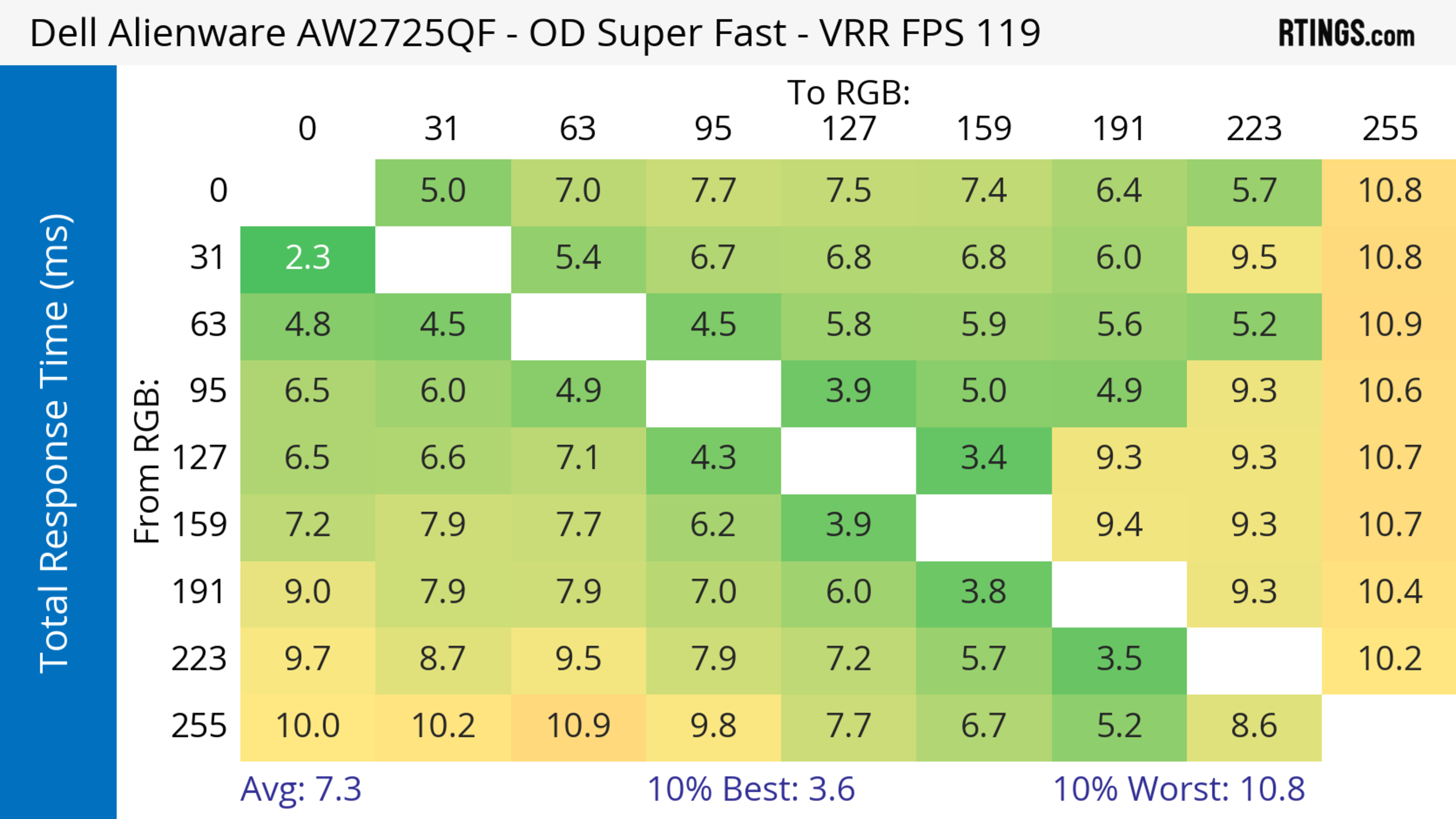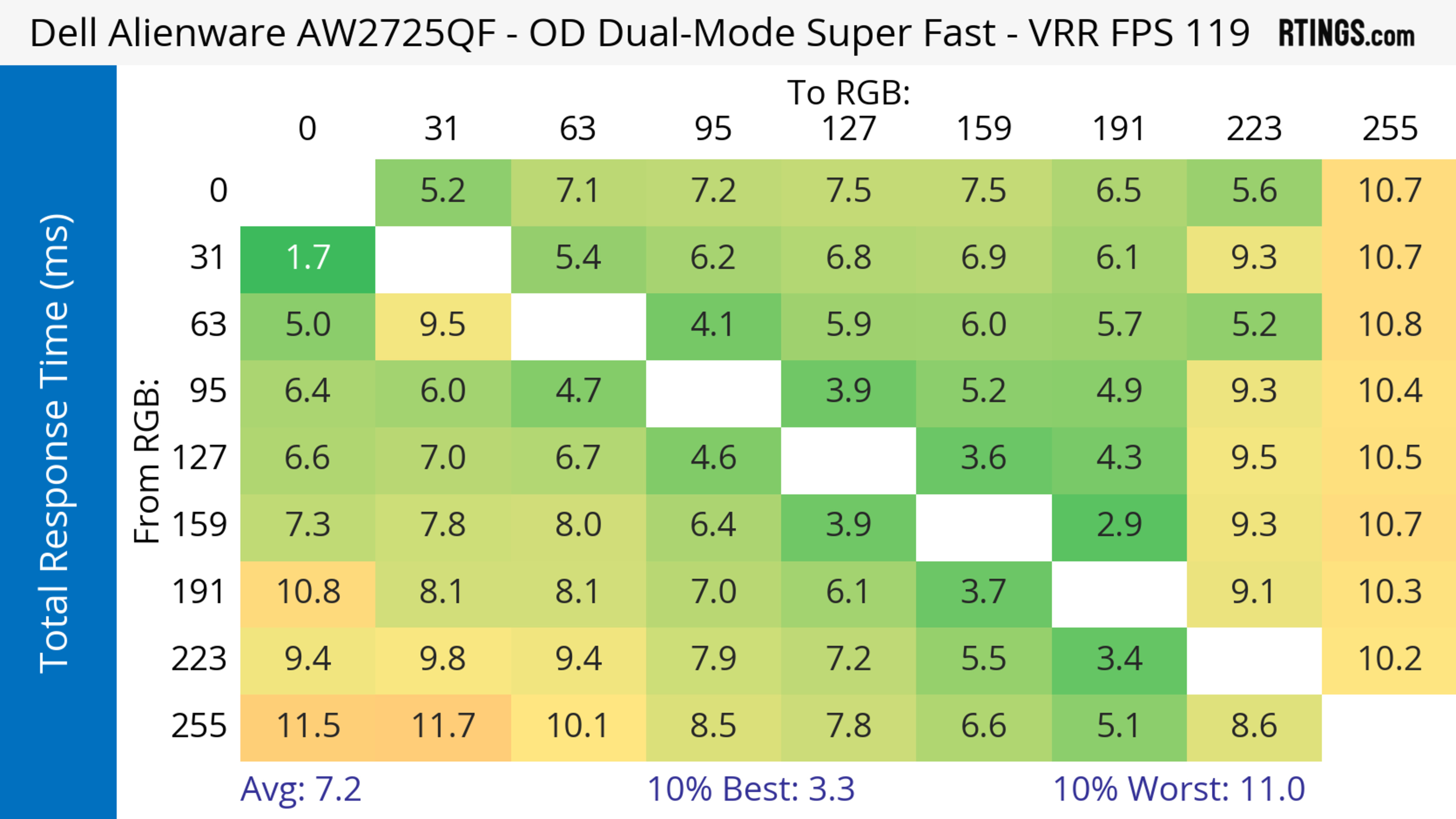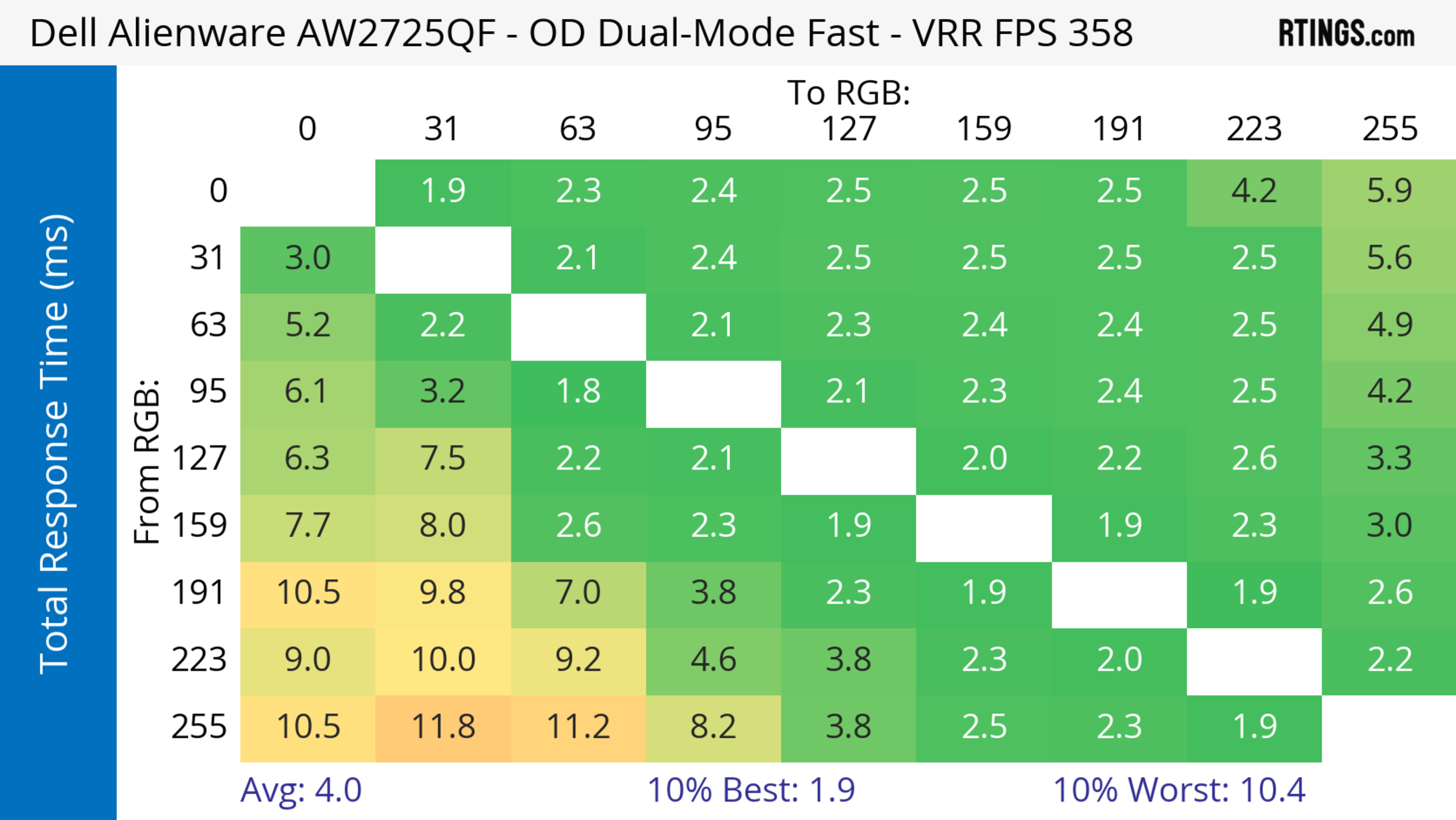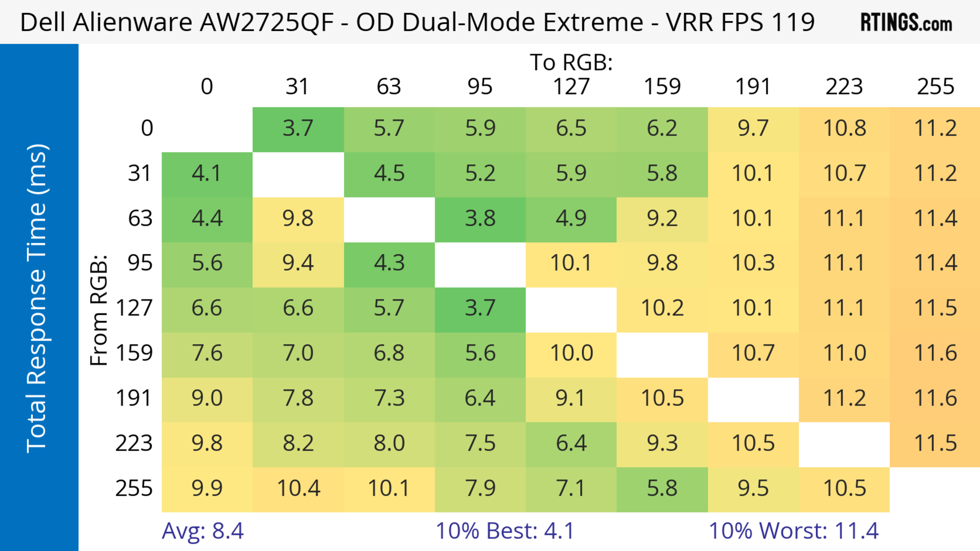 The Dell AW2725QF has low input lag for a responsive feel. These results are in the 4k Dual-Resolution mode, and the results are the same in the 1080p Dual-Resolution mode. The input lag at 360Hz is 2.6 ms.