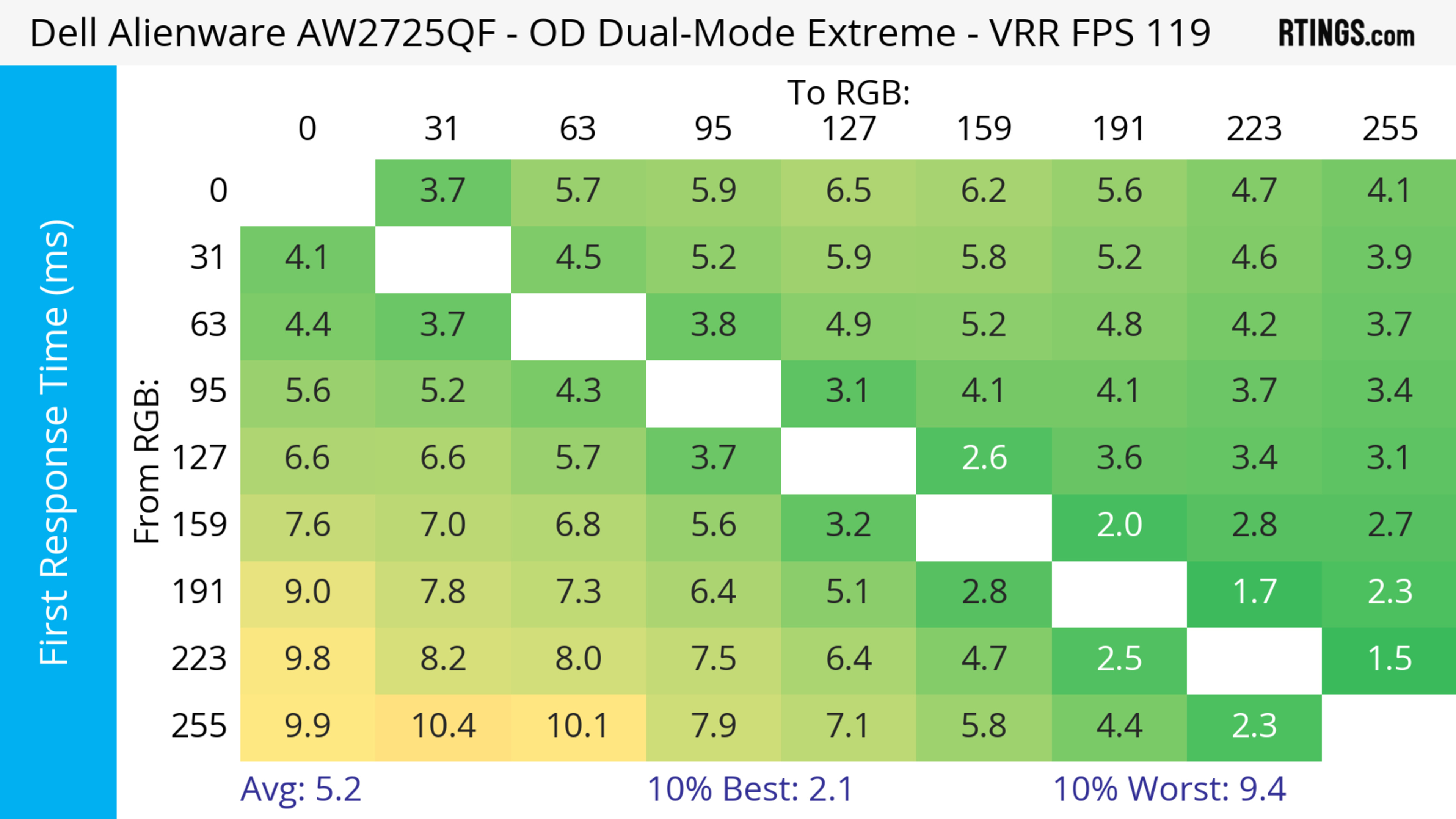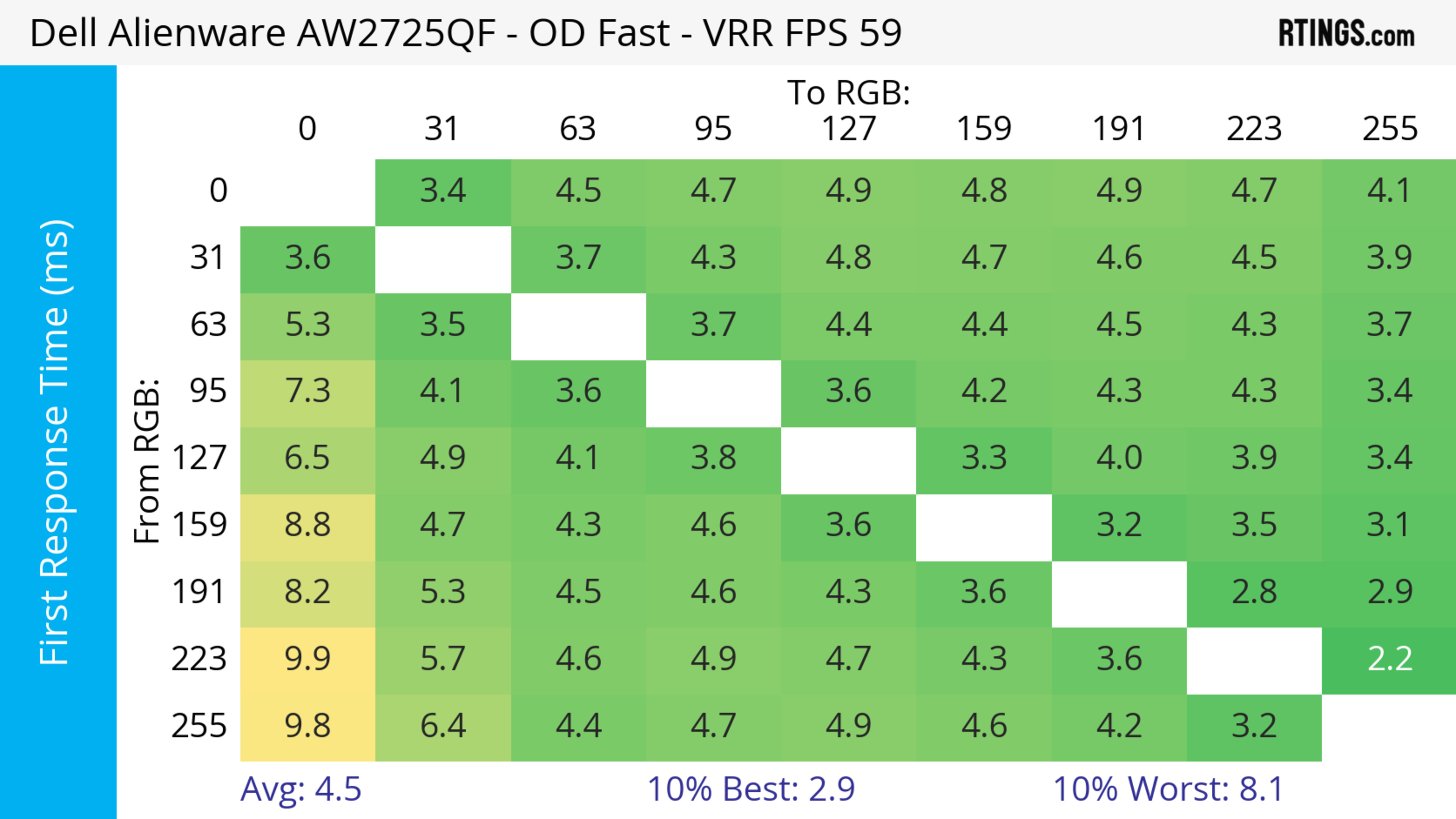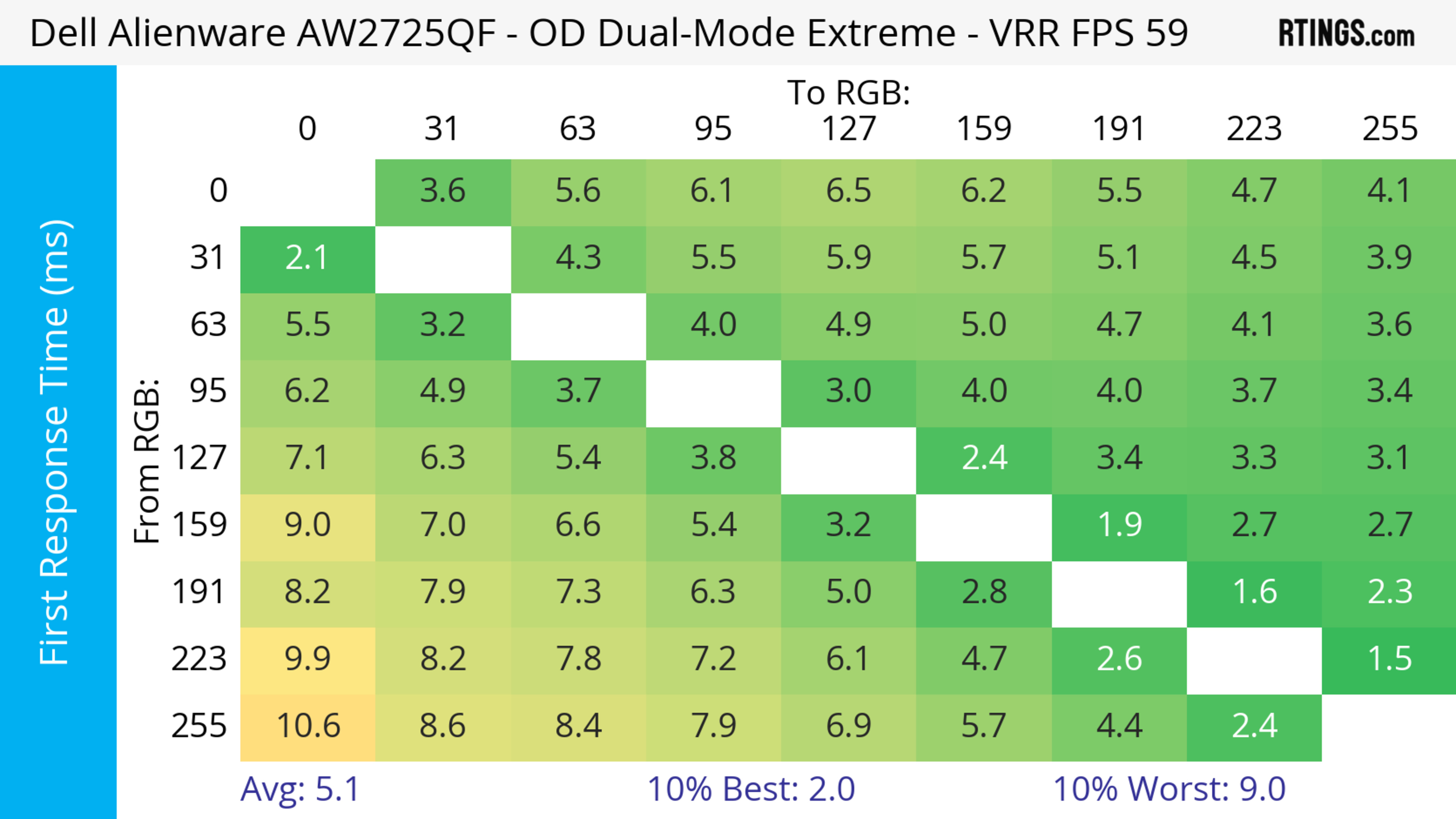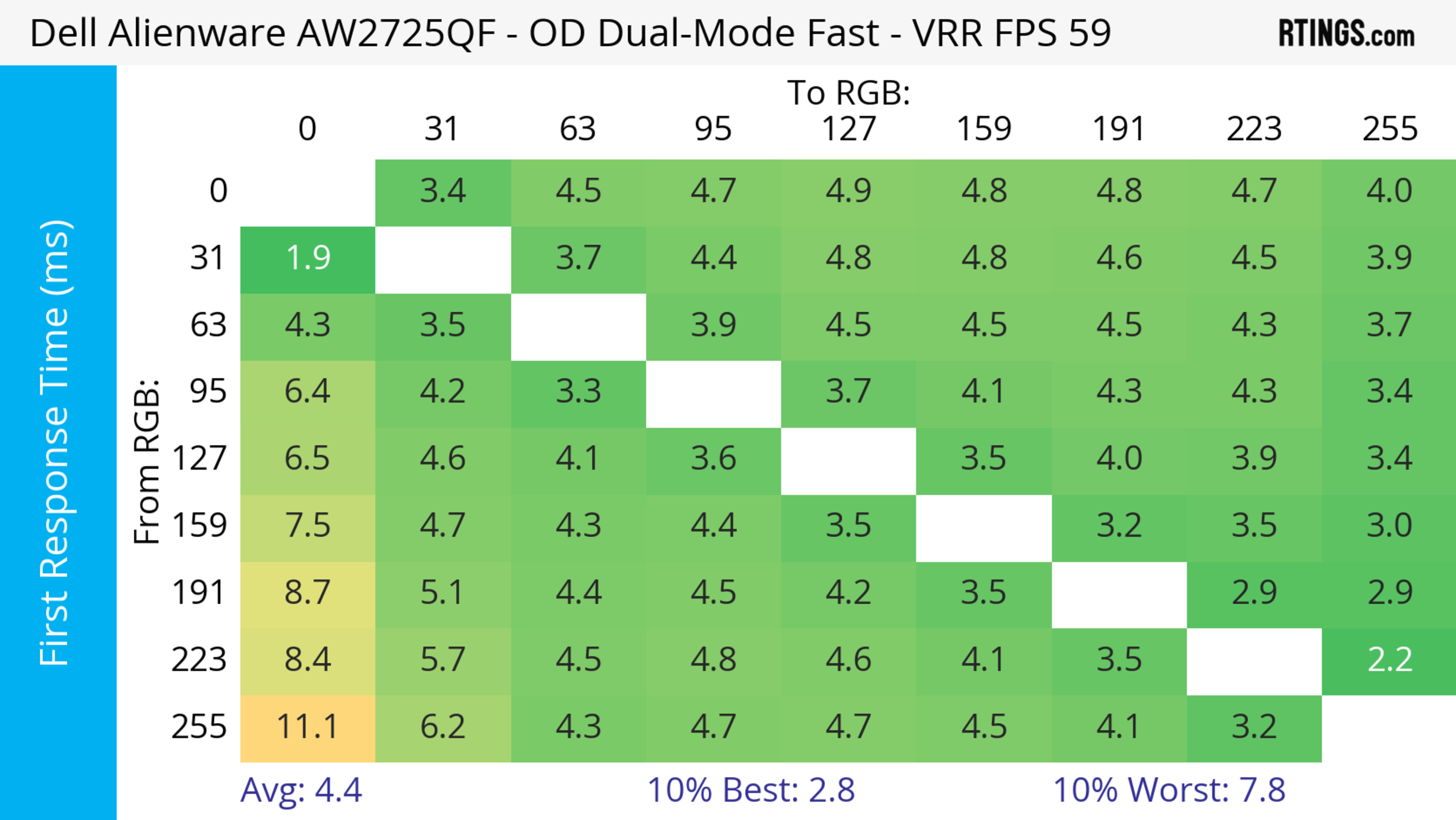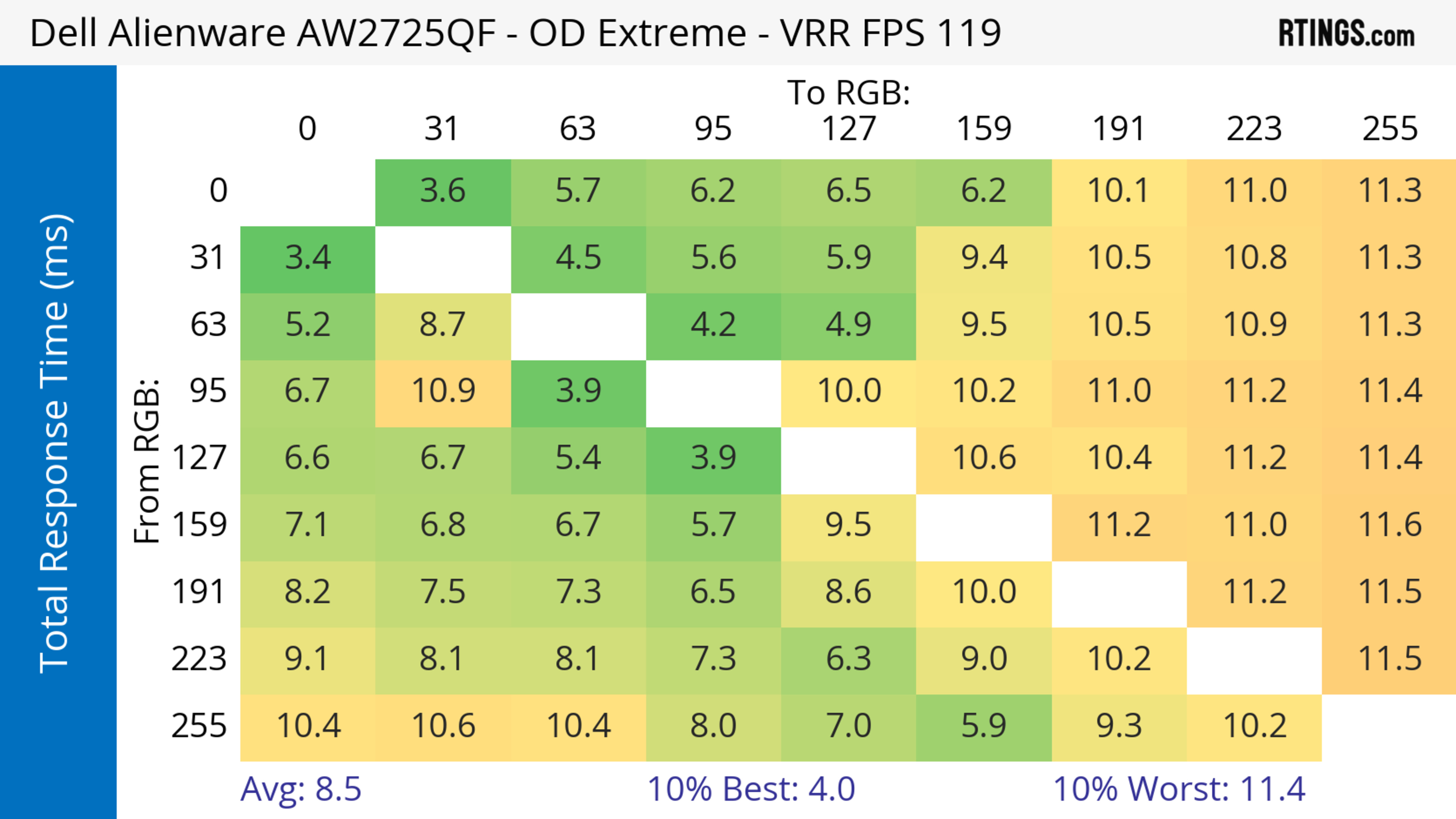 The Dell AW2725QF has low input lag for a responsive feel. These results are in the 4k Dual-Resolution mode, and the results are the same in the 1080p Dual-Resolution mode. The input lag at 360Hz is 2.6 ms.