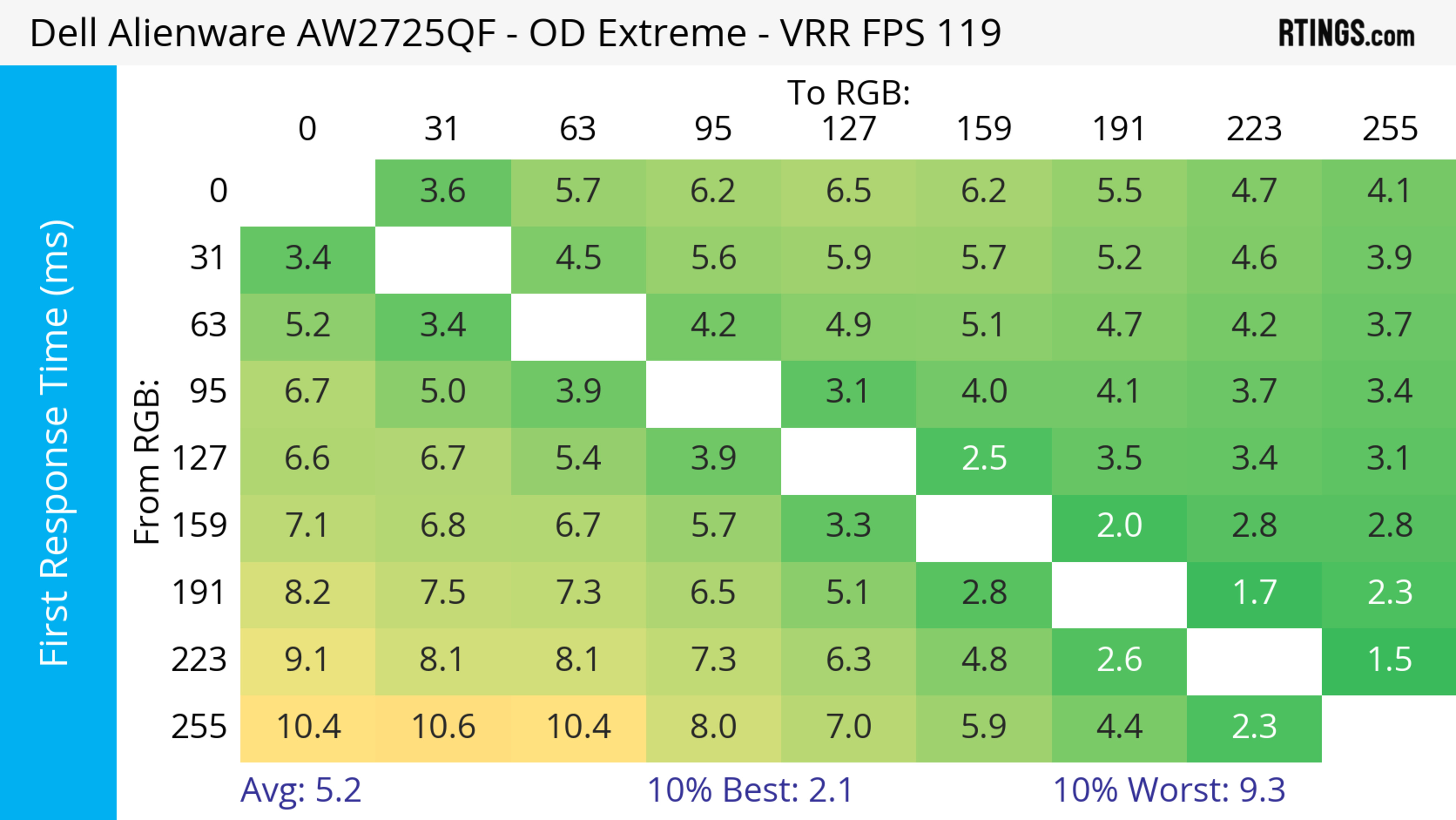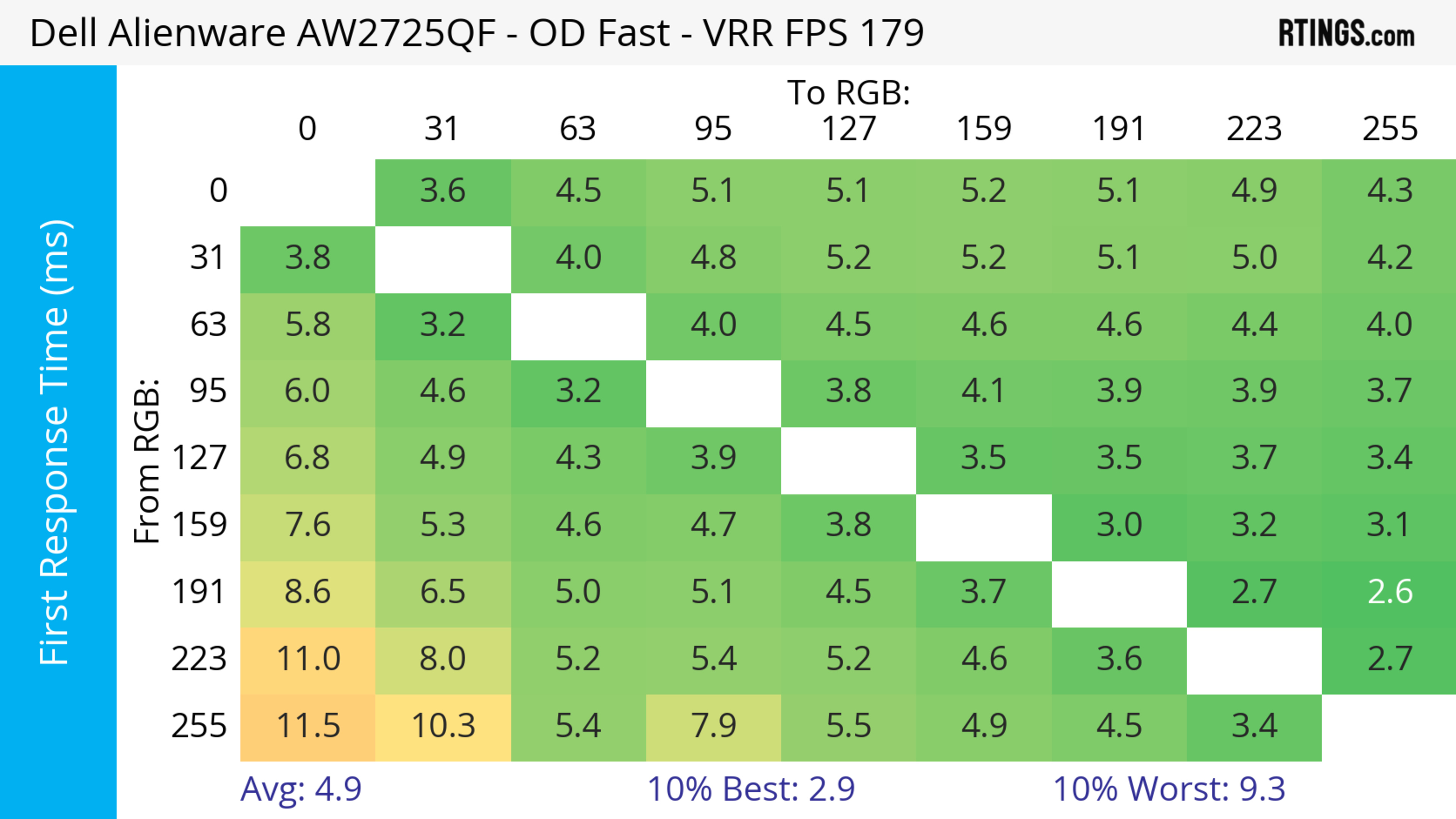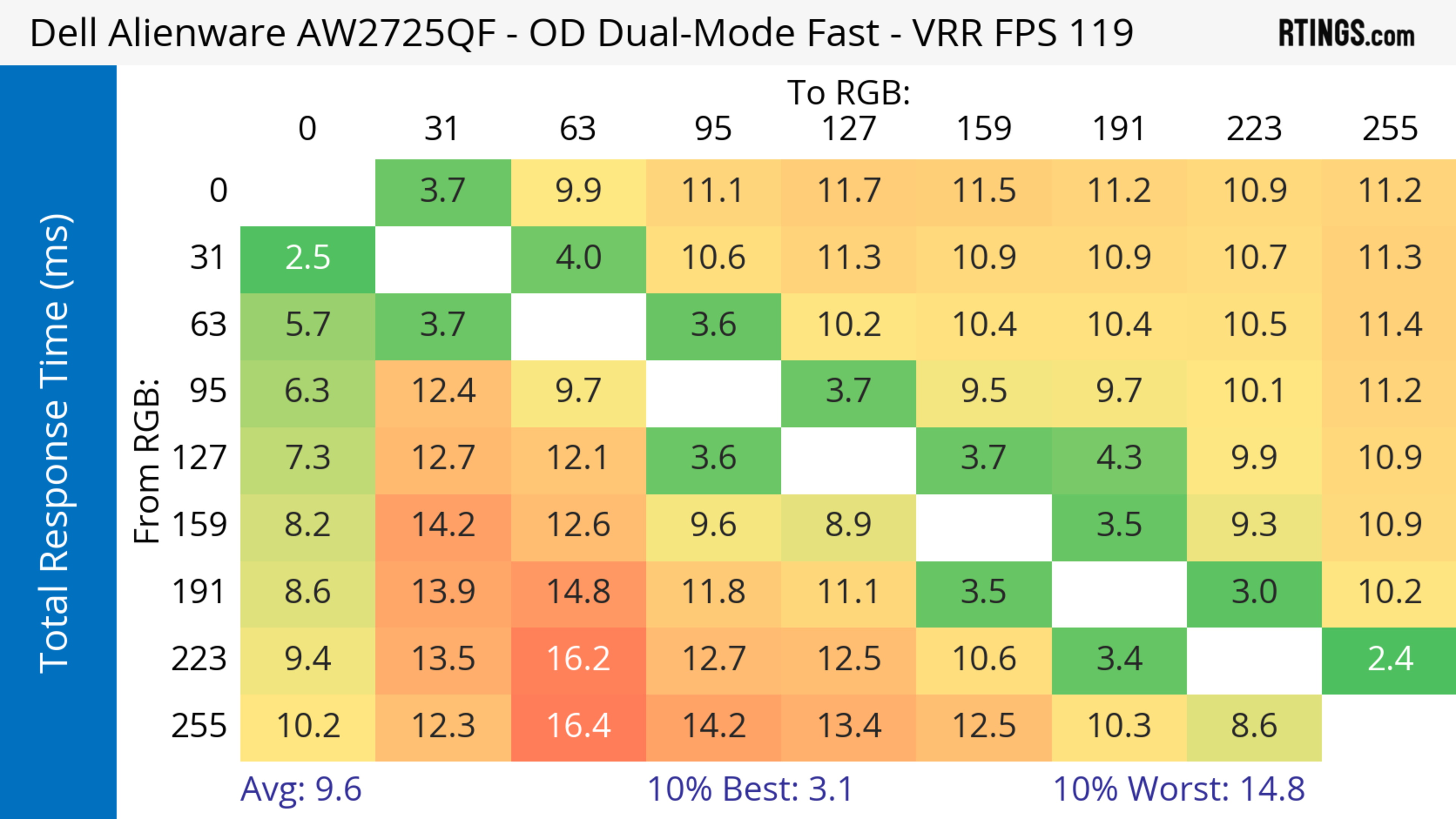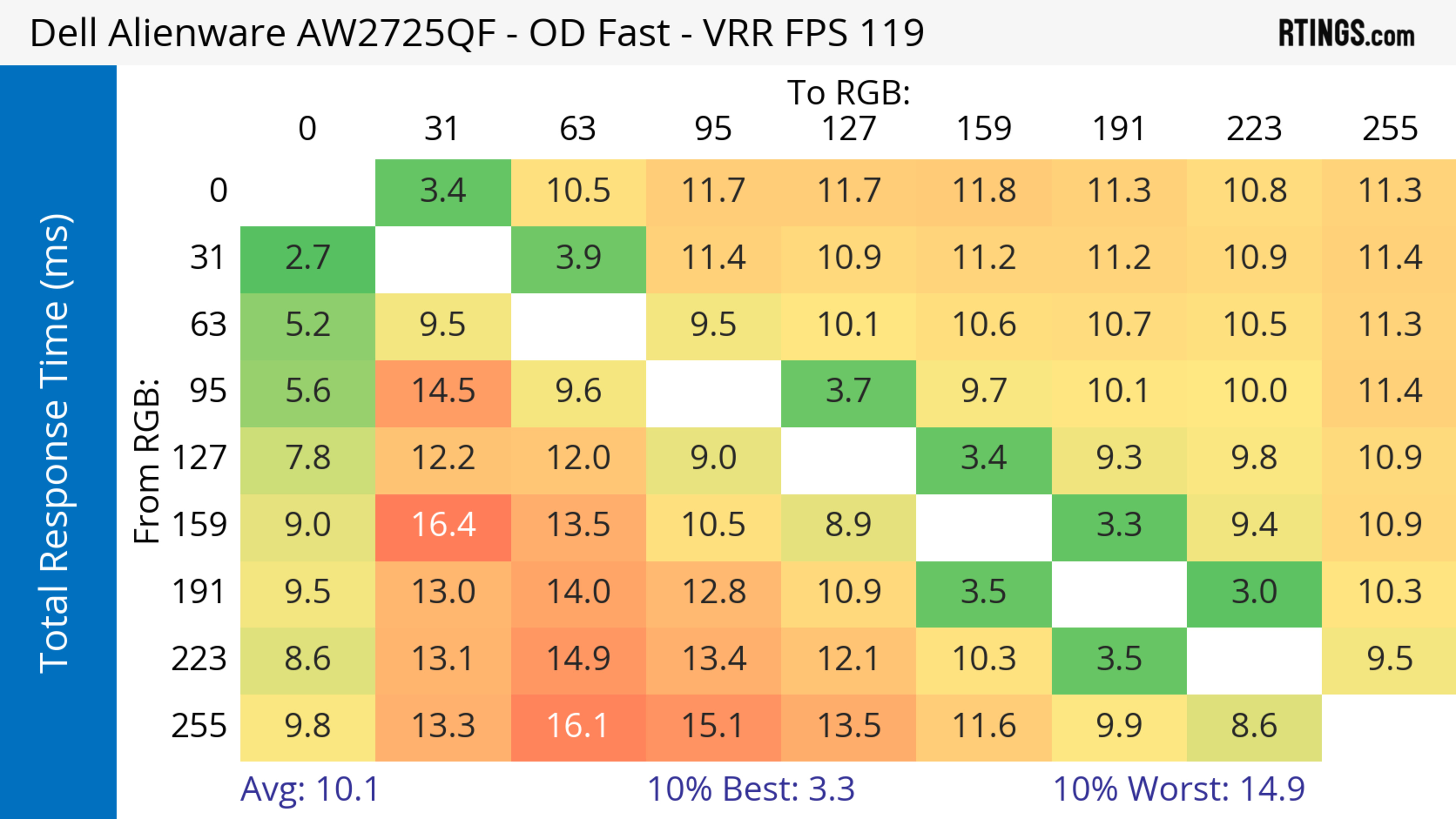 The Dell AW2725QF has low input lag for a responsive feel. These results are in the 4k Dual-Resolution mode, and the results are the same in the 1080p Dual-Resolution mode. The input lag at 360Hz is 2.6 ms.