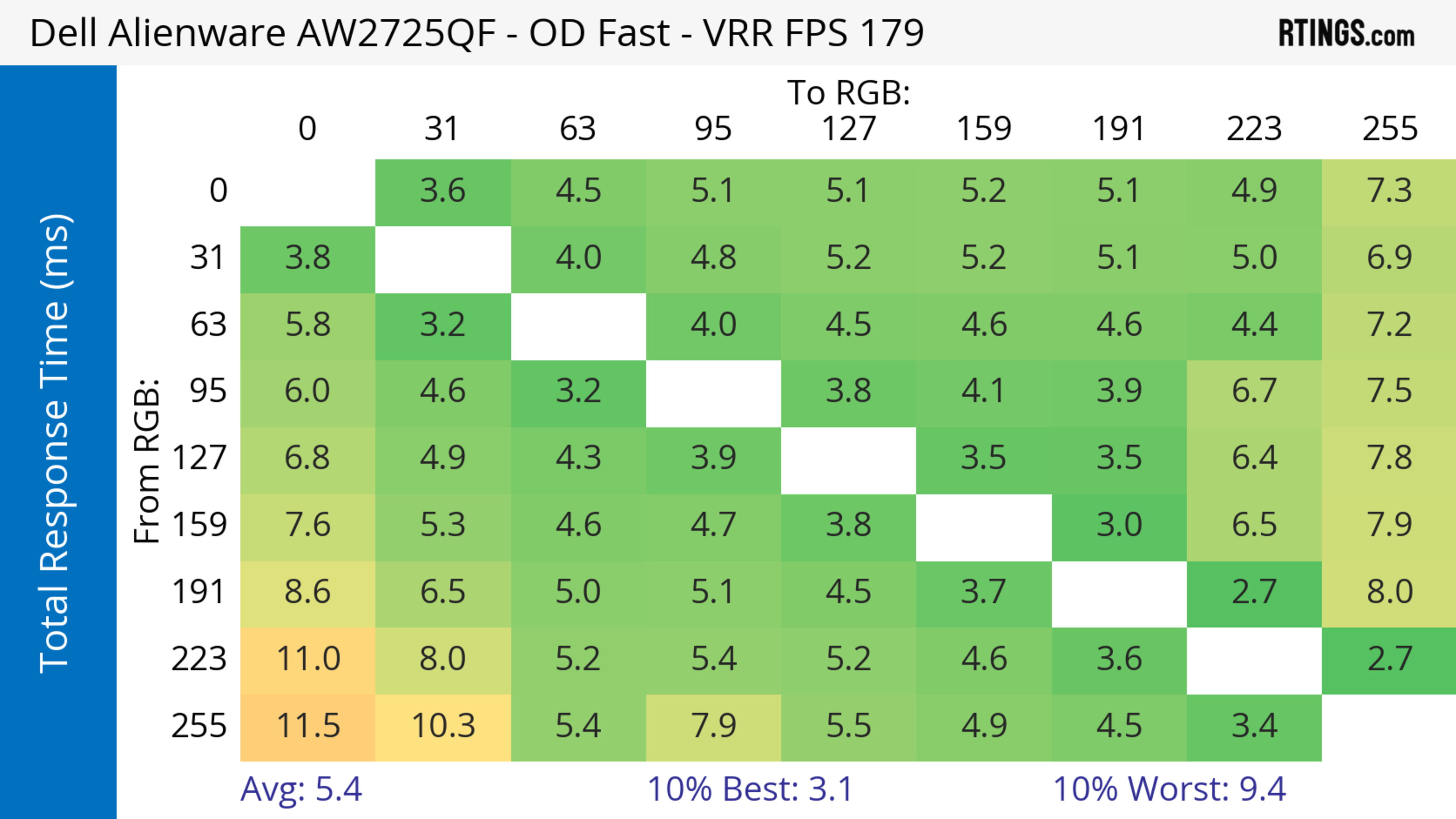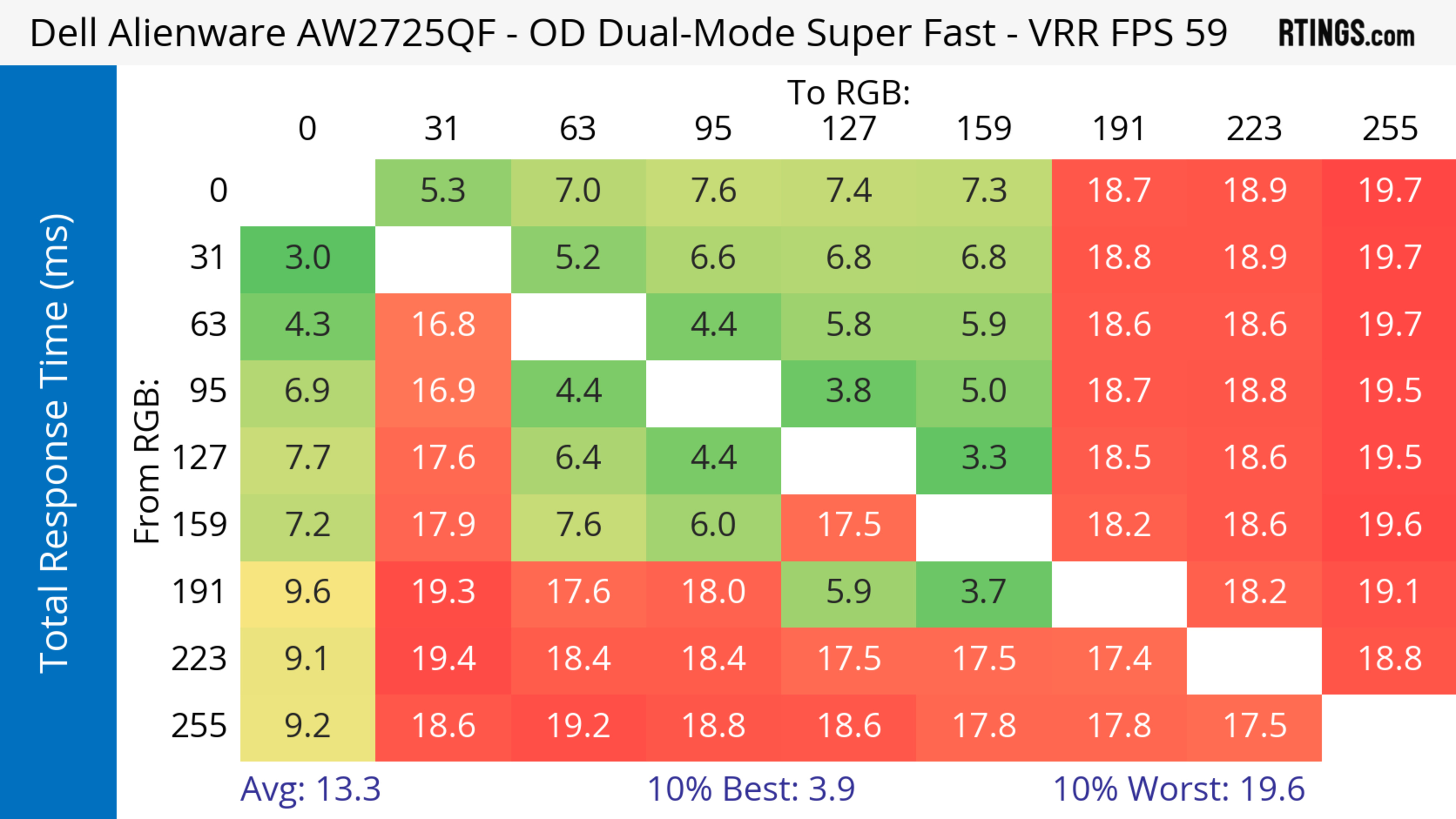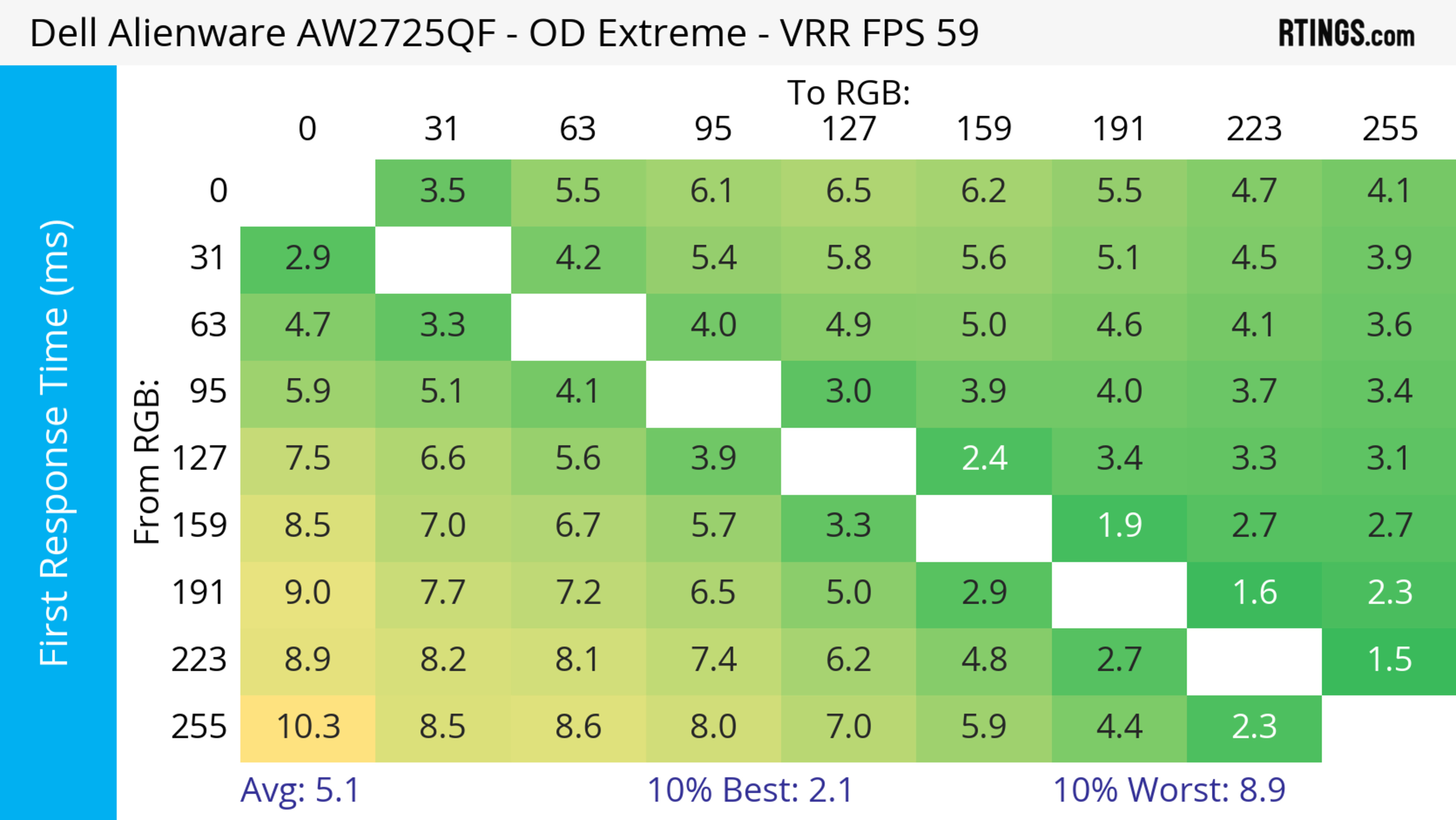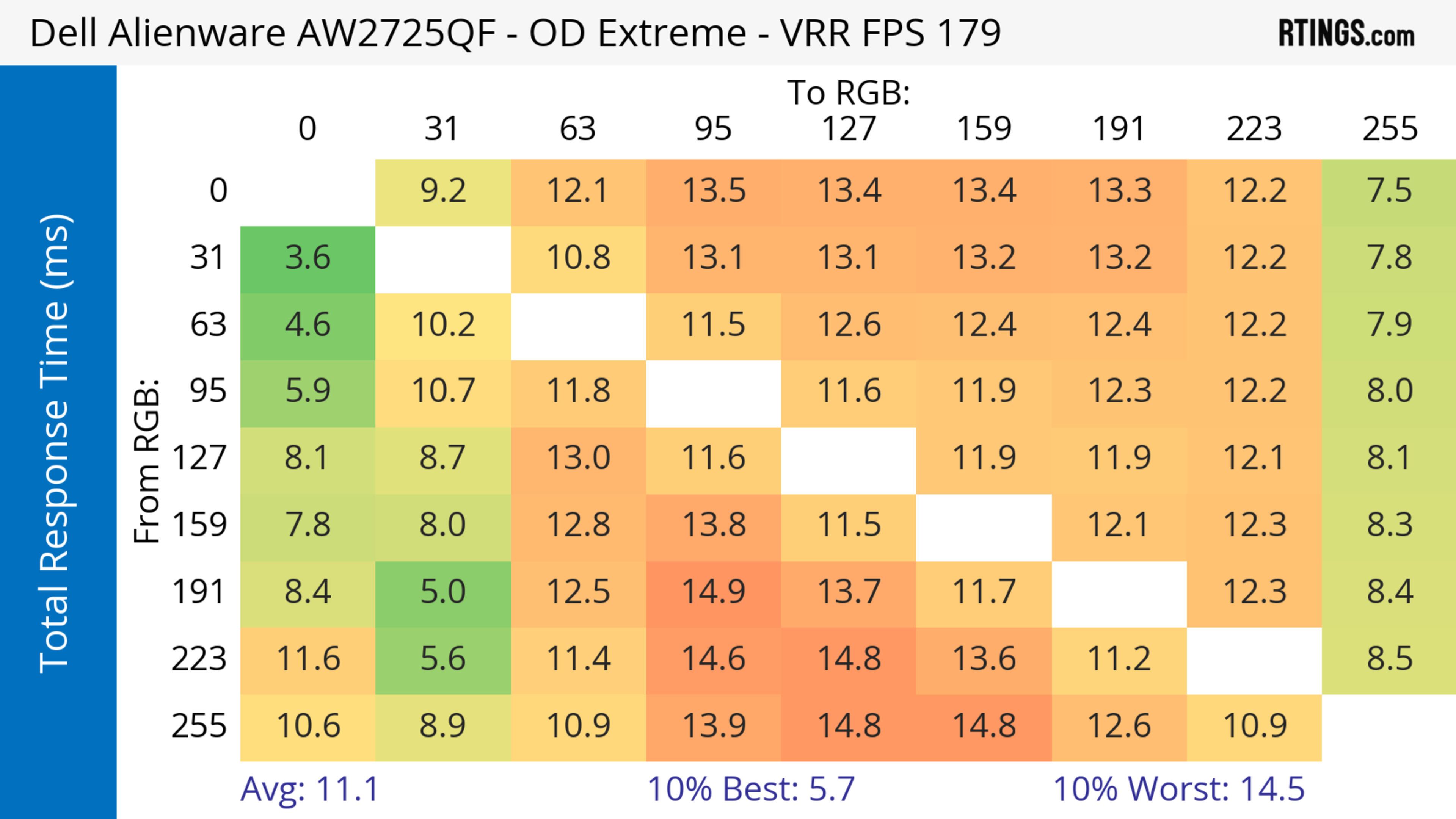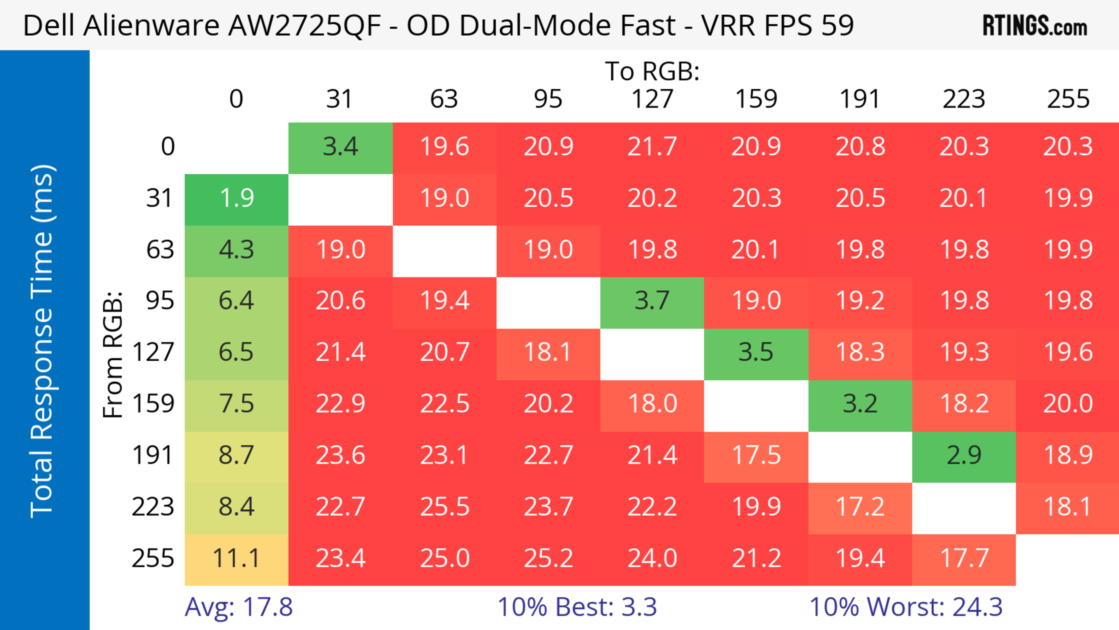 The Dell AW2725QF has low input lag for a responsive feel. These results are in the 4k Dual-Resolution mode, and the results are the same in the 1080p Dual-Resolution mode. The input lag at 360Hz is 2.6 ms.