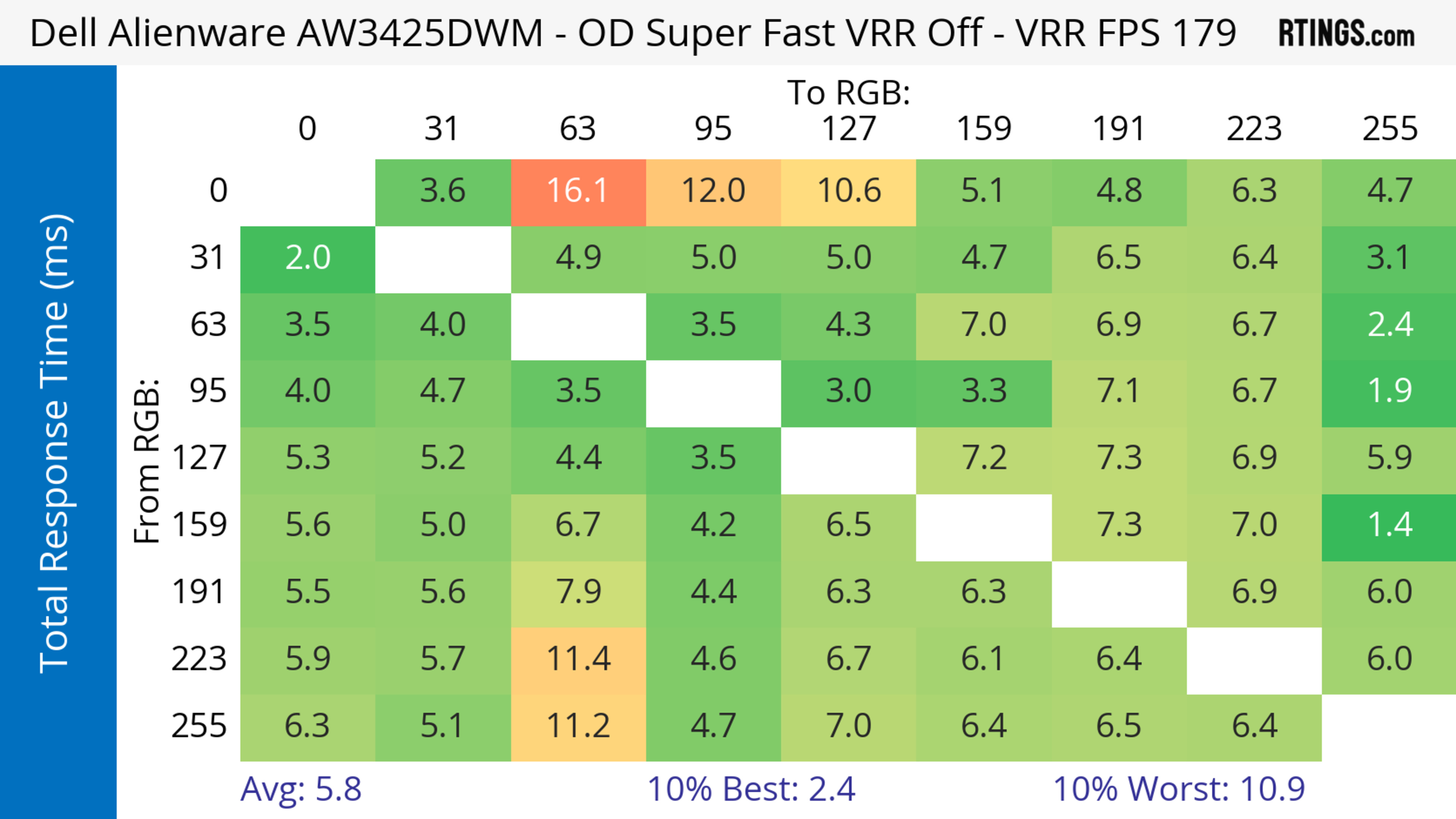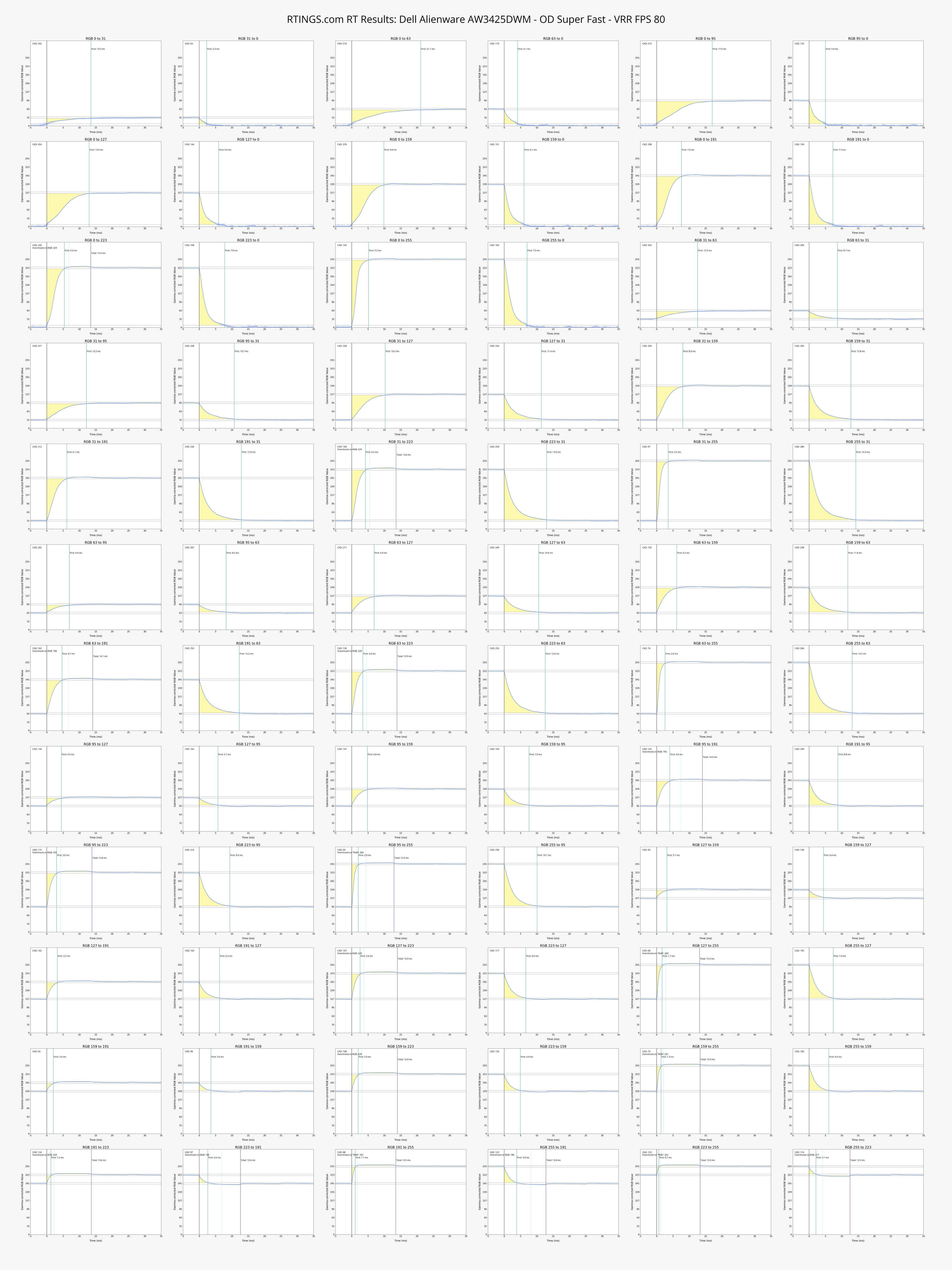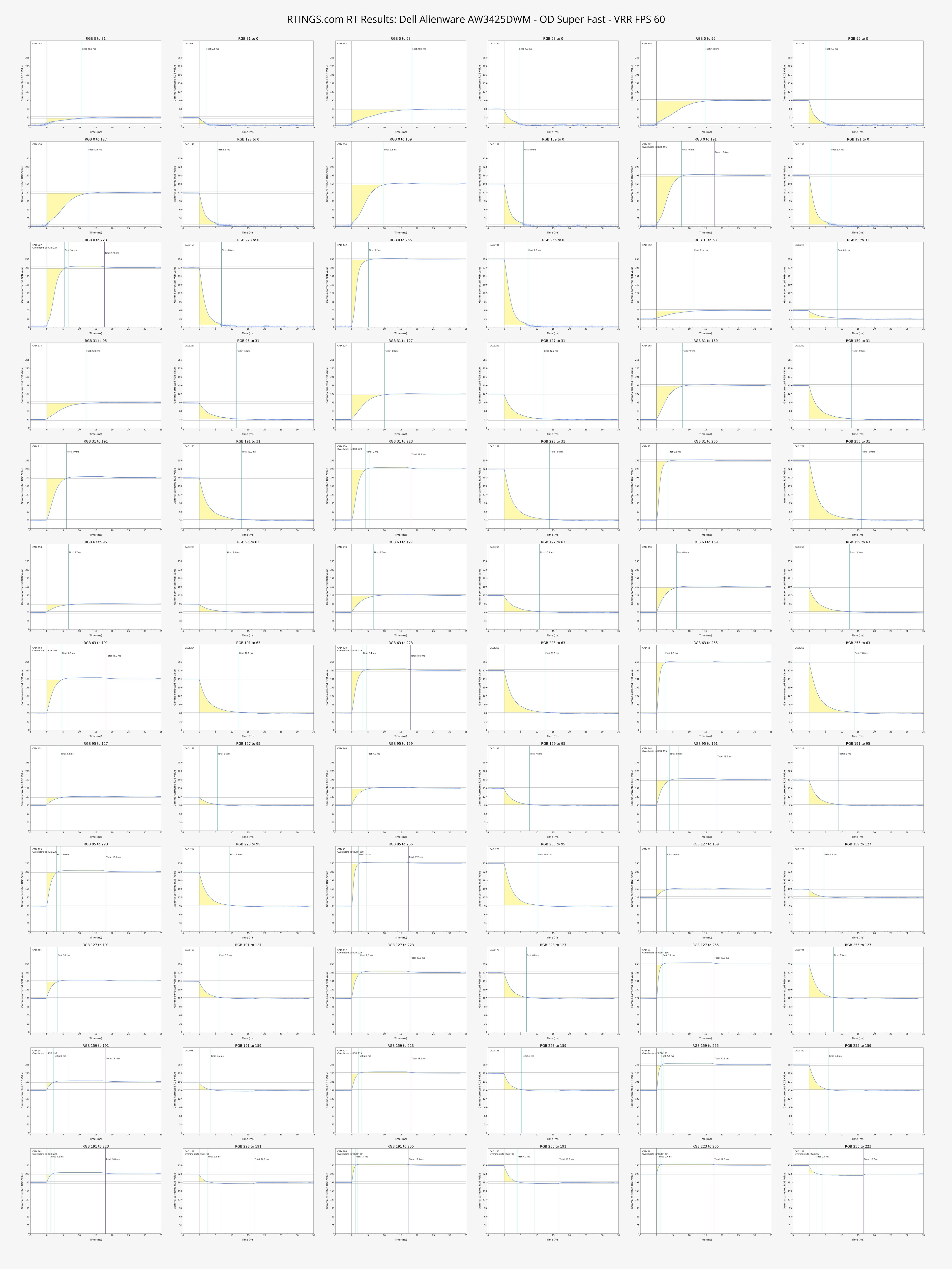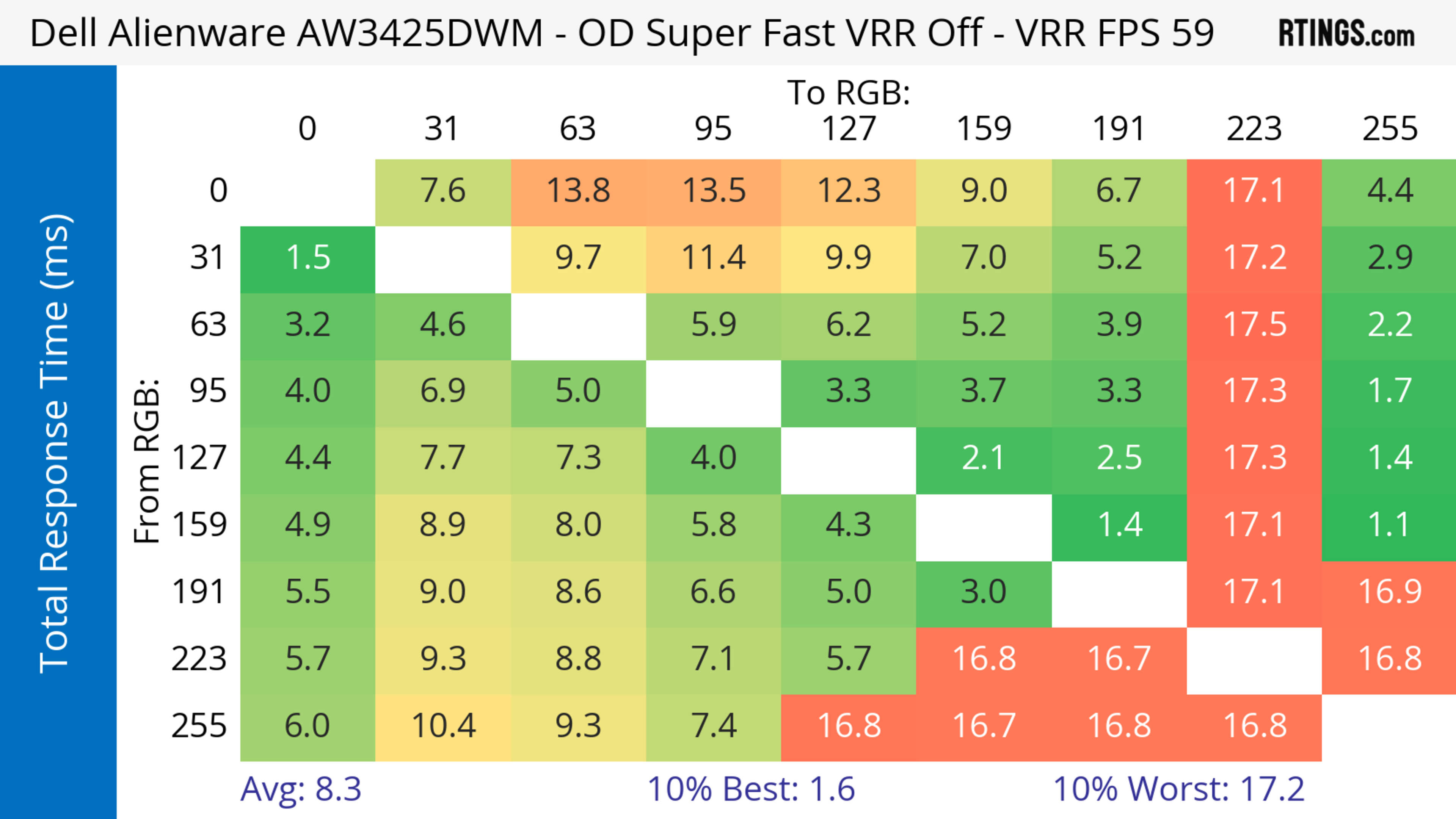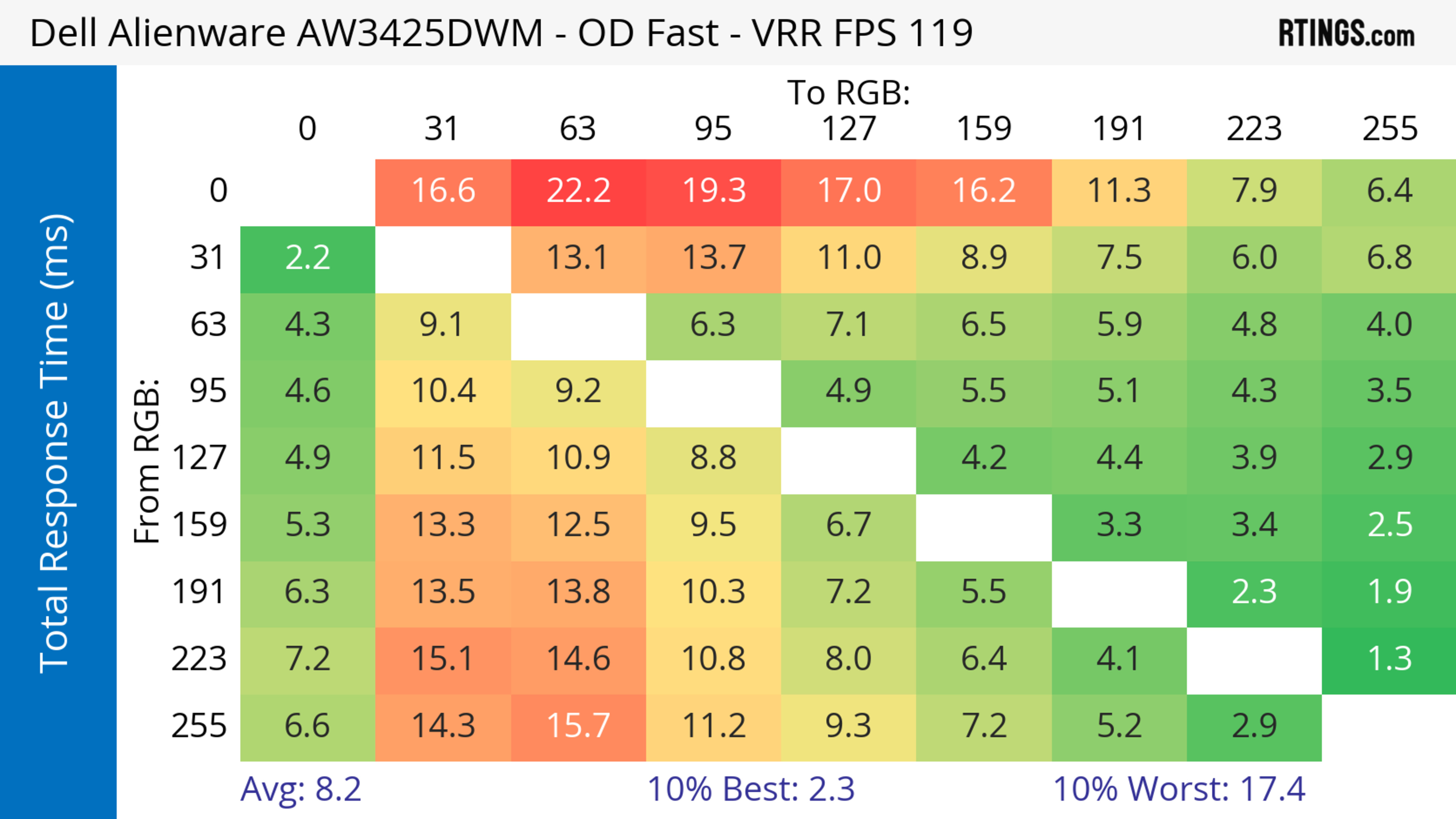 The Dell AW3425DWM has good motion handling across its VRR range. The 'Super Fast' Response Time setting is consistent as the refresh rate drops, but it has a slow response time with most transitions, particularly when going from dark to brighter colors, leading to black smearing behind fast-moving objects.