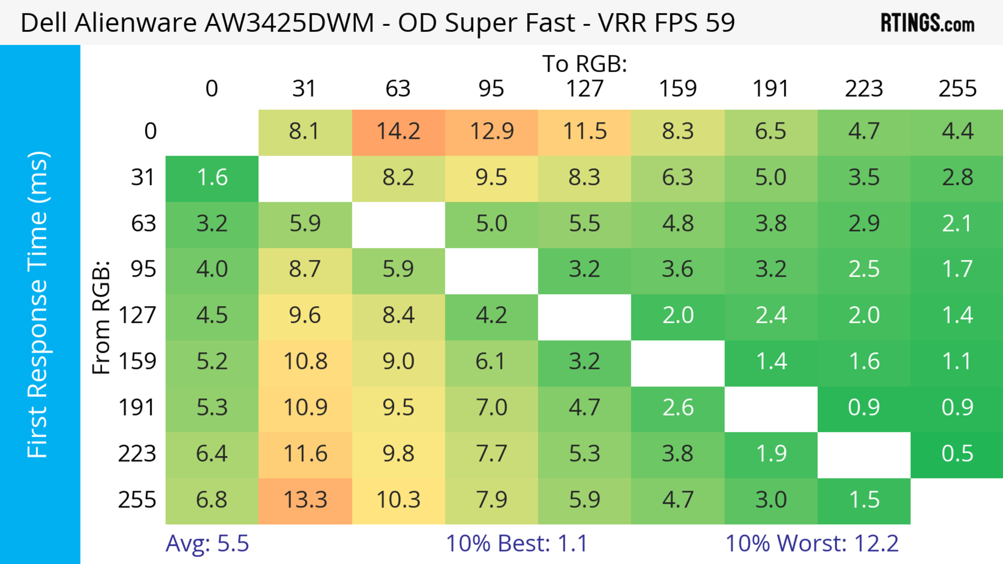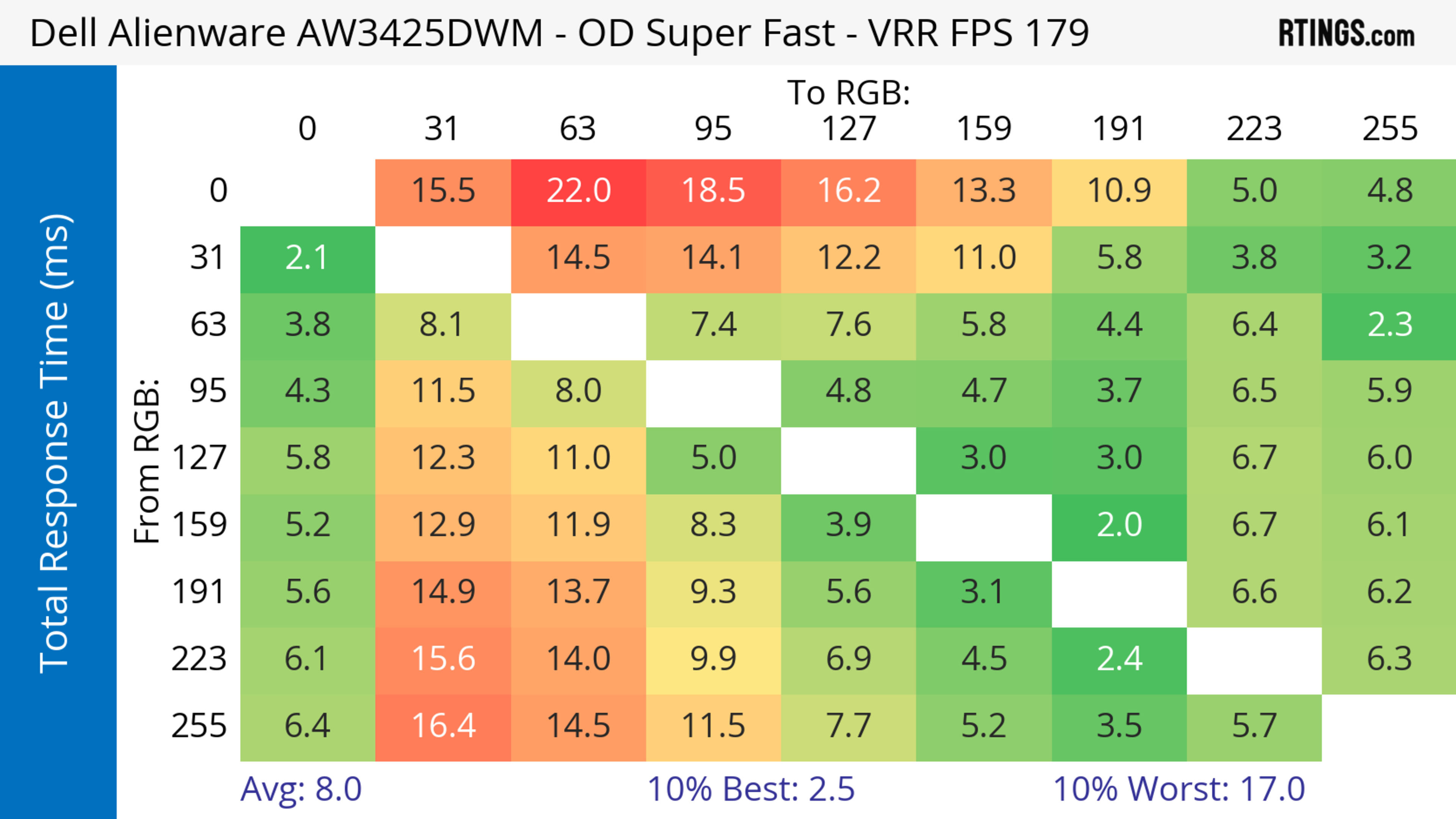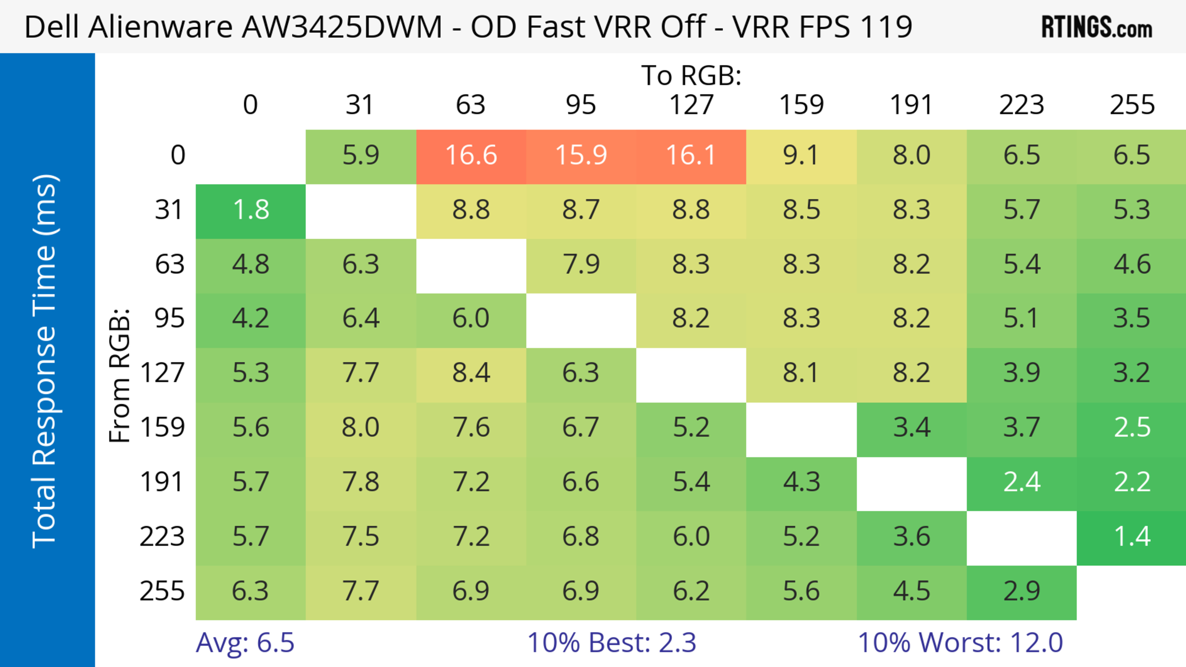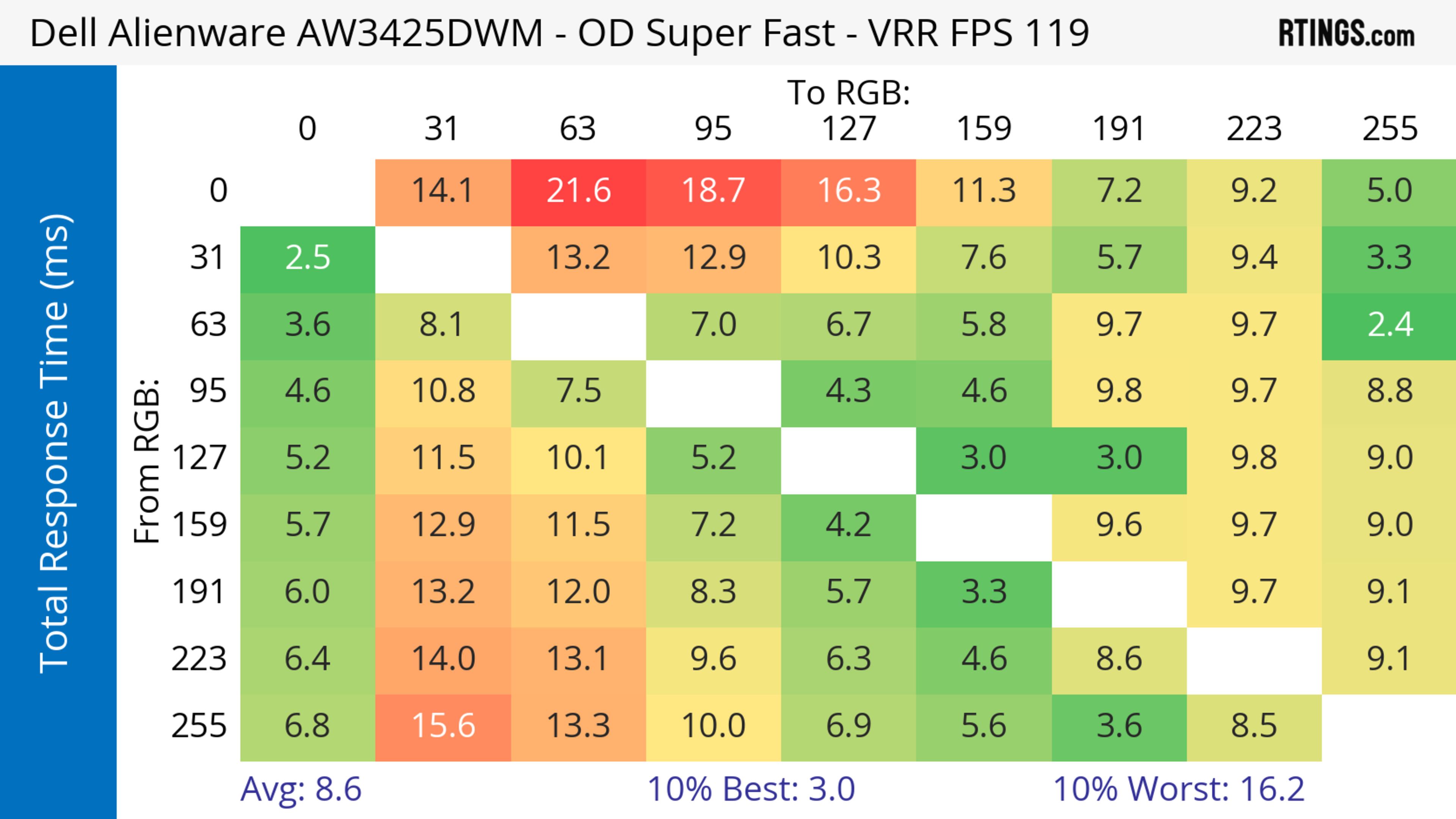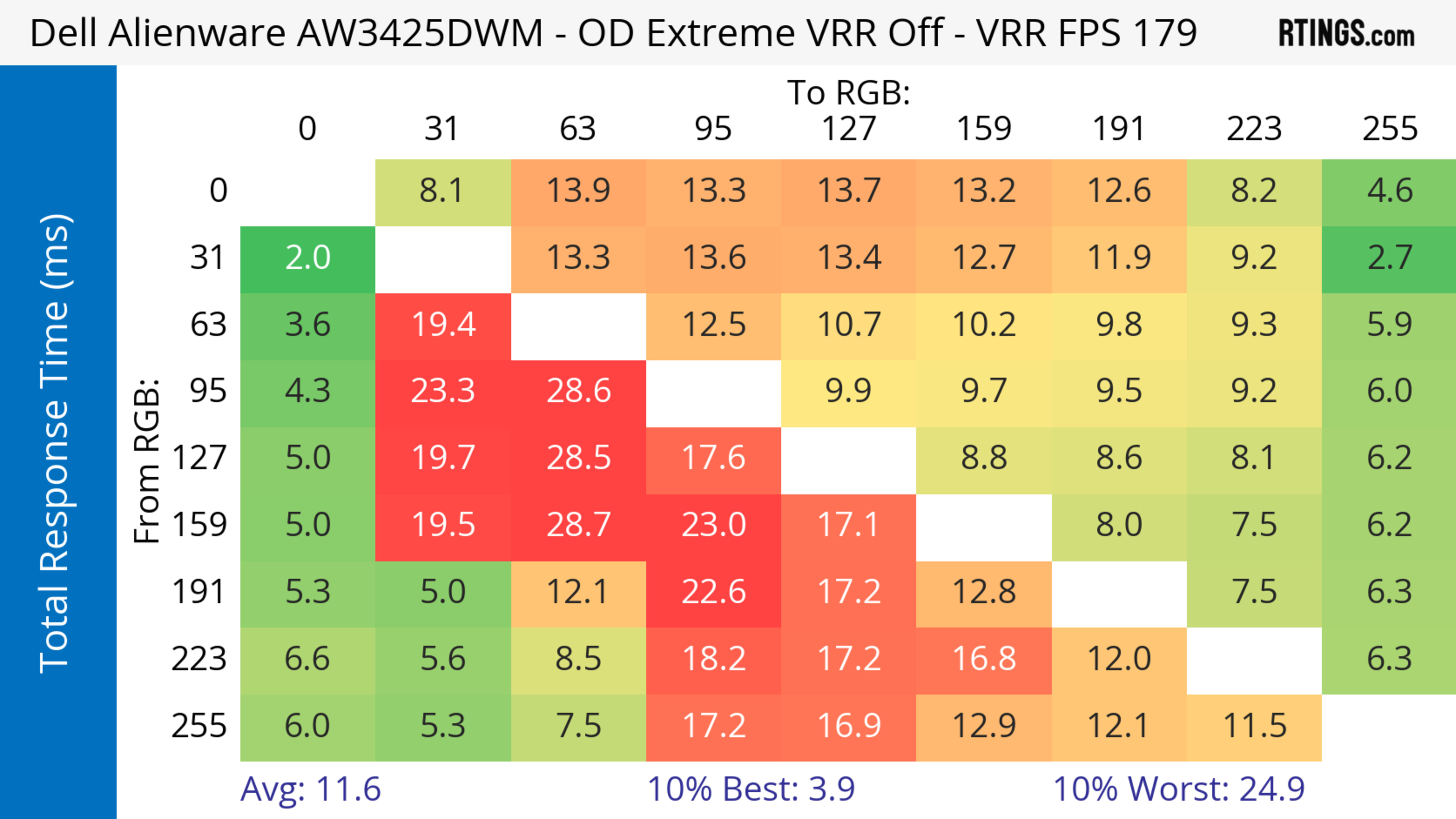 The Dell AW3425DWM has good motion handling across its VRR range. The 'Super Fast' Response Time setting is consistent as the refresh rate drops, but it has a slow response time with most transitions, particularly when going from dark to brighter colors, leading to black smearing behind fast-moving objects.